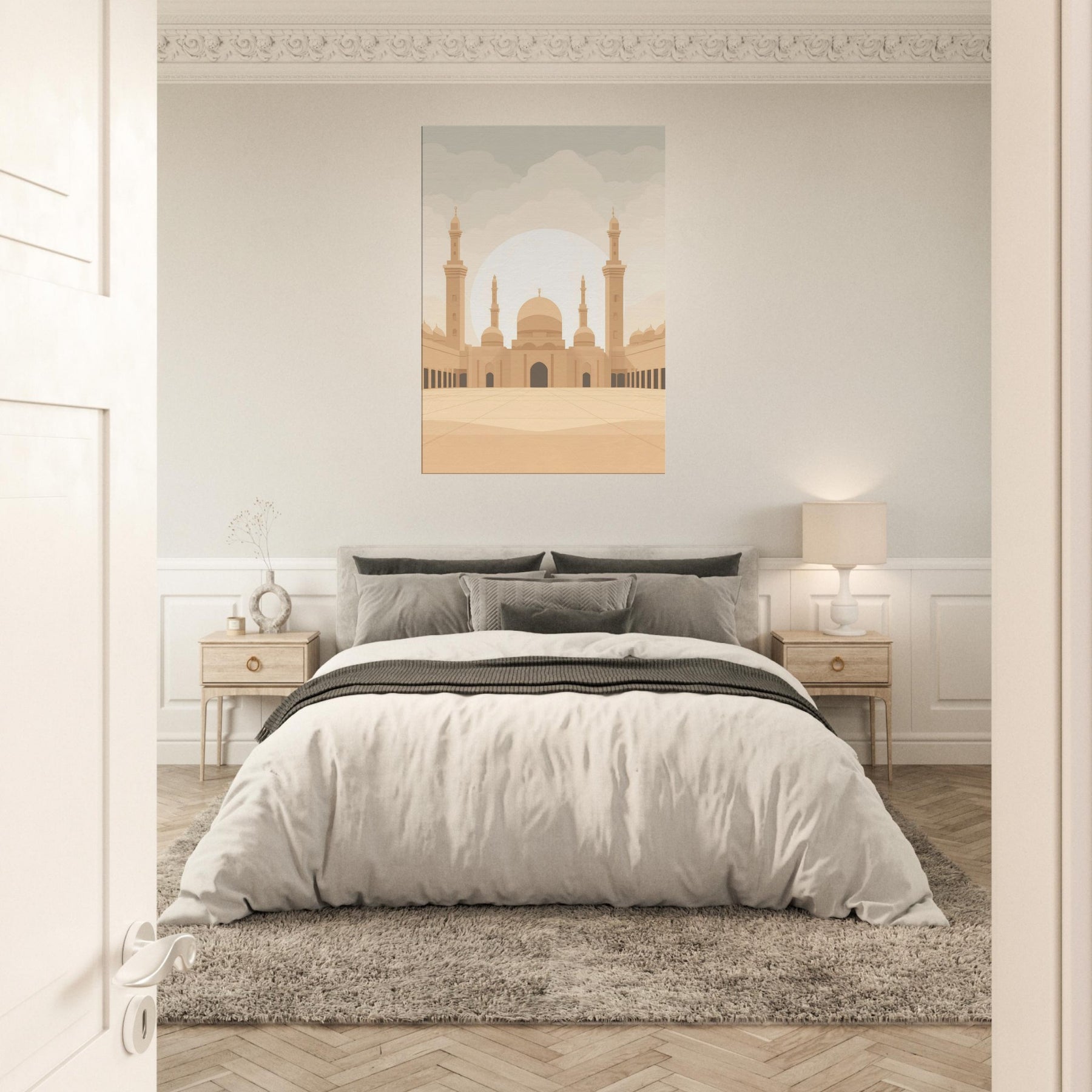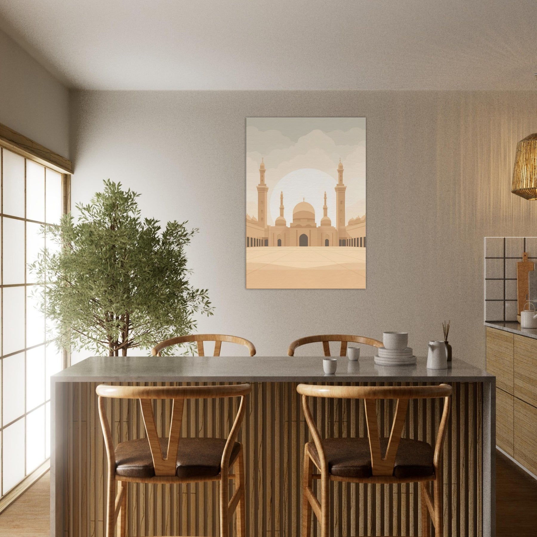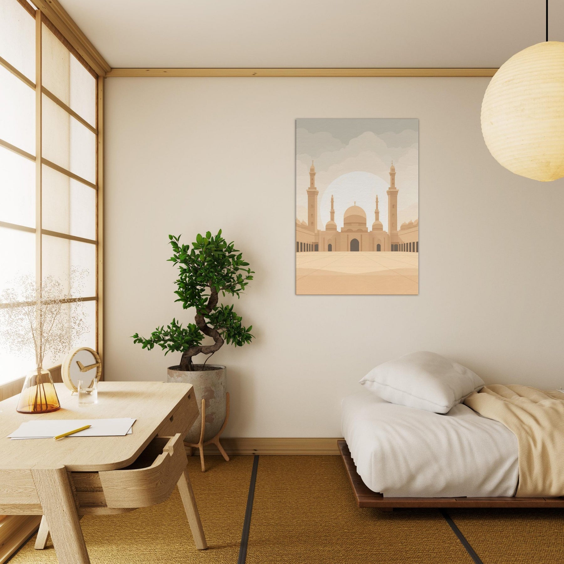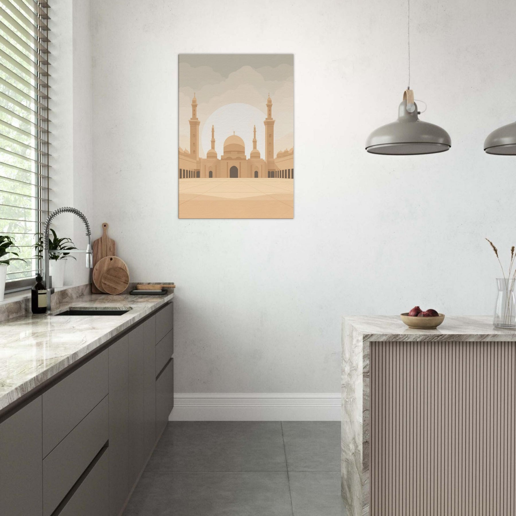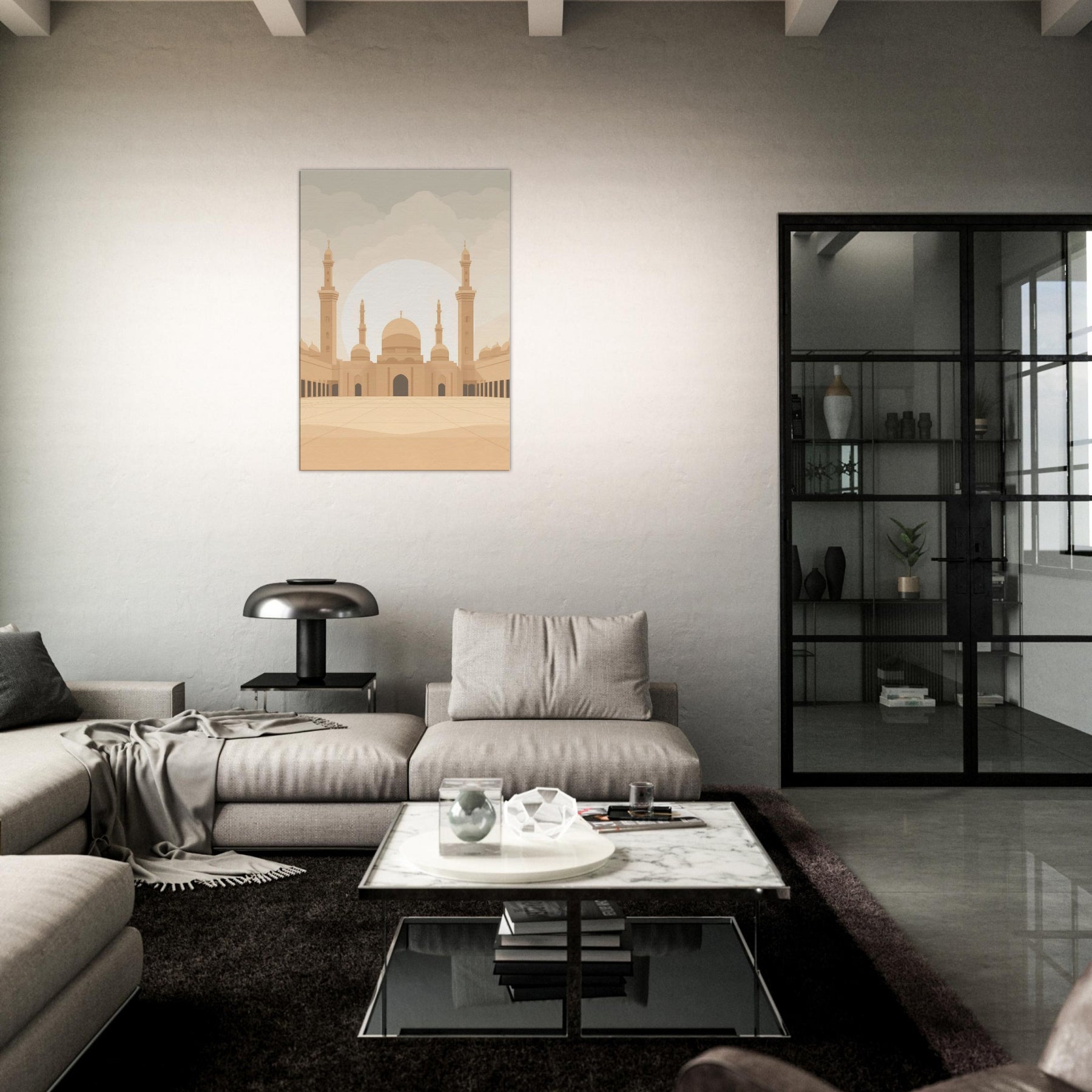 Feel the hush of a sunned courtyard as the mosque unfurls in quiet, geometric grace. This minimalist interpretation strips away noise, letting light carve the arches and domes in soft beige tones. Each line invites a calm, meditative breath, turning any room into a sanctuary of stillness and focus. Hang it in a living room or study to evoke generous space, warm glow, and serenity, a daily reminder of order, reverence, and beauty in everyday life.