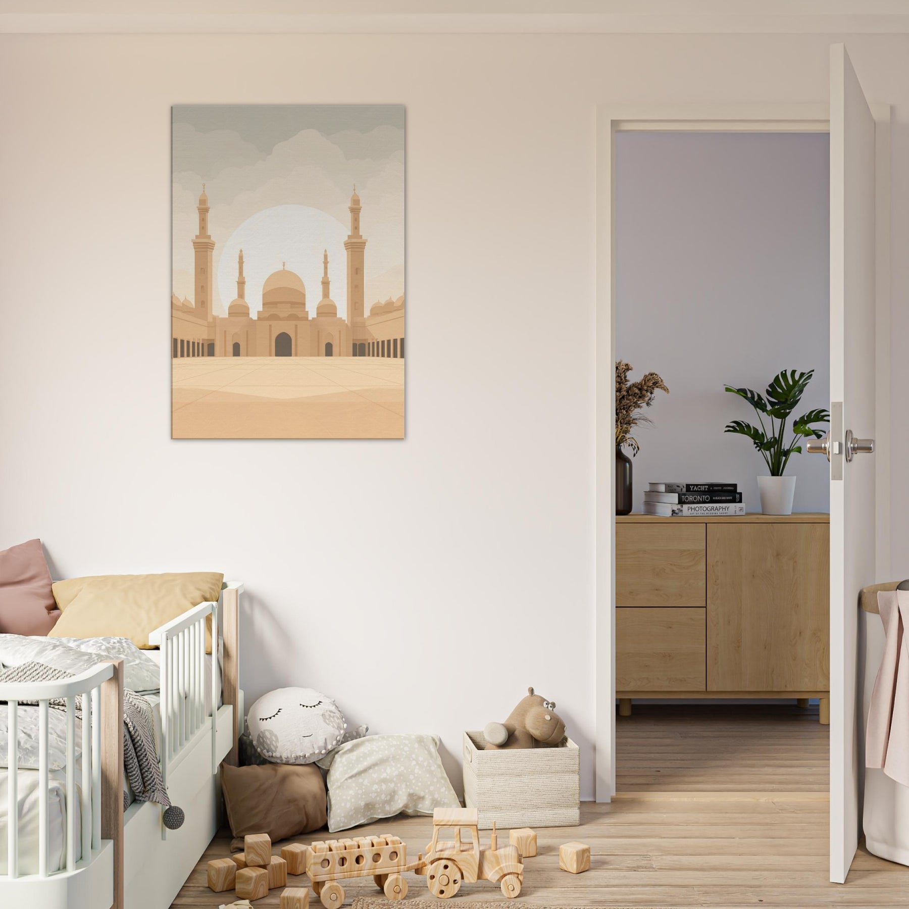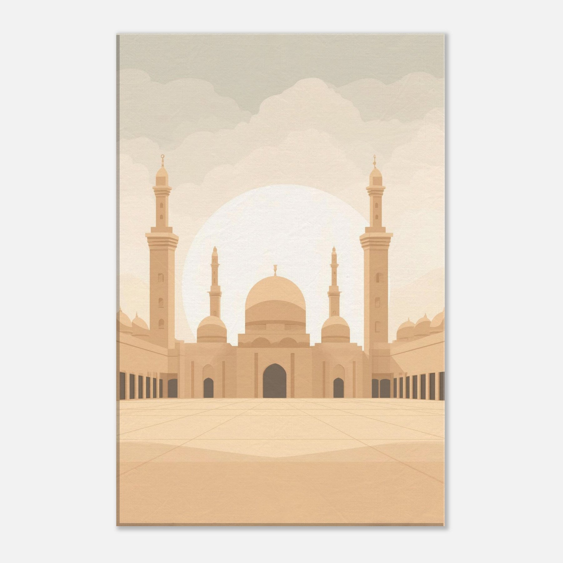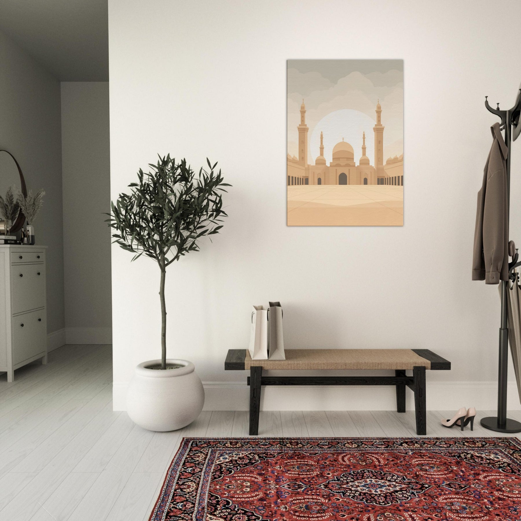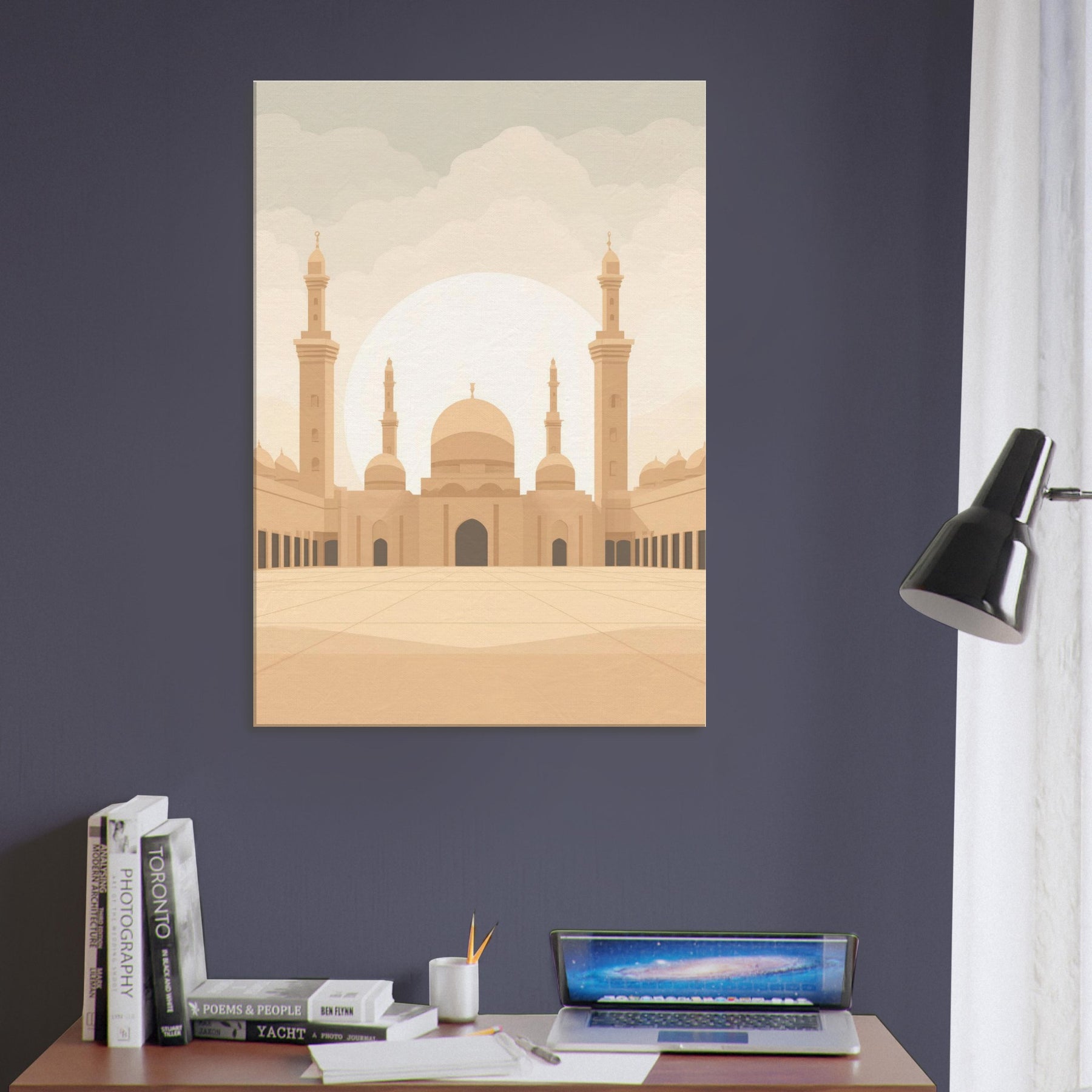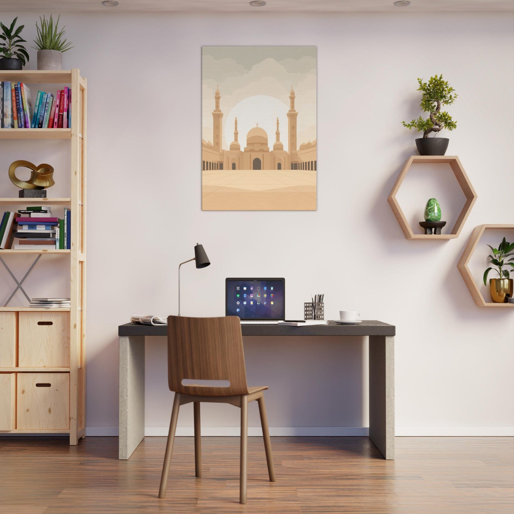 Feel the hush of a sunned courtyard as the mosque unfurls in quiet, geometric grace. This minimalist interpretation strips away noise, letting light carve the arches and domes in soft beige tones. Each line invites a calm, meditative breath, turning any room into a sanctuary of stillness and focus. Hang it in a living room or study to evoke generous space, warm glow, and serenity, a daily reminder of order, reverence, and beauty in everyday life.
