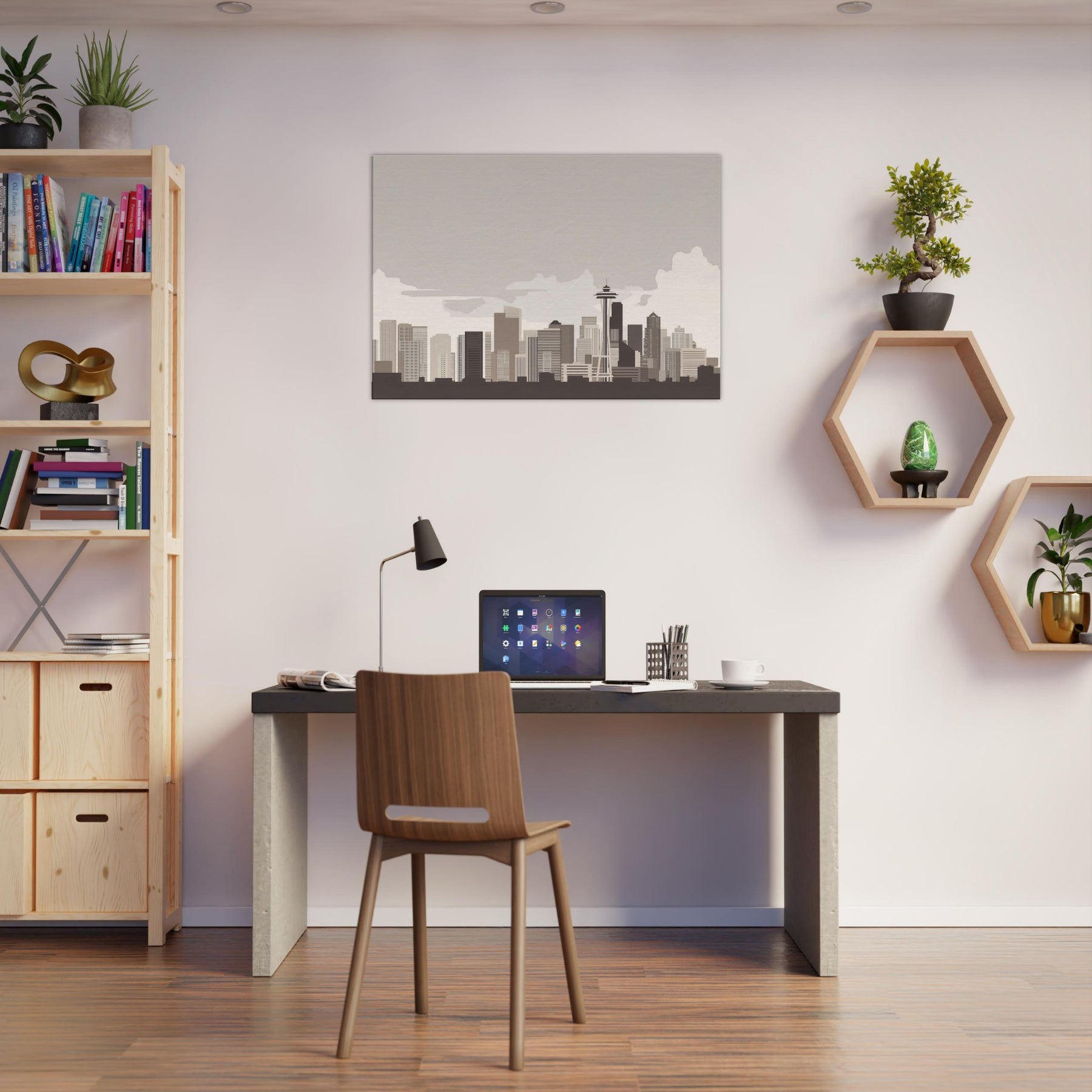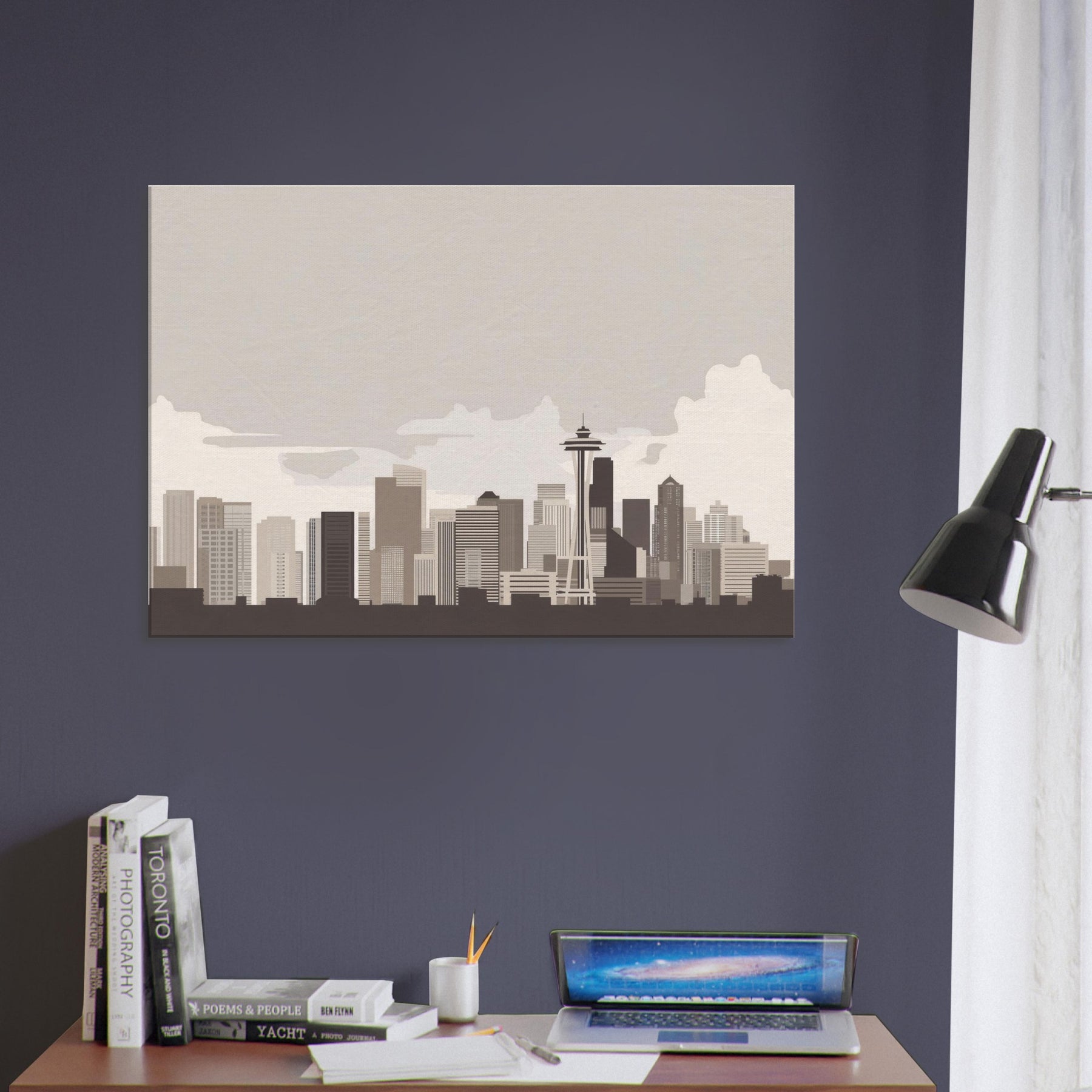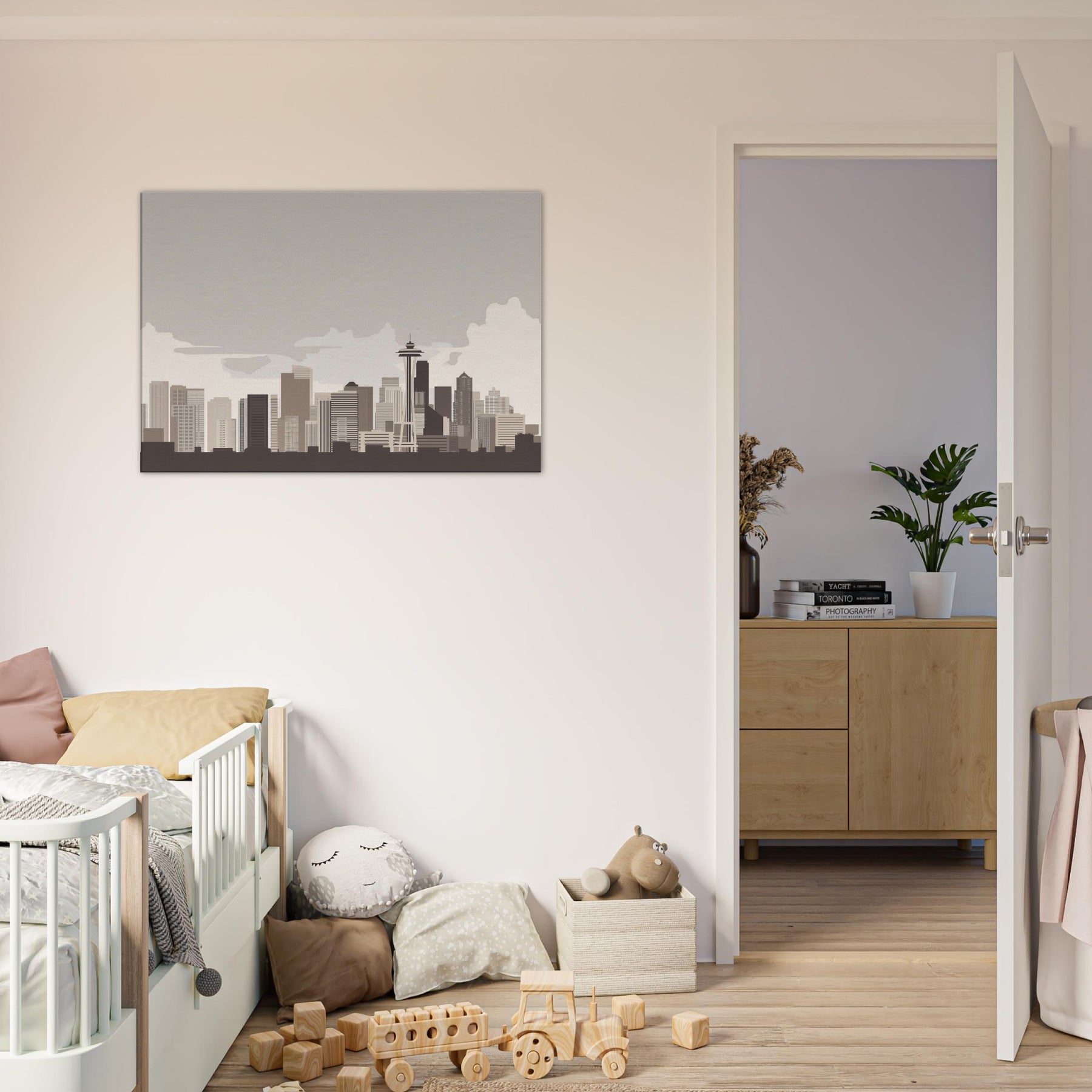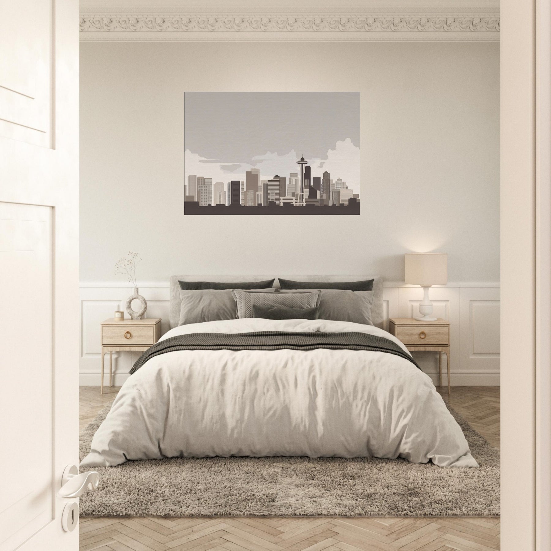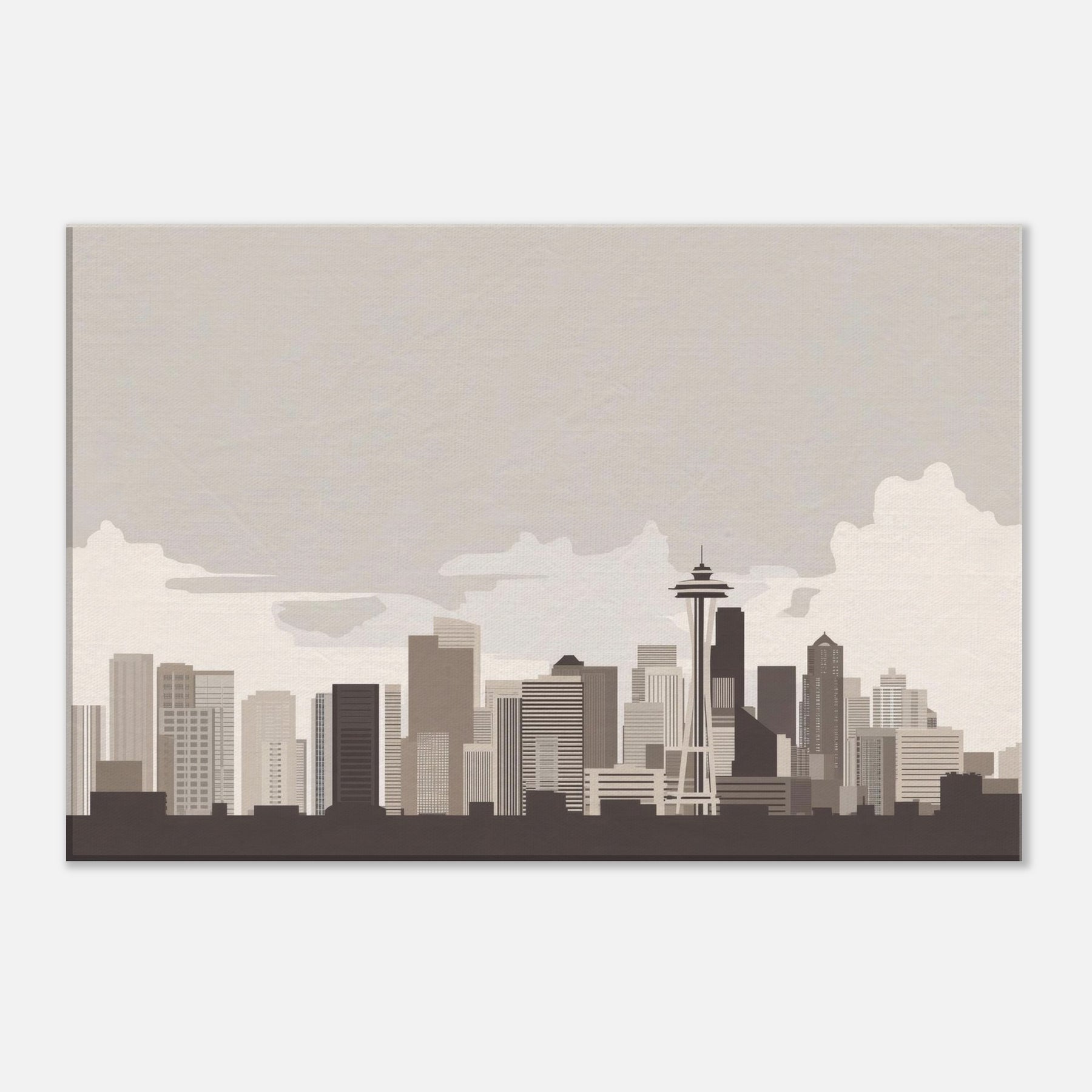 Soft lines sketch a city you can almost hear breathing the quiet pulse of Seattle rendered in a restrained palette. This minimalist skyline invites calm into a living room, turning motion into stillness and noise into form. The muted beiges and taupes echo a fog kissed morning, while the clean geometry offers a steady balance for conversations, coffee rituals, and late night reading. Hang it where light arrives gently; watch the silhouette shift with the day and feel the room expand around Seattle's serene horizon.