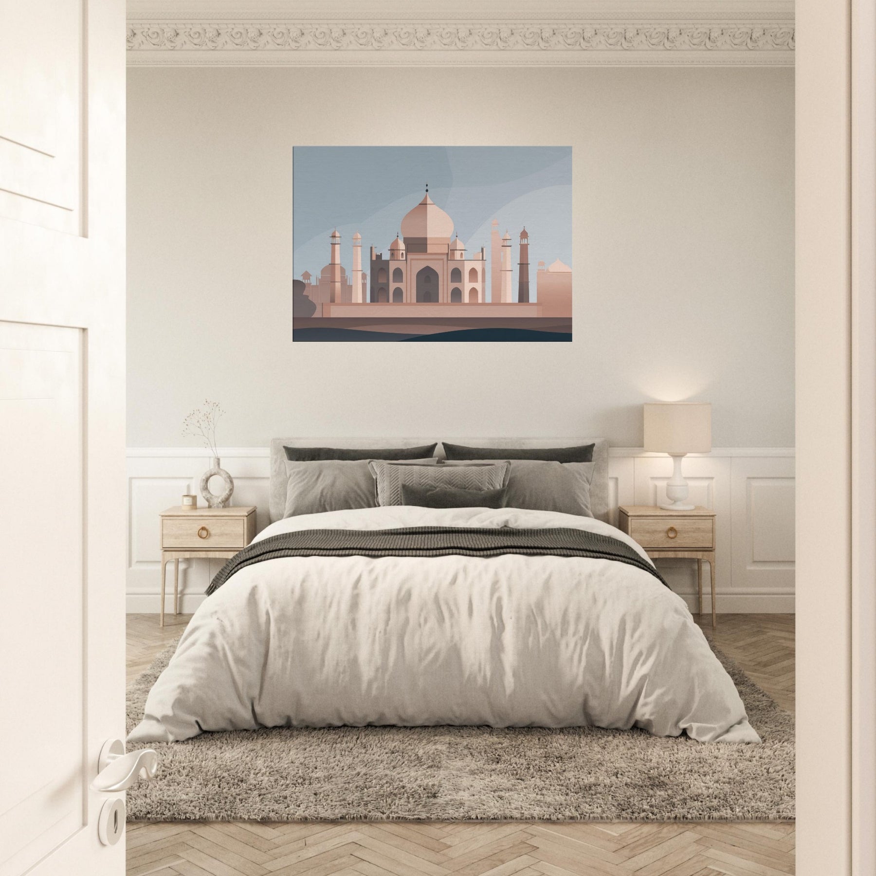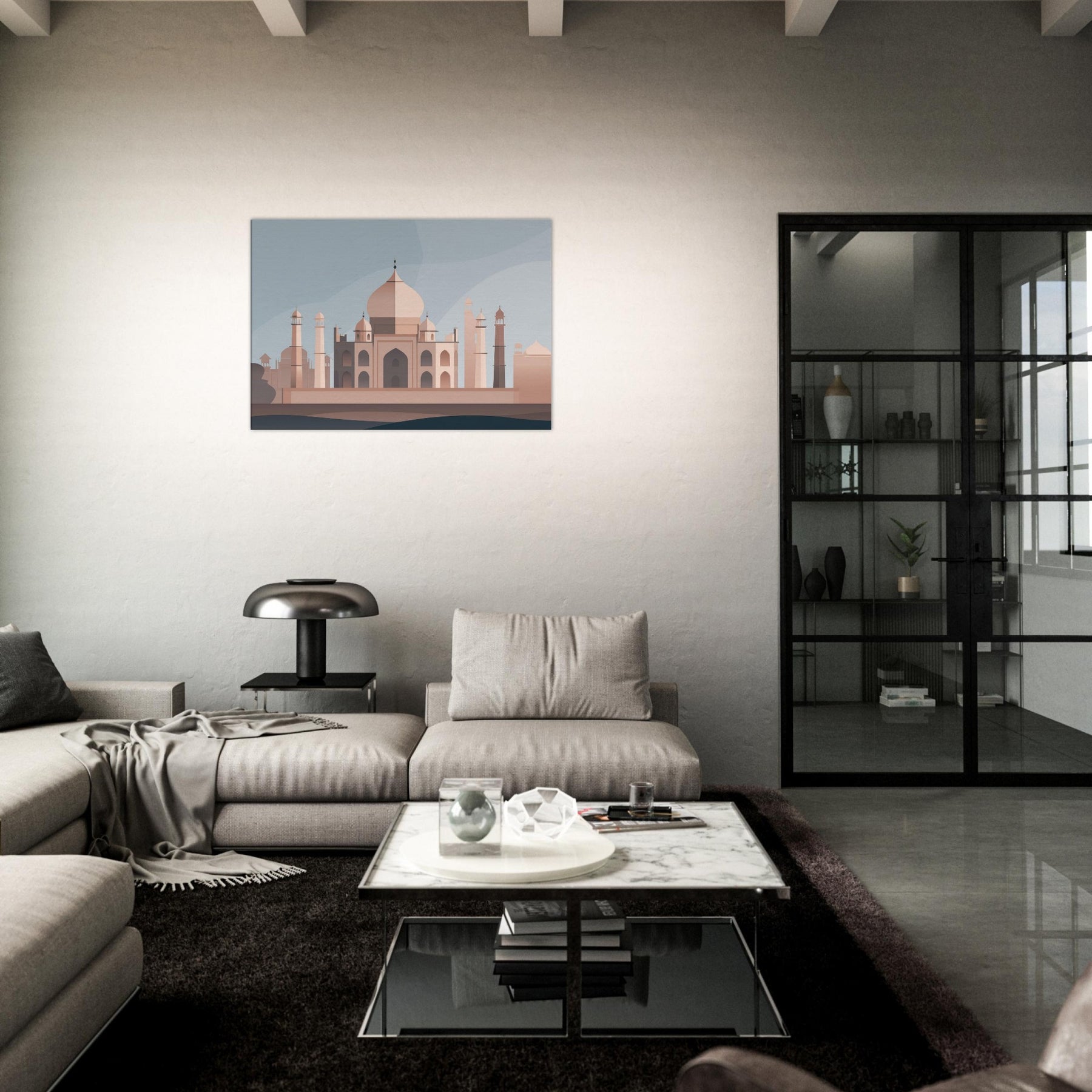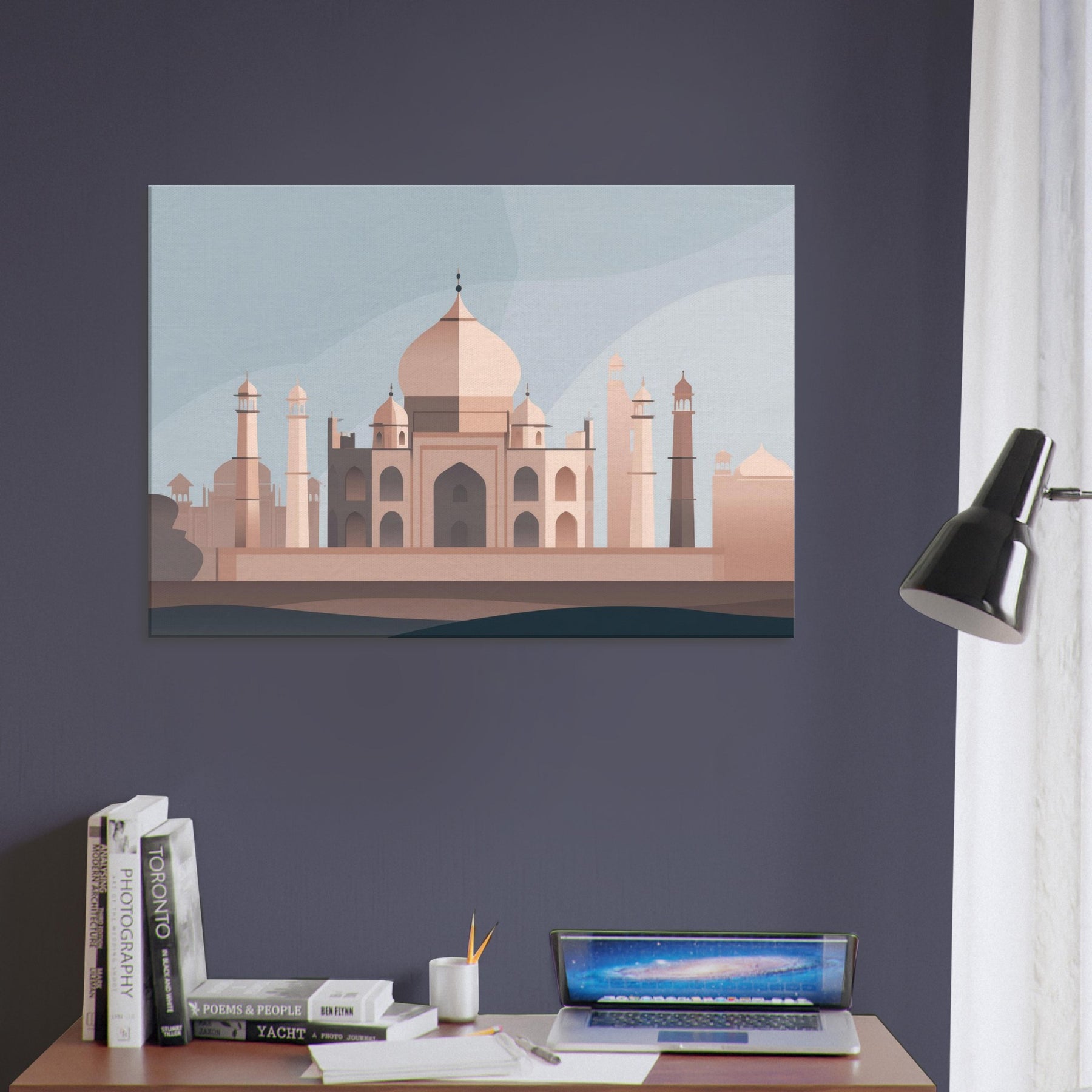 Soft arcs and muted terracotta tones render the Taj Mahal in quiet reverie, inviting calm rather than crowd pleasing drama. This minimalist interpretation distills monumentality into clean geometry and serene light, letting space breathe around every arch. Hang it to anchor a sitting room with a meditative focal point its pale blush towers echo dusk, its cool shadows suggest hush and balance. The piece pairs well with warm woods or cool neutrals, creating a subtle dialogue between memory and modern living.