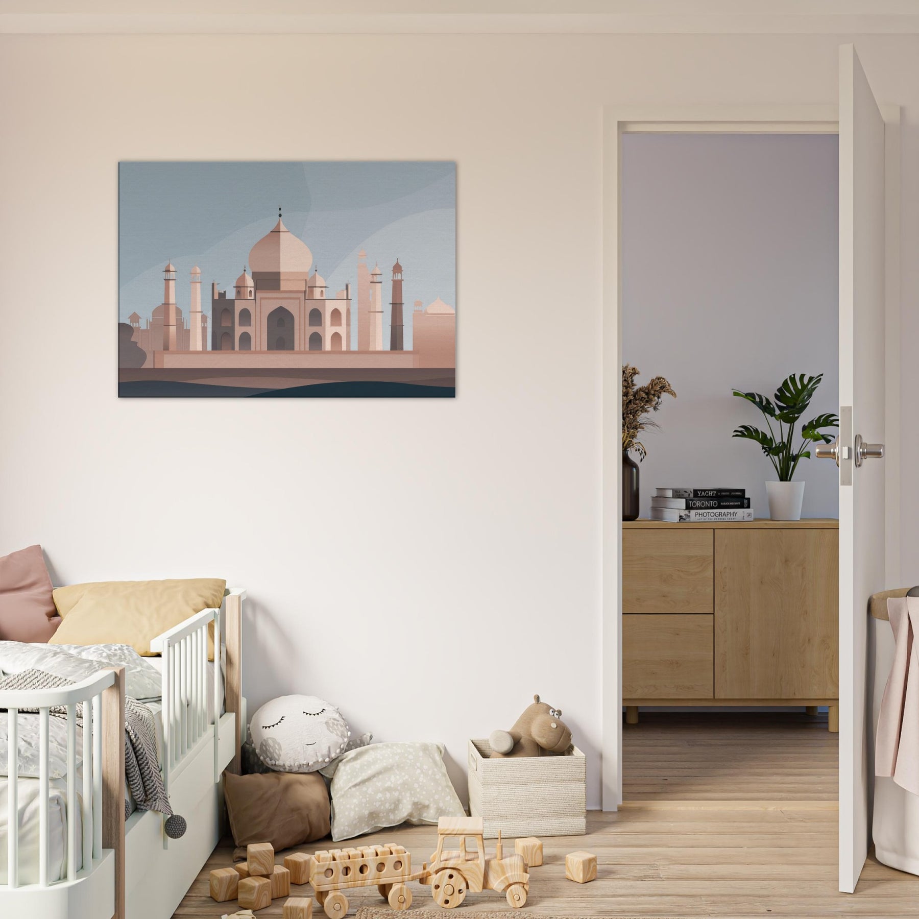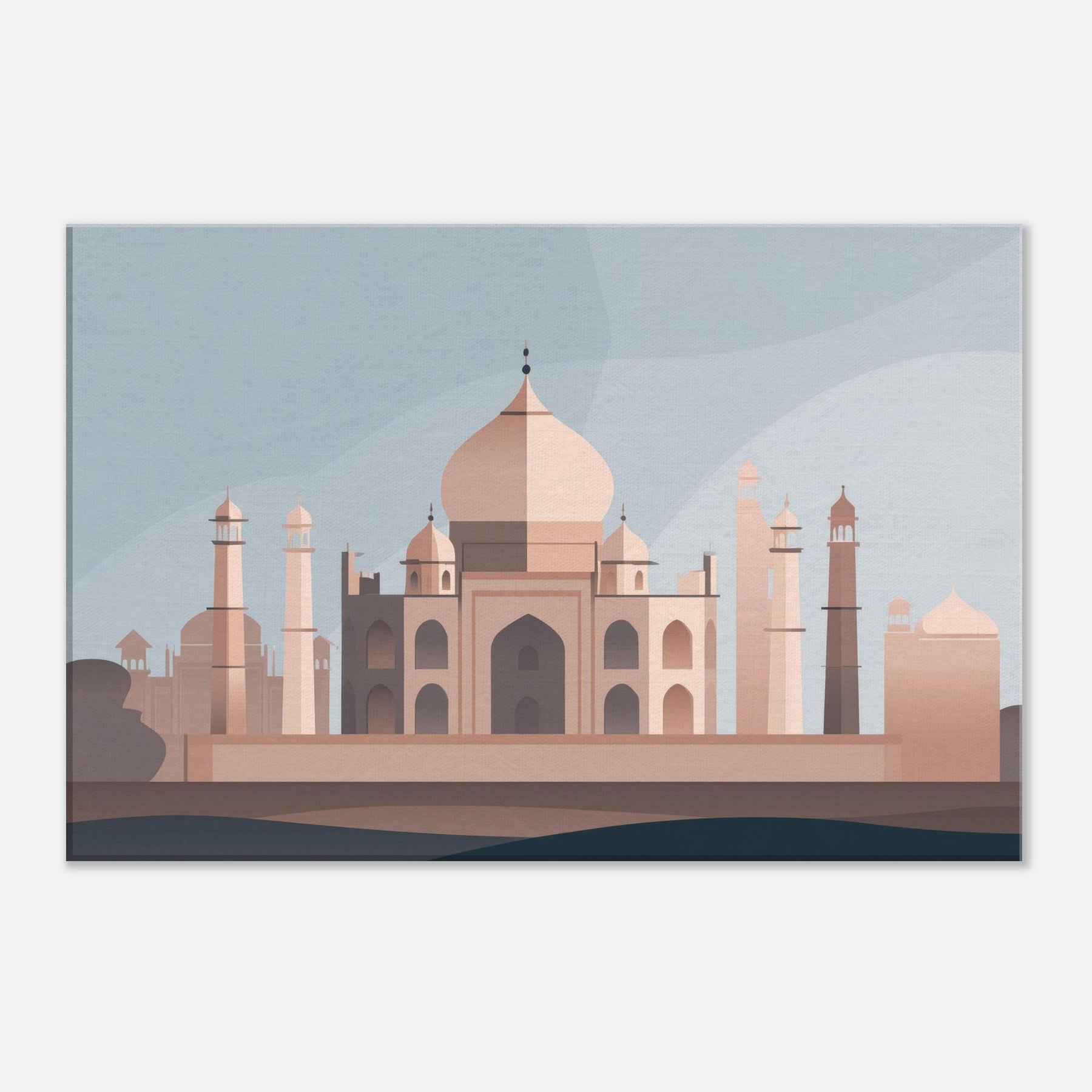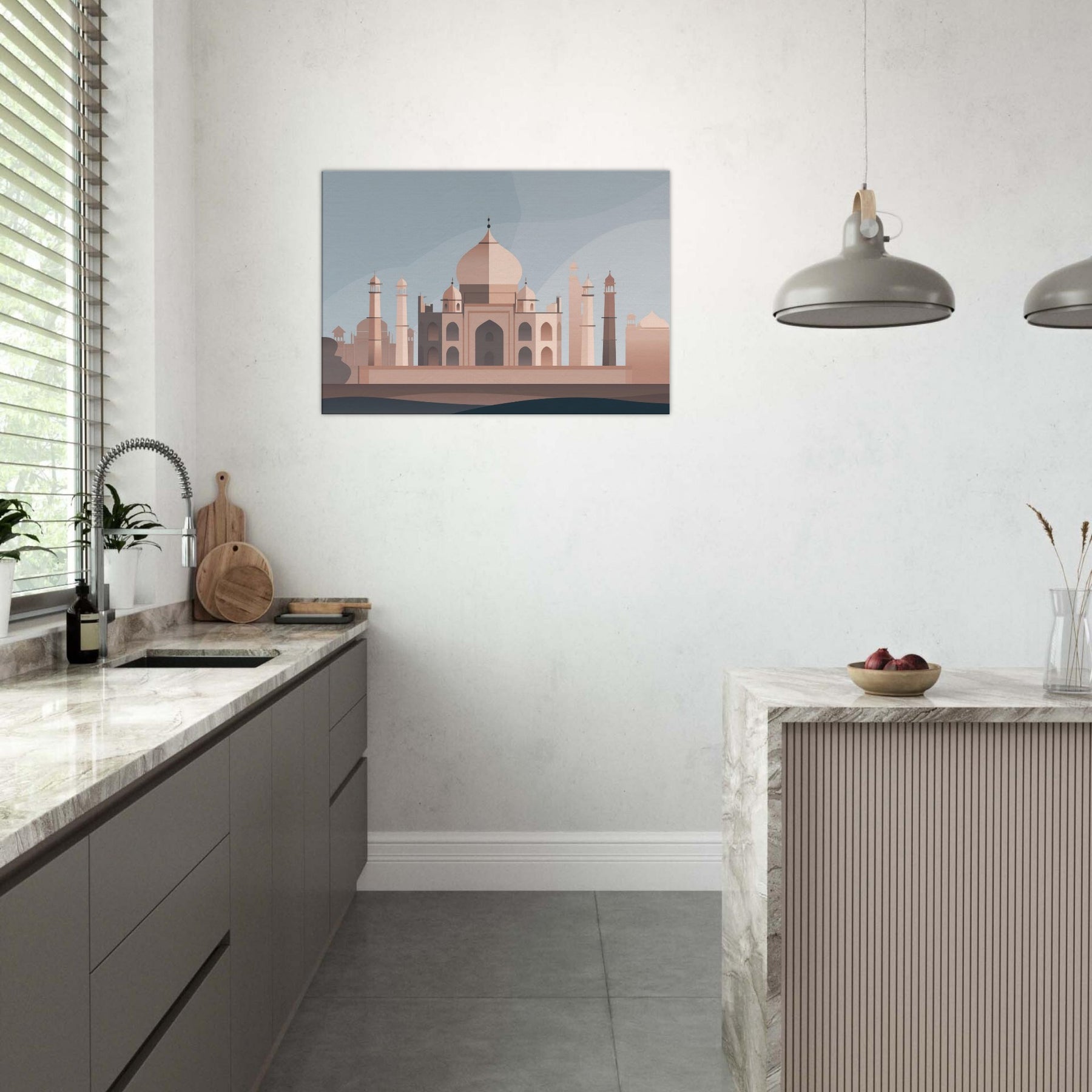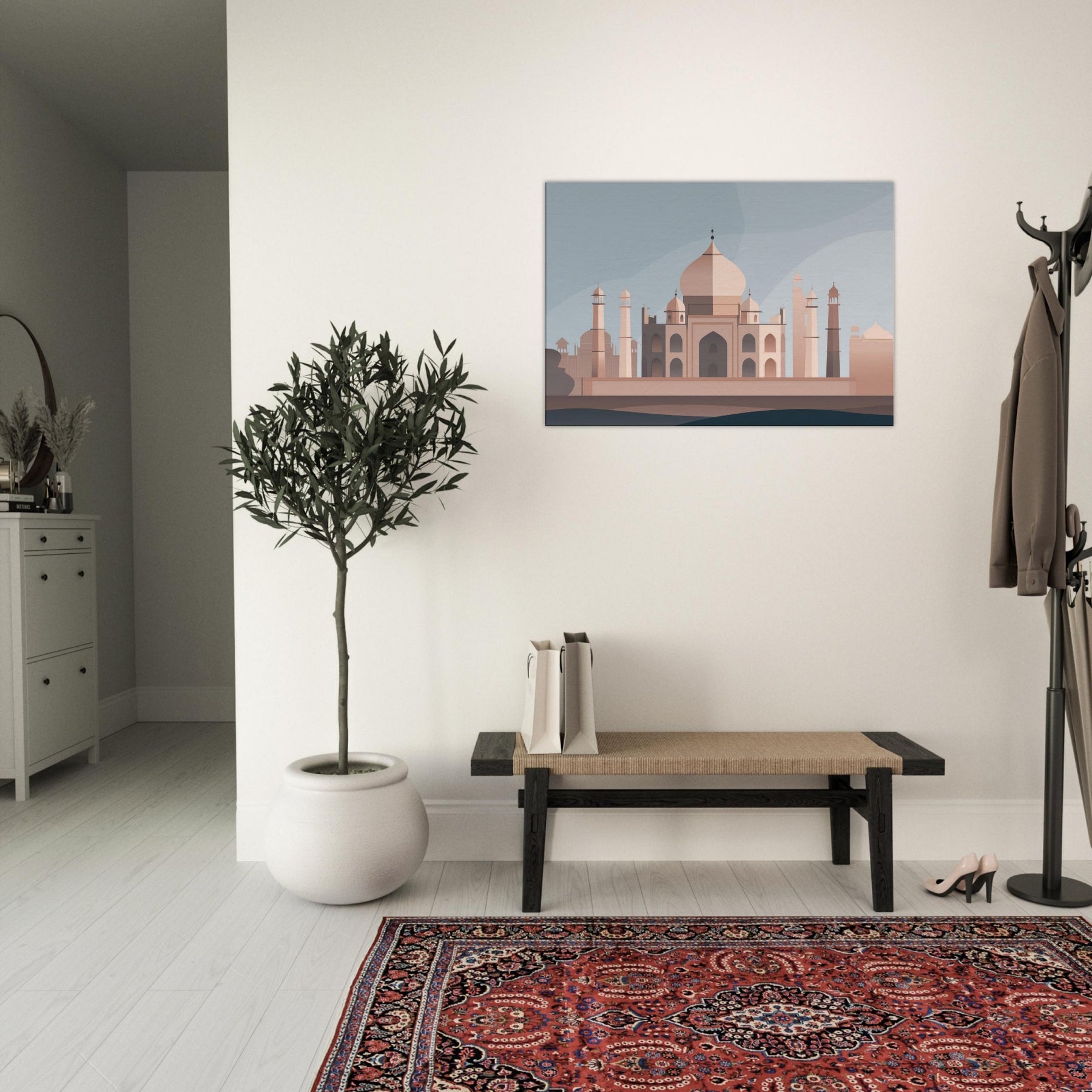 Soft arcs and muted terracotta tones render the Taj Mahal in quiet reverie, inviting calm rather than crowd pleasing drama. This minimalist interpretation distills monumentality into clean geometry and serene light, letting space breathe around every arch. Hang it to anchor a sitting room with a meditative focal point its pale blush towers echo dusk, its cool shadows suggest hush and balance. The piece pairs well with warm woods or cool neutrals, creating a subtle dialogue between memory and modern living.