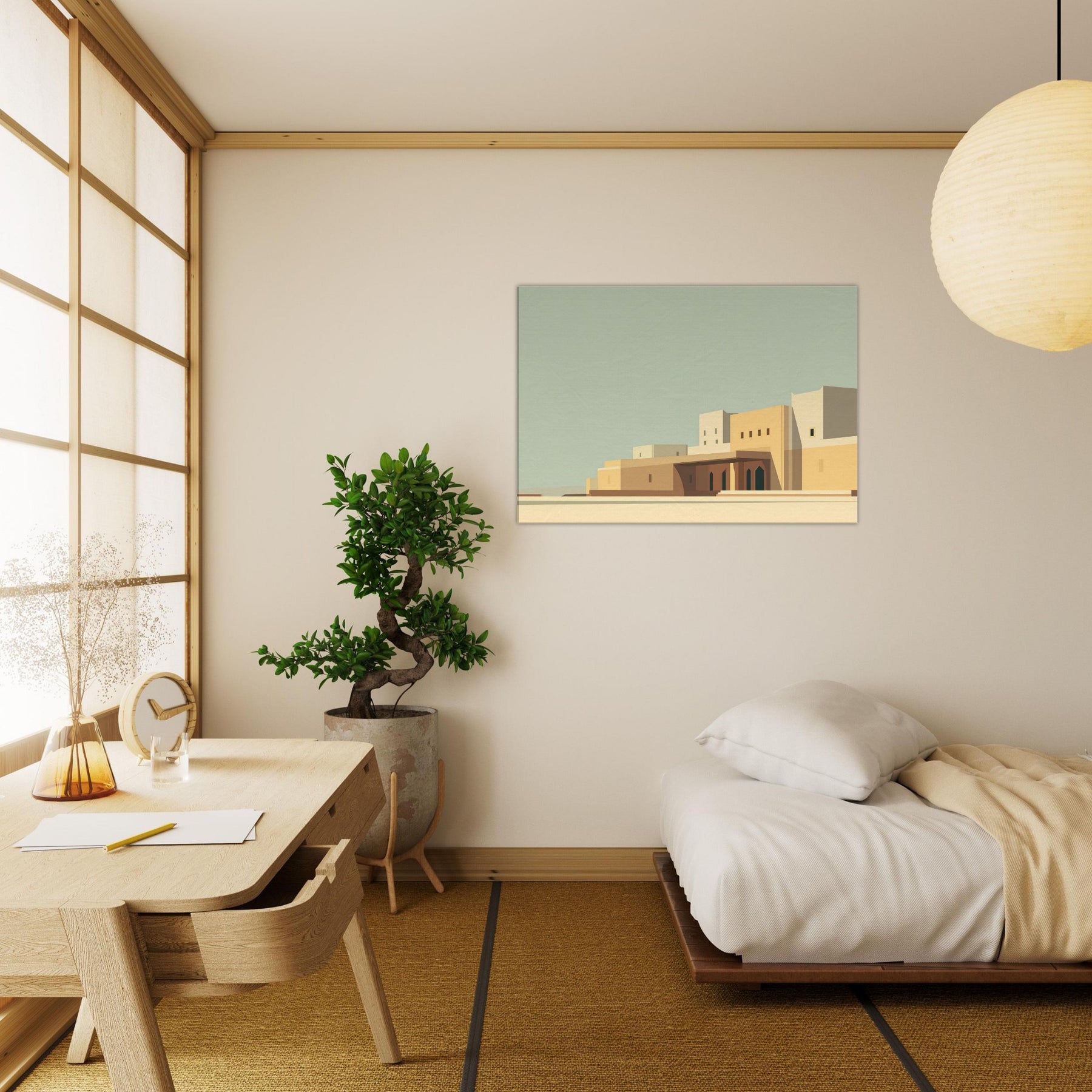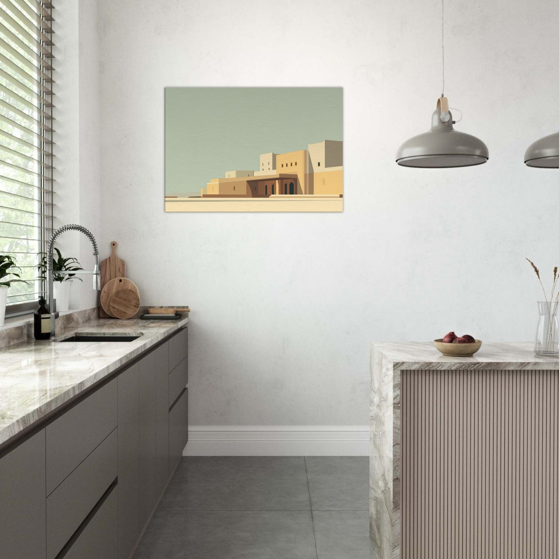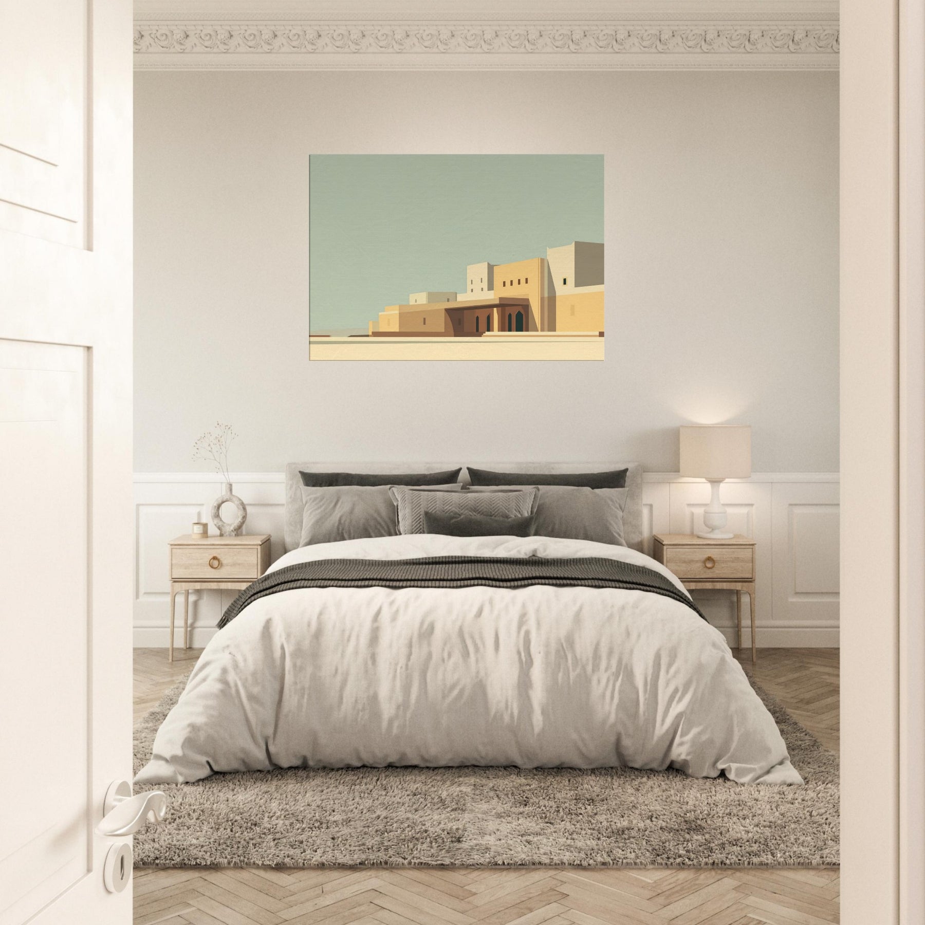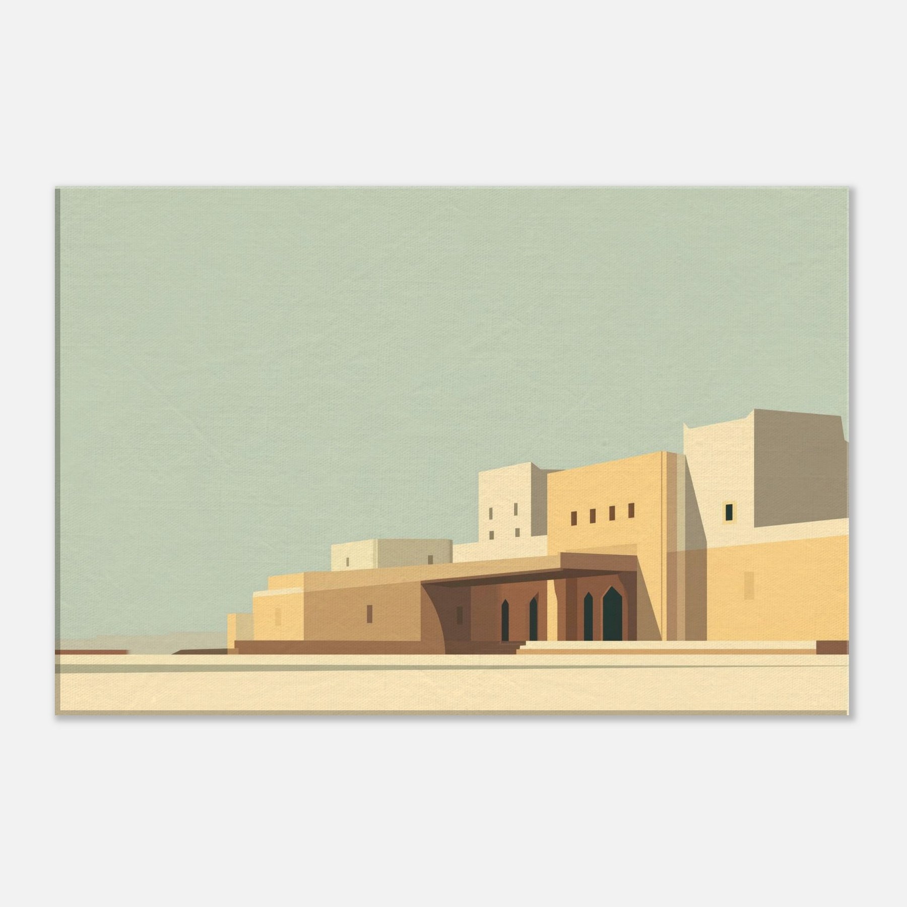 Marrakech unfolds in quiet geometry: pale sunlit walls, clean lines, and soft shadows that pool at the base of archways. This minimalist cityscape invites contemplation and lends space to breathe, turning any room into a sun kissed courtyard. The calm palette of sand, ochre, and pale blue echoes the rhythm of alleyways and domed silhouettes, while the restrained composition makes the viewer pause, savoring stillness. Hang it to frame conversations, elevate a living room, or spark wanderlust for seekers of timeless, architectural quiet.