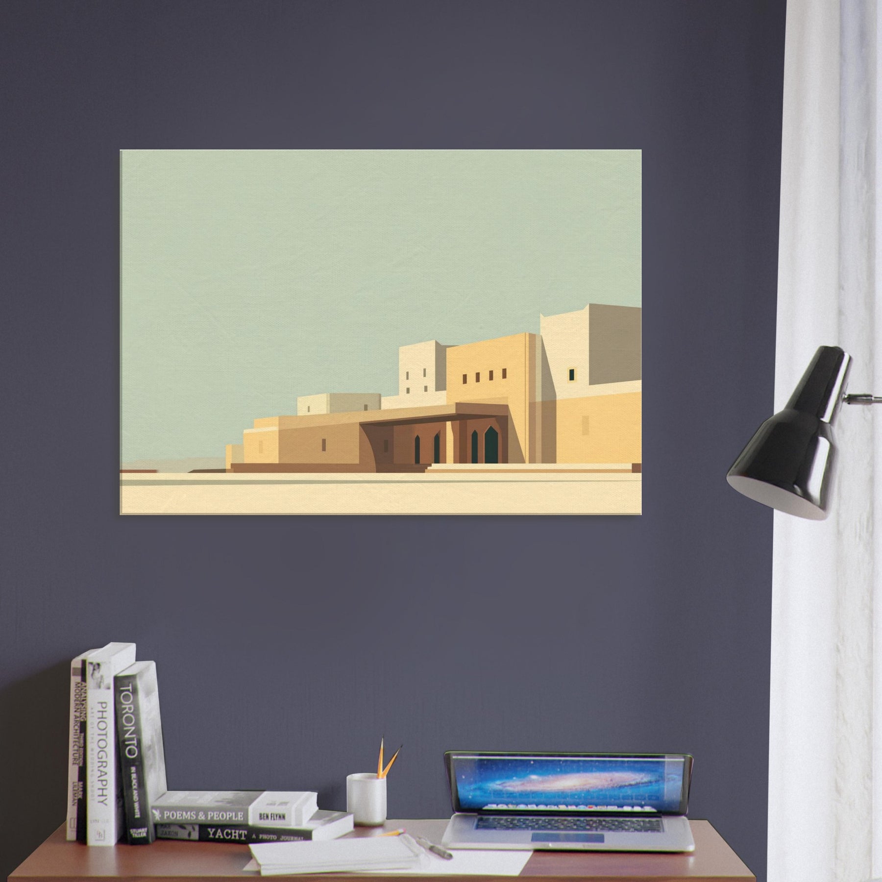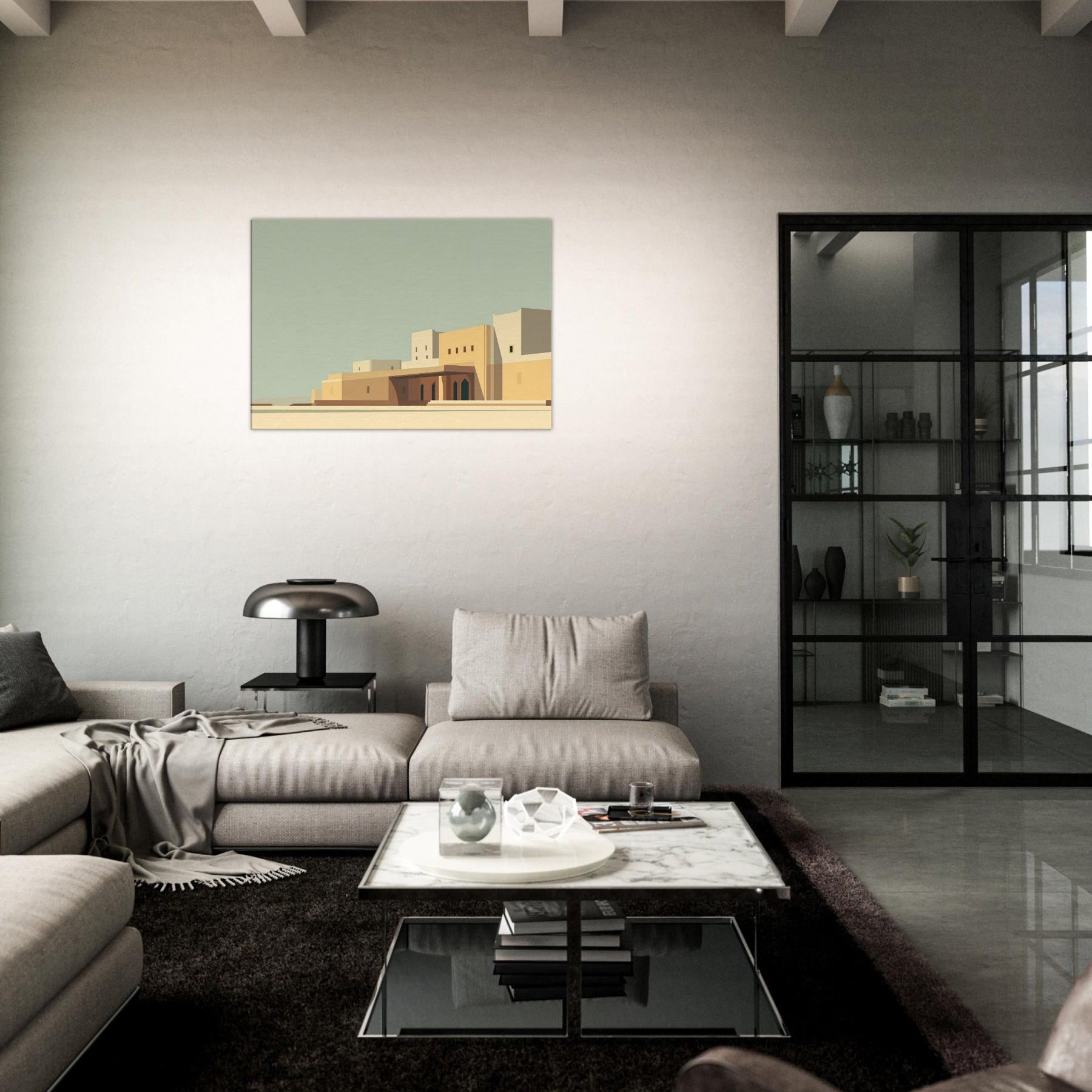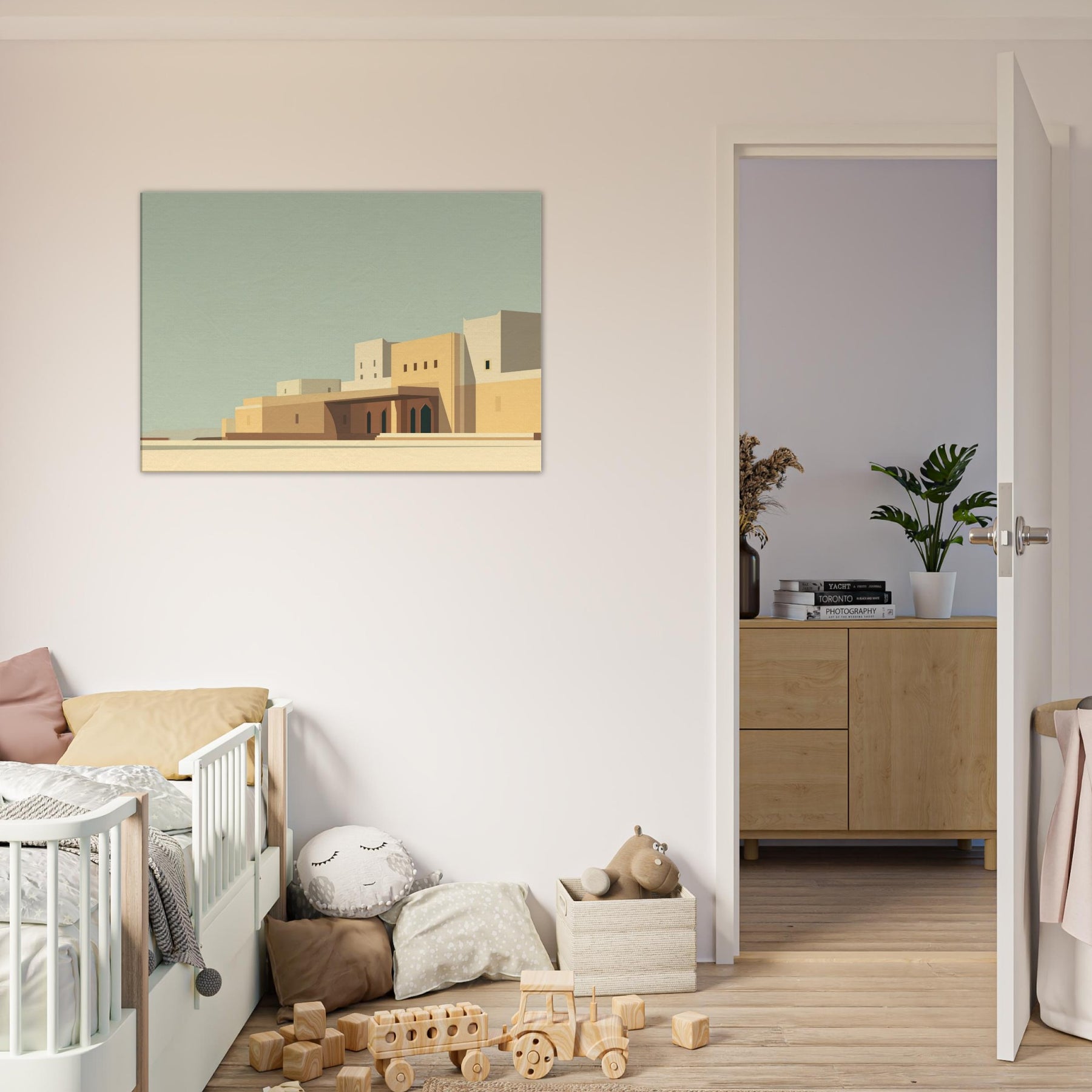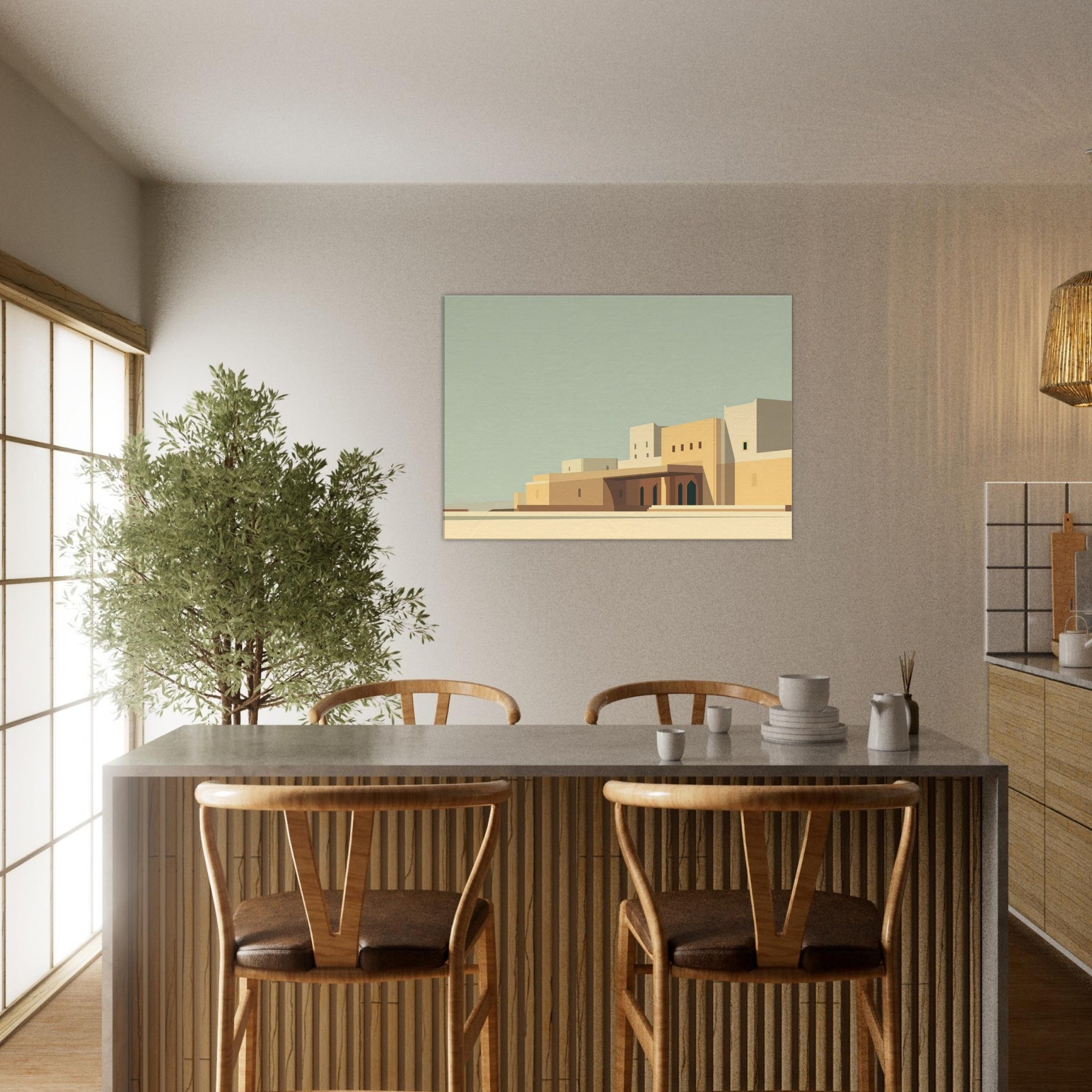 Marrakech unfolds in quiet geometry: pale sunlit walls, clean lines, and soft shadows that pool at the base of archways. This minimalist cityscape invites contemplation and lends space to breathe, turning any room into a sun kissed courtyard. The calm palette of sand, ochre, and pale blue echoes the rhythm of alleyways and domed silhouettes, while the restrained composition makes the viewer pause, savoring stillness. Hang it to frame conversations, elevate a living room, or spark wanderlust for seekers of timeless, architectural quiet.
