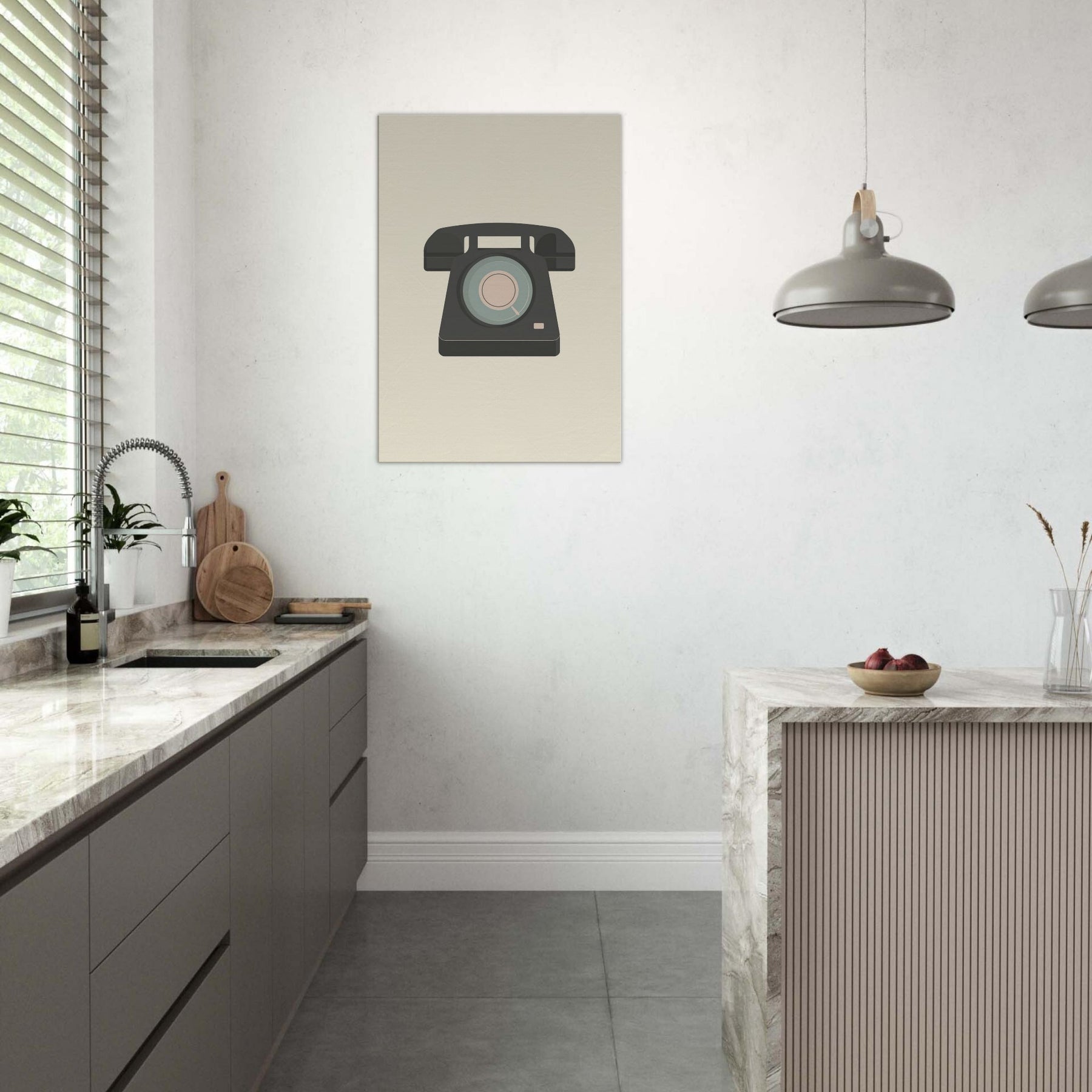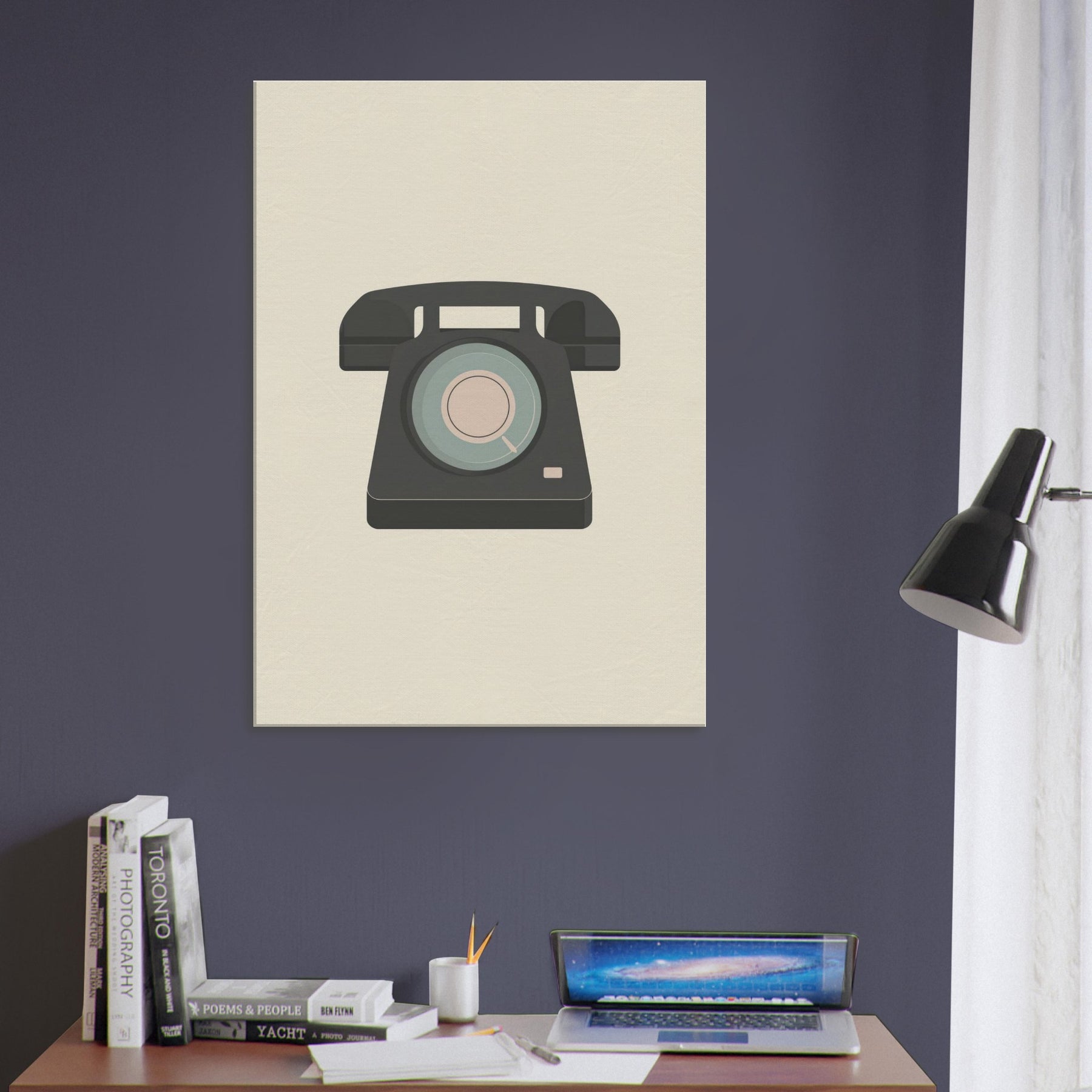 This piece casts a Retro Telephone in a hushed, modern light, turning nostalgia into still water for the wall. The dial is reduced to concentric soft tones blush pink, pale mint, and a quiet teal while a charcoal silhouette grounds the image. The minimalist composition breathes elegance into any living space, inviting the eye to linger and the room to feel calmer, more intentional. It's a conversation starter that never shouts, pairing mid century memory with contemporary serenity.
