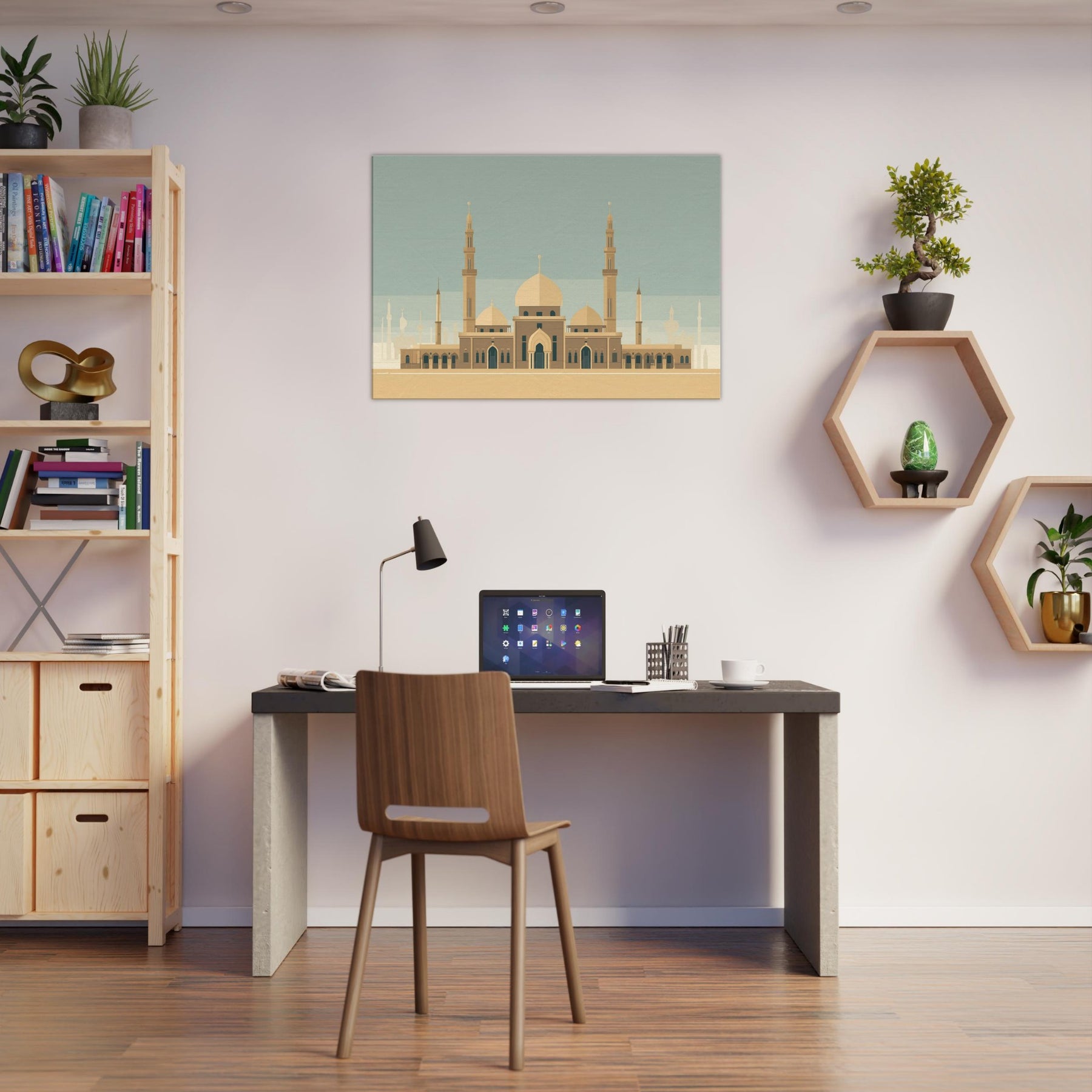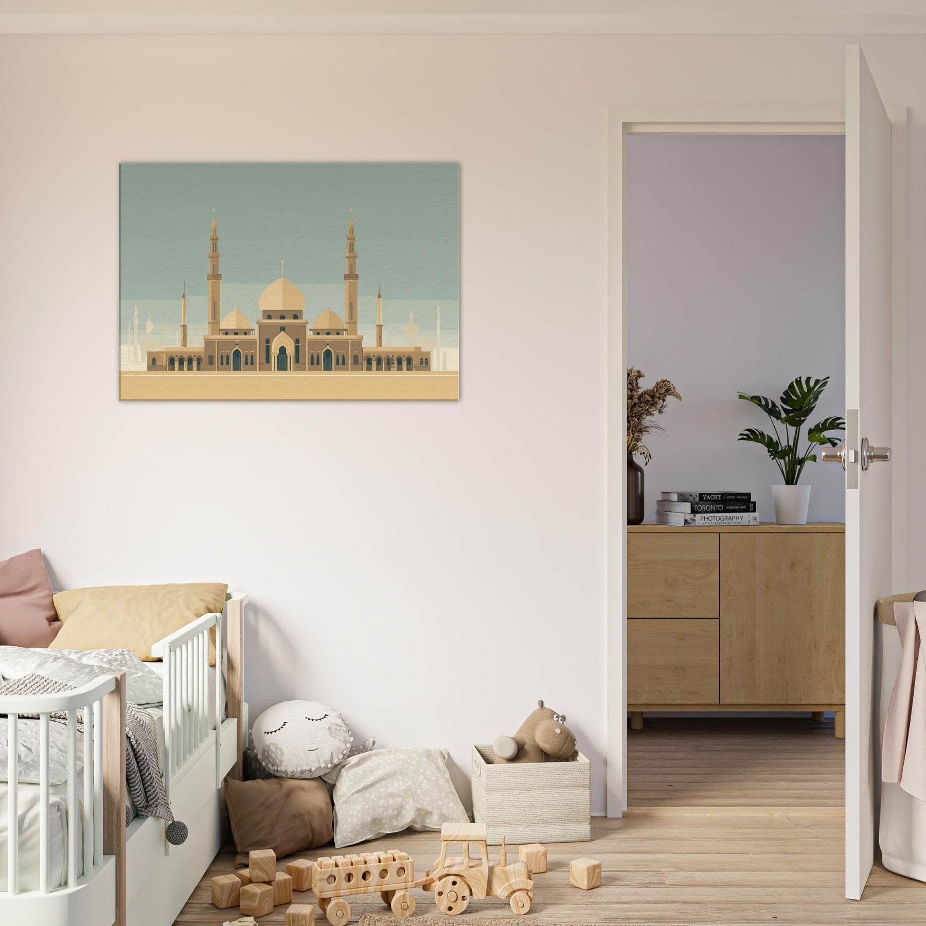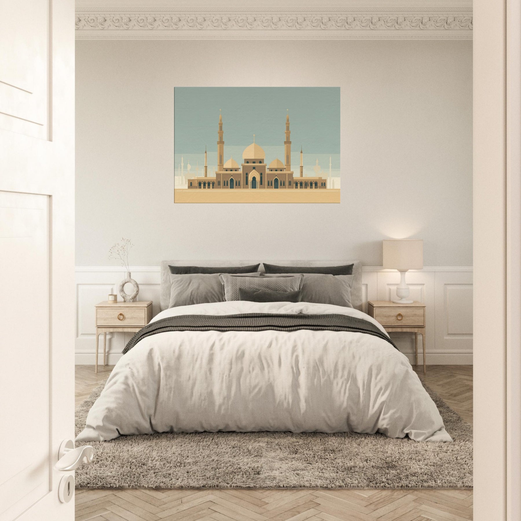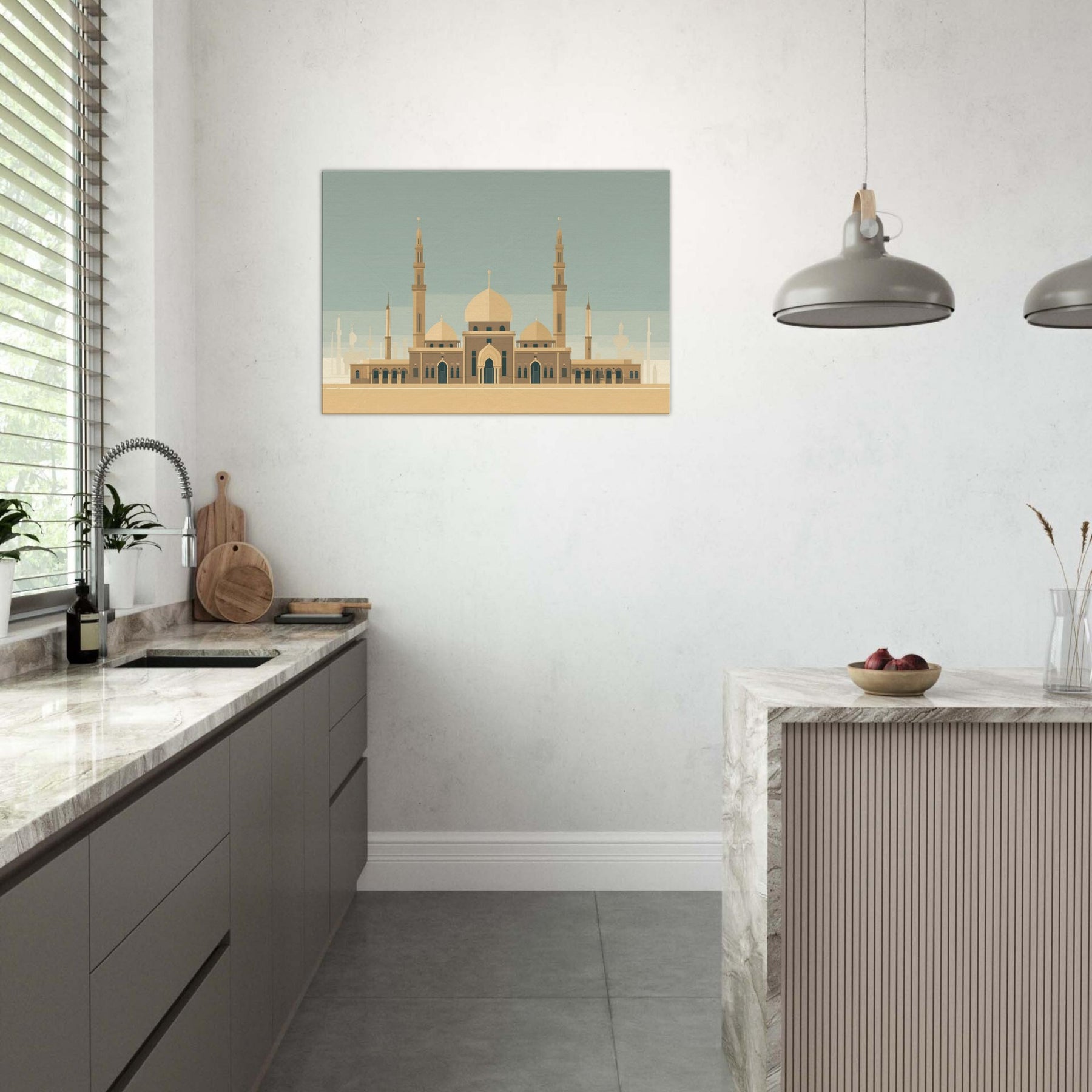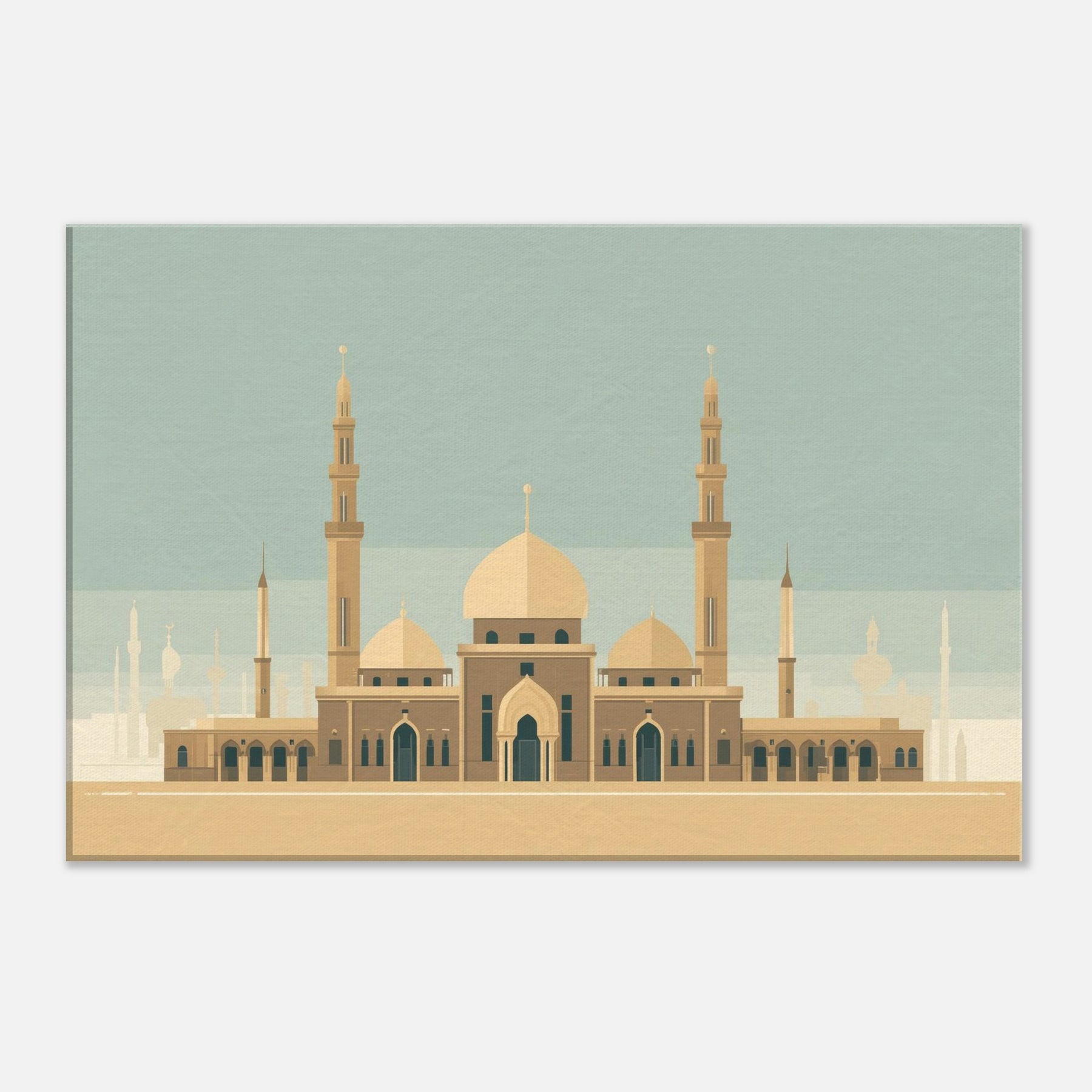 Enter a serene horizon where a grand Mosque anchors the room with quiet gravity. This minimalist composition reduces the city to sun washed planes, letting the domes and tall minarets breathe with architectural poetry. The warm beige palette and restrained lines evoke both ancient courtyards and modern calm, inviting reflection and conversation in any living space. Hang above a sofa or desk to cast a tranquil, sacred note across the day an invitation to pause, breathe, and dream.