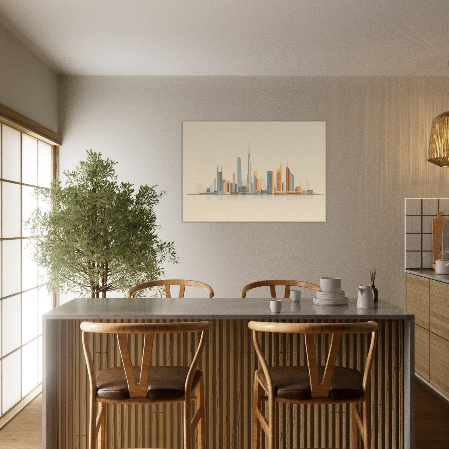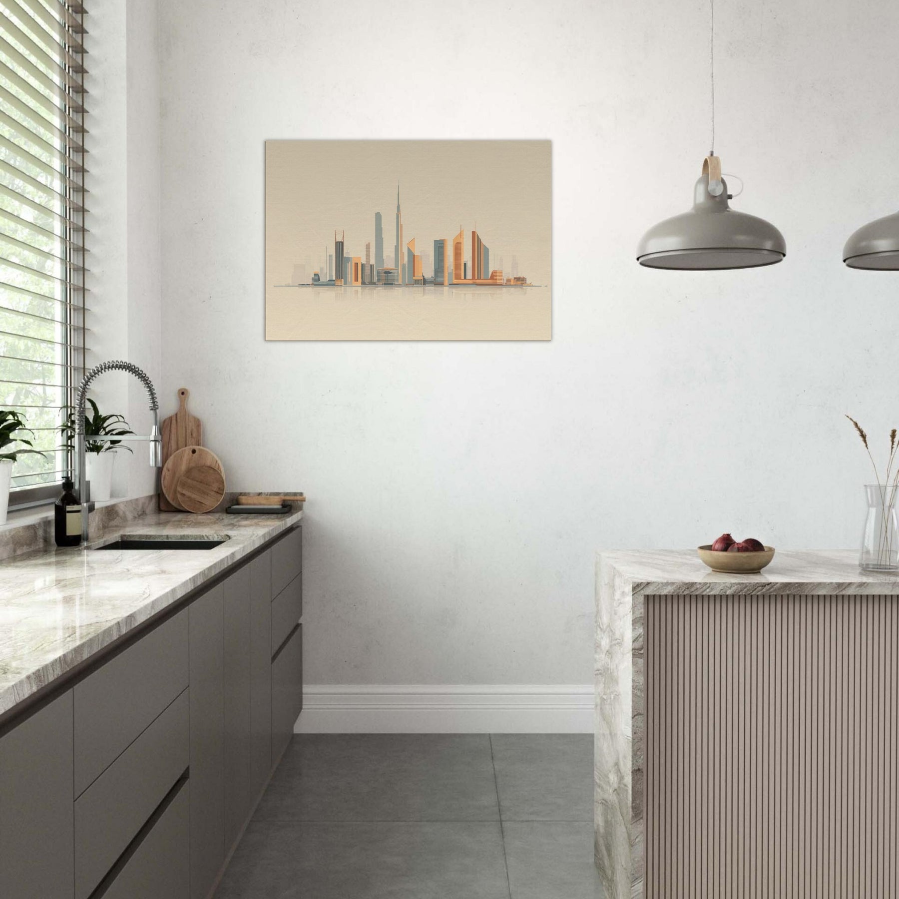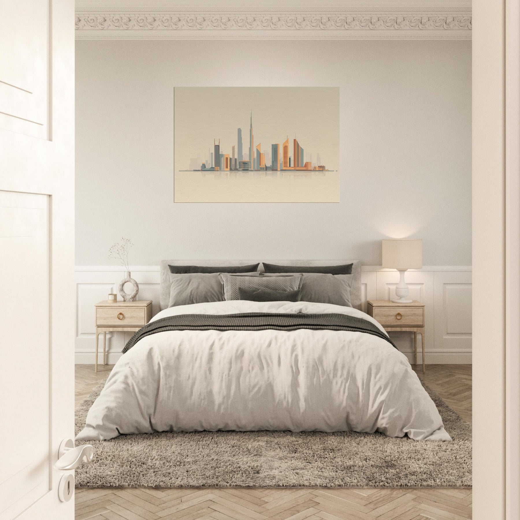 Dubai's skyline unfolds in clean geometries tall towers, angled facades, and a precise shoreline that meets still water. Against a warm, sand soft backdrop, the scene radiates quiet confidence and a day to night glow. The minimalist palette of taupe, peach, and misty blue casts a tranquil atmosphere, inviting contemplation in any living space. Hang it to expand the sense of horizon, letting the room breathe with refined urban poetry and graceful, everyday luxury.