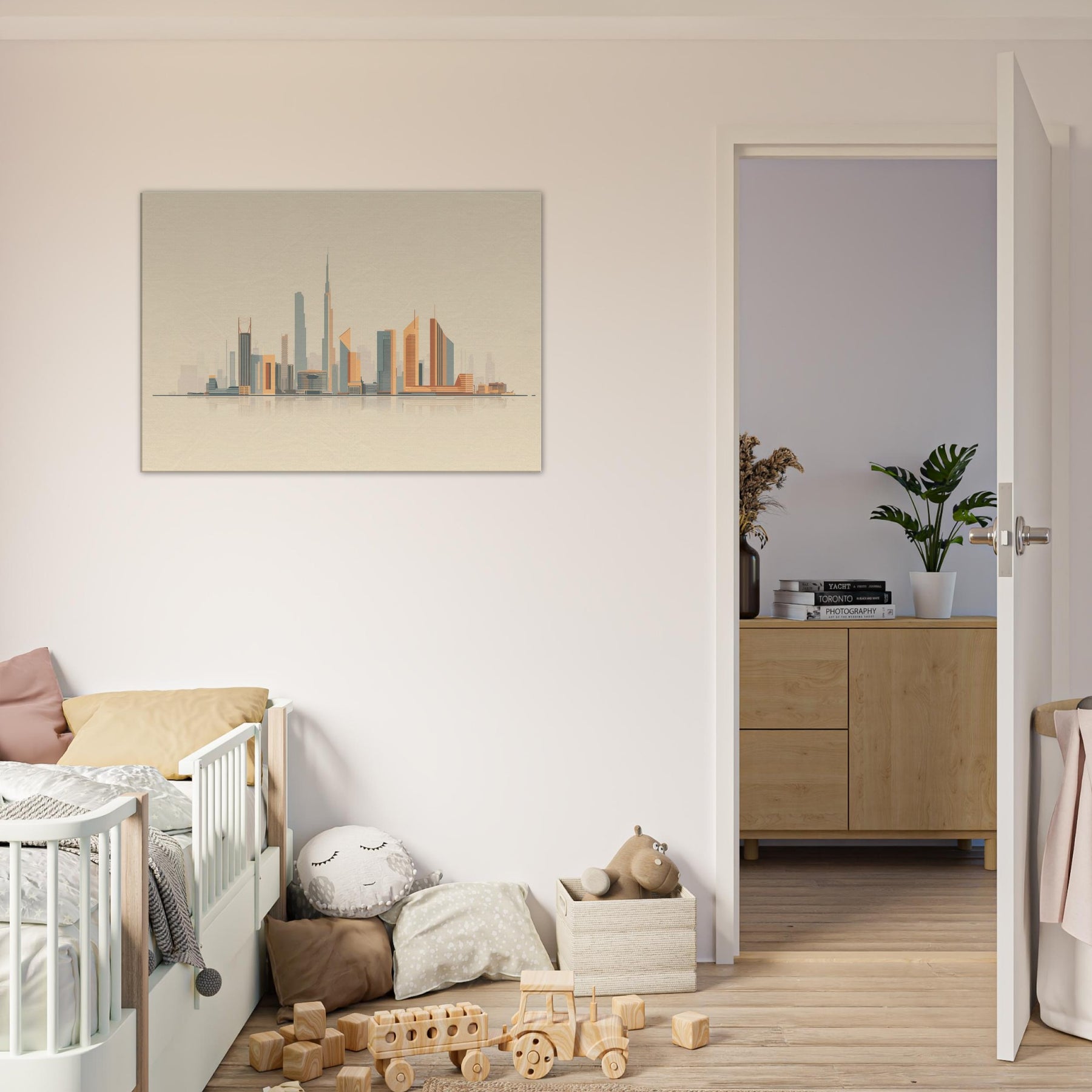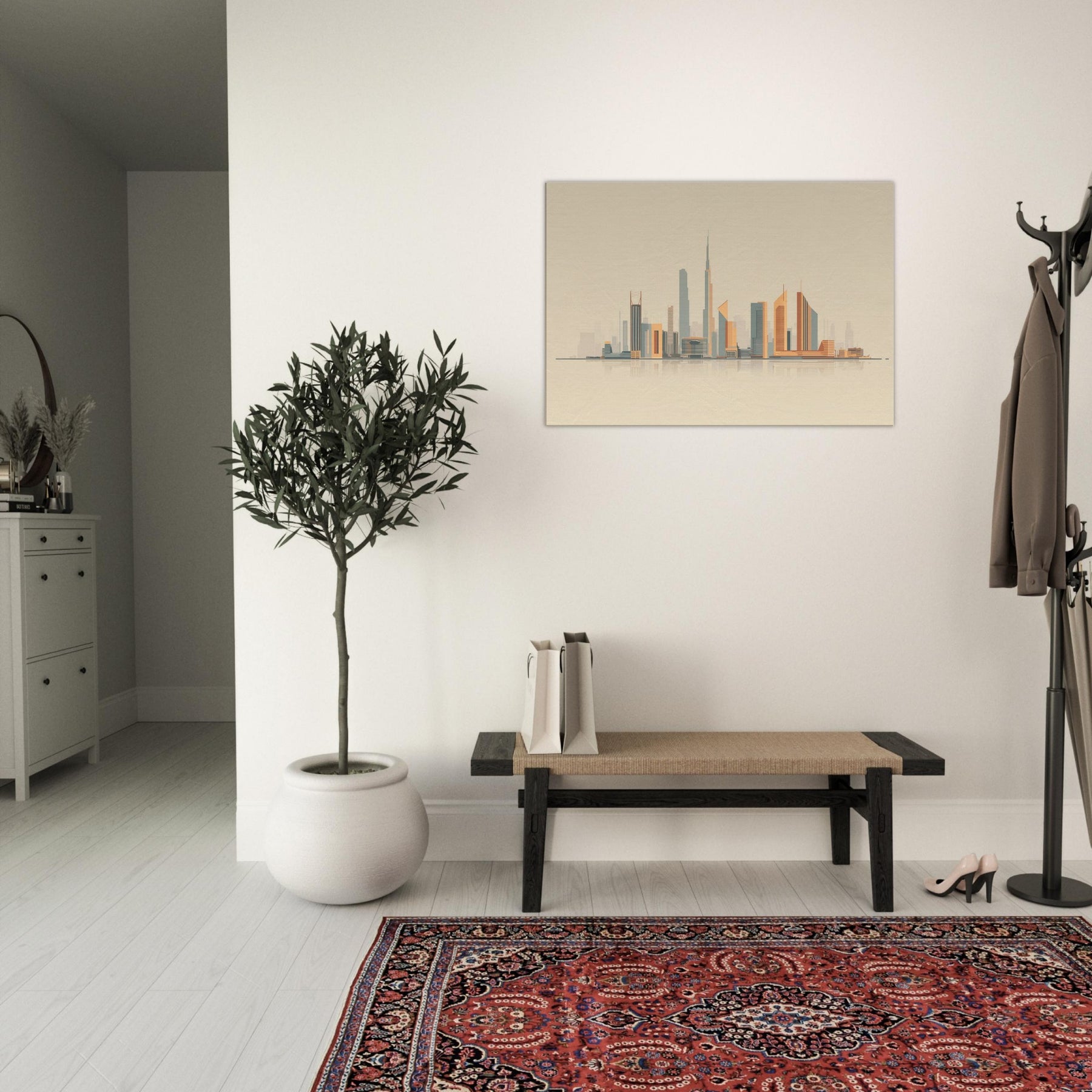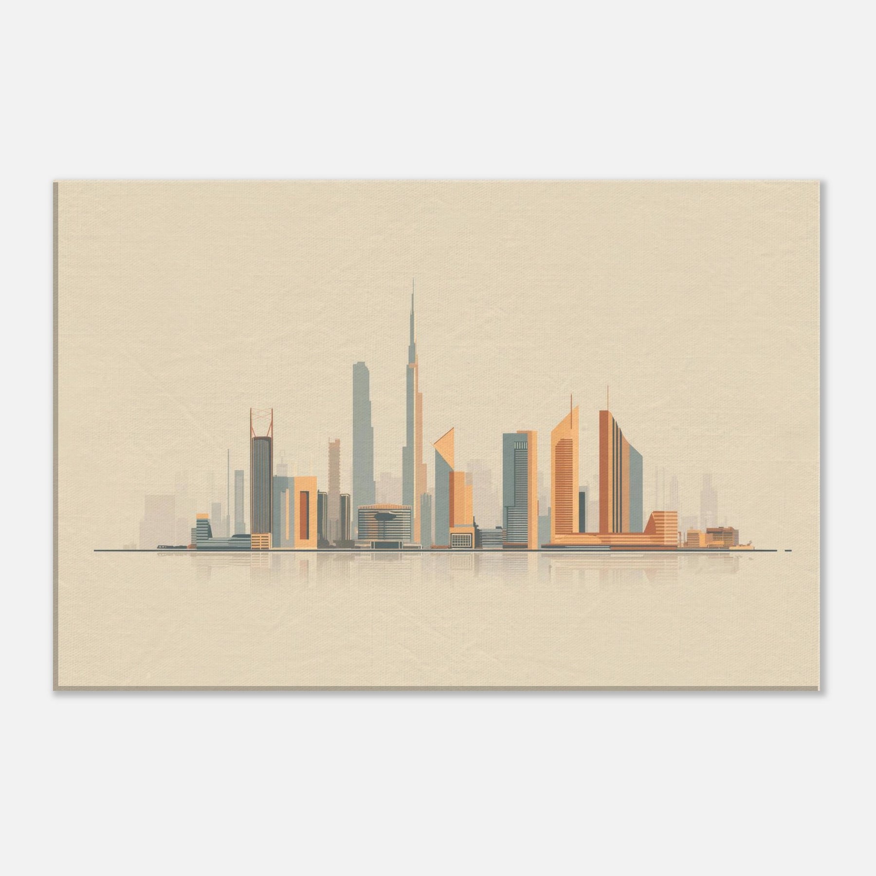 Dubai's skyline unfolds in clean geometries tall towers, angled facades, and a precise shoreline that meets still water. Against a warm, sand soft backdrop, the scene radiates quiet confidence and a day to night glow. The minimalist palette of taupe, peach, and misty blue casts a tranquil atmosphere, inviting contemplation in any living space. Hang it to expand the sense of horizon, letting the room breathe with refined urban poetry and graceful, everyday luxury.