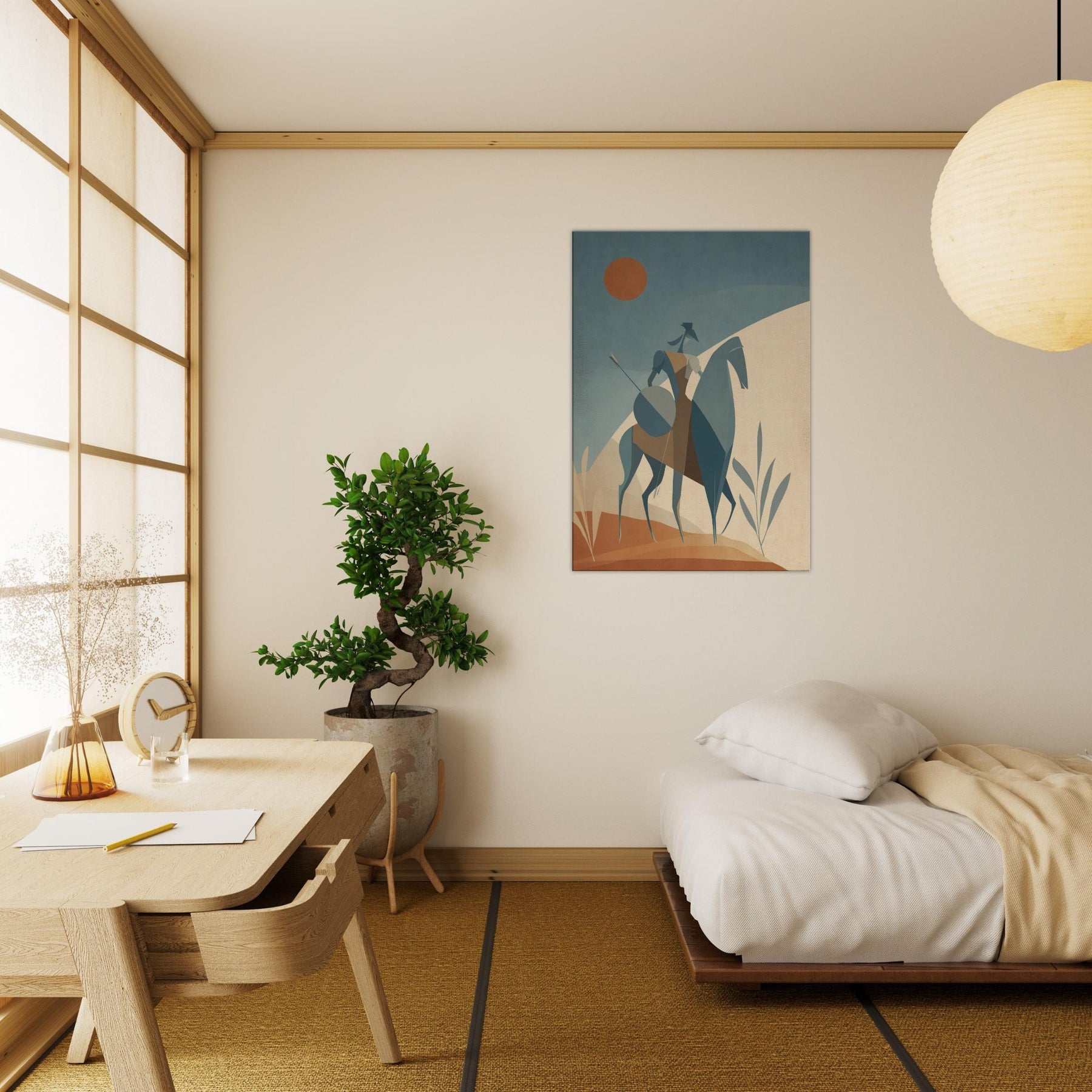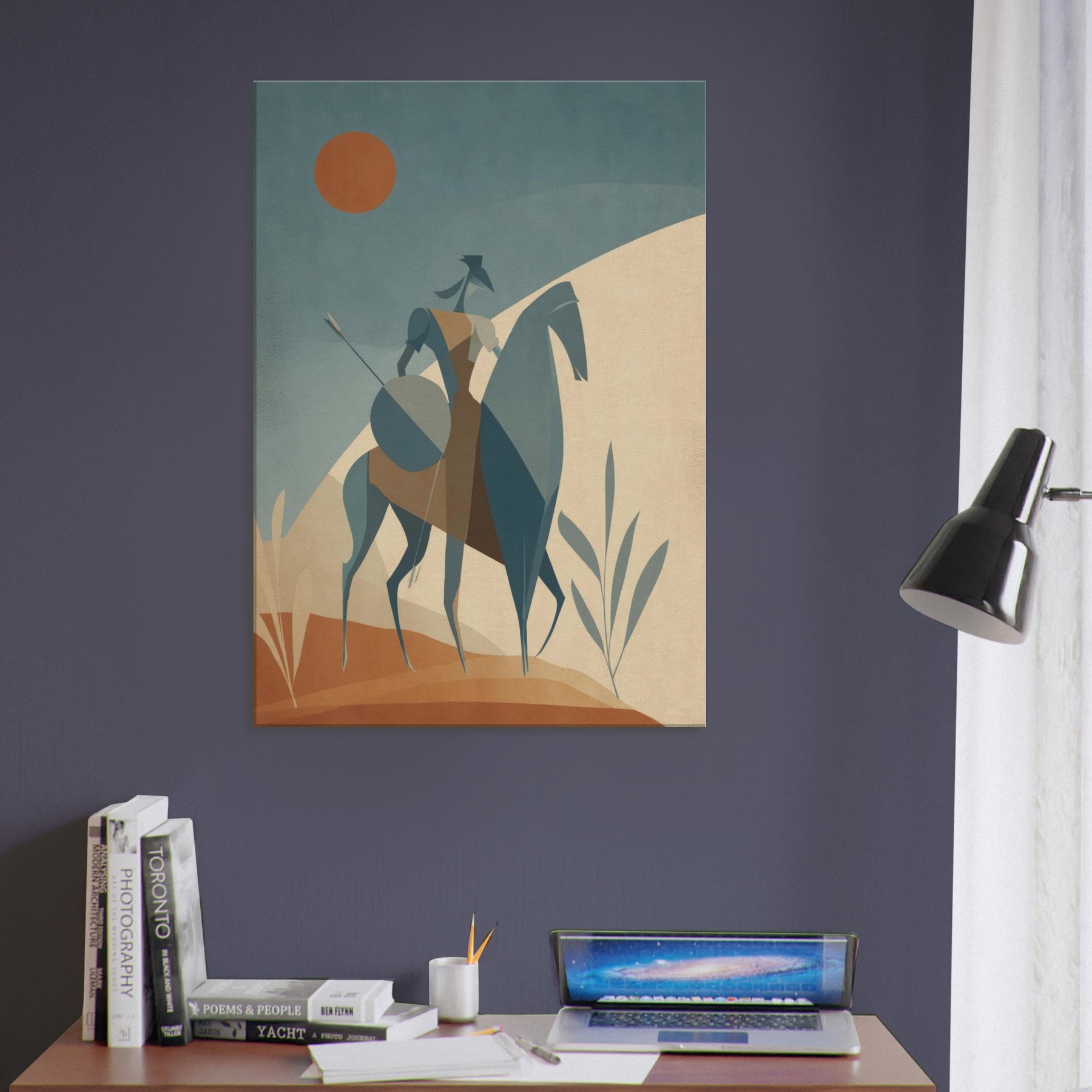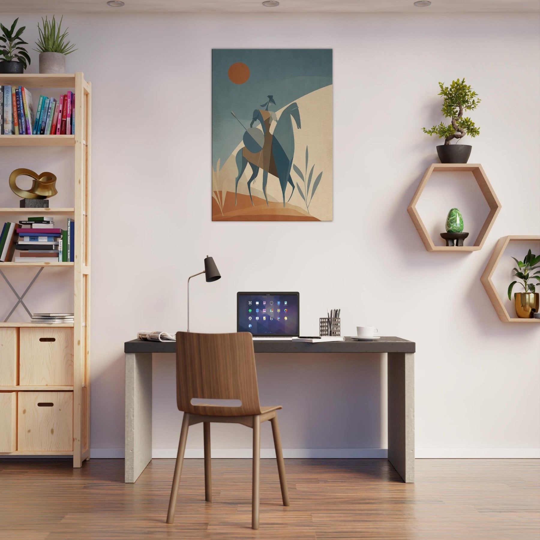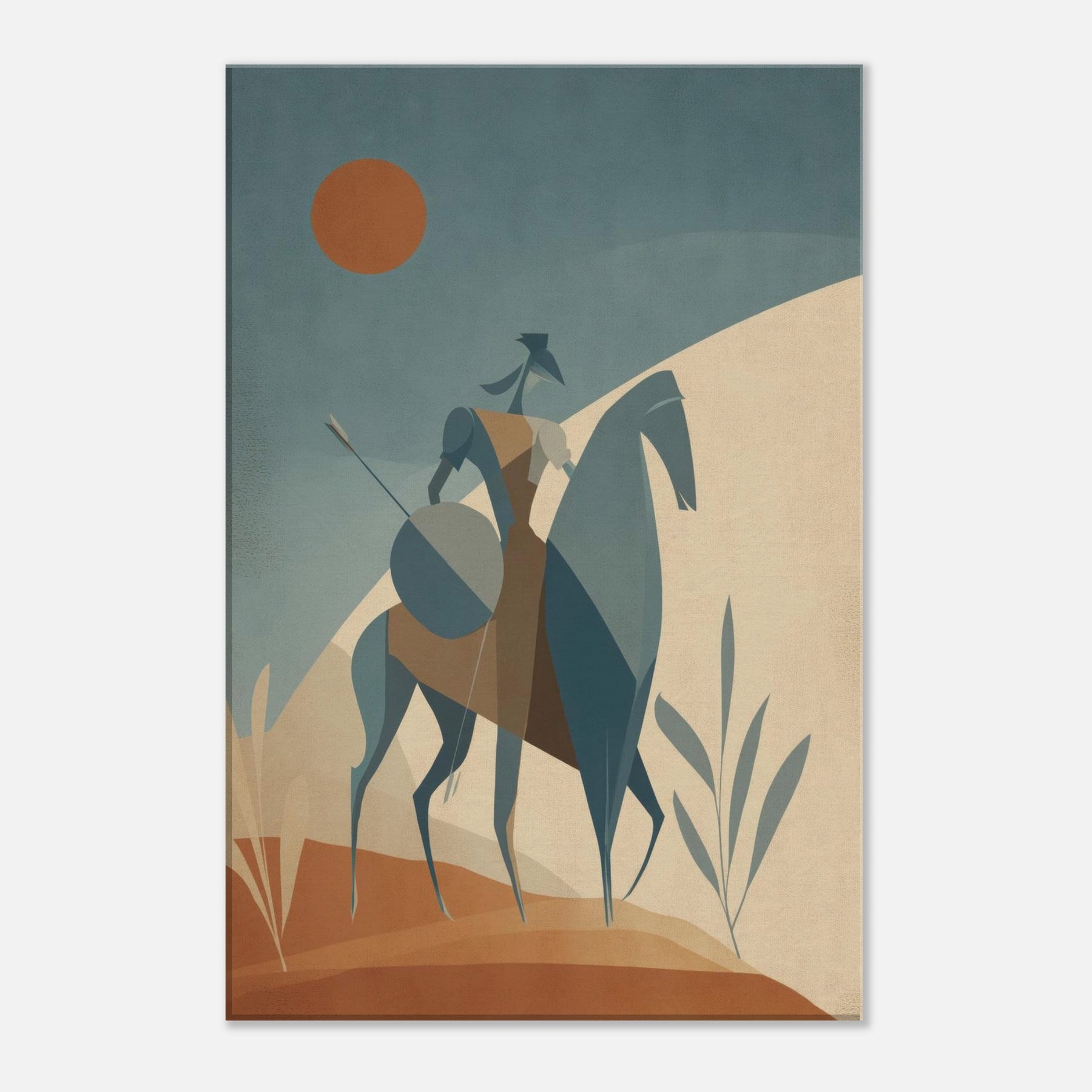 Like a quiet herald of myth, this Centaur strides across a pale, sun warmed . The minimalist geometry arched rider, trenchant horse, and whisper thin spear creates a serene tension, as if the moment hovers between land and sky. The soft, dusky palette invites calm, while the statue like figure lends timeless courage to a living room, bedroom, or study. Place it where light softens the edges of day, and let the atmosphere unfold, turning walls into a quiet sanctuary of imagination.