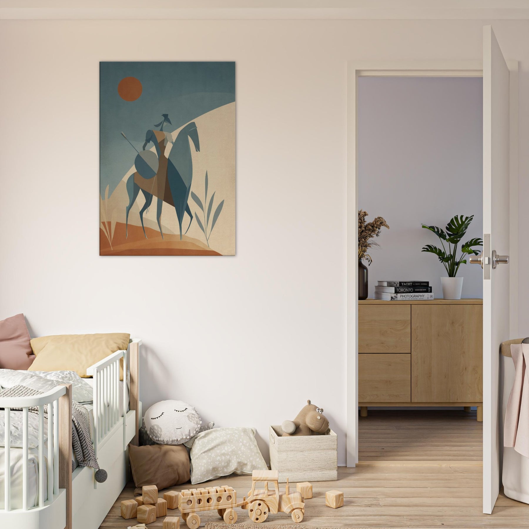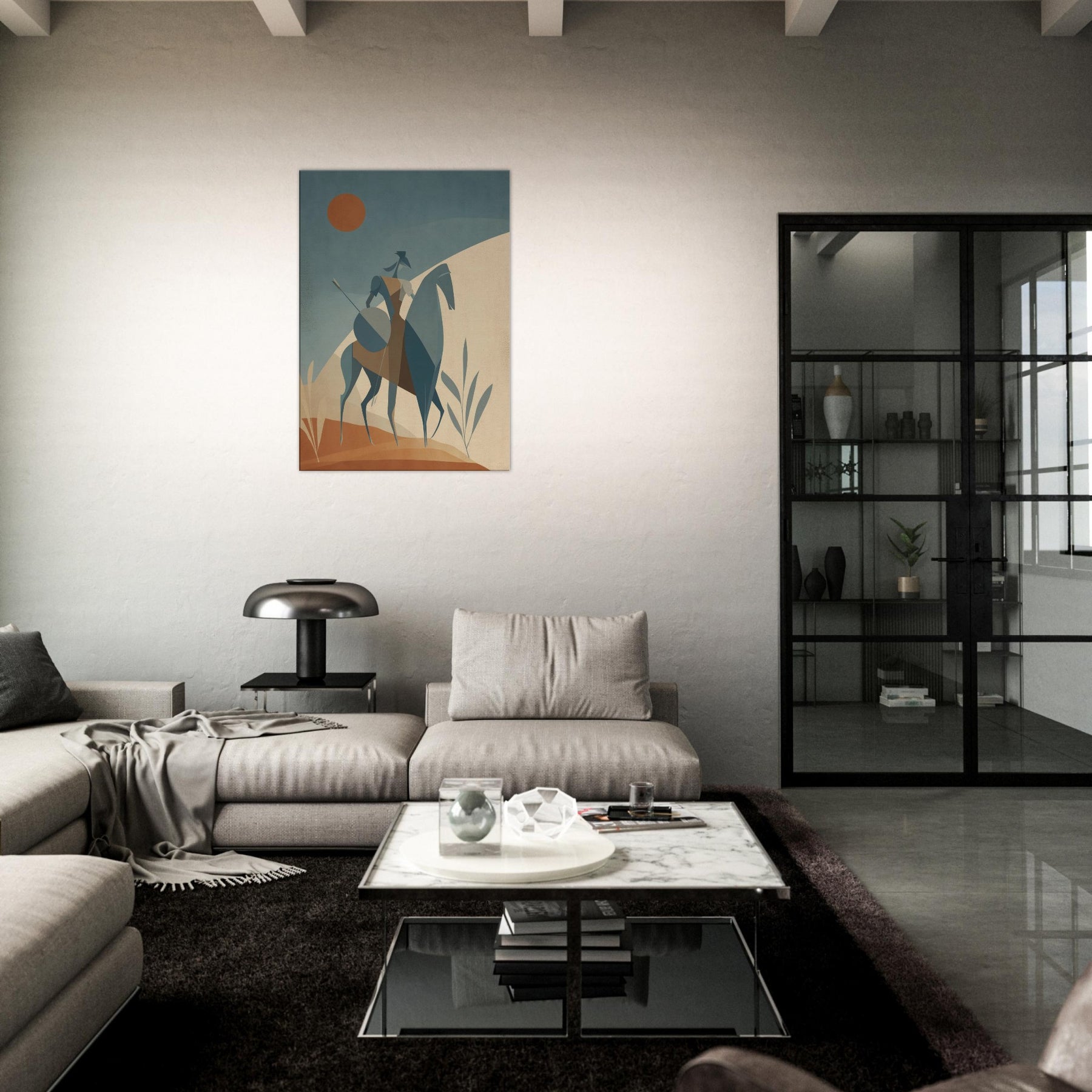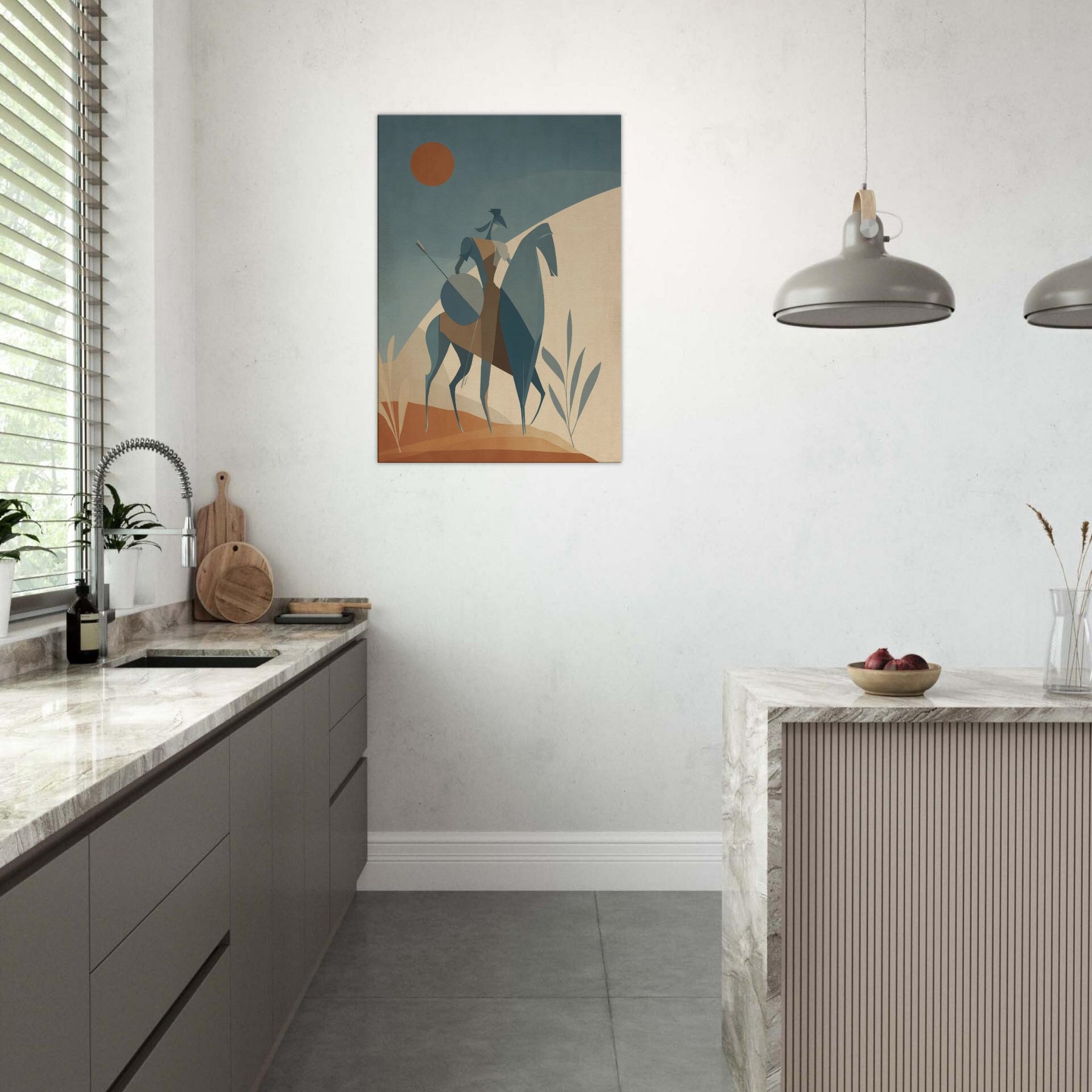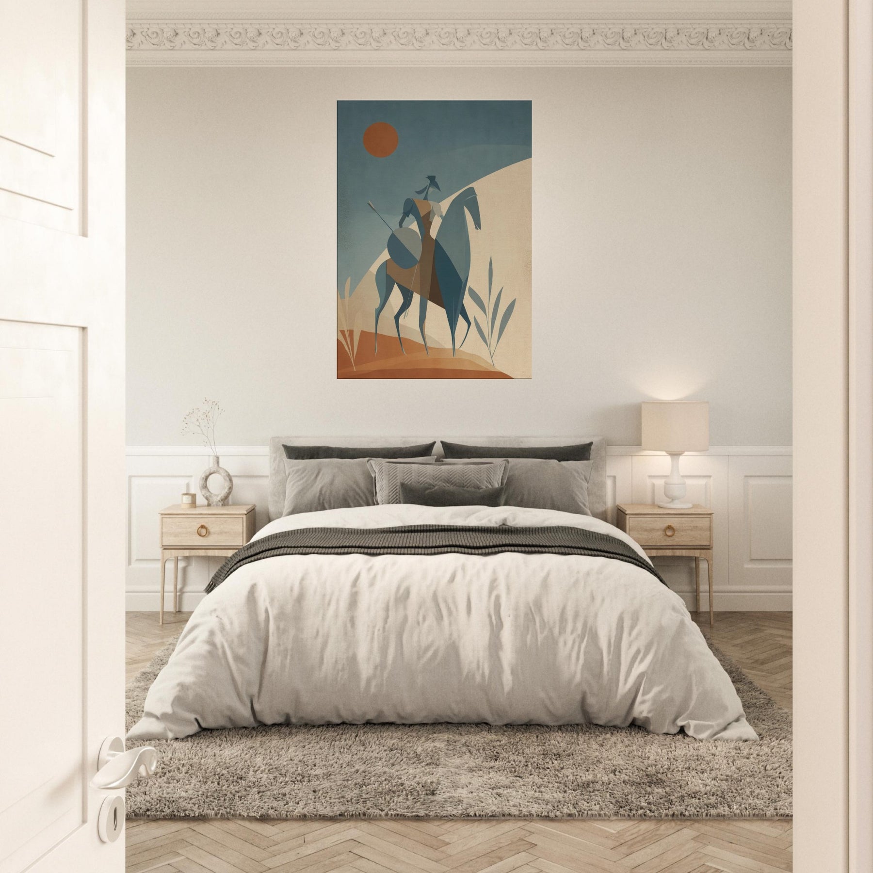 Like a quiet herald of myth, this Centaur strides across a pale, sun warmed . The minimalist geometry arched rider, trenchant horse, and whisper thin spear creates a serene tension, as if the moment hovers between land and sky. The soft, dusky palette invites calm, while the statue like figure lends timeless courage to a living room, bedroom, or study. Place it where light softens the edges of day, and let the atmosphere unfold, turning walls into a quiet sanctuary of imagination.