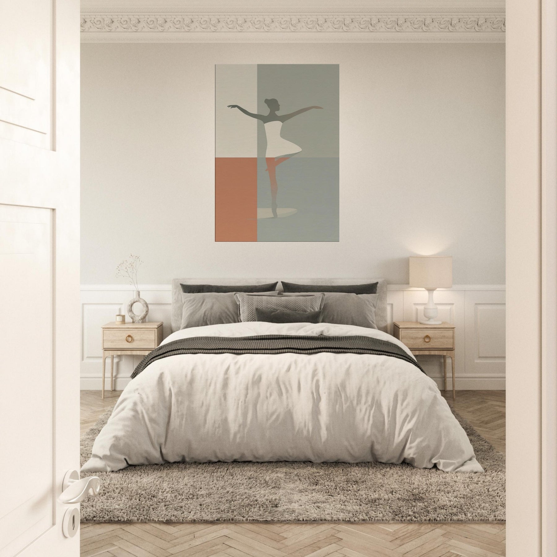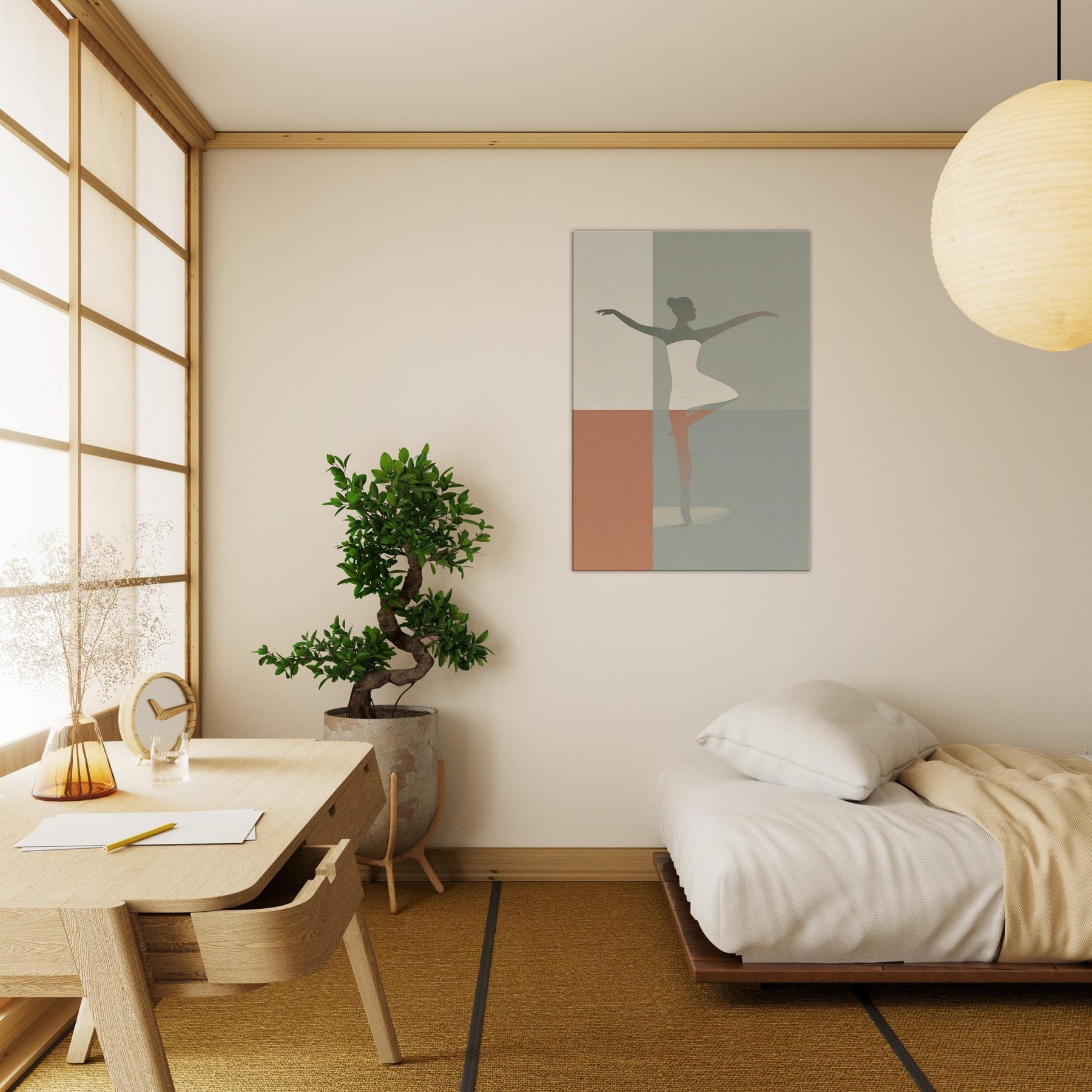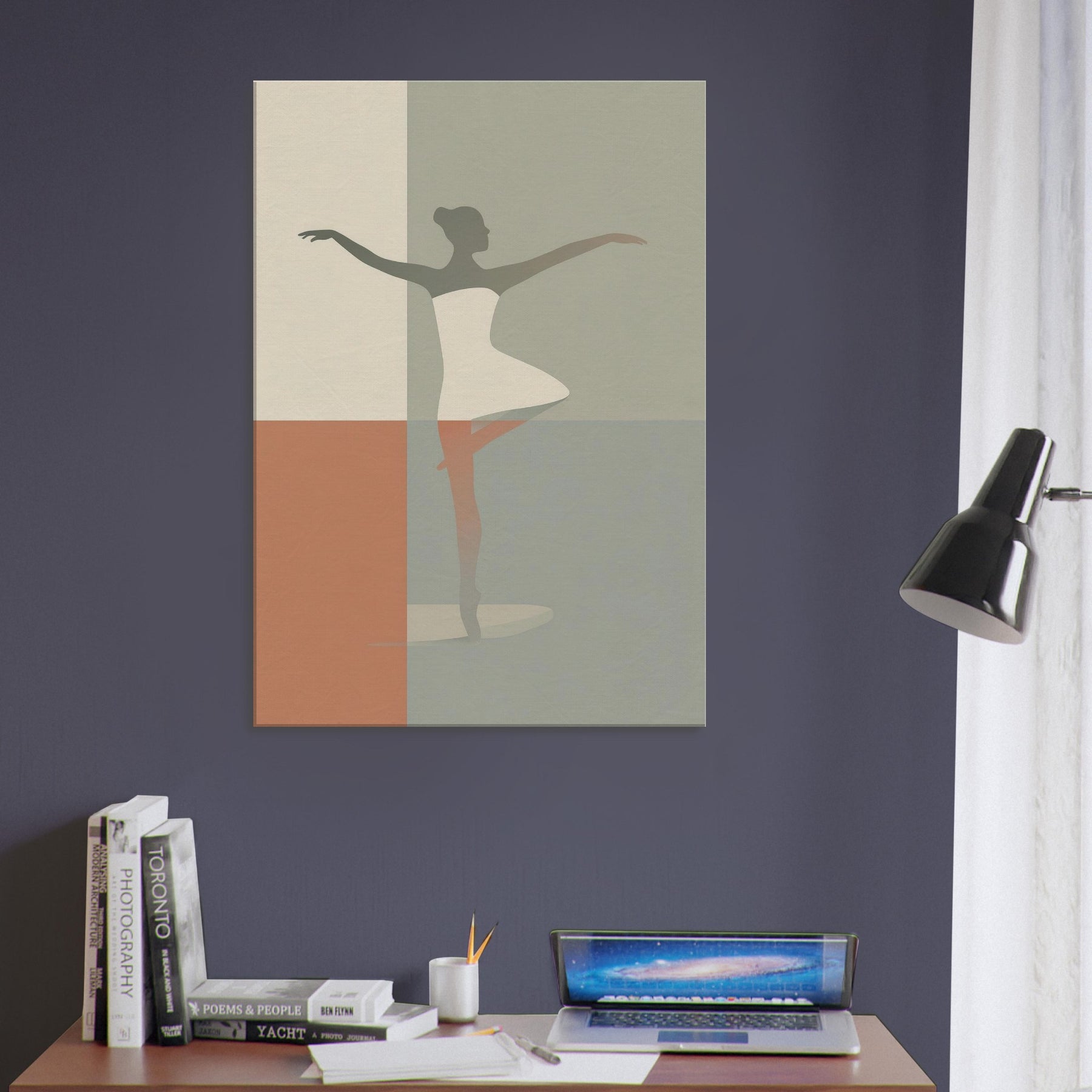 Suspended between color fields, this piece centers on the Primary Subject: a Ballerina Silhouette. Its minimalist contour suggests motion and grace with the quiet elegance of a single line. Soft, muted tones blend like dusk, inviting warmth into a living room or bedroom. The image radiates calm energy, transforming walls into a stage where daily moments become poetry. Hang it where light lingers the silhouette shifts with the day, offering a timeless invitation to breathe, center, and move with intention.