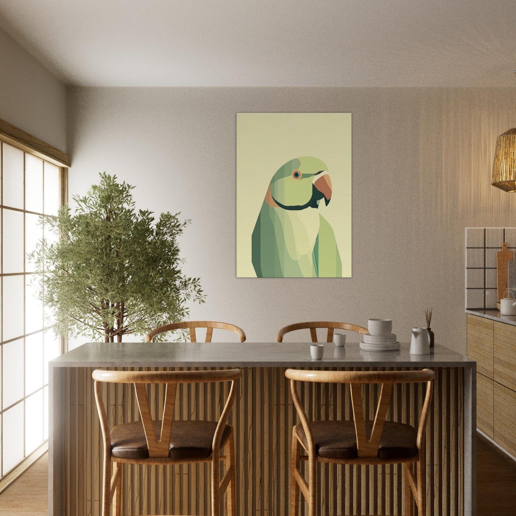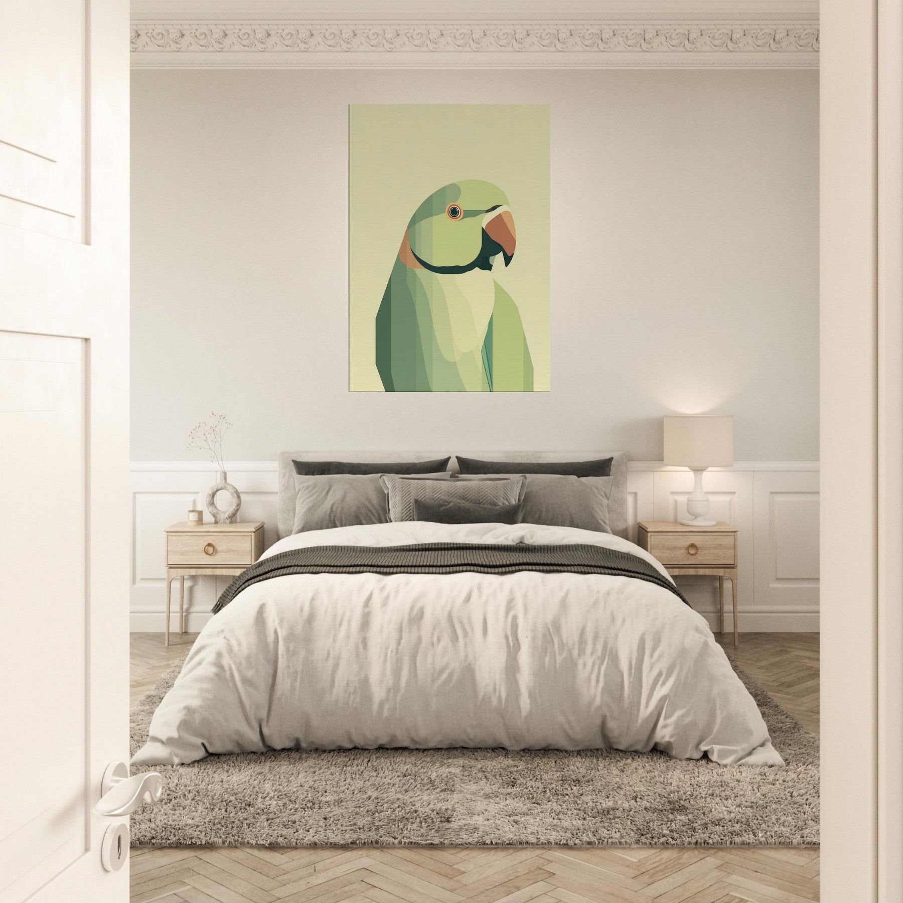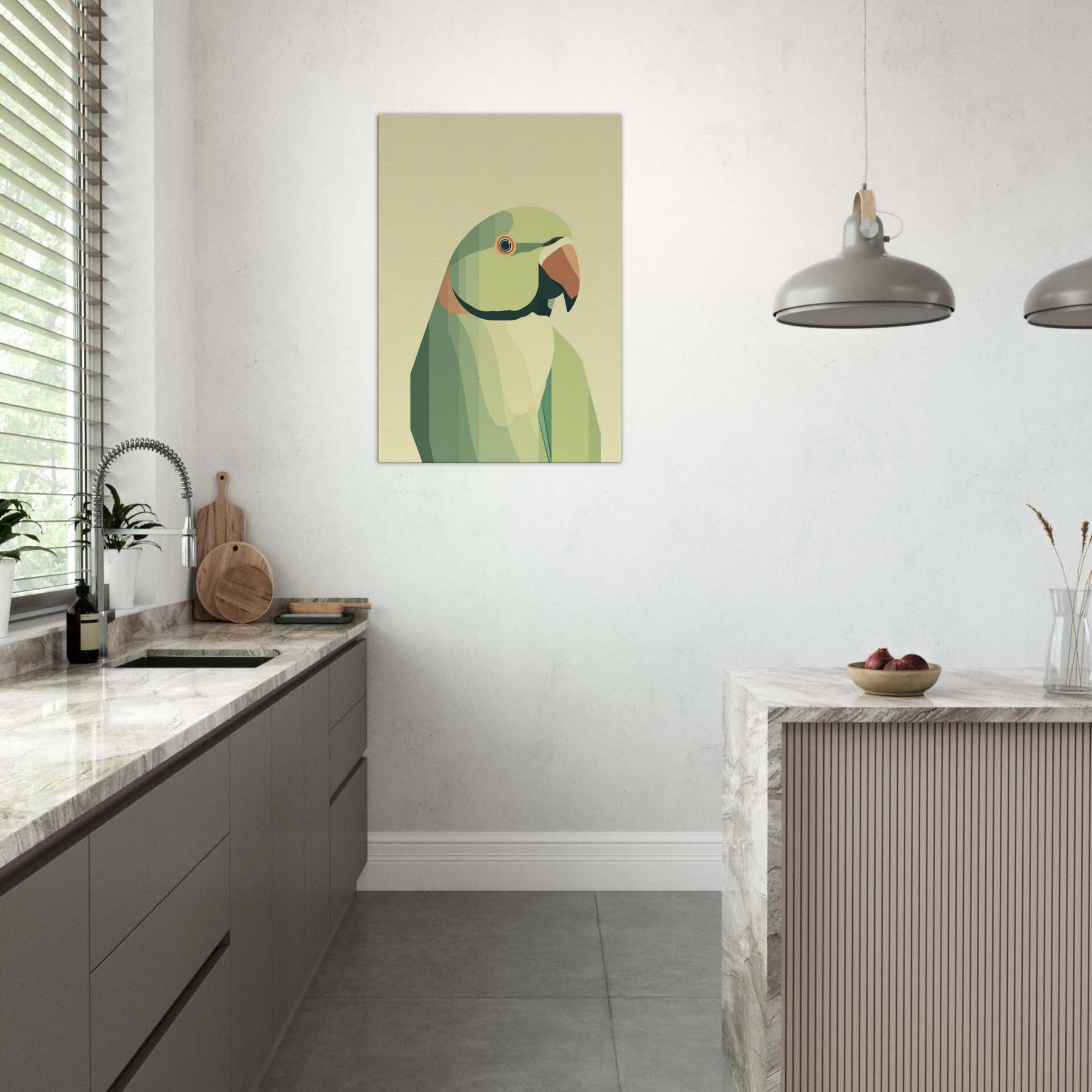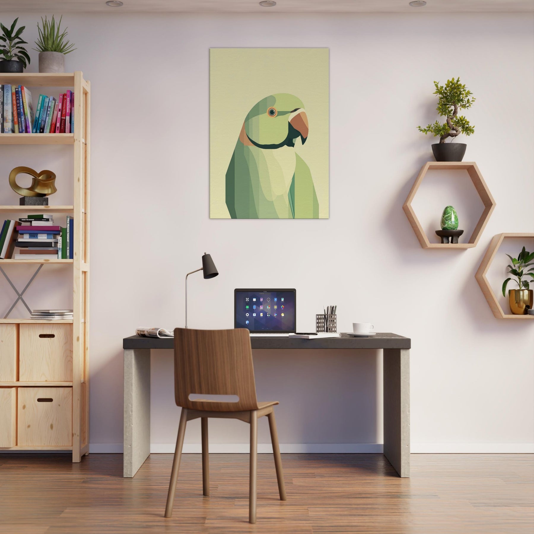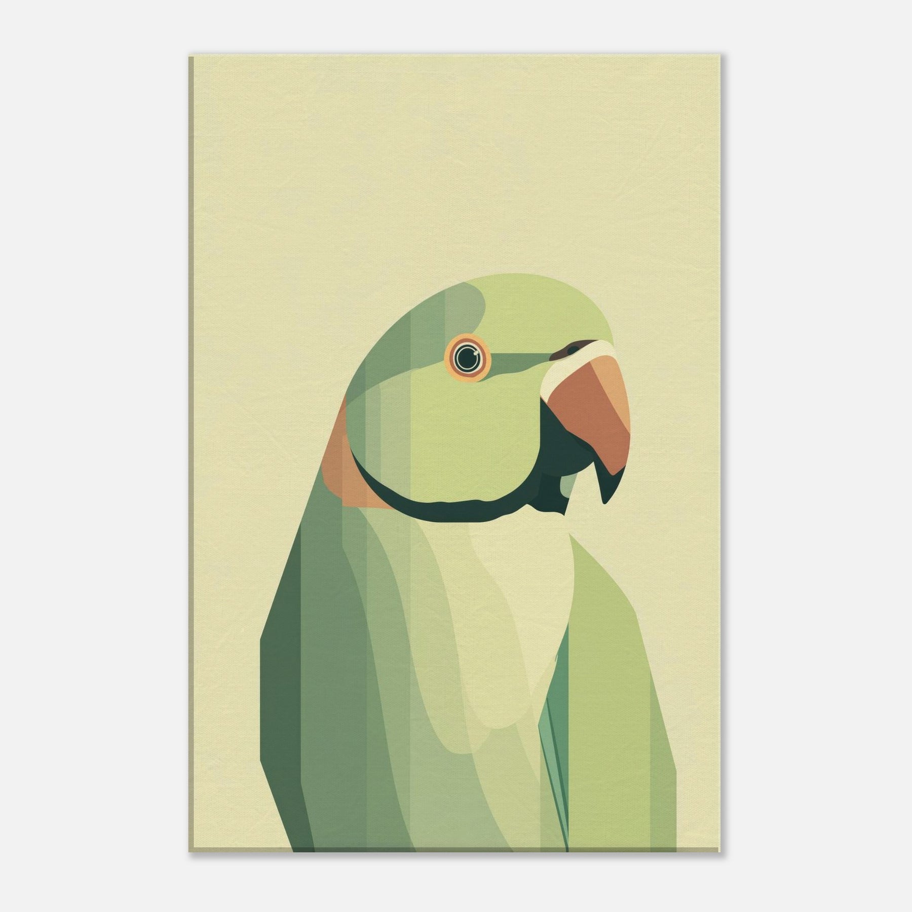 Let this parrot become a quiet focal point in your living space, where soft geometric planes compose a patient, tropical hush. The parrot is rendered in layered greens with a warm orange beak, breathing calm vitality into any room. Its restrained form invites slow, tactile gazing a reminder of bright wings unfolding within a serene, sunlit corner. Perfect above a sofa or bedside, it pairs with natural textures and muted palettes to heighten warmth without overwhelming the senses.