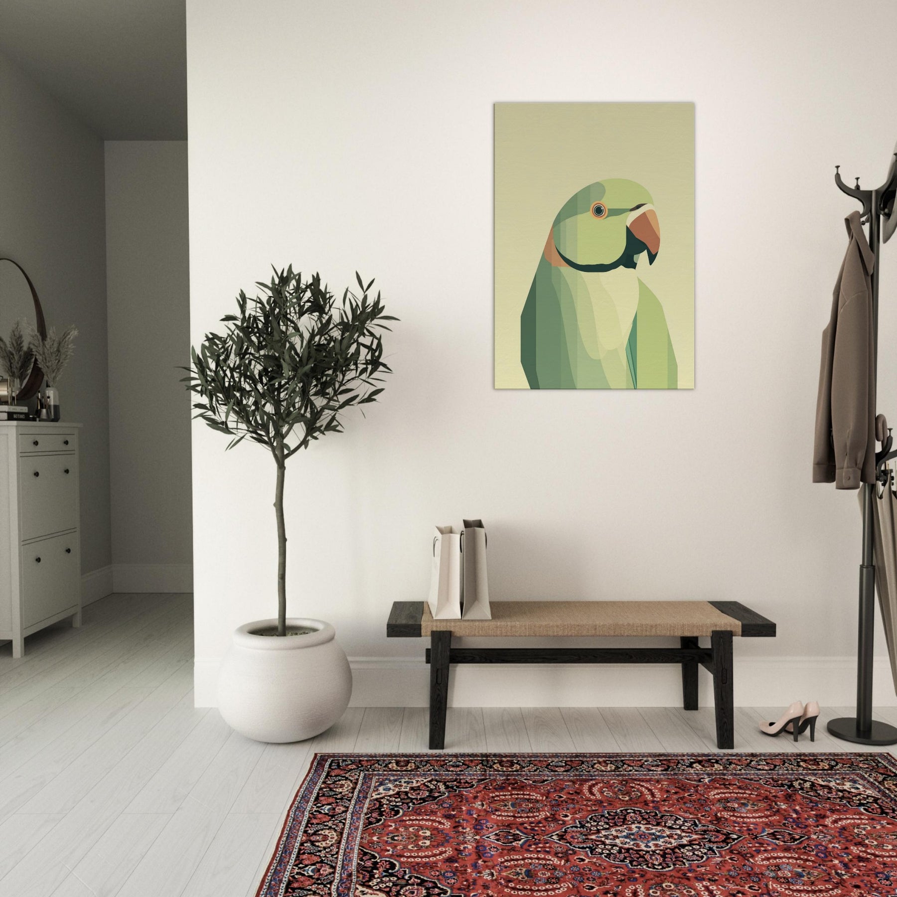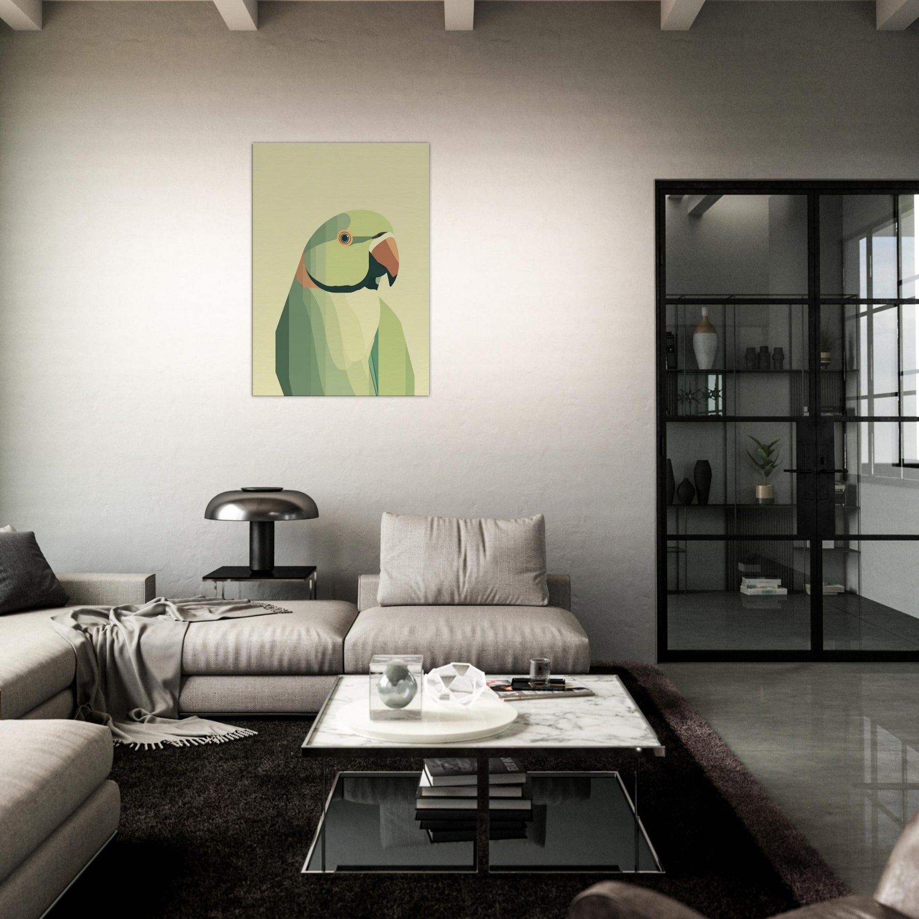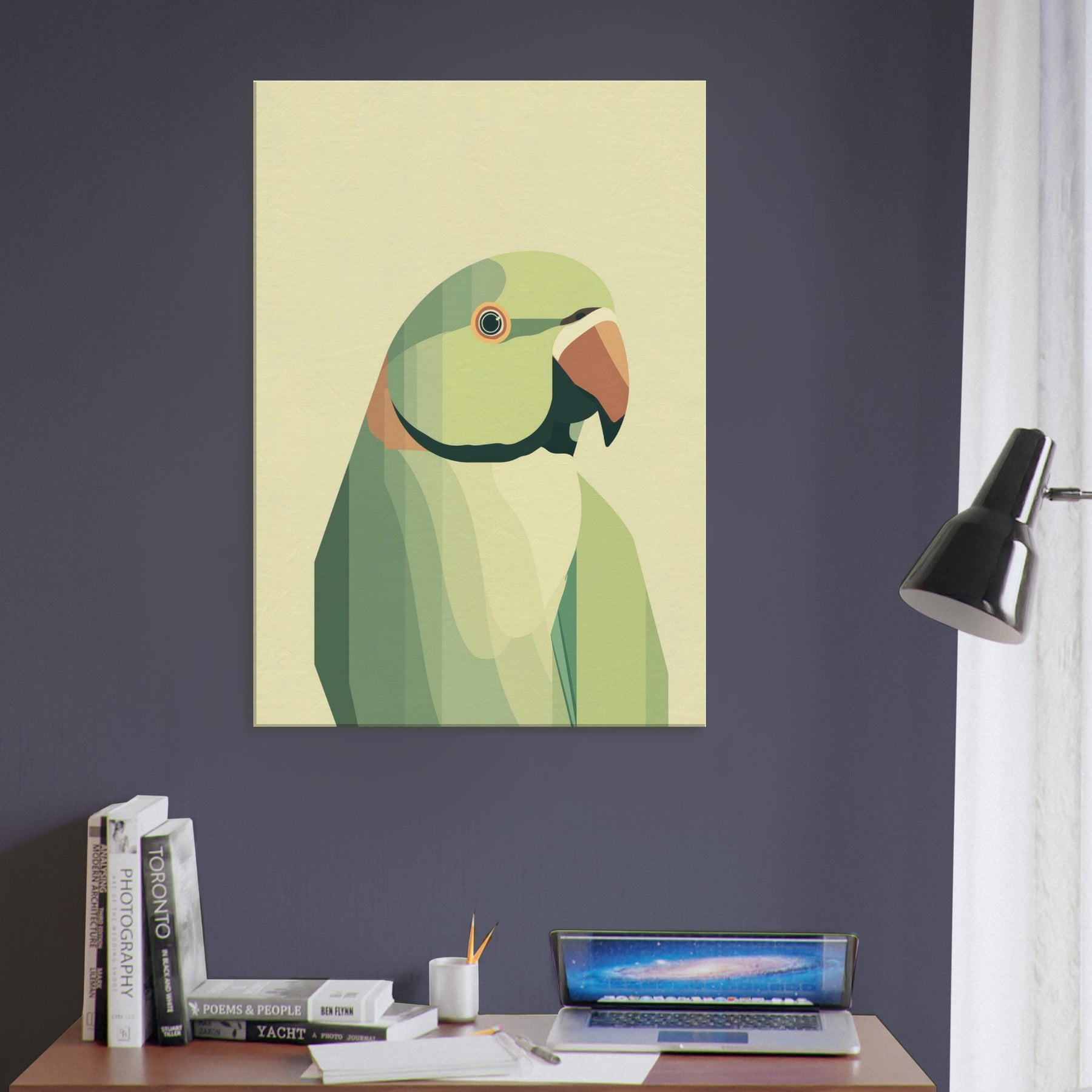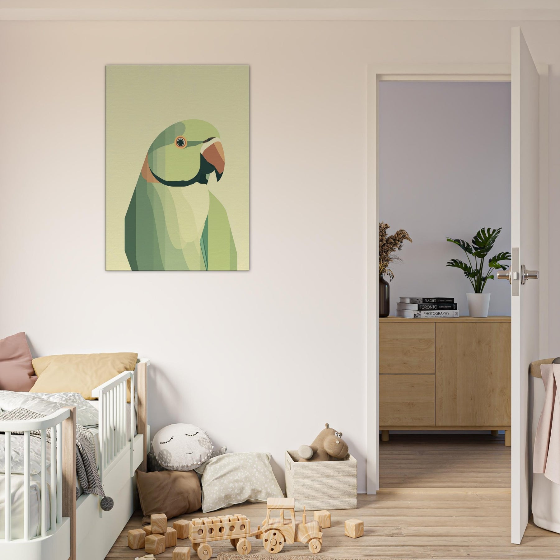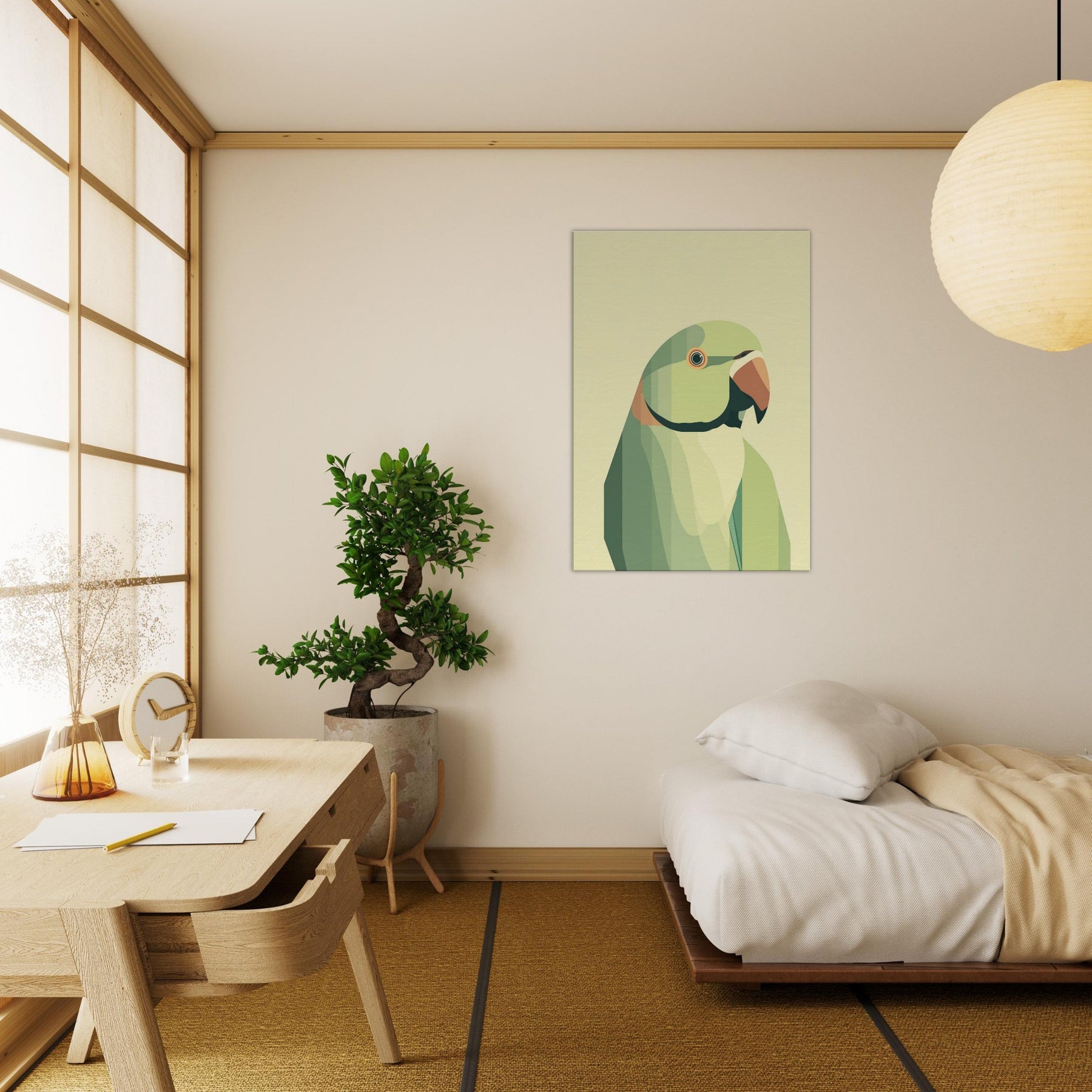 Let this parrot become a quiet focal point in your living space, where soft geometric planes compose a patient, tropical hush. The parrot is rendered in layered greens with a warm orange beak, breathing calm vitality into any room. Its restrained form invites slow, tactile gazing a reminder of bright wings unfolding within a serene, sunlit corner. Perfect above a sofa or bedside, it pairs with natural textures and muted palettes to heighten warmth without overwhelming the senses.