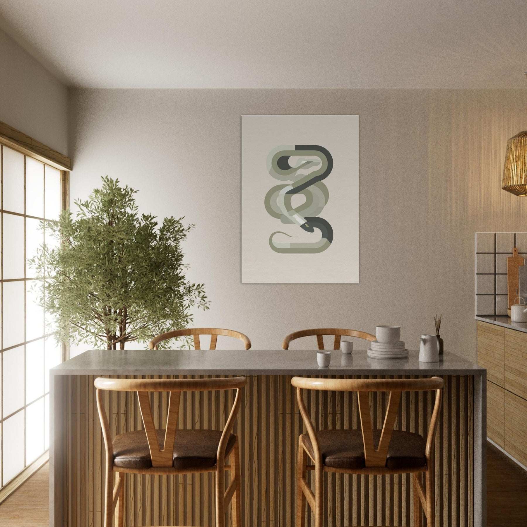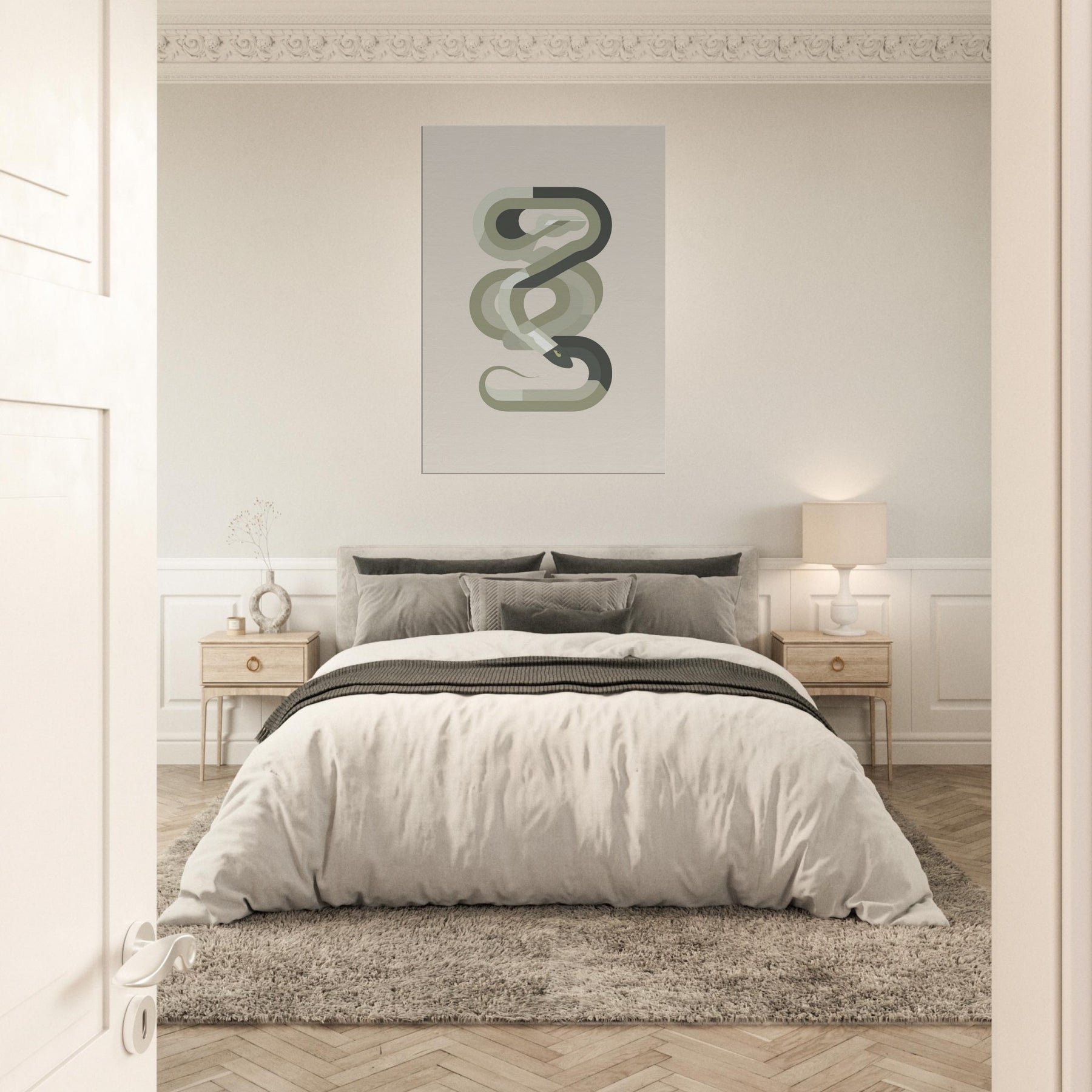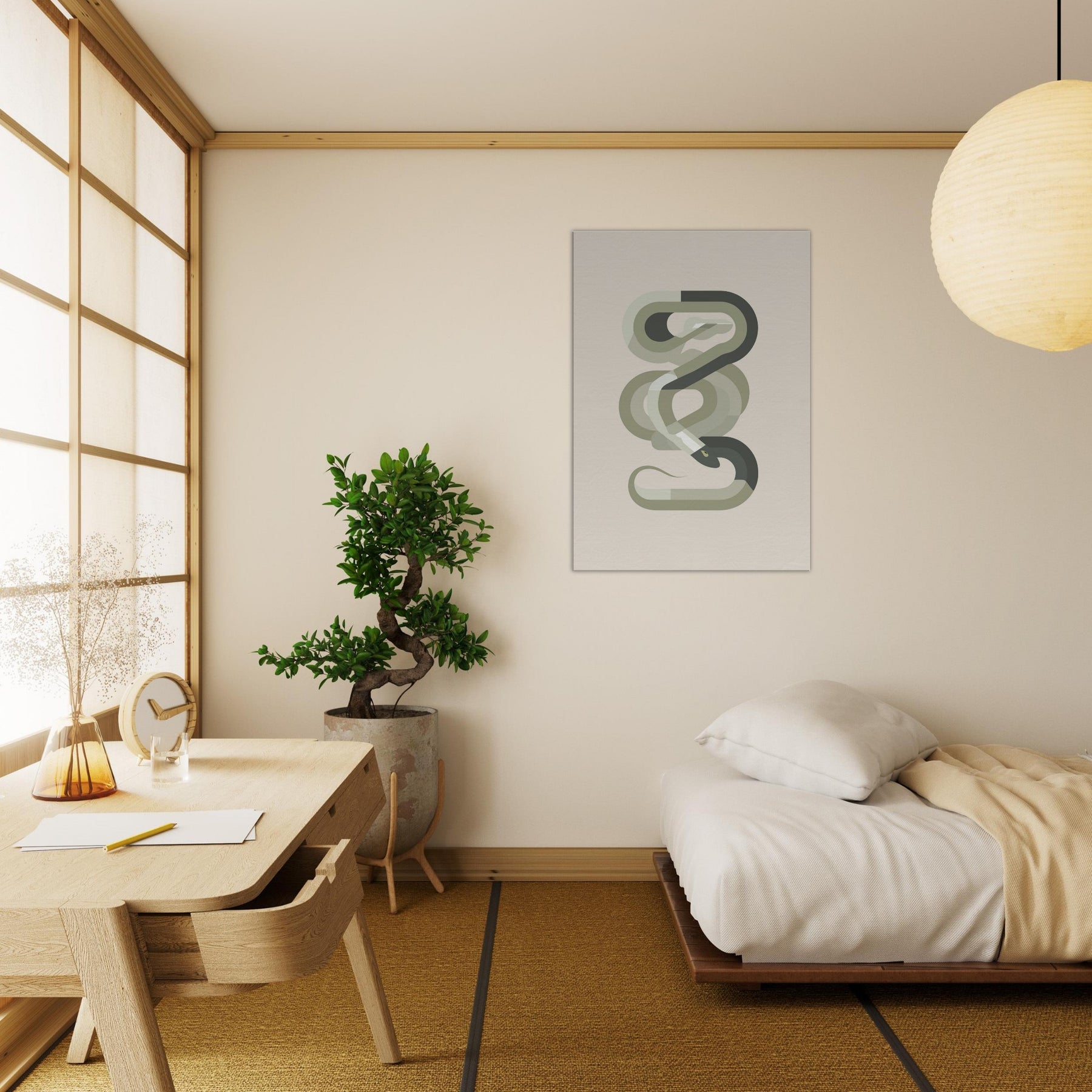 Infinity Serpent unfolds across a quiet field of sand and sage, a minimalist meditation on motion and balance. This artwork invites the eye to drift along its graceful curve, tracing light and shadow as they weave through soft, muted greens and charcoal. The absence of clutter amplifies the sense of stillness, making the atmosphere feel expansive and hushed, perfect for a living room, study, or bedroom where contemplation is desired. It pairs with natural textures and modern furnishings, enriching space with quiet mysticism and refined elegance.