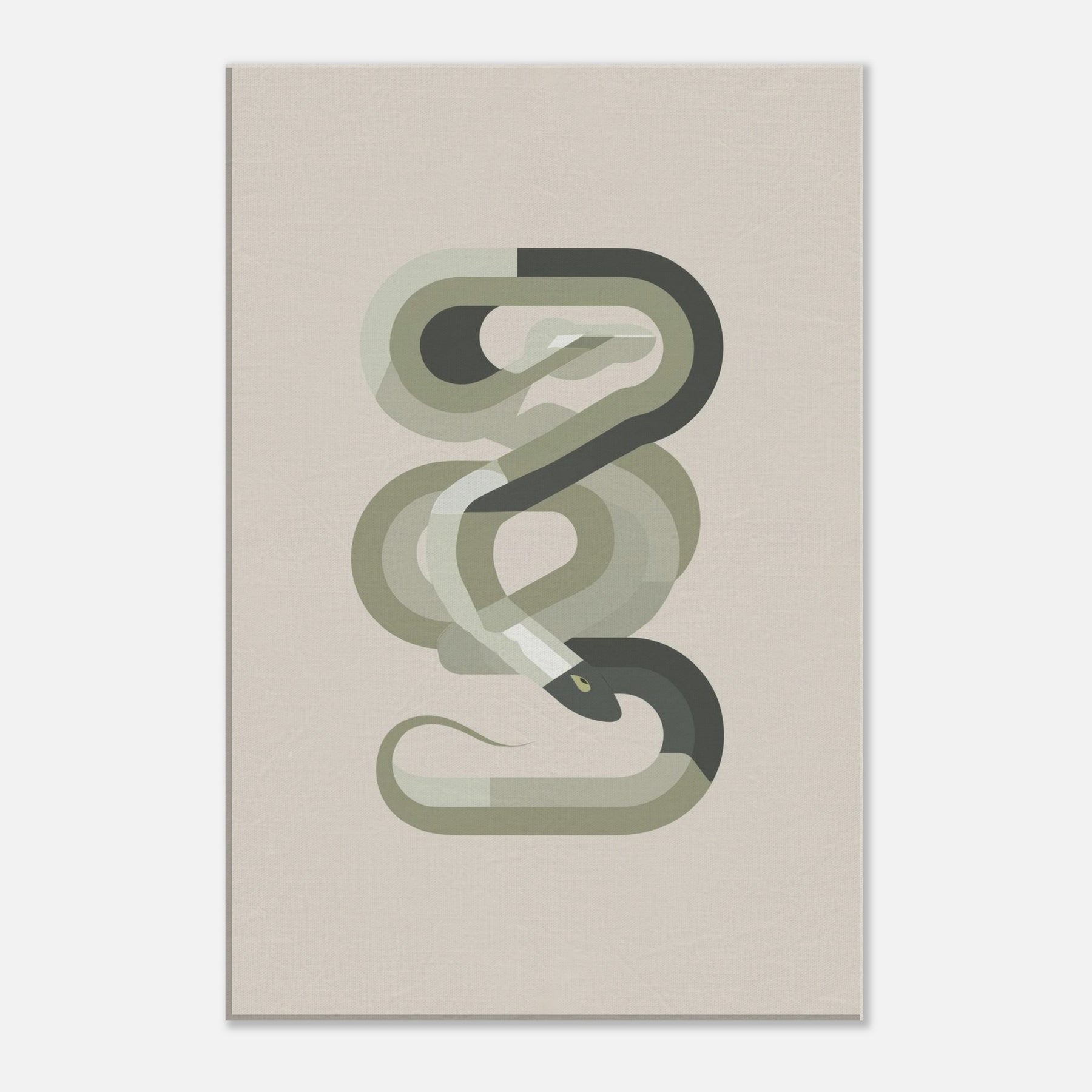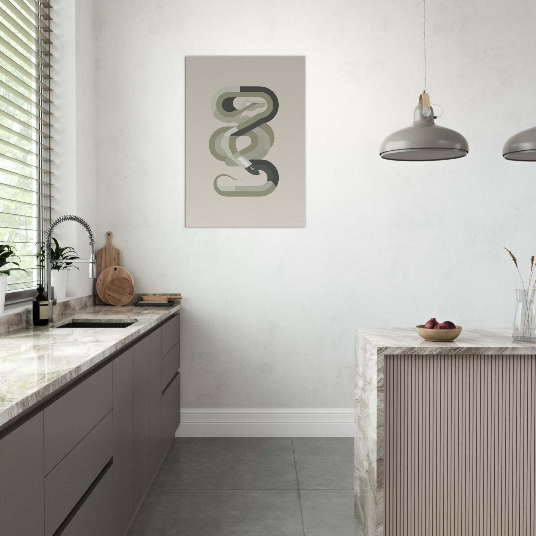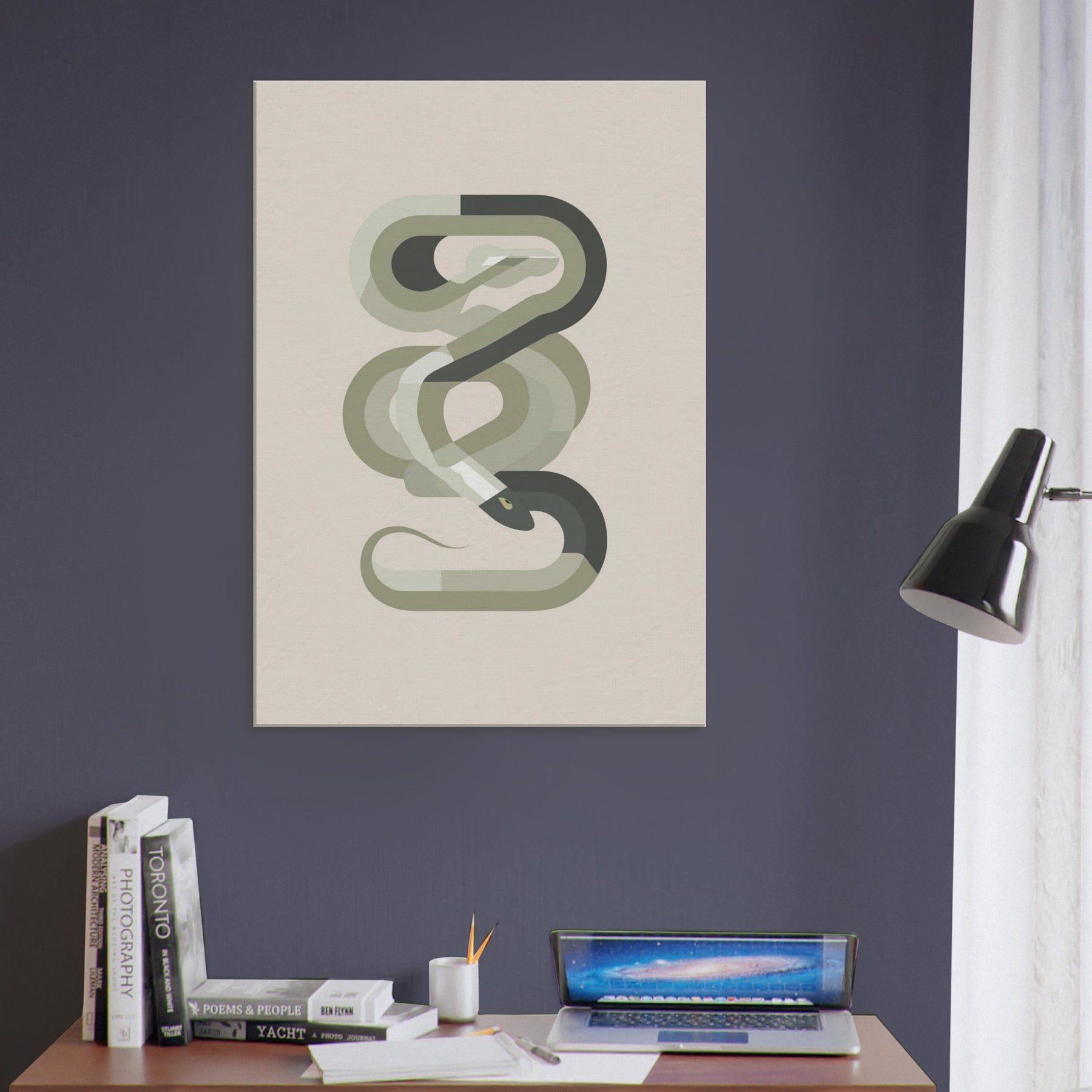 Infinity Serpent unfolds across a quiet field of sand and sage, a minimalist meditation on motion and balance. This artwork invites the eye to drift along its graceful curve, tracing light and shadow as they weave through soft, muted greens and charcoal. The absence of clutter amplifies the sense of stillness, making the atmosphere feel expansive and hushed, perfect for a living room, study, or bedroom where contemplation is desired. It pairs with natural textures and modern furnishings, enriching space with quiet mysticism and refined elegance.