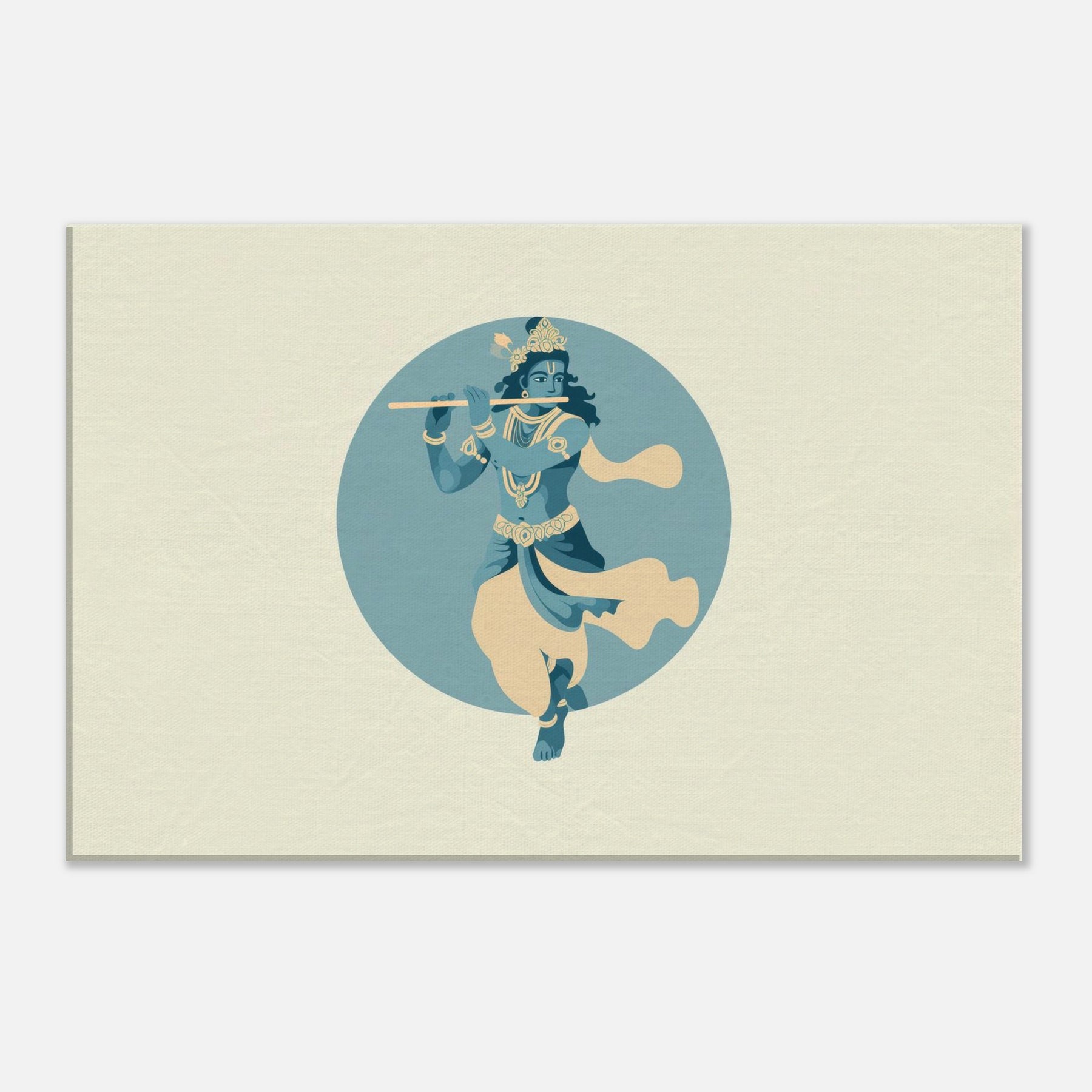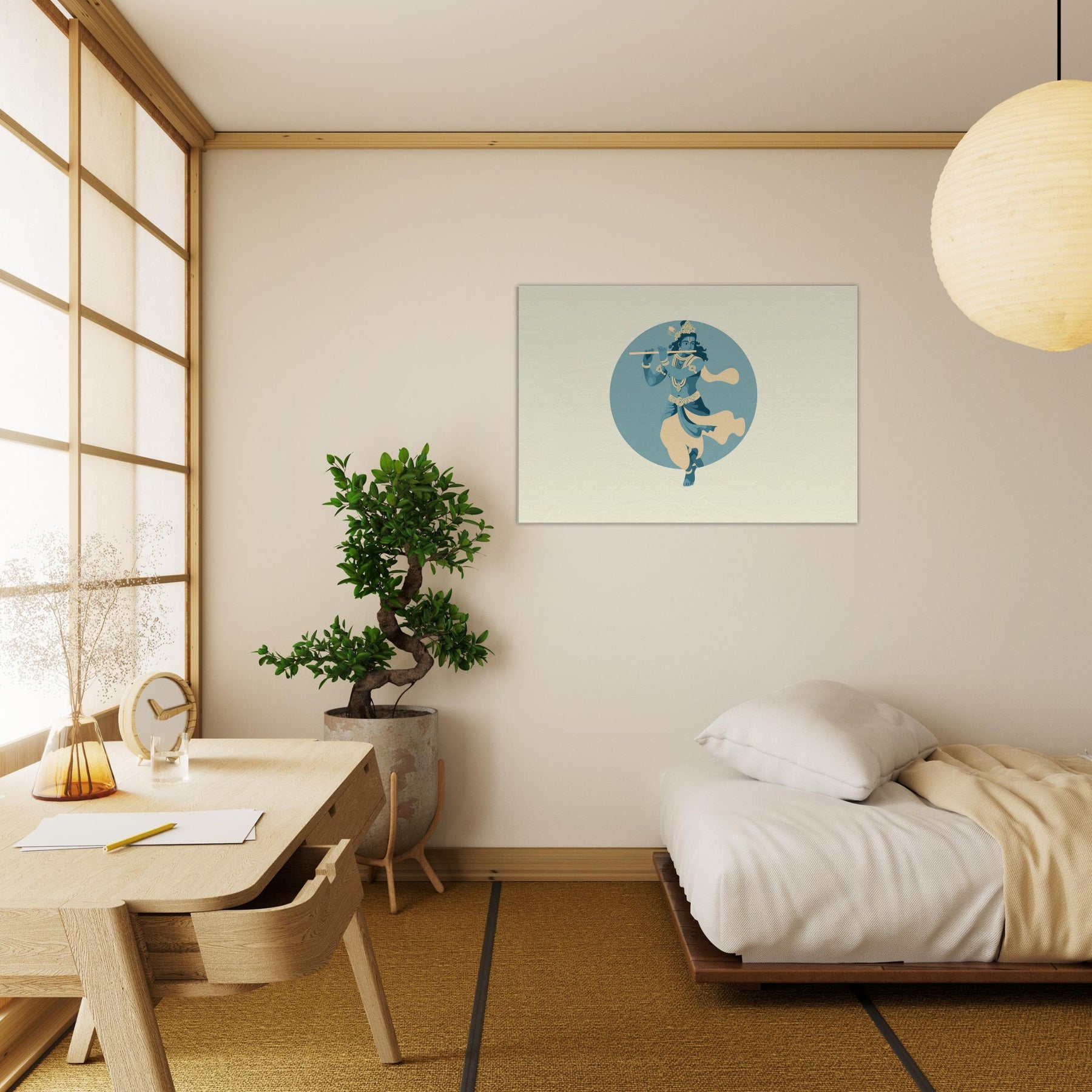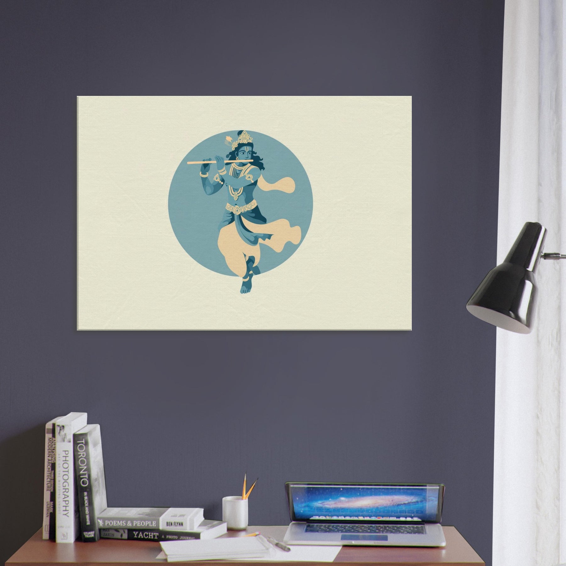 Krishna with Flute glides through a hush of color and form, a minimalist study in rhythm and grace. The figure's flute becomes a thread of light, drawing the eye into a circle of calm that anchors any room. Soft blues and warm ivory lend a contemplative glow, inviting quiet moments, meditative breaths, and subtle movement as the eye follows the flowing scarf. This mystical transforms living spaces into a tranquil shrine of beauty, balance, and understated wonder.