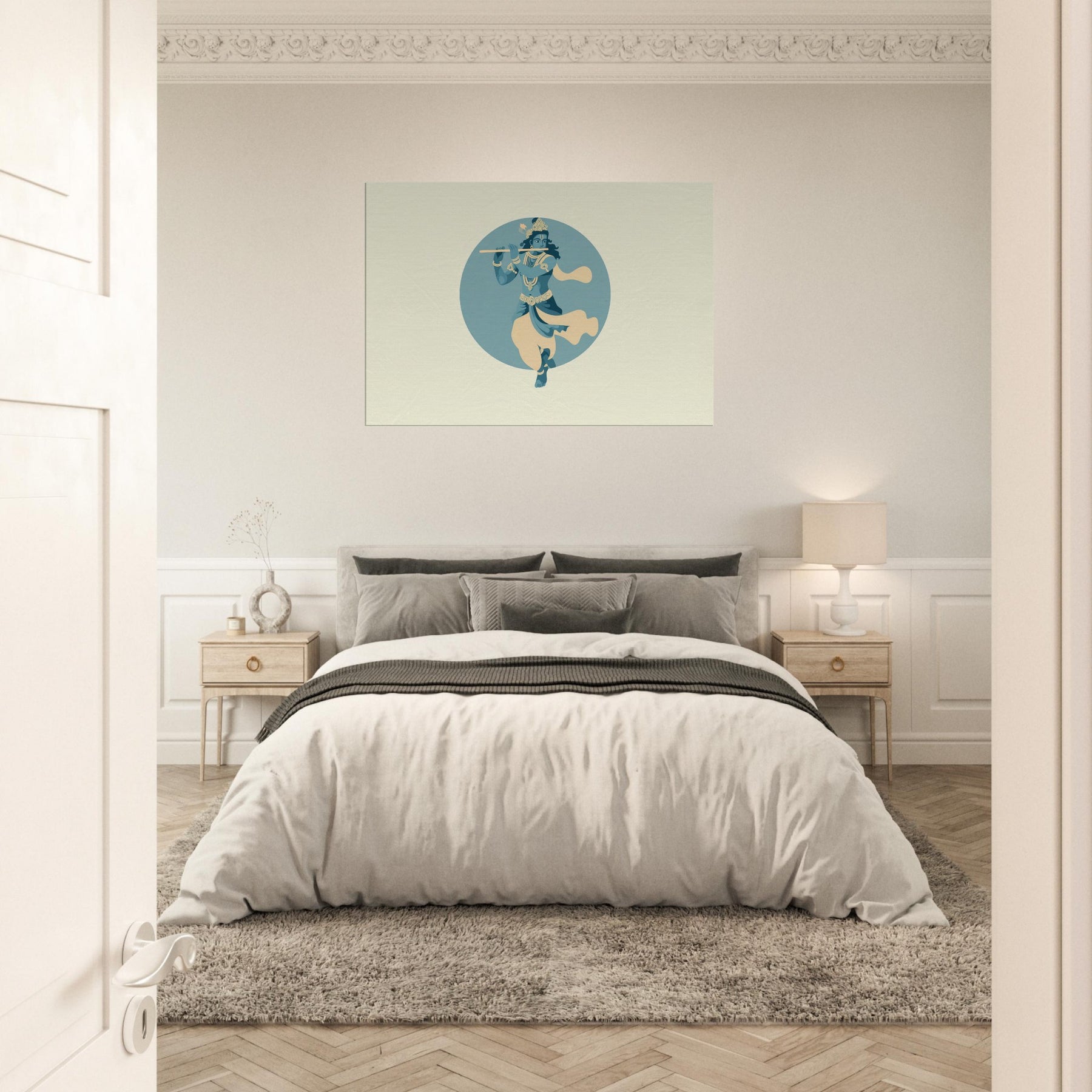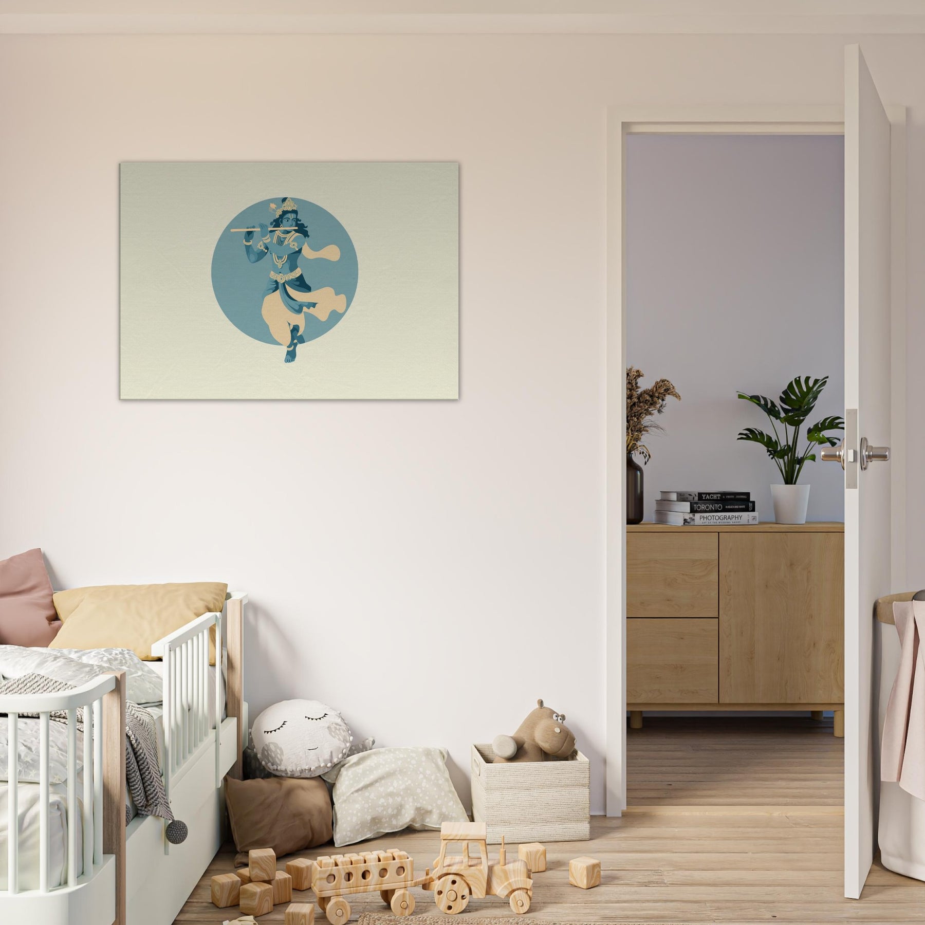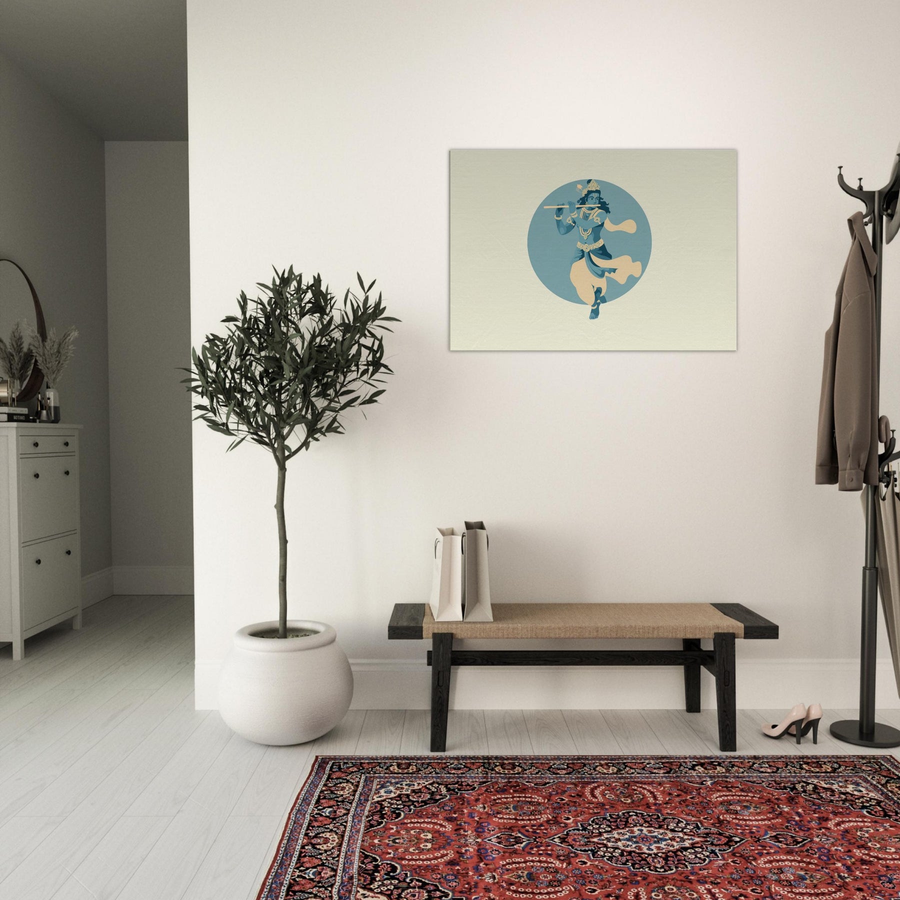 Krishna with Flute glides through a hush of color and form, a minimalist study in rhythm and grace. The figure's flute becomes a thread of light, drawing the eye into a circle of calm that anchors any room. Soft blues and warm ivory lend a contemplative glow, inviting quiet moments, meditative breaths, and subtle movement as the eye follows the flowing scarf. This mystical transforms living spaces into a tranquil shrine of beauty, balance, and understated wonder.