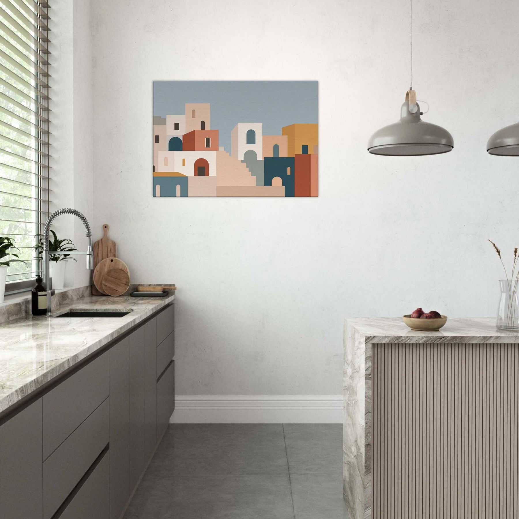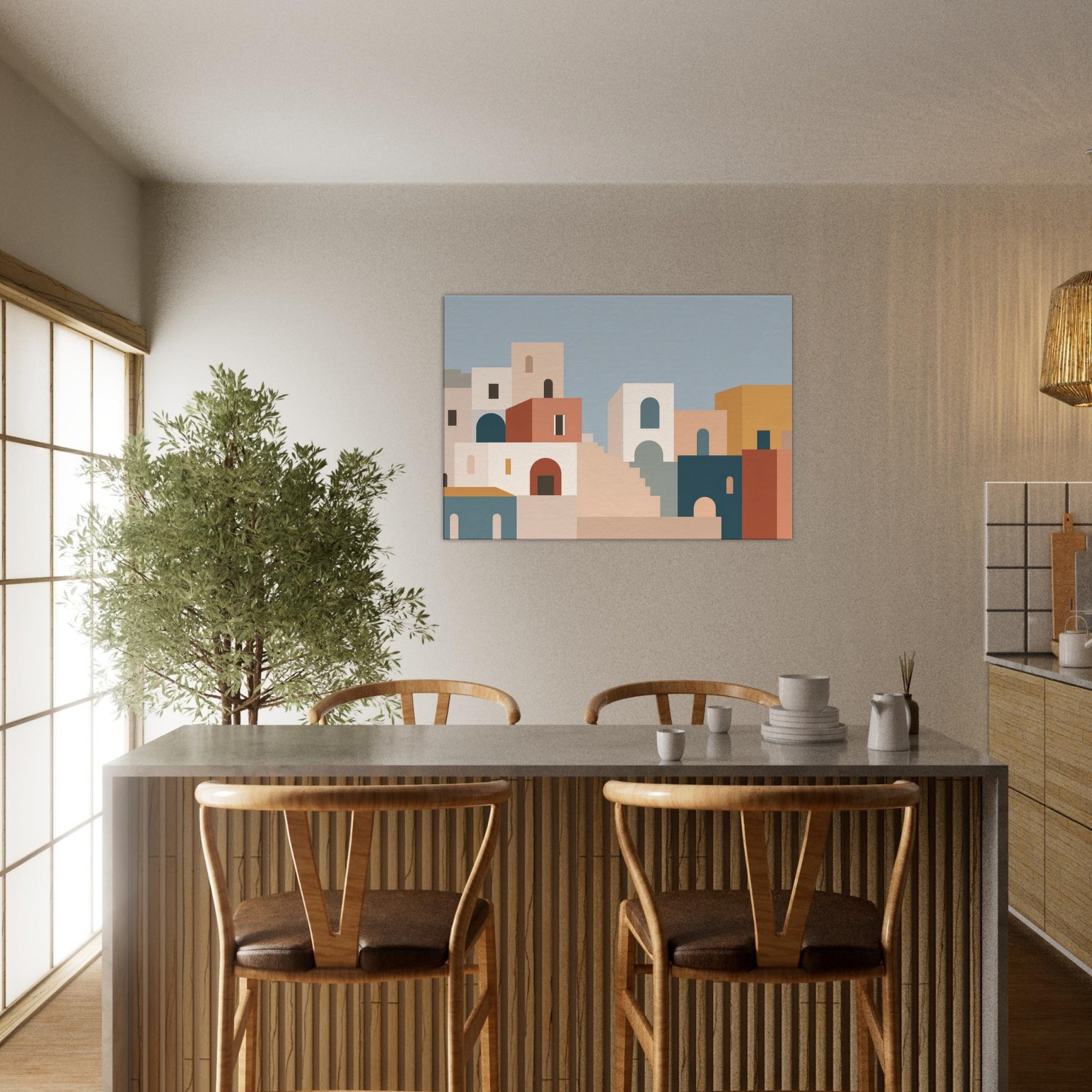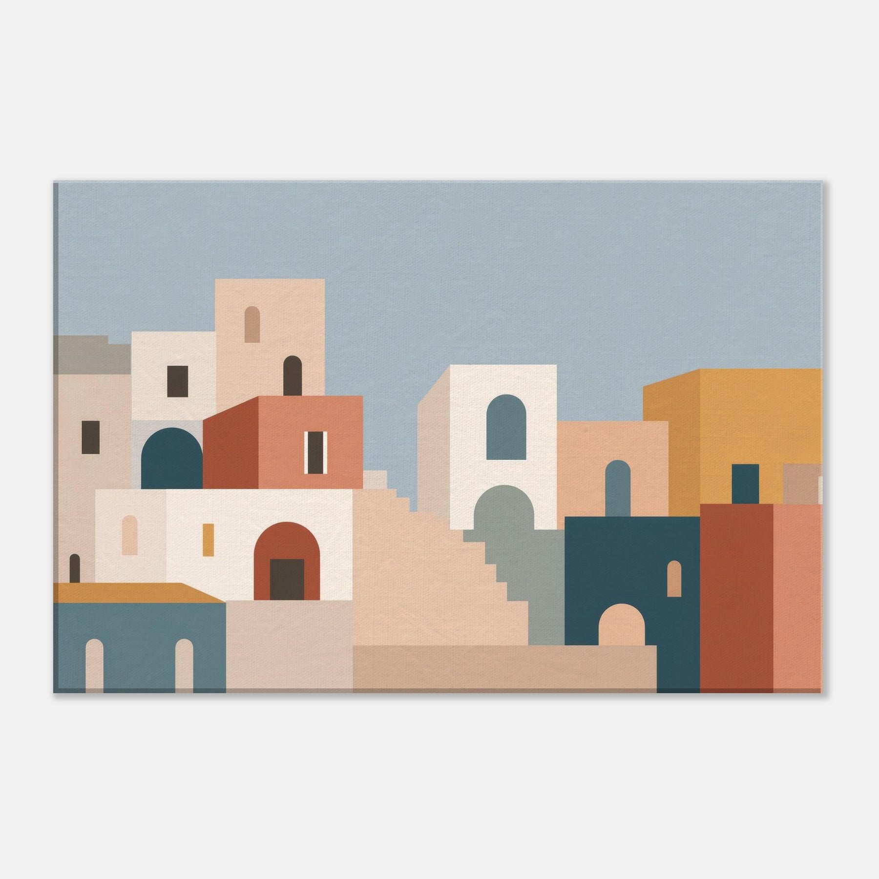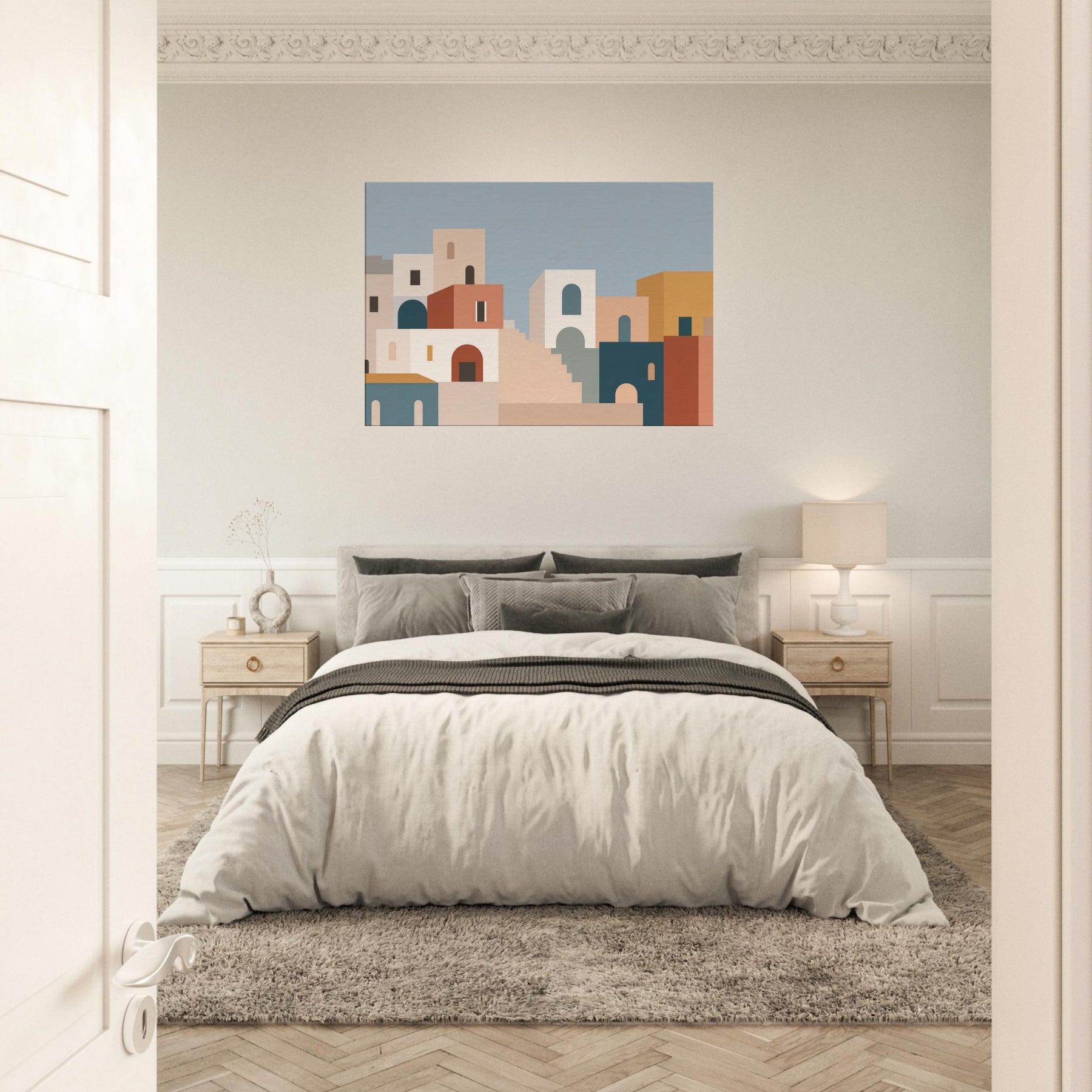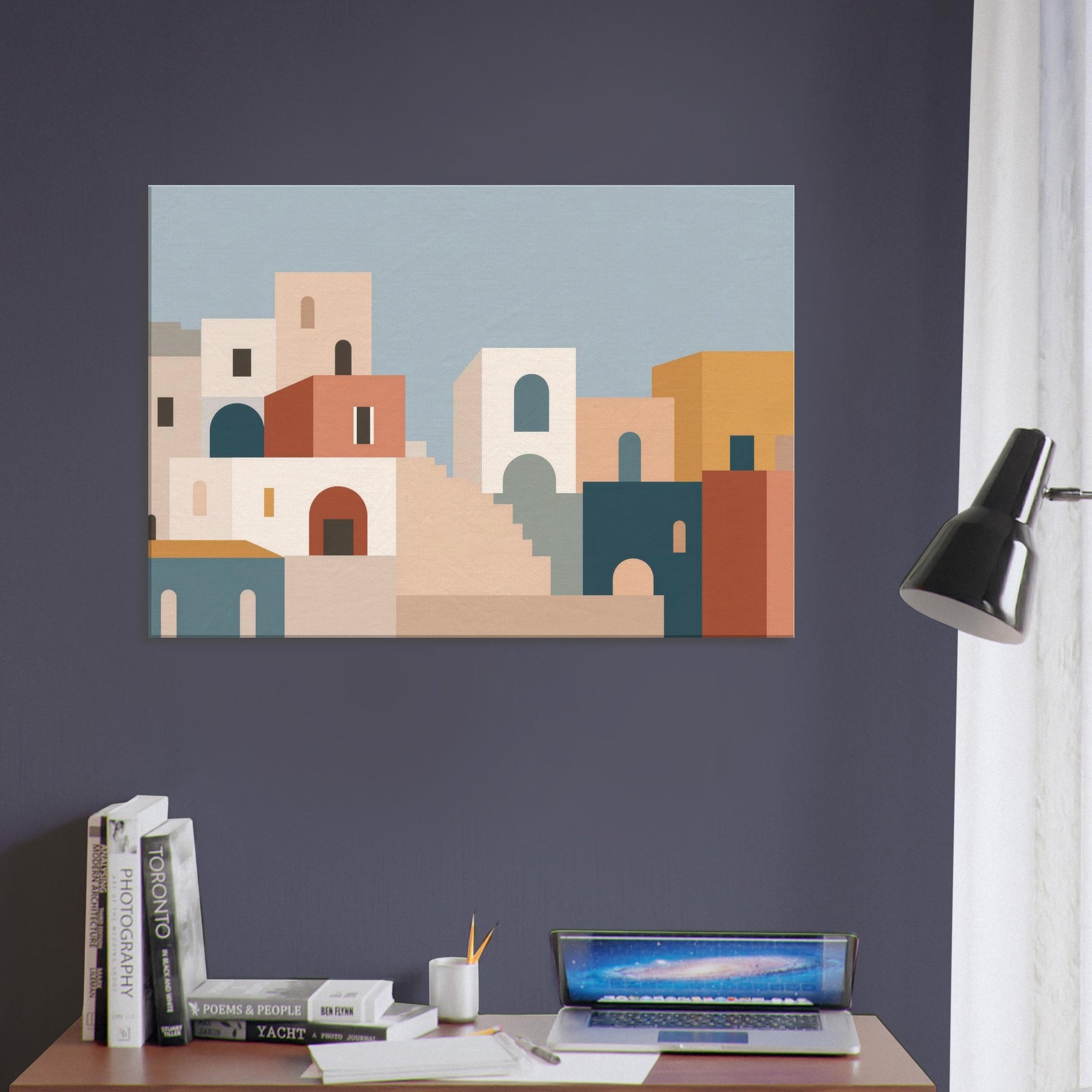 Channel the hush between water and light with this minimalist Venice print. The clean geometry of rounded arches and stepped terraces gathers the city's memory into a calm, architectural chorus. Each muted block of terracotta, ivory, and pale blue echoes sunlit facades and quiet courtyards, inviting slow, contemplative viewing. Hang it in a living room or bedroom to soften bold furniture and create a serene backdrop for conversation, travel dreams, and everyday moments spent in graceful, urban stillness.