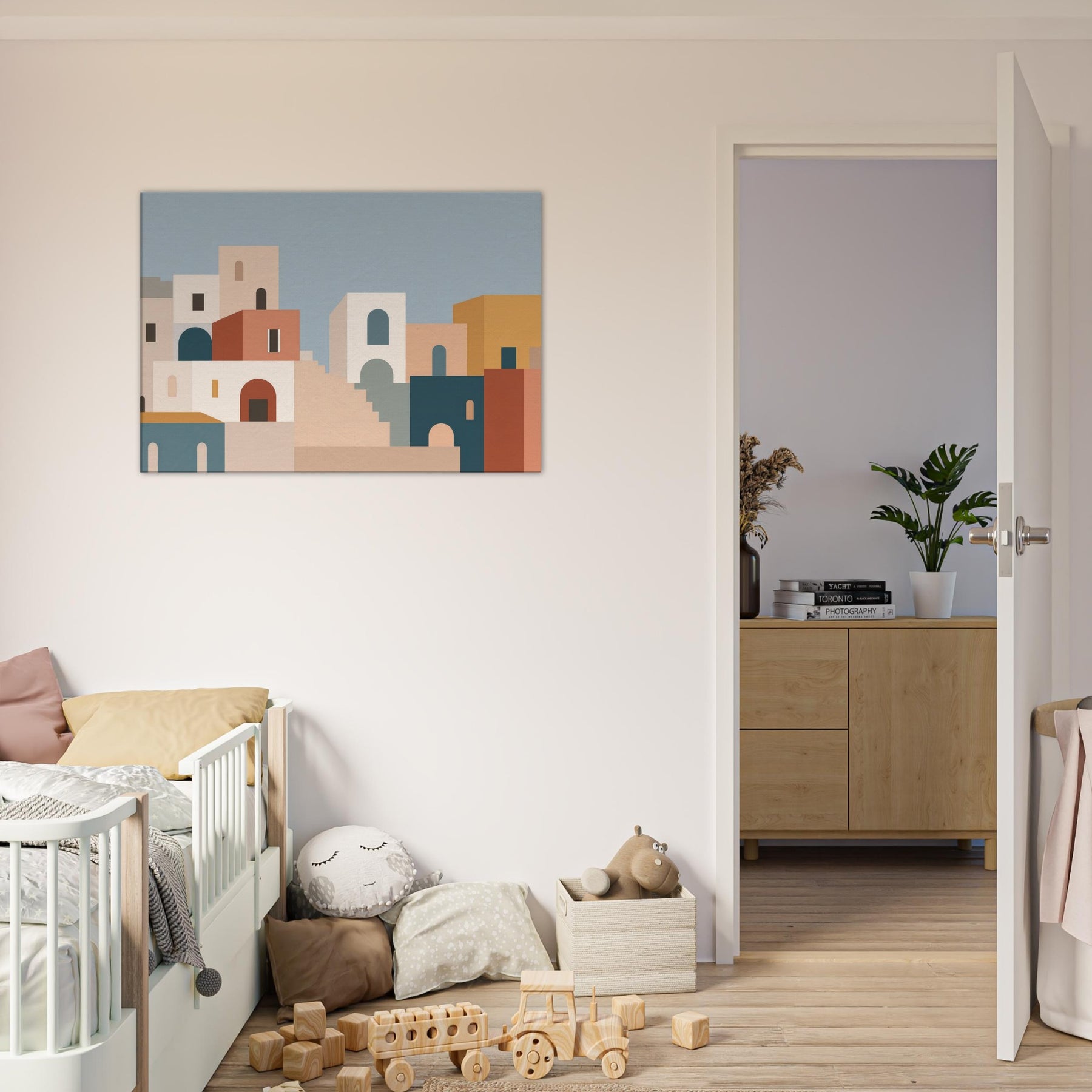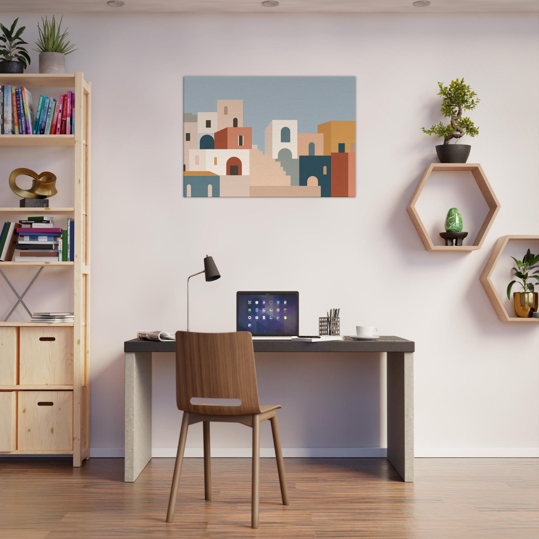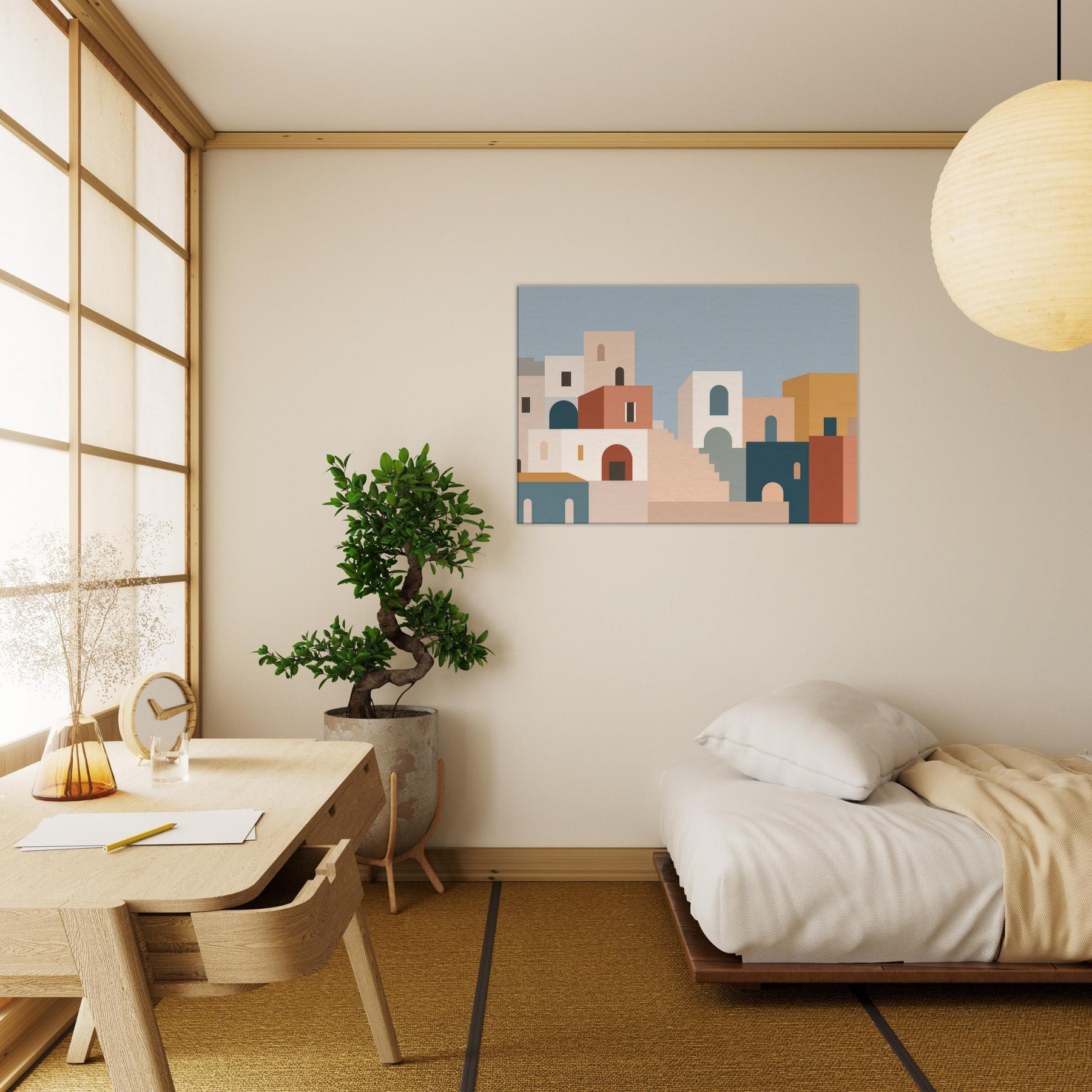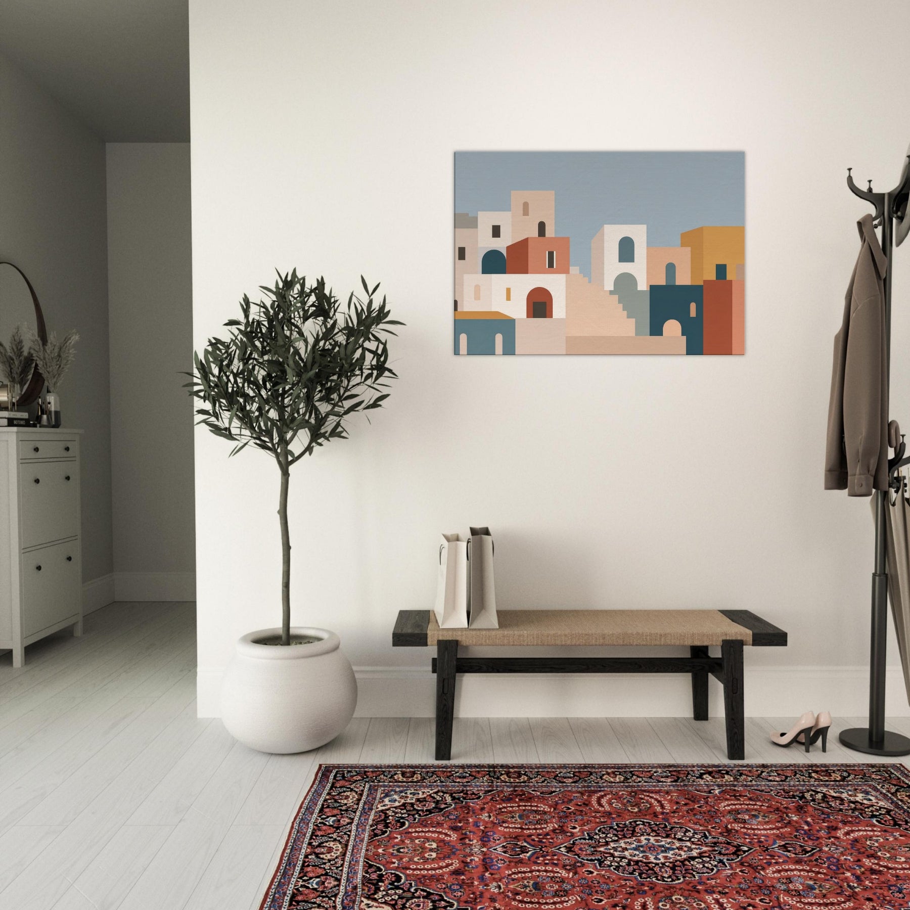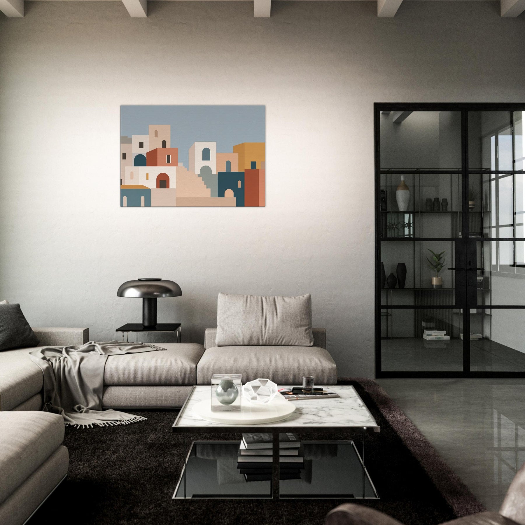 Channel the hush between water and light with this minimalist Venice print. The clean geometry of rounded arches and stepped terraces gathers the city's memory into a calm, architectural chorus. Each muted block of terracotta, ivory, and pale blue echoes sunlit facades and quiet courtyards, inviting slow, contemplative viewing. Hang it in a living room or bedroom to soften bold furniture and create a serene backdrop for conversation, travel dreams, and everyday moments spent in graceful, urban stillness.