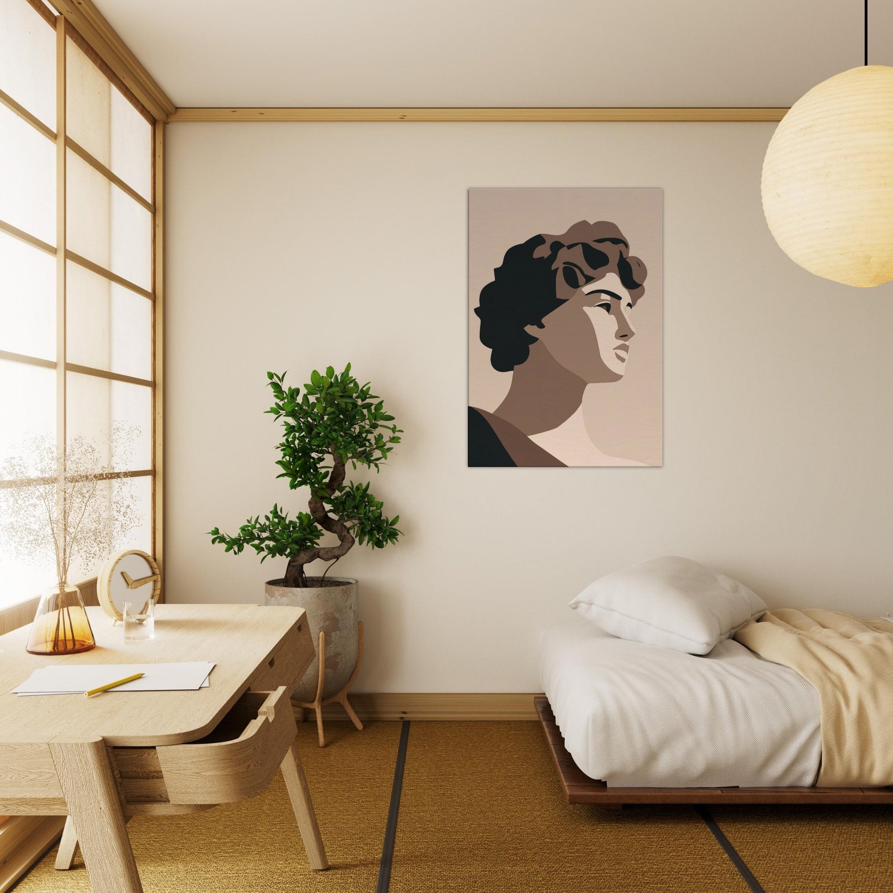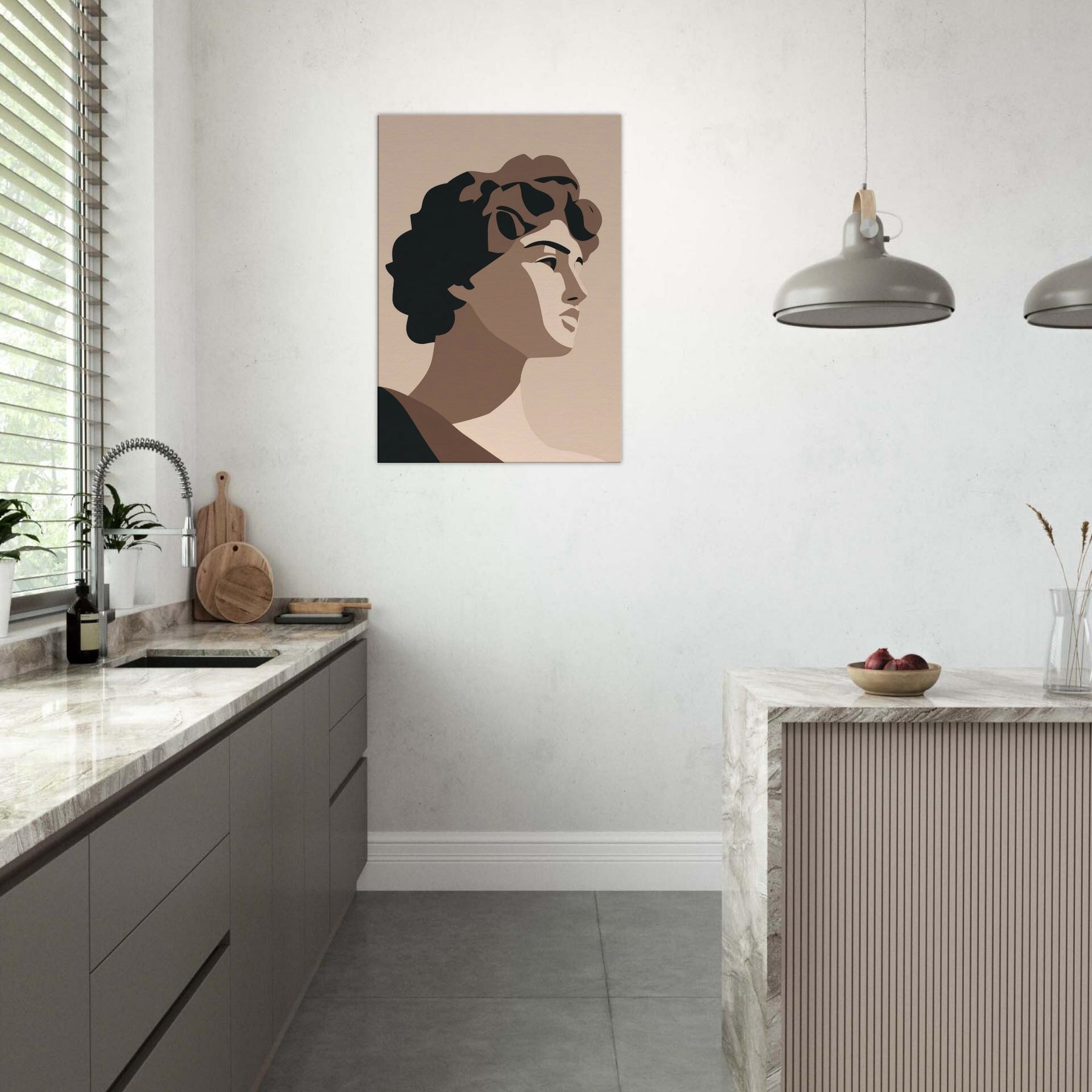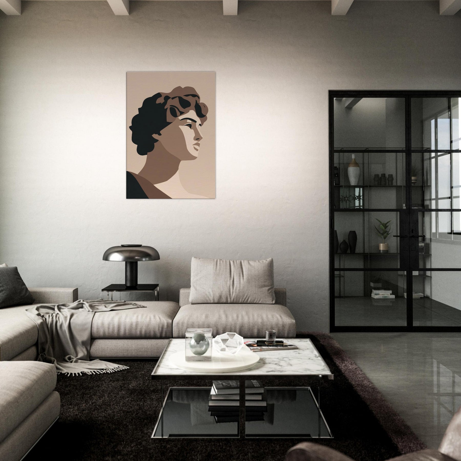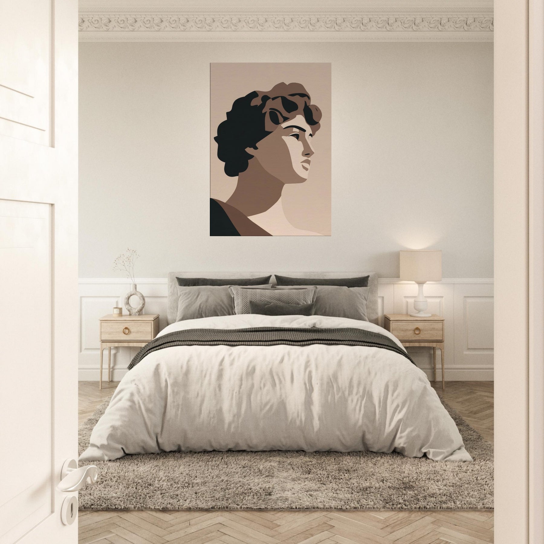 Bringing the Primary Subject Mythical Figures (Venus, David) into soft relief, this minimalist study uses warm taupes and stark, confident shapes. The atmosphere is calm, almost ceremonial, as light caresses sculpted planes and whispers of shade define faces. Hang it where you want a quiet focal point: a living room, hallway, or study becomes a gallery of pared baroque grace. It invites reflection, conversation, and a refined sense of scale without overpowering the room.