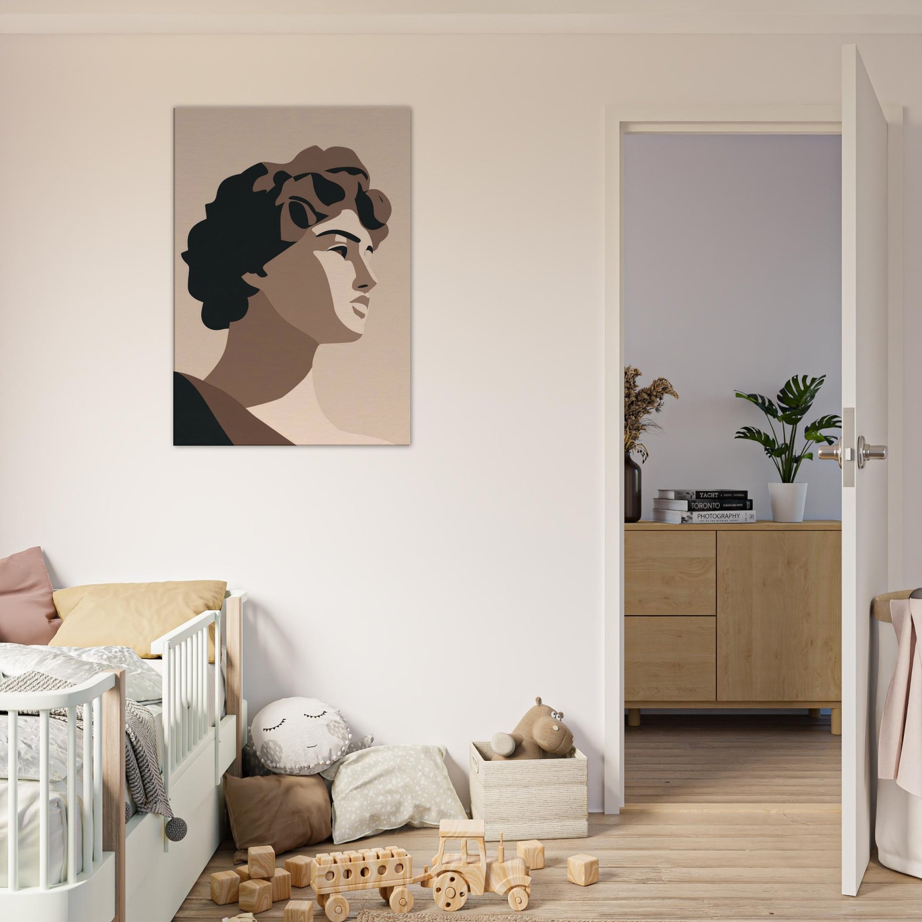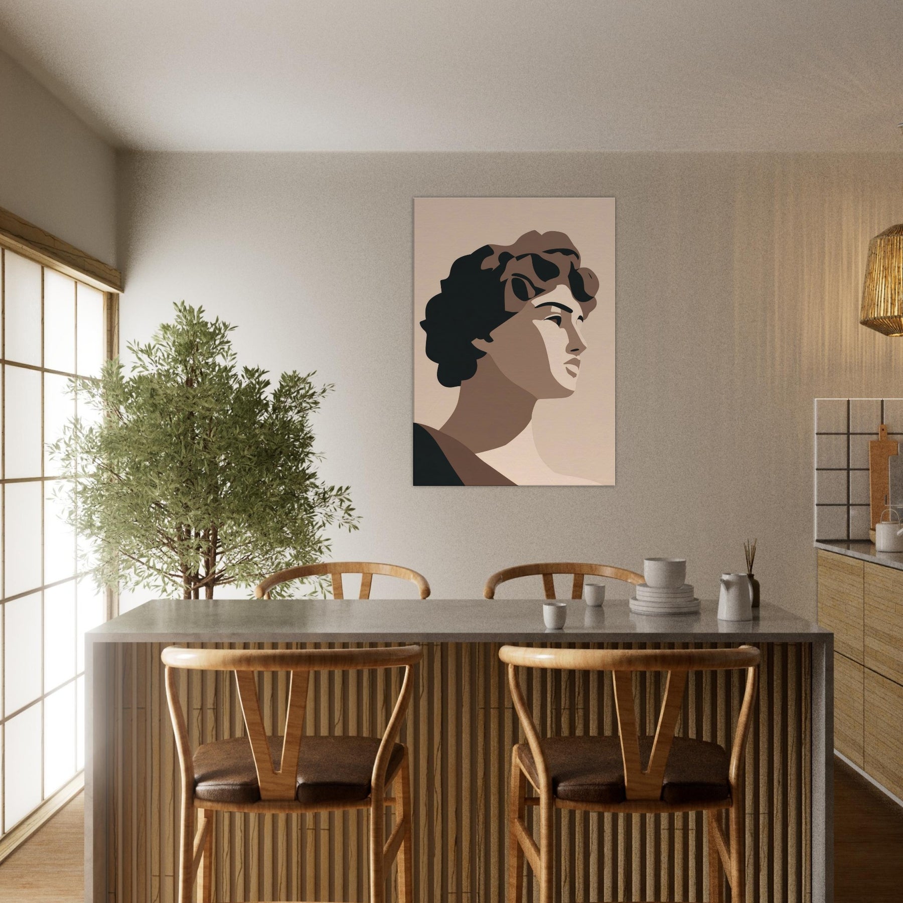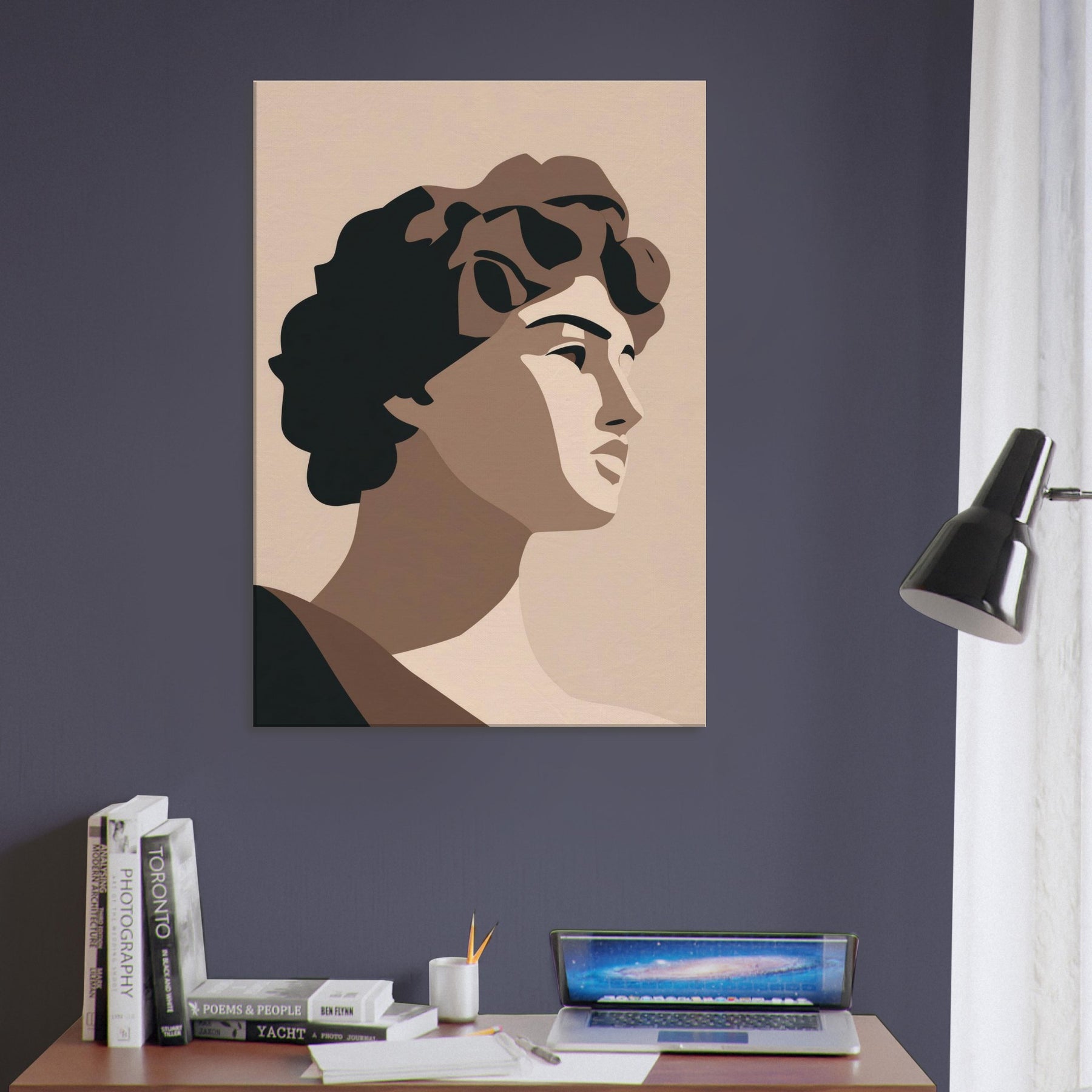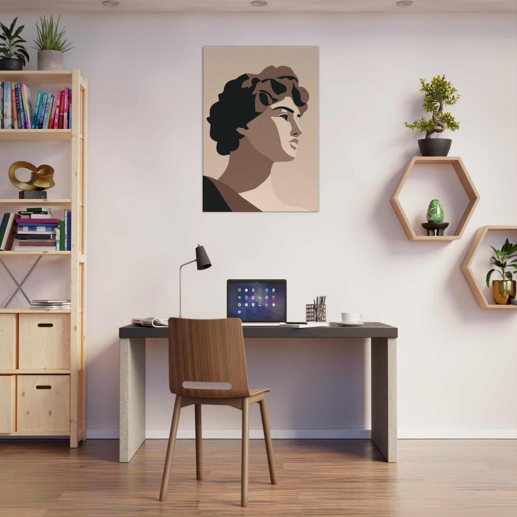 Bringing the Primary Subject Mythical Figures (Venus, David) into soft relief, this minimalist study uses warm taupes and stark, confident shapes. The atmosphere is calm, almost ceremonial, as light caresses sculpted planes and whispers of shade define faces. Hang it where you want a quiet focal point: a living room, hallway, or study becomes a gallery of pared baroque grace. It invites reflection, conversation, and a refined sense of scale without overpowering the room.