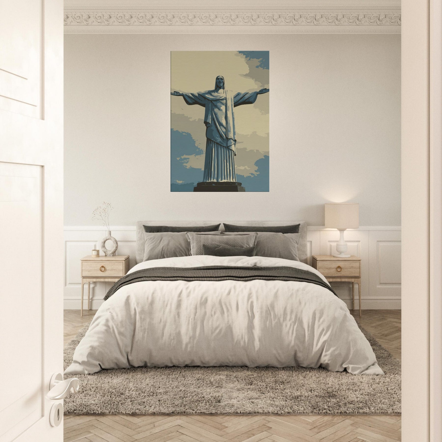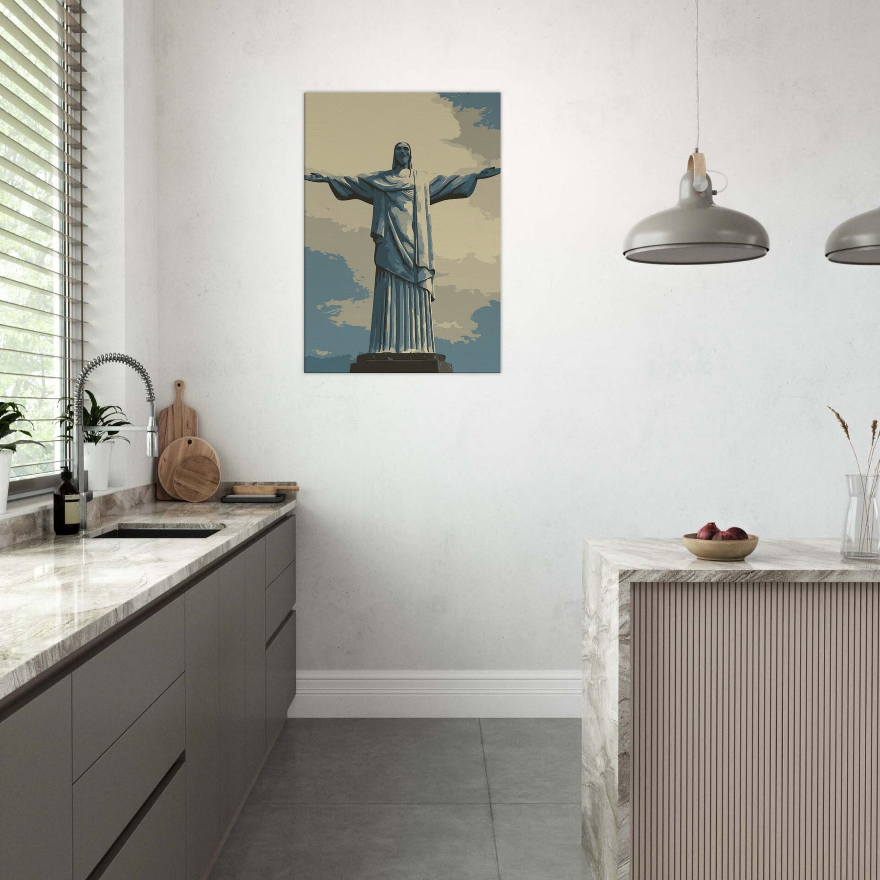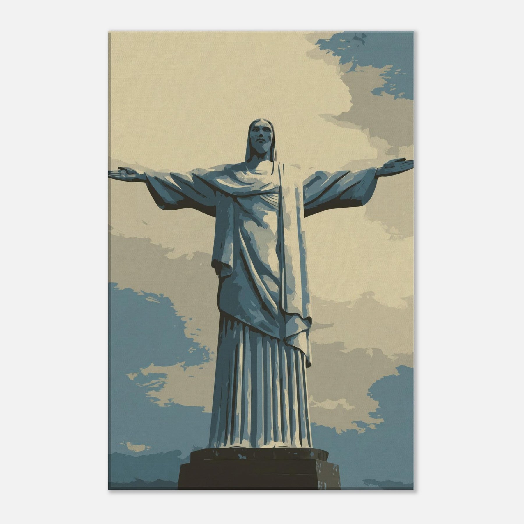 Christ the Redeemer stands serene with outstretched arms, rendered in quiet, refined lines. This composition infuses a living space with a hushed breath of reverence and urban poetry, a beacon against sky blue tones and pale sand shadows. Its restrained presence invites slow, mindful moments ideal beside a sofa, in a hallway, or above a dining nook. The piece bathes rooms in soft light, balancing modern interiors with a timeless, contemplative atmosphere that makes every glance feel like a quiet invitation to pause.