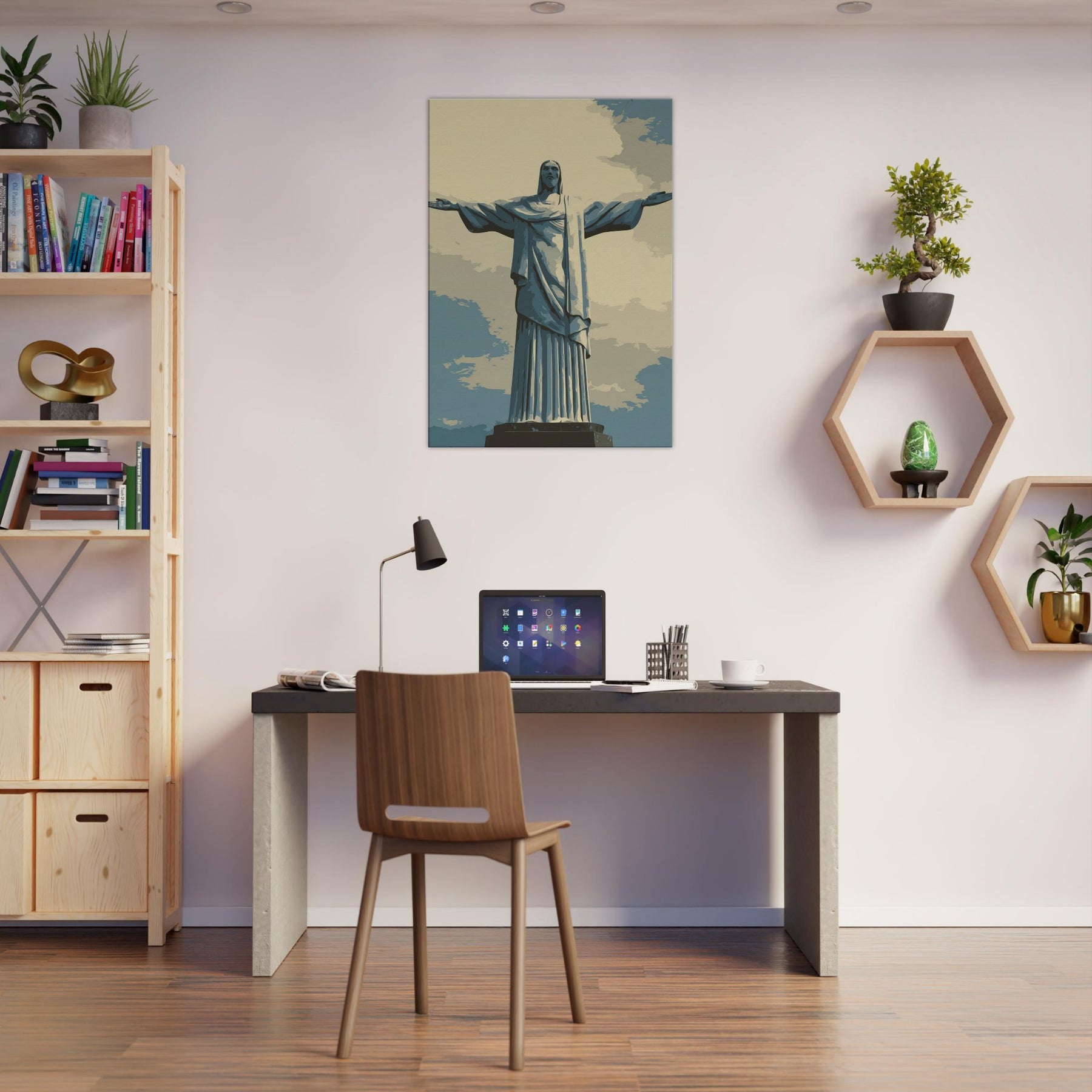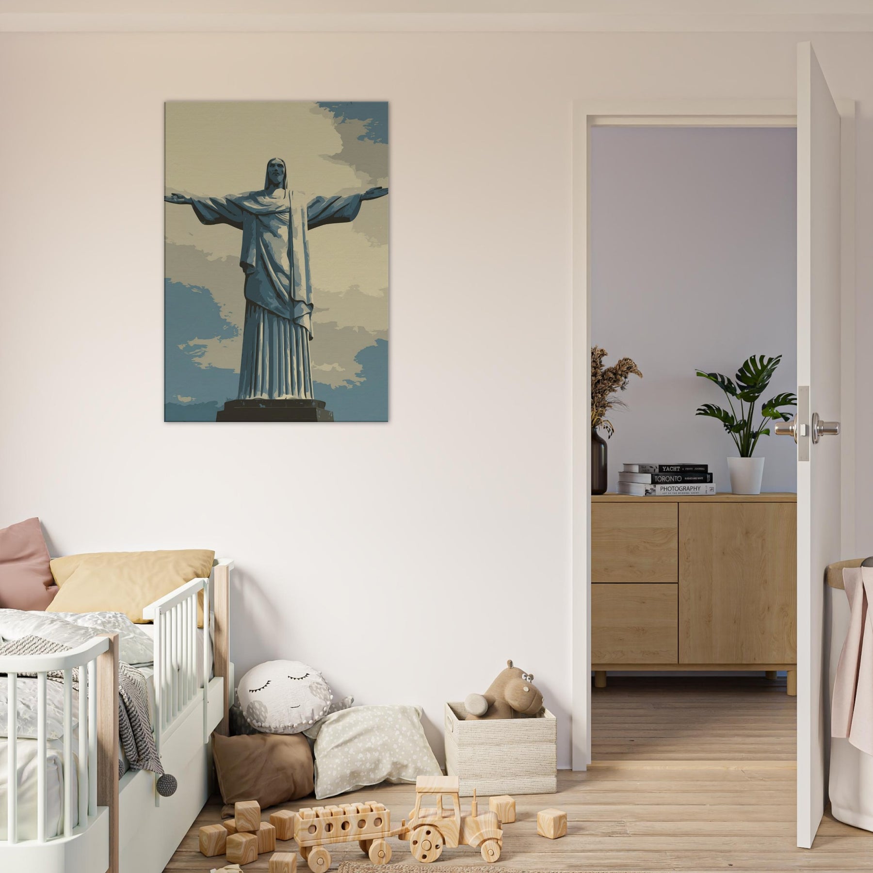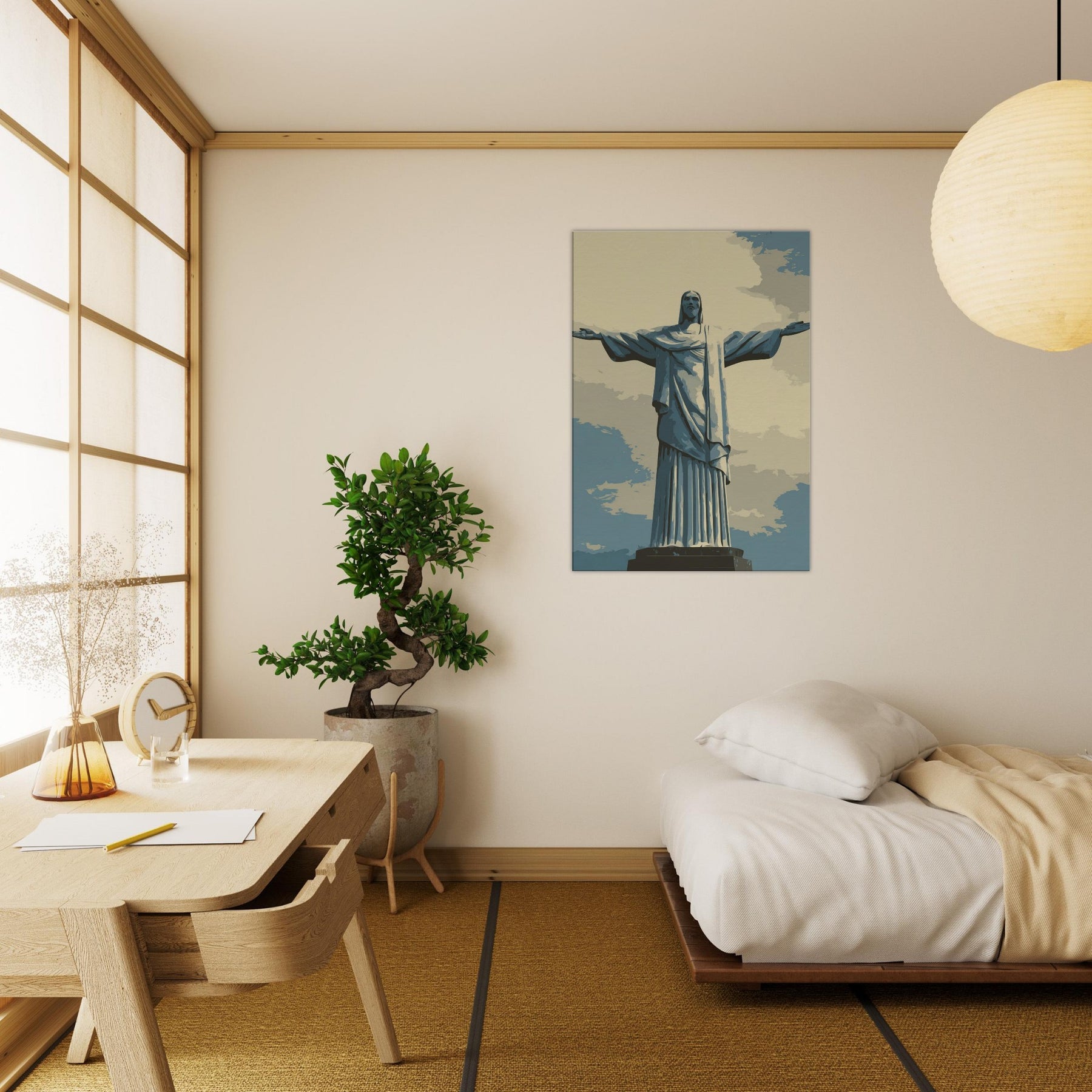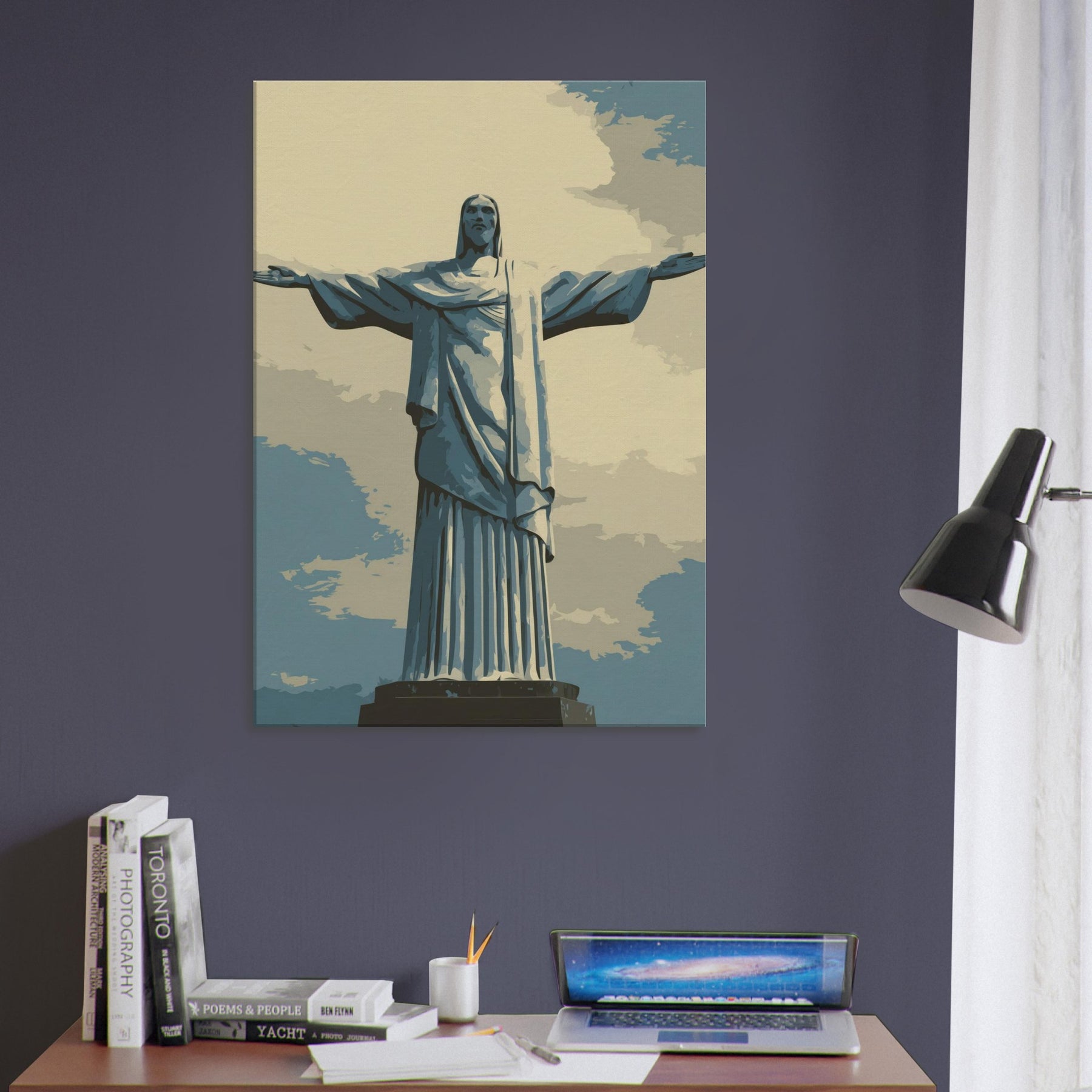 Christ the Redeemer stands serene with outstretched arms, rendered in quiet, refined lines. This composition infuses a living space with a hushed breath of reverence and urban poetry, a beacon against sky blue tones and pale sand shadows. Its restrained presence invites slow, mindful moments ideal beside a sofa, in a hallway, or above a dining nook. The piece bathes rooms in soft light, balancing modern interiors with a timeless, contemplative atmosphere that makes every glance feel like a quiet invitation to pause.