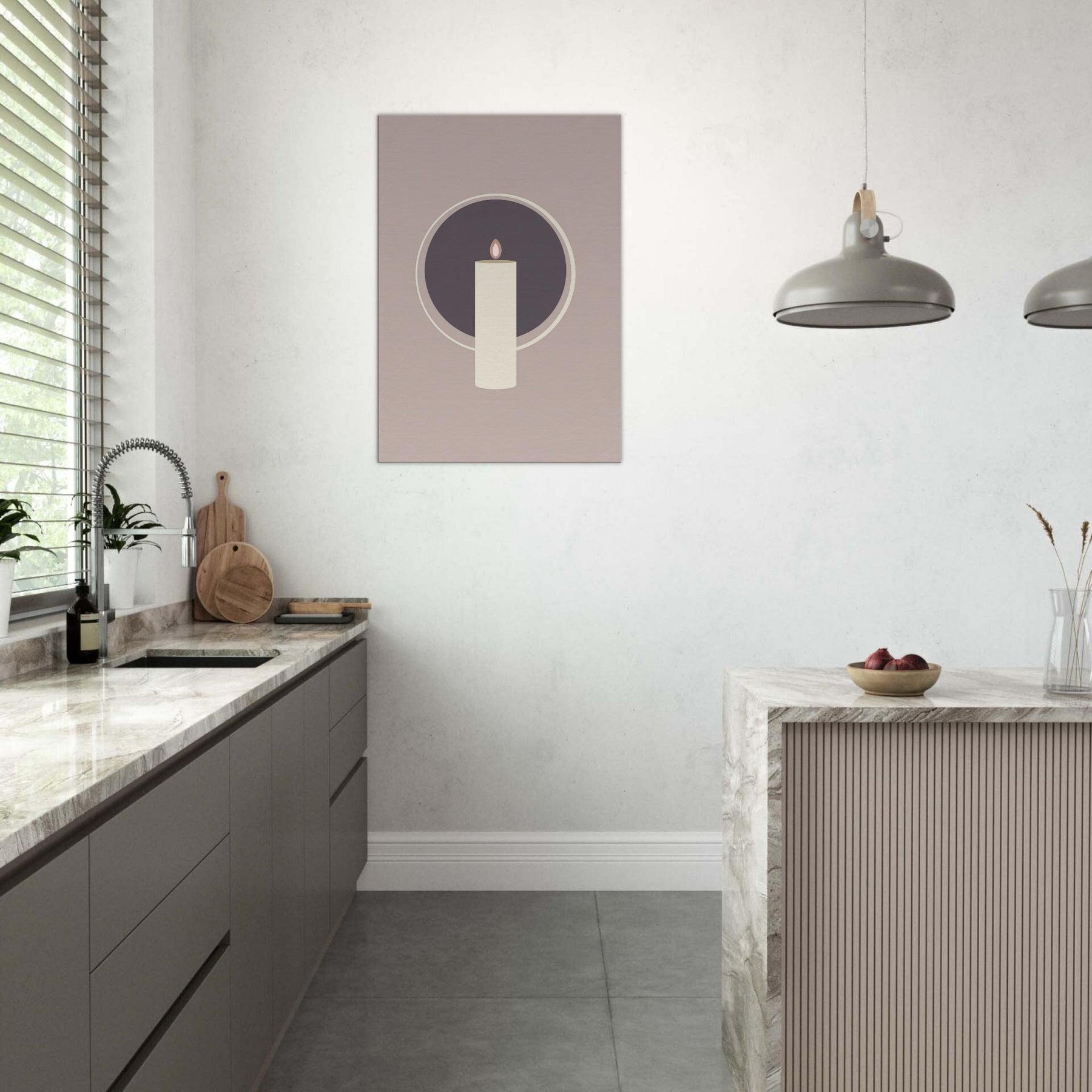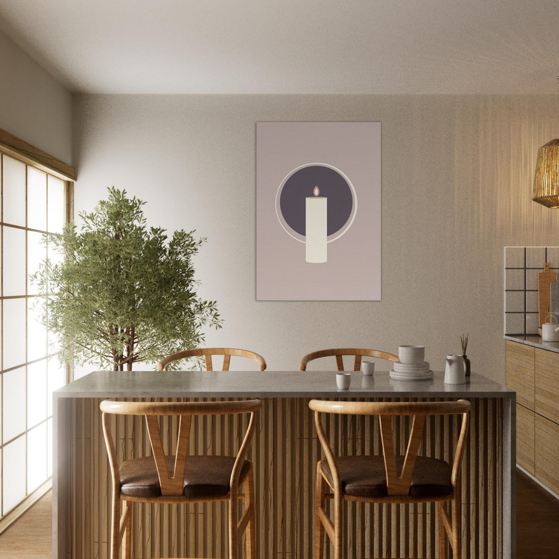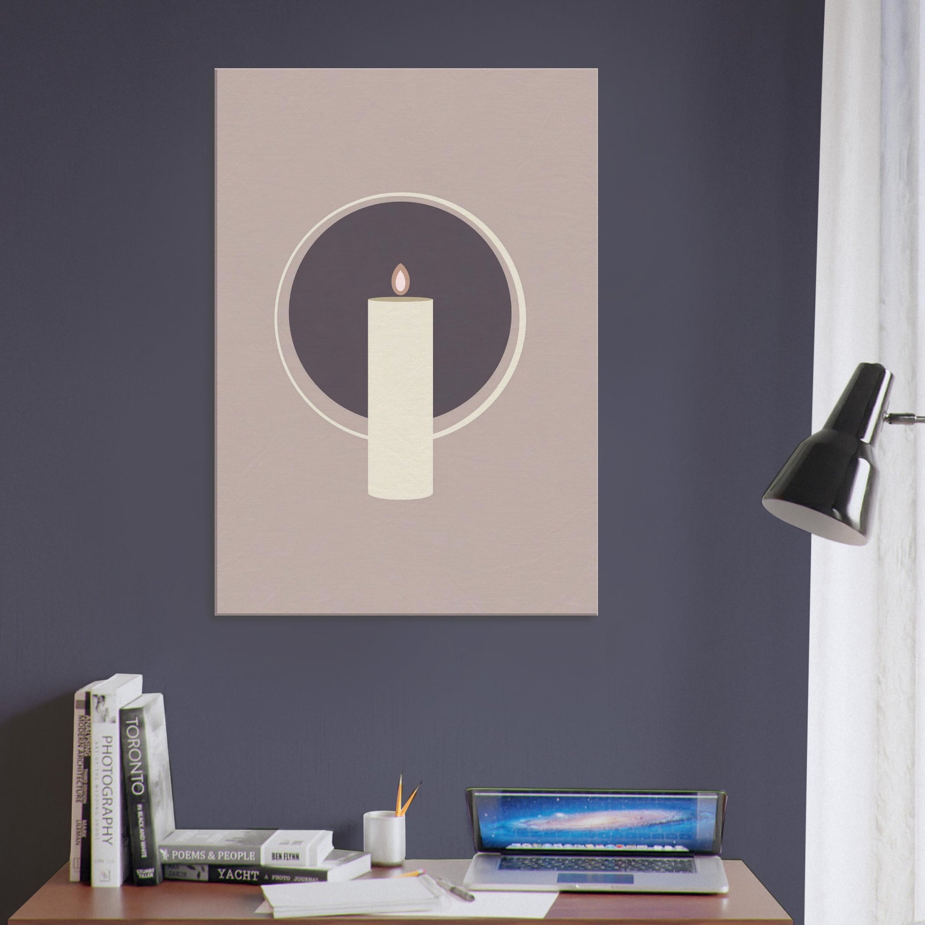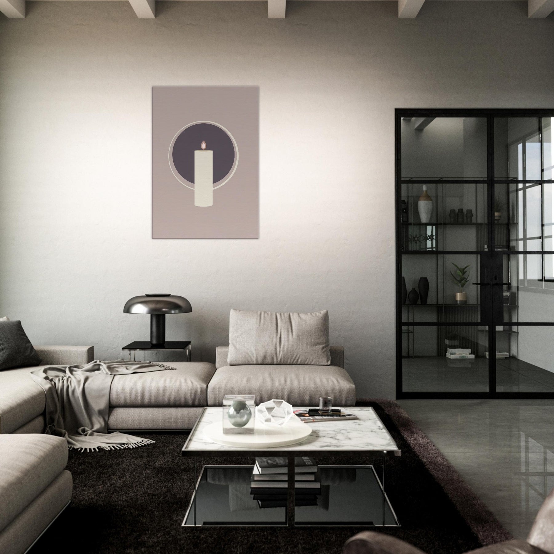 Candle with Halo glows with serene restraint, a minimalist emblem of quiet rituals and sacred space. The restrained palette, blush taupe background, pale ivory candle, and a charcoal halo, invites breath, focus, and ease. This work transforms a wall into a calm corner of the room, catching light as the day softens and the evening settles. It pairs with warm woods or cool neutrals, enhancing living spaces by adding a gentle ritualistic touch and a sense of presence without distraction.