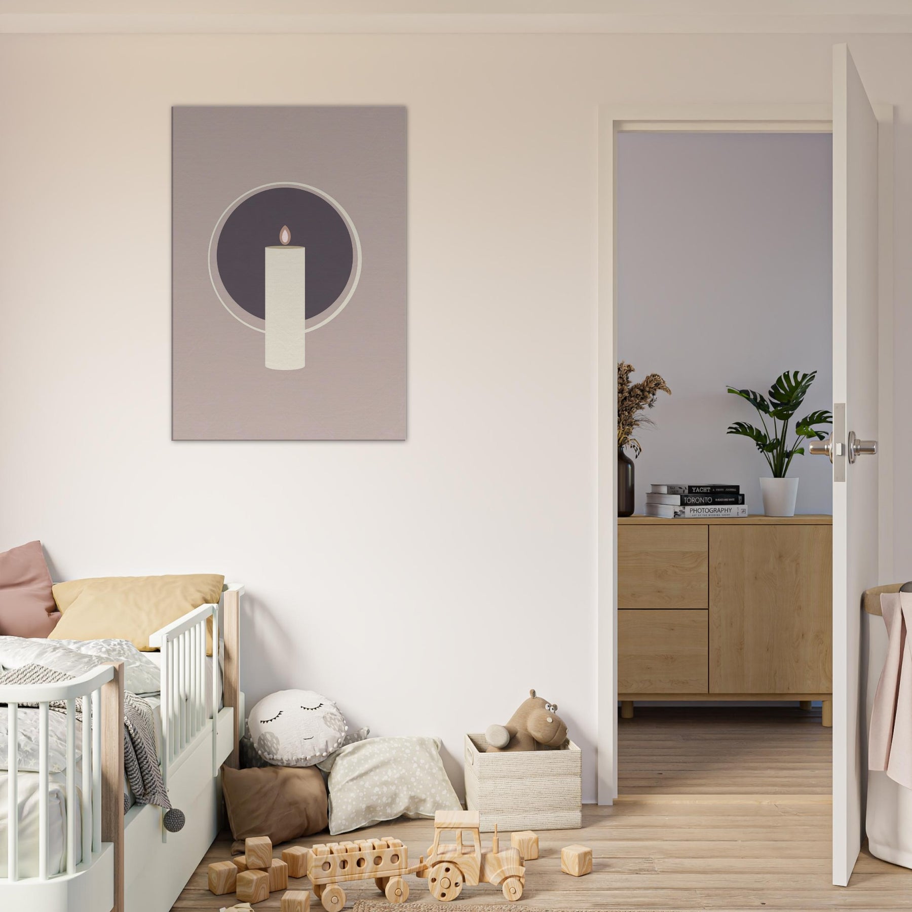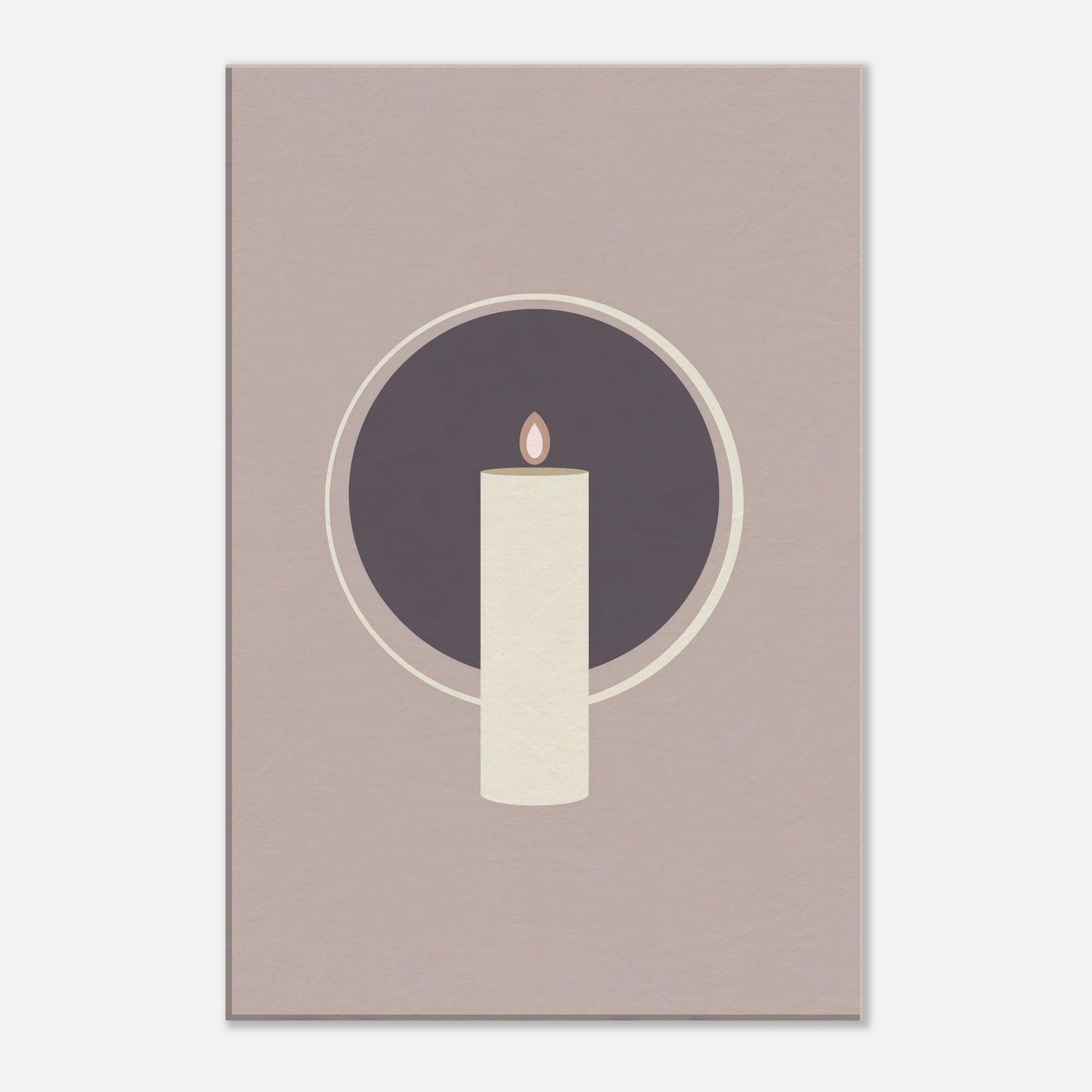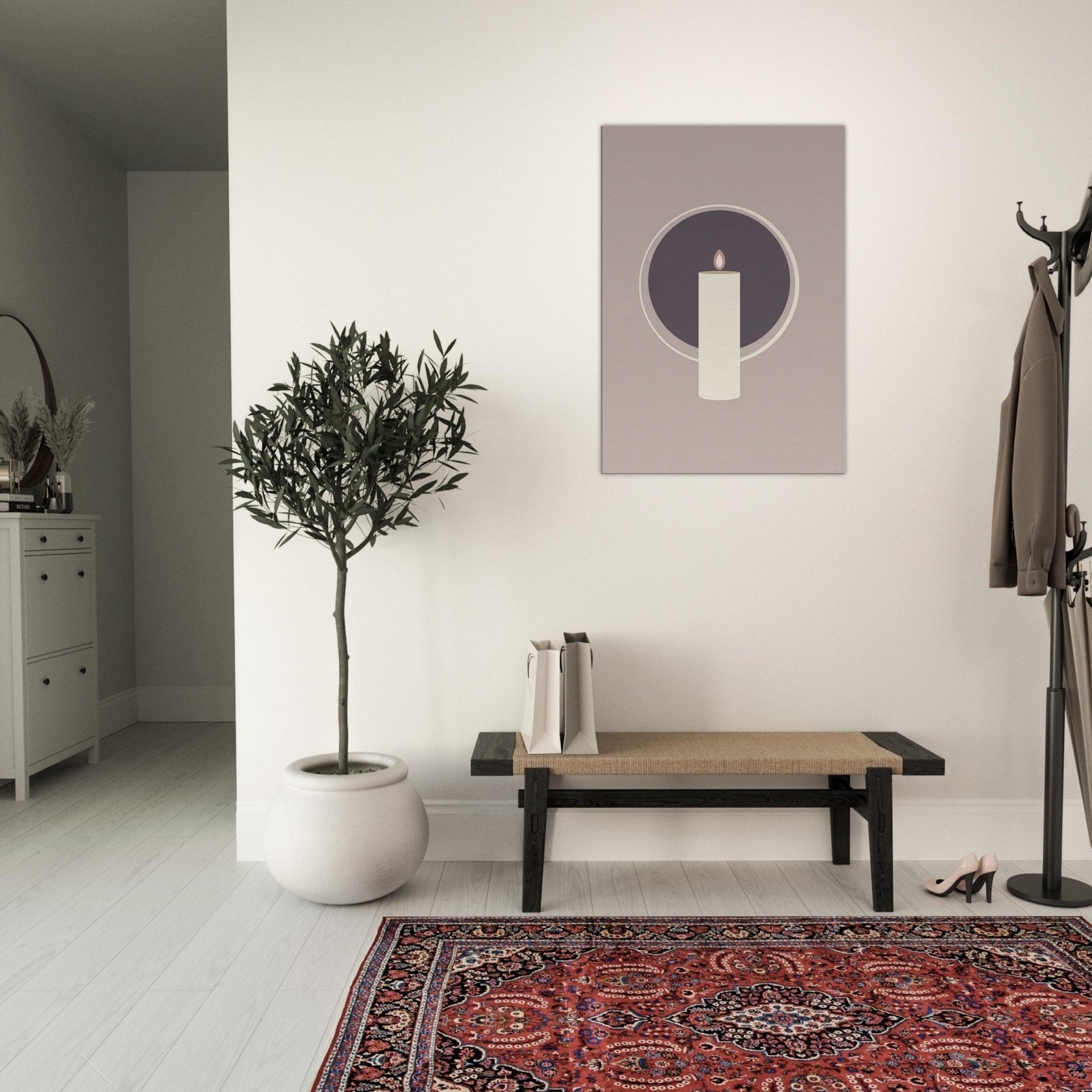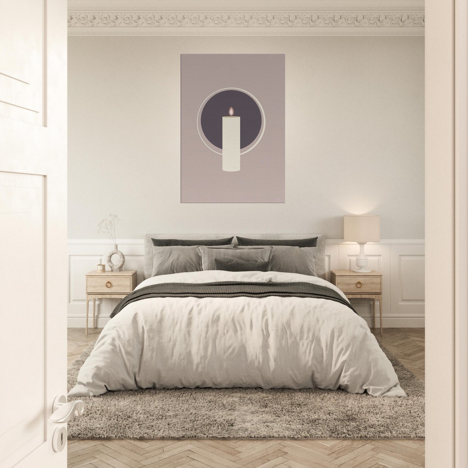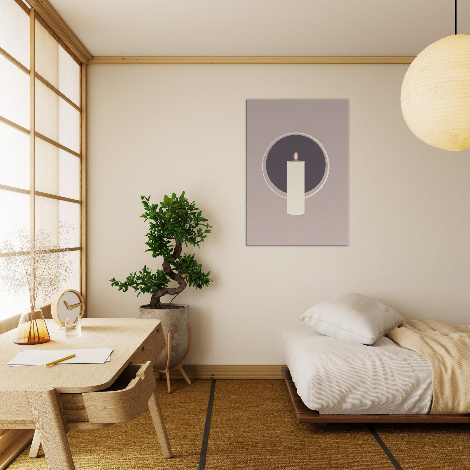 Candle with Halo glows with serene restraint, a minimalist emblem of quiet rituals and sacred space. The restrained palette, blush taupe background, pale ivory candle, and a charcoal halo, invites breath, focus, and ease. This work transforms a wall into a calm corner of the room, catching light as the day softens and the evening settles. It pairs with warm woods or cool neutrals, enhancing living spaces by adding a gentle ritualistic touch and a sense of presence without distraction.