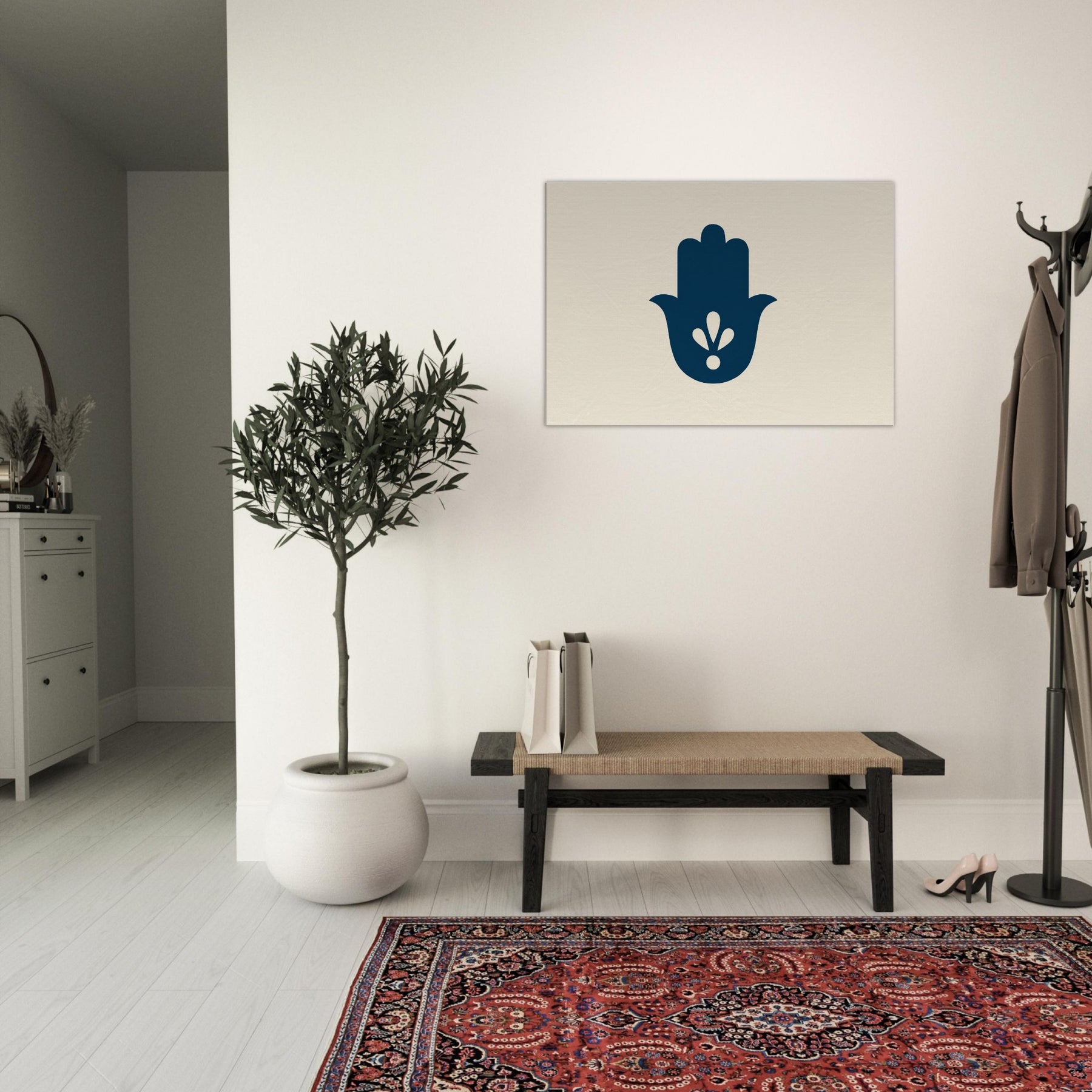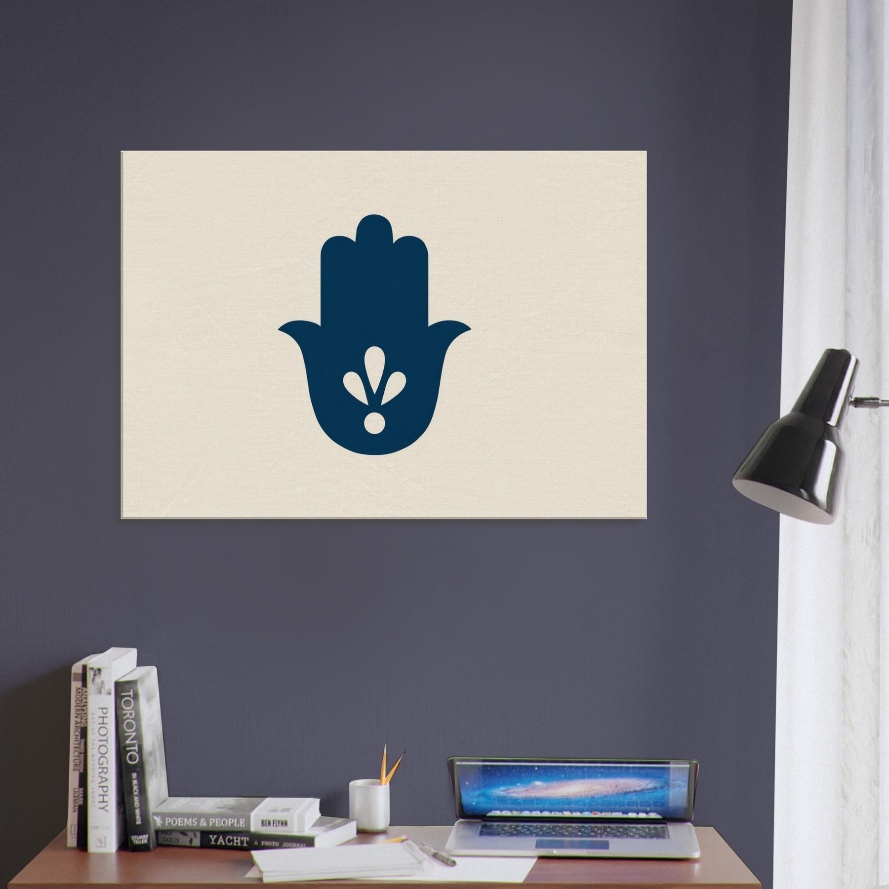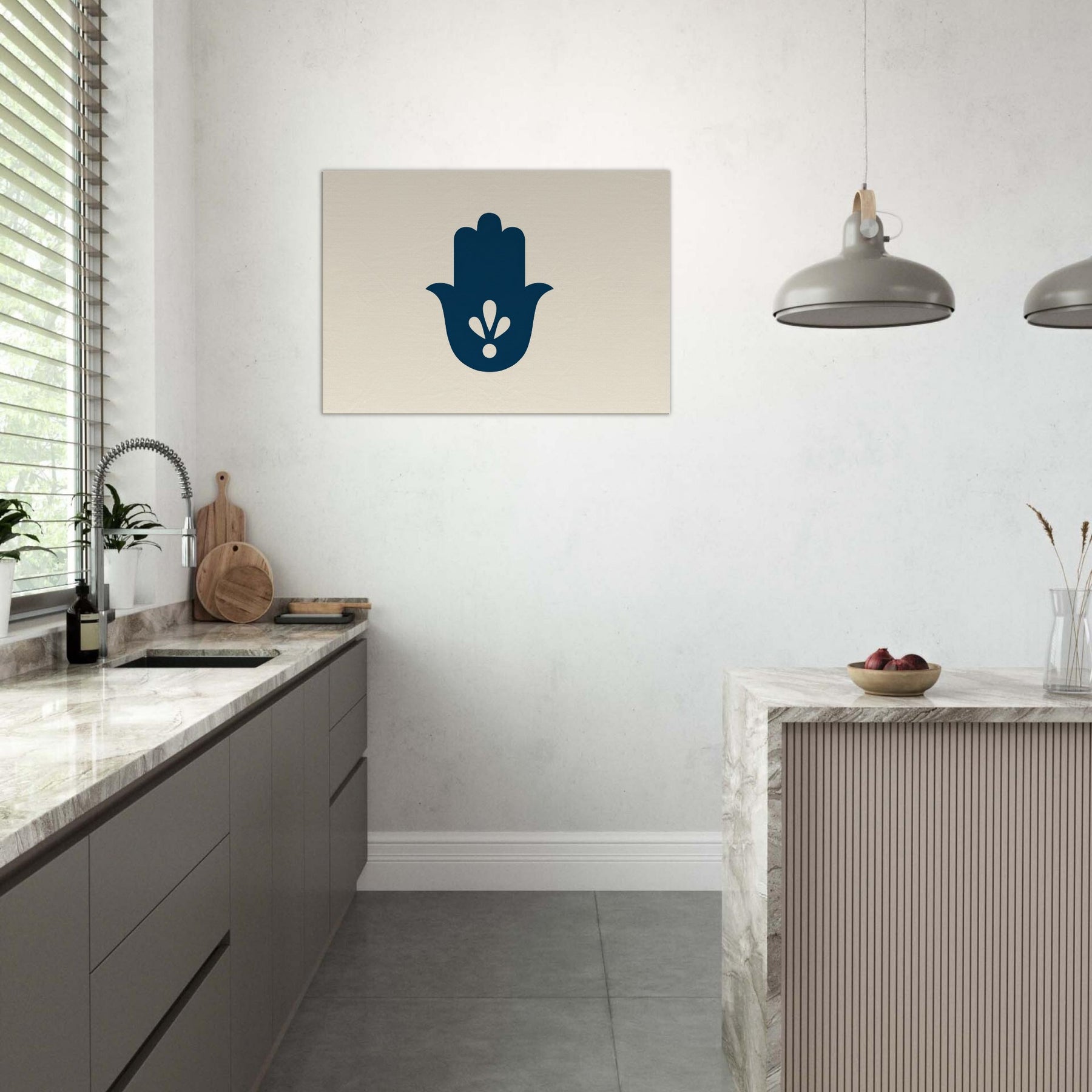 The Hamsa Hand of Fatima unfolds in a whisper of navy and negative space, a minimalist emblem of protection and blessing. This calm, mystical composition invites stillness into any room, catching light and eyes with soft contrast and clean lines. Hang it above a sofa or bedside to imbue the space with a gentle, ceremonial mood its tranquil silhouette shaping a serene sanctuary. In its quiet elegance, the Hand of Fatima becomes a daily talisman, guiding warmth, balance, and mindful living. The central subject is Hamsa (Hand of Fatima).