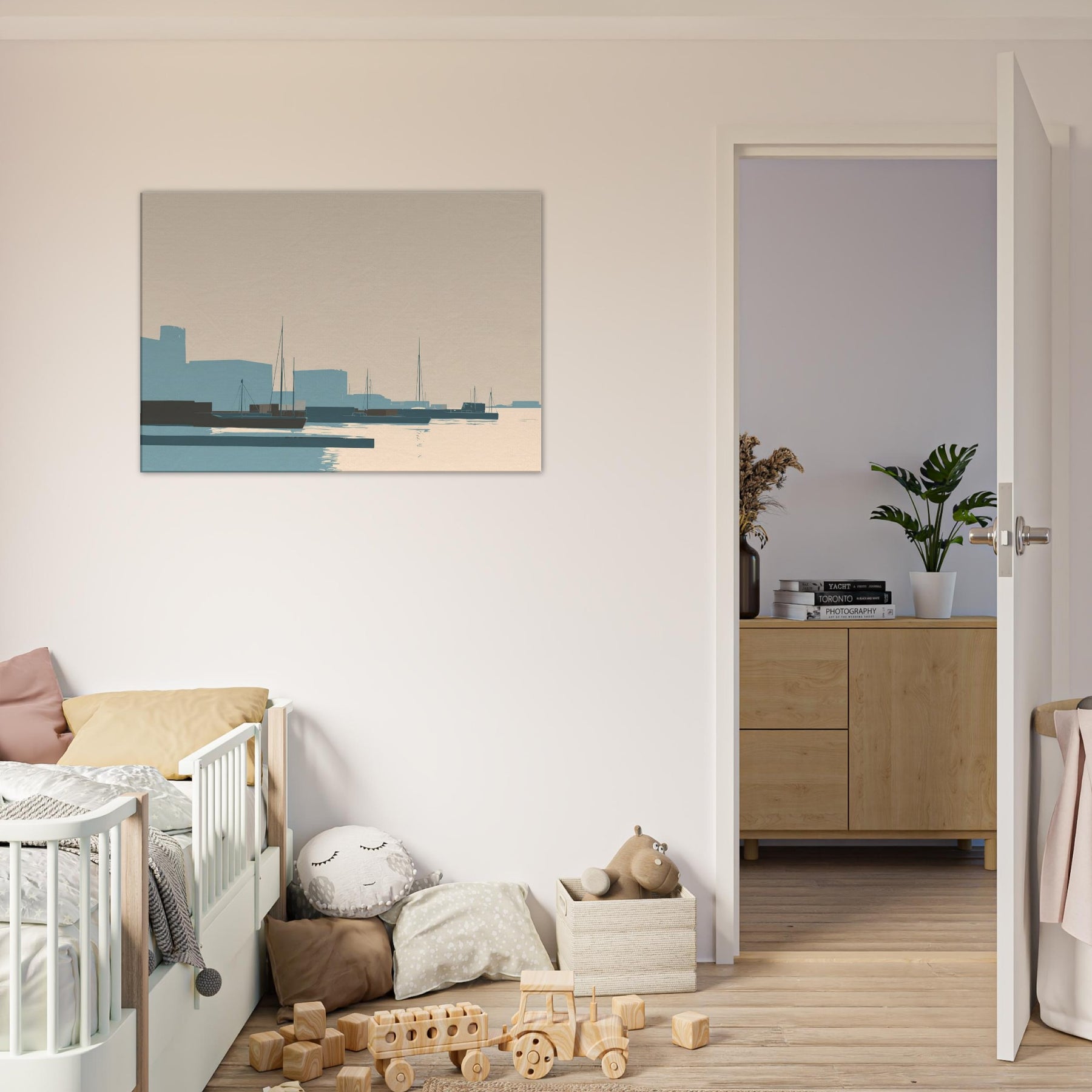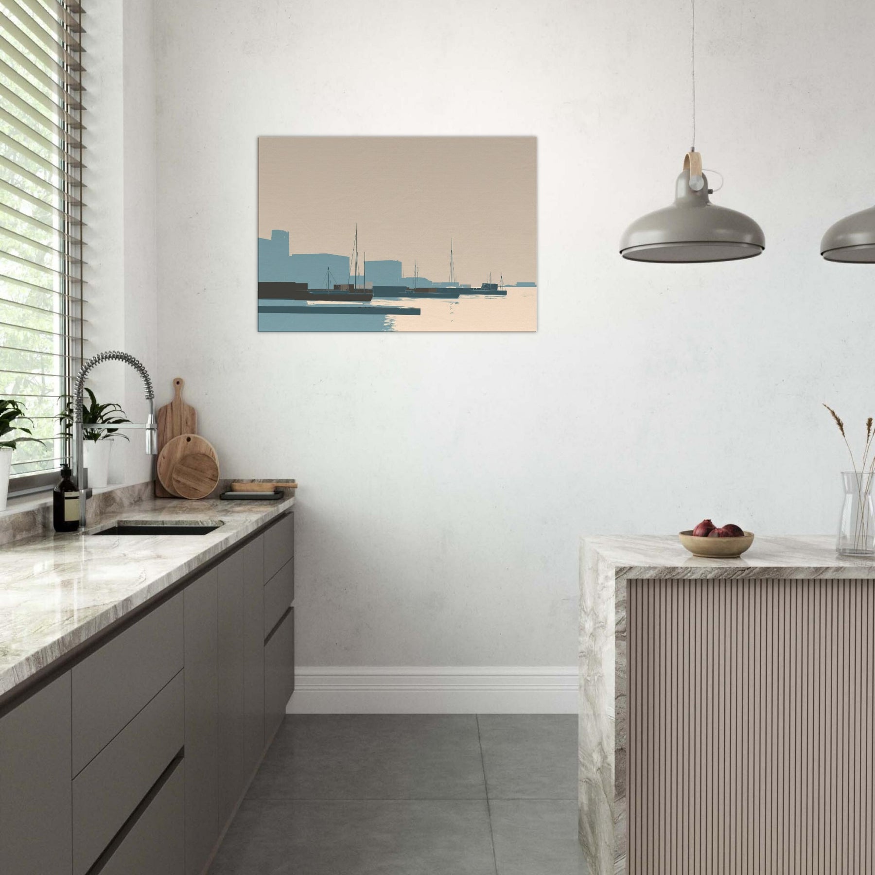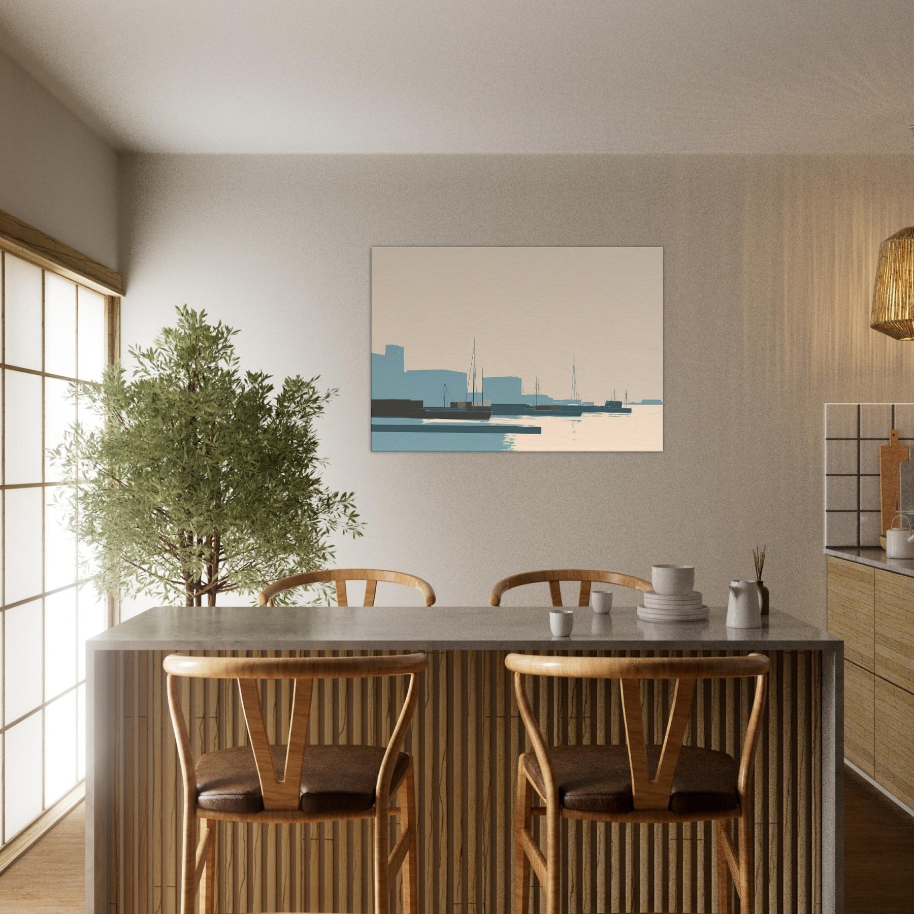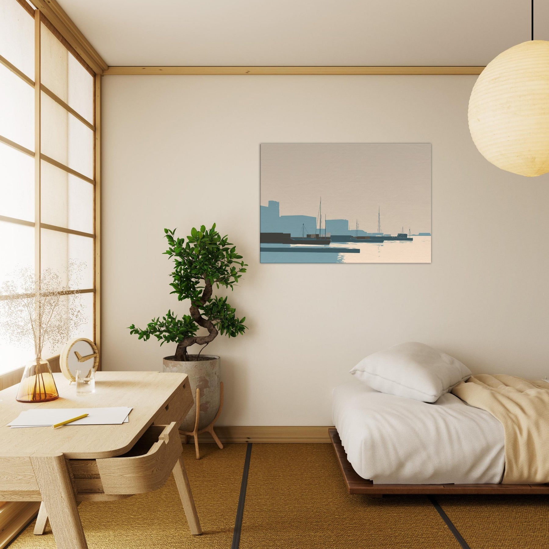 Let the Harbor unfold in quiet, minimalist strokes that invite stillness into your space. This serene scene reduces the shoreline to essential planes of color and line, letting the peach sky cradle cool blue water while silhouettes of boats and distant buildings breathe a gentle rhythm across the frame. The result is a calm focal point that feels both contemporary and timeless, perfect for a living room, study, or hallway. It elevates atmosphere without shouting, turning daily rituals into a shoreline of mindful pause.