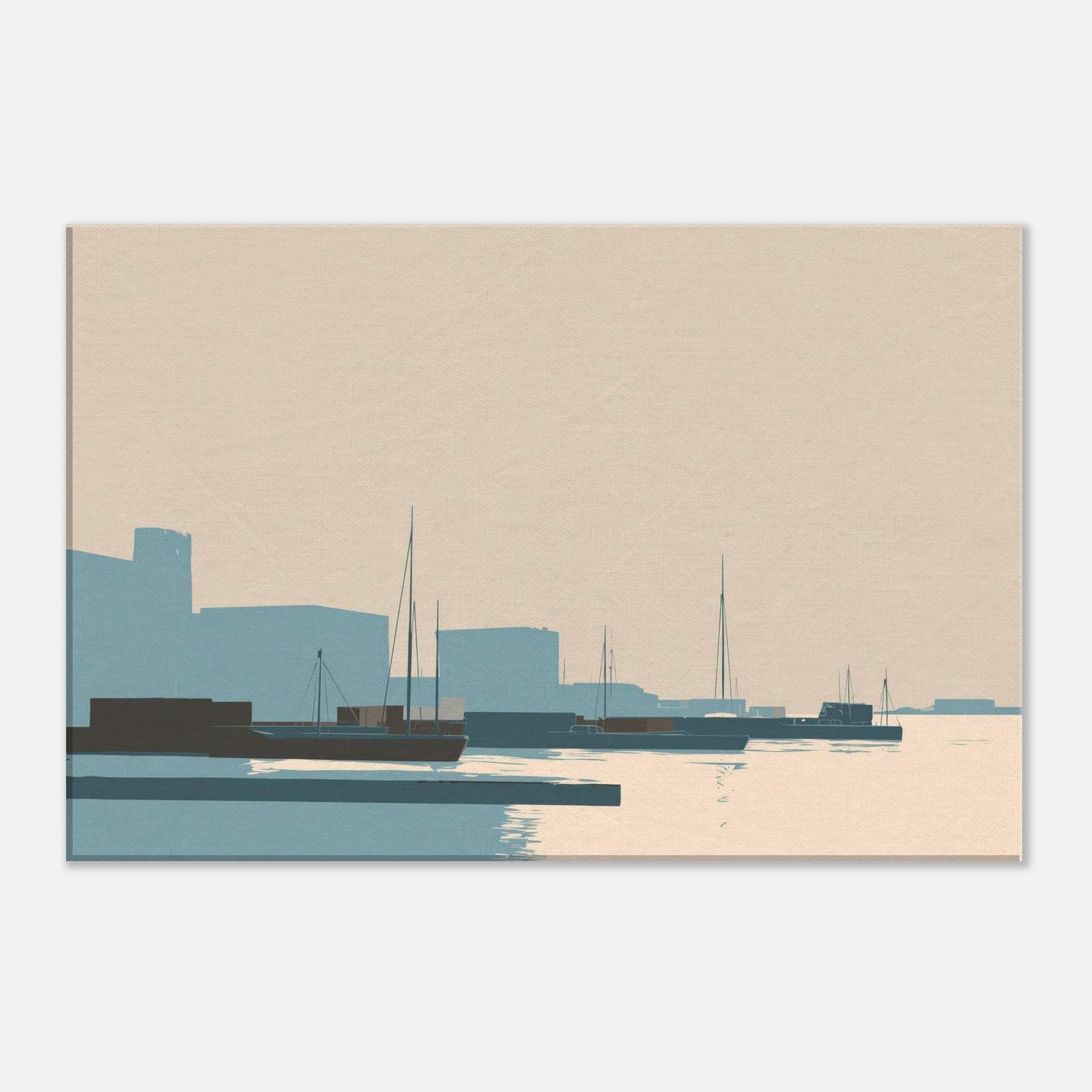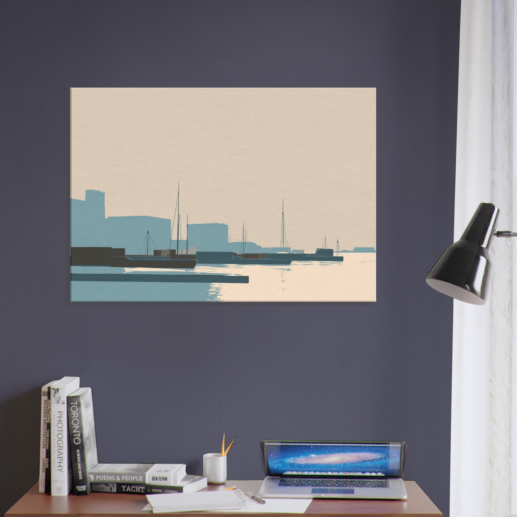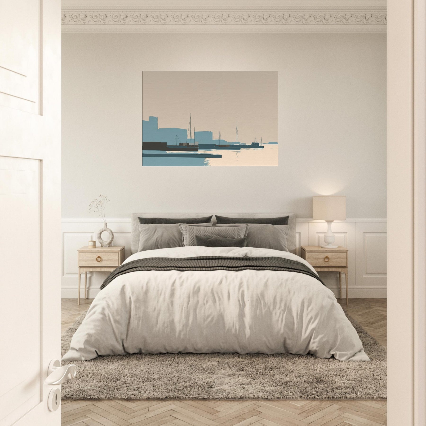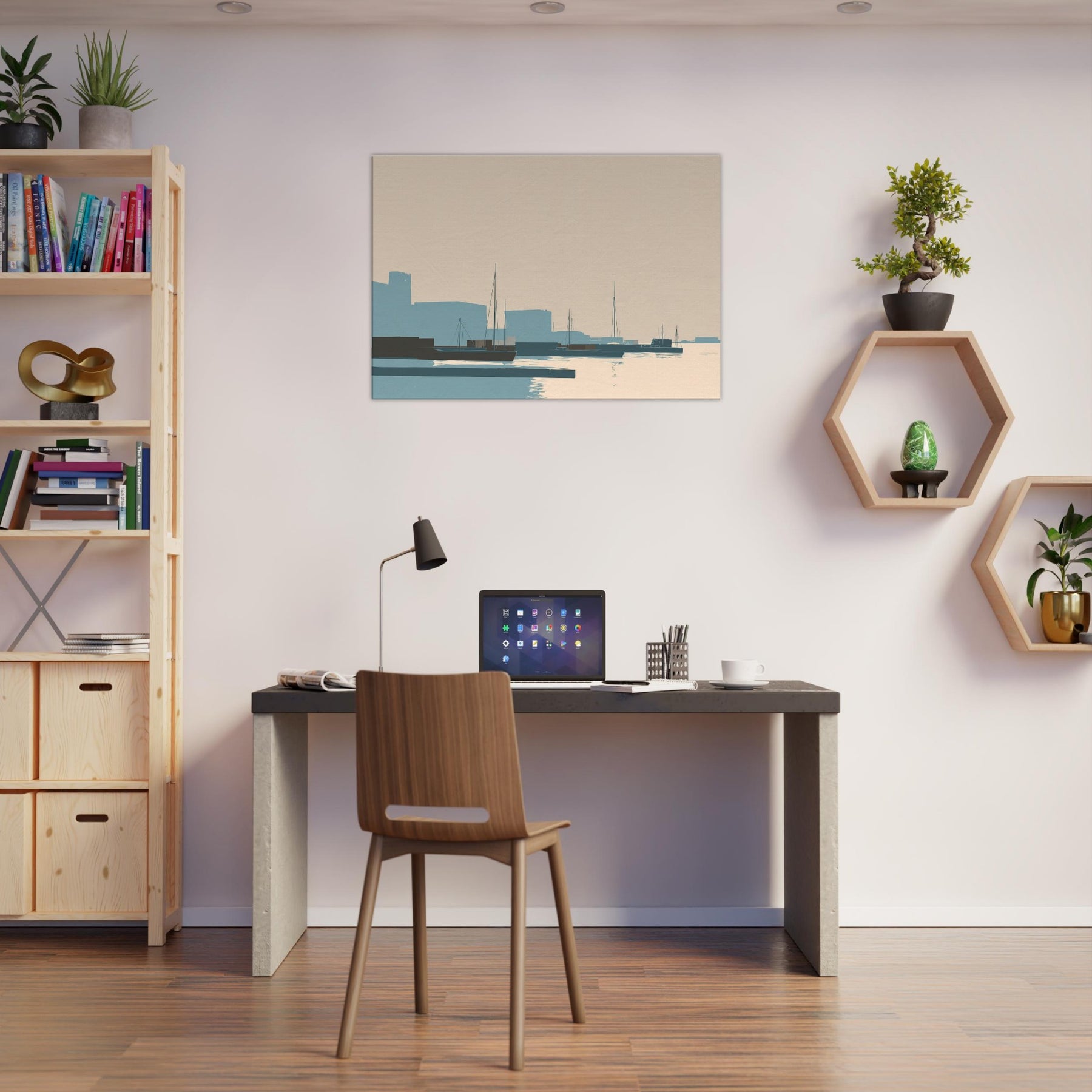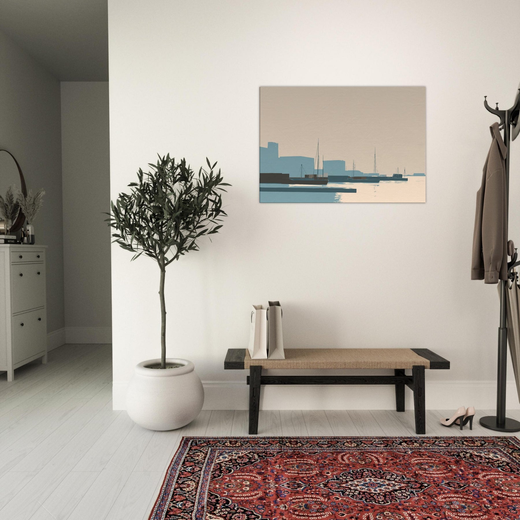 Let the Harbor unfold in quiet, minimalist strokes that invite stillness into your space. This serene scene reduces the shoreline to essential planes of color and line, letting the peach sky cradle cool blue water while silhouettes of boats and distant buildings breathe a gentle rhythm across the frame. The result is a calm focal point that feels both contemporary and timeless, perfect for a living room, study, or hallway. It elevates atmosphere without shouting, turning daily rituals into a shoreline of mindful pause.