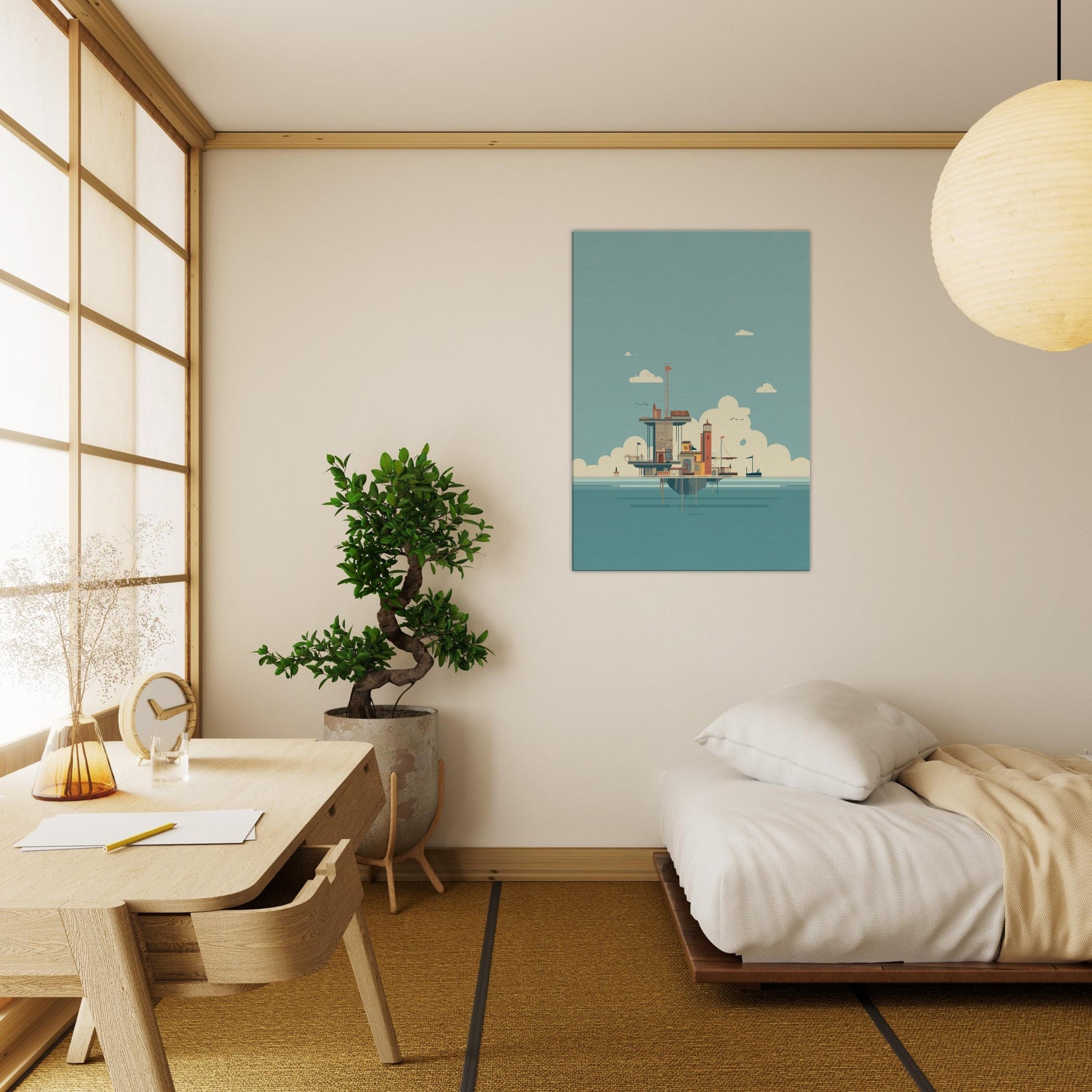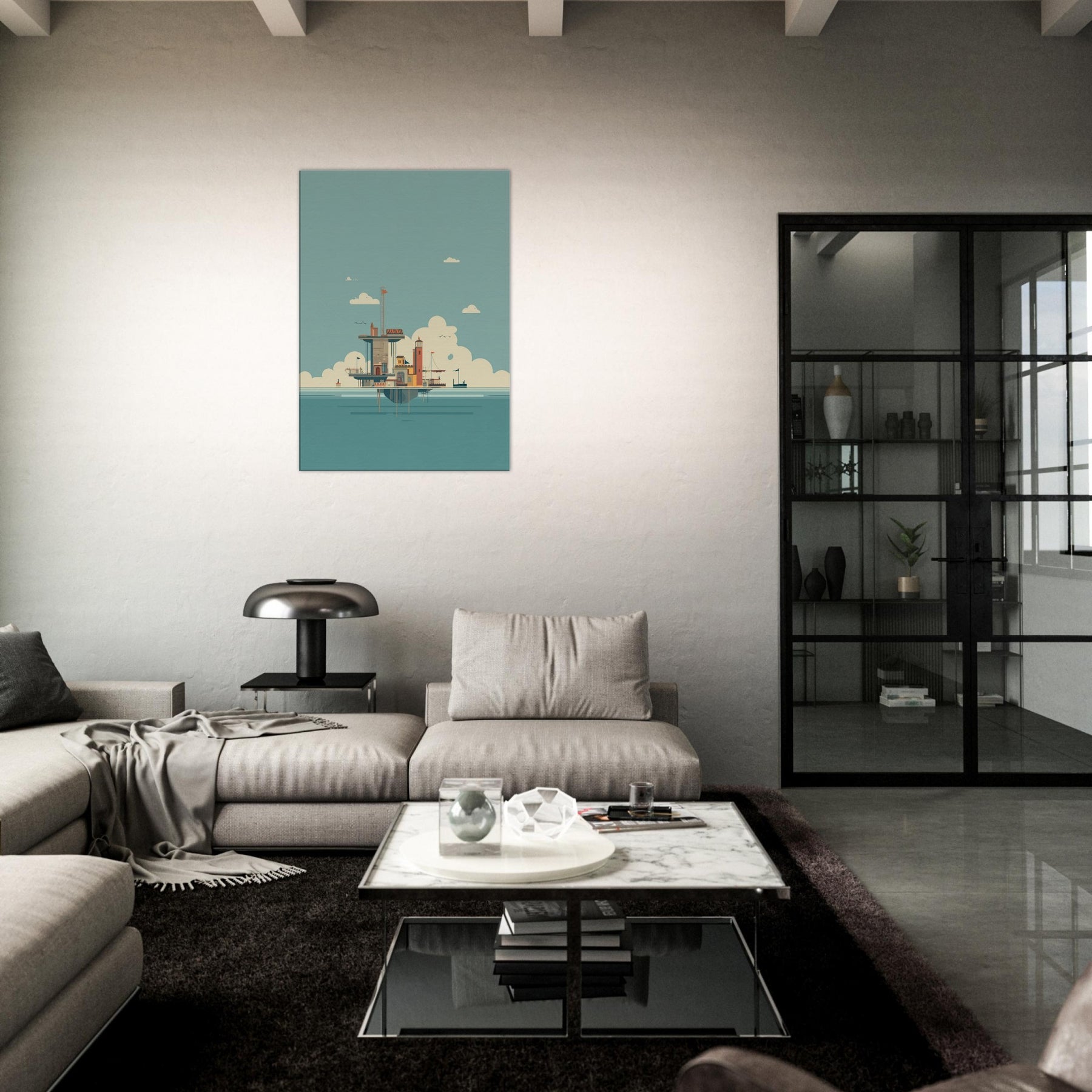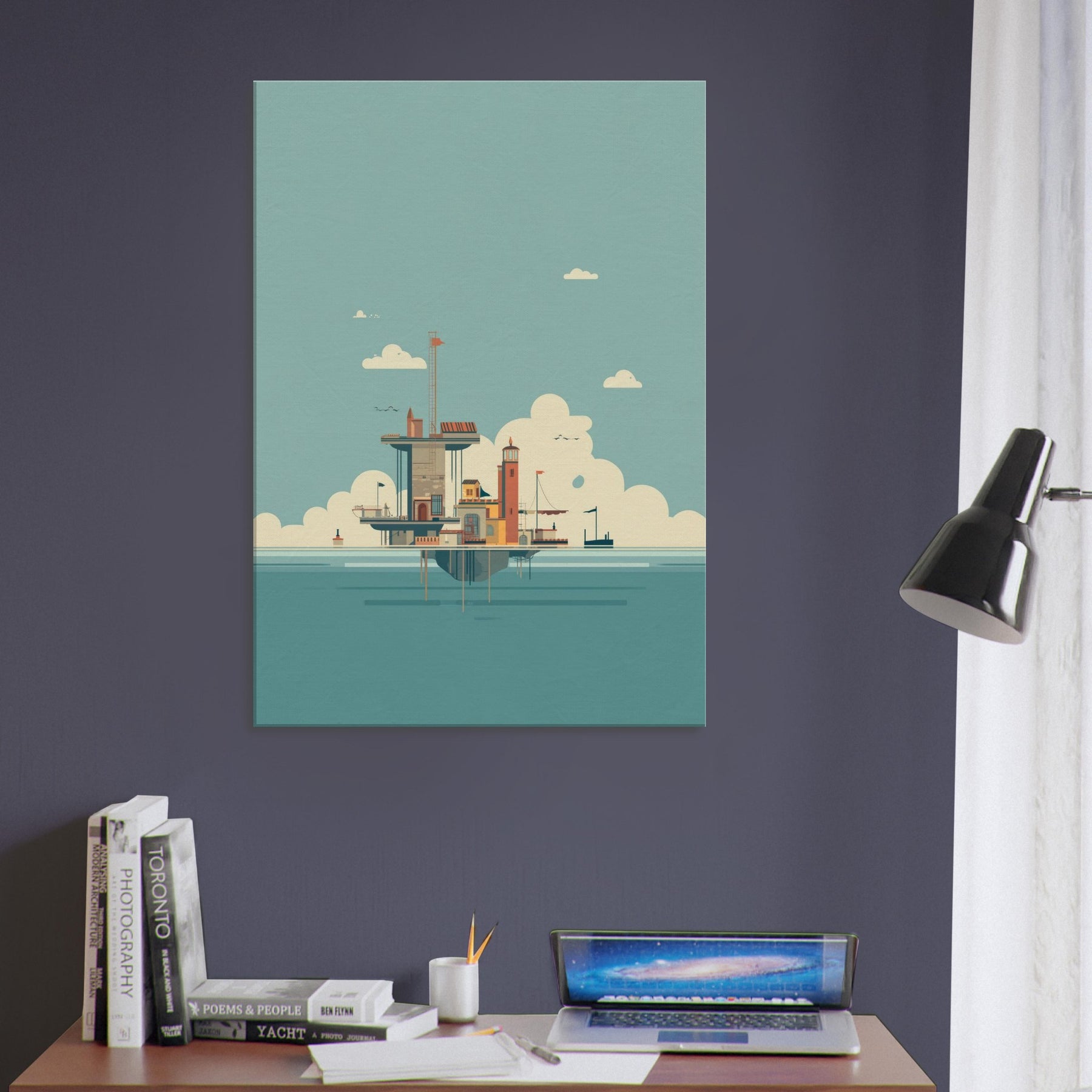 Imagine the calm of a Floating City resting on a glassy sea, rendered in clean lines and soft gradients. This minimalist scene whispers quiet wonder, where towers rise like delicate punctuation against a vast, pastel horizon. The atmosphere invites slow breathing and focus, turning a living space into a morning harbor or twilight sanctuary. In person, the restrained palette mirrors sunsets and seafoam, creating balance, depth, and a subtle sense of mythic possibility that elevates any room.