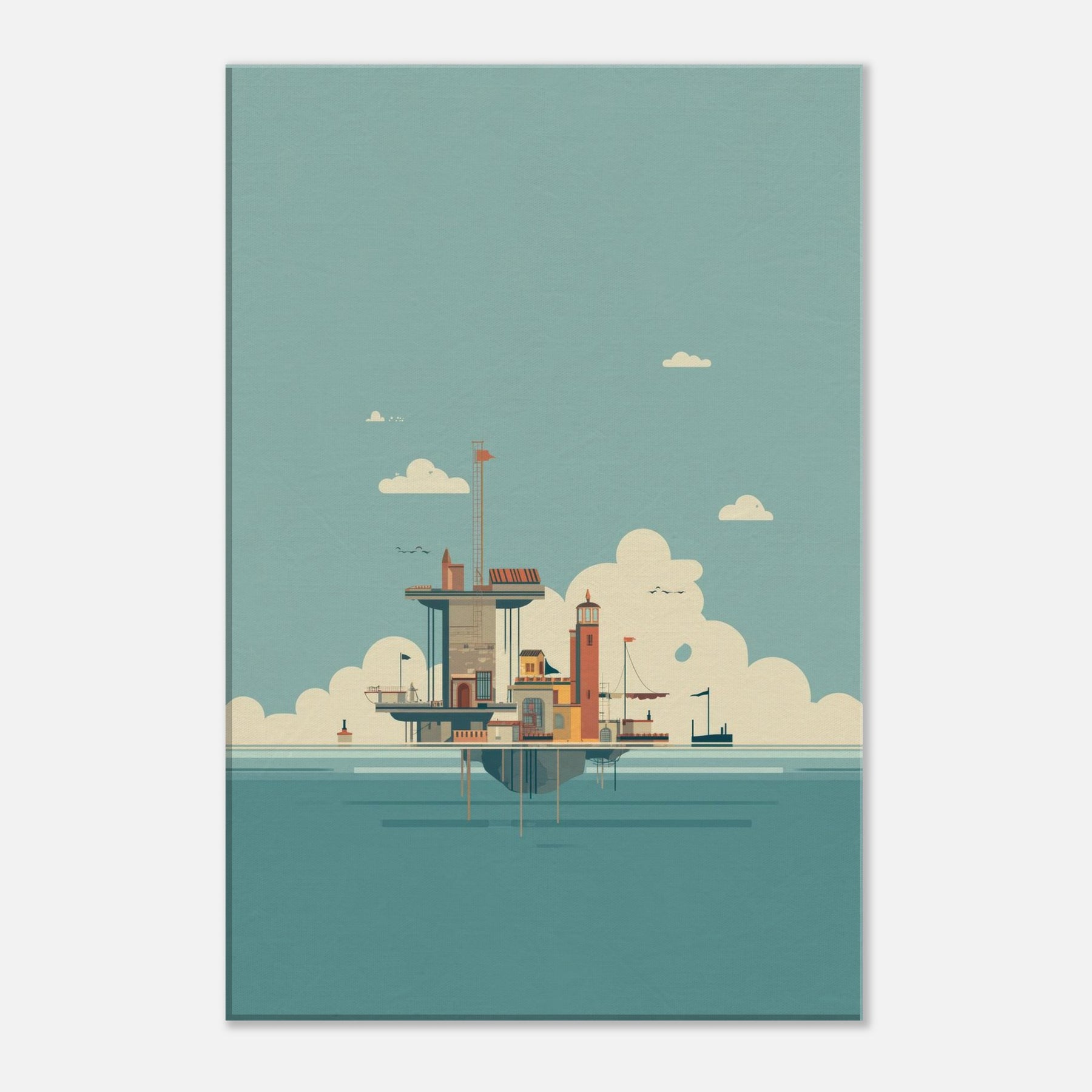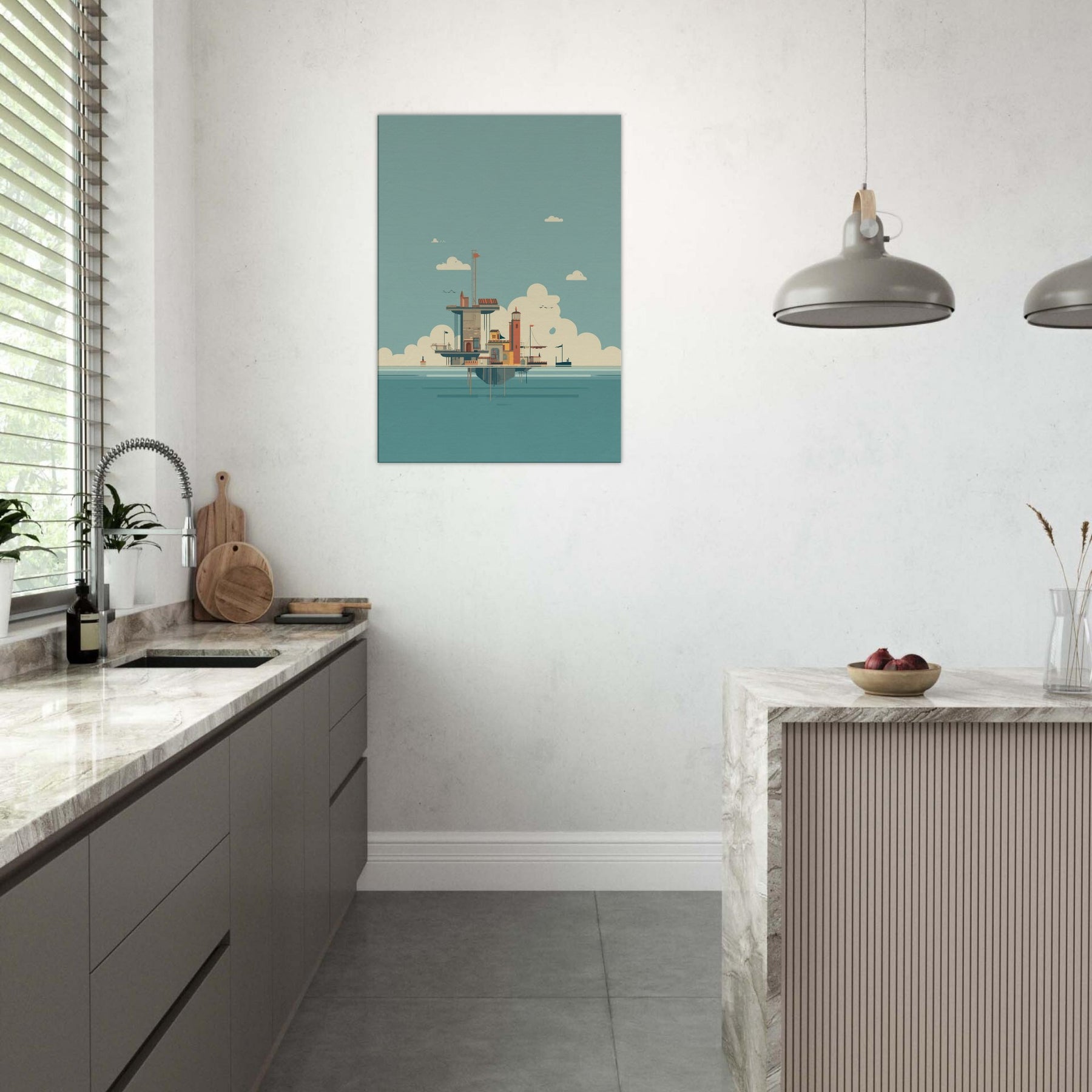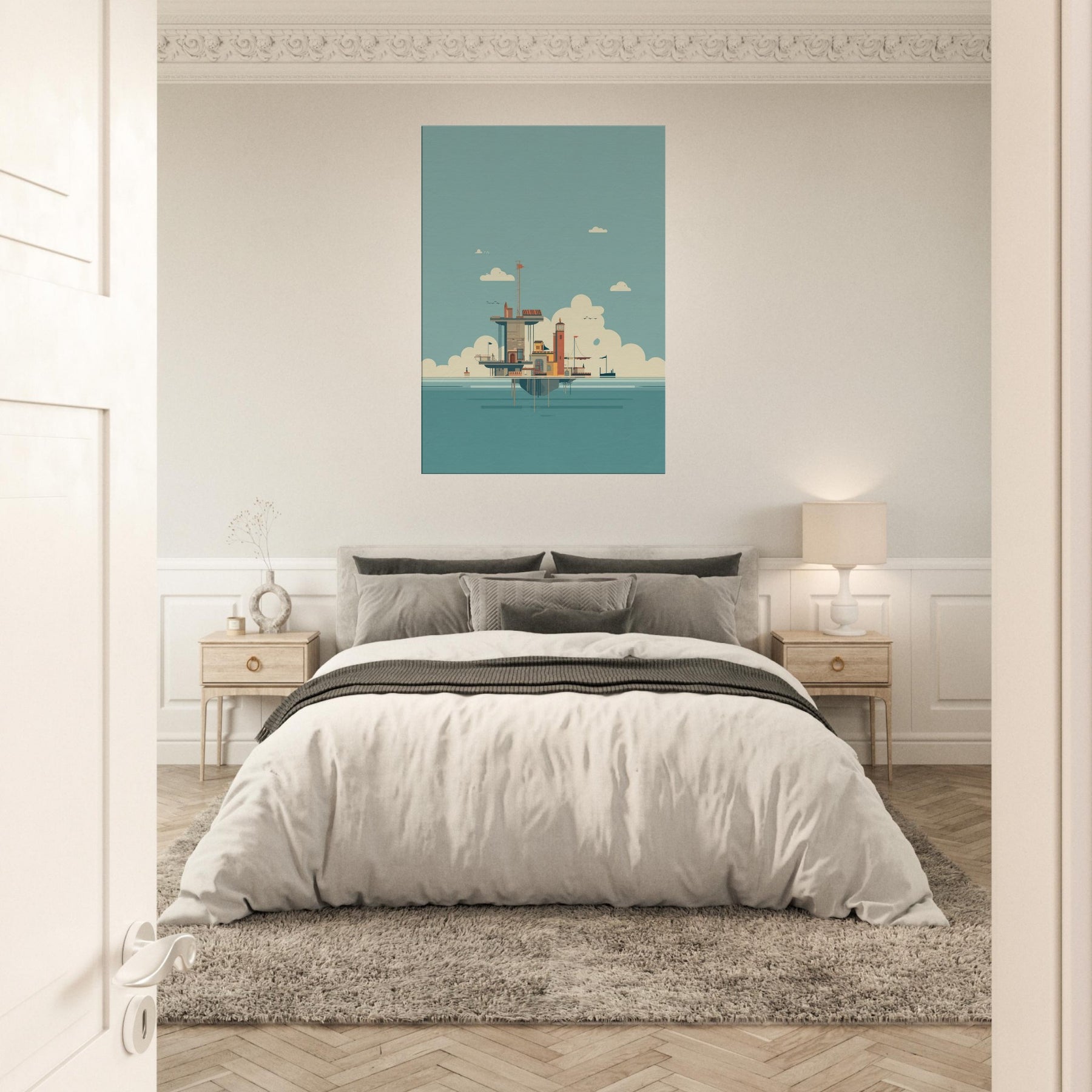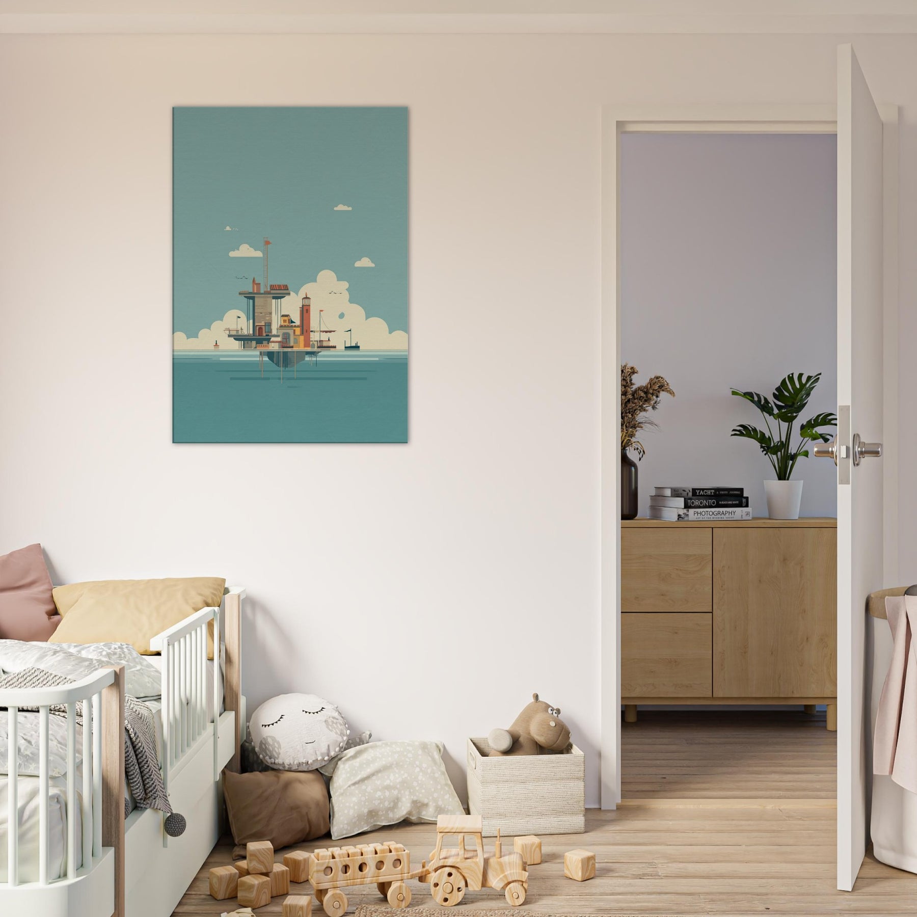 Imagine the calm of a Floating City resting on a glassy sea, rendered in clean lines and soft gradients. This minimalist scene whispers quiet wonder, where towers rise like delicate punctuation against a vast, pastel horizon. The atmosphere invites slow breathing and focus, turning a living space into a morning harbor or twilight sanctuary. In person, the restrained palette mirrors sunsets and seafoam, creating balance, depth, and a subtle sense of mythic possibility that elevates any room.