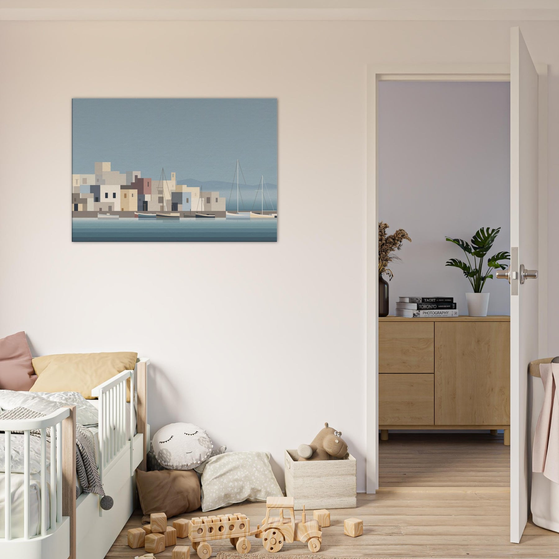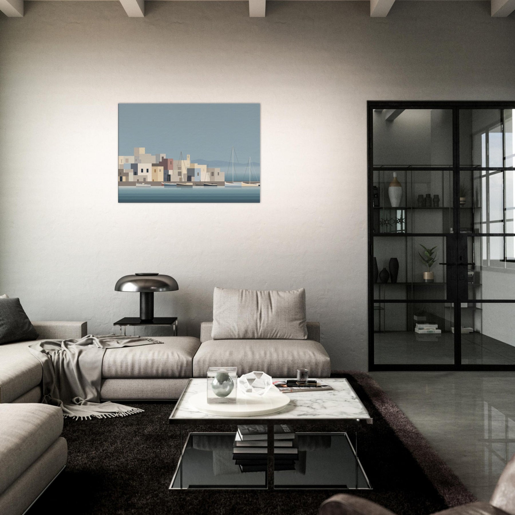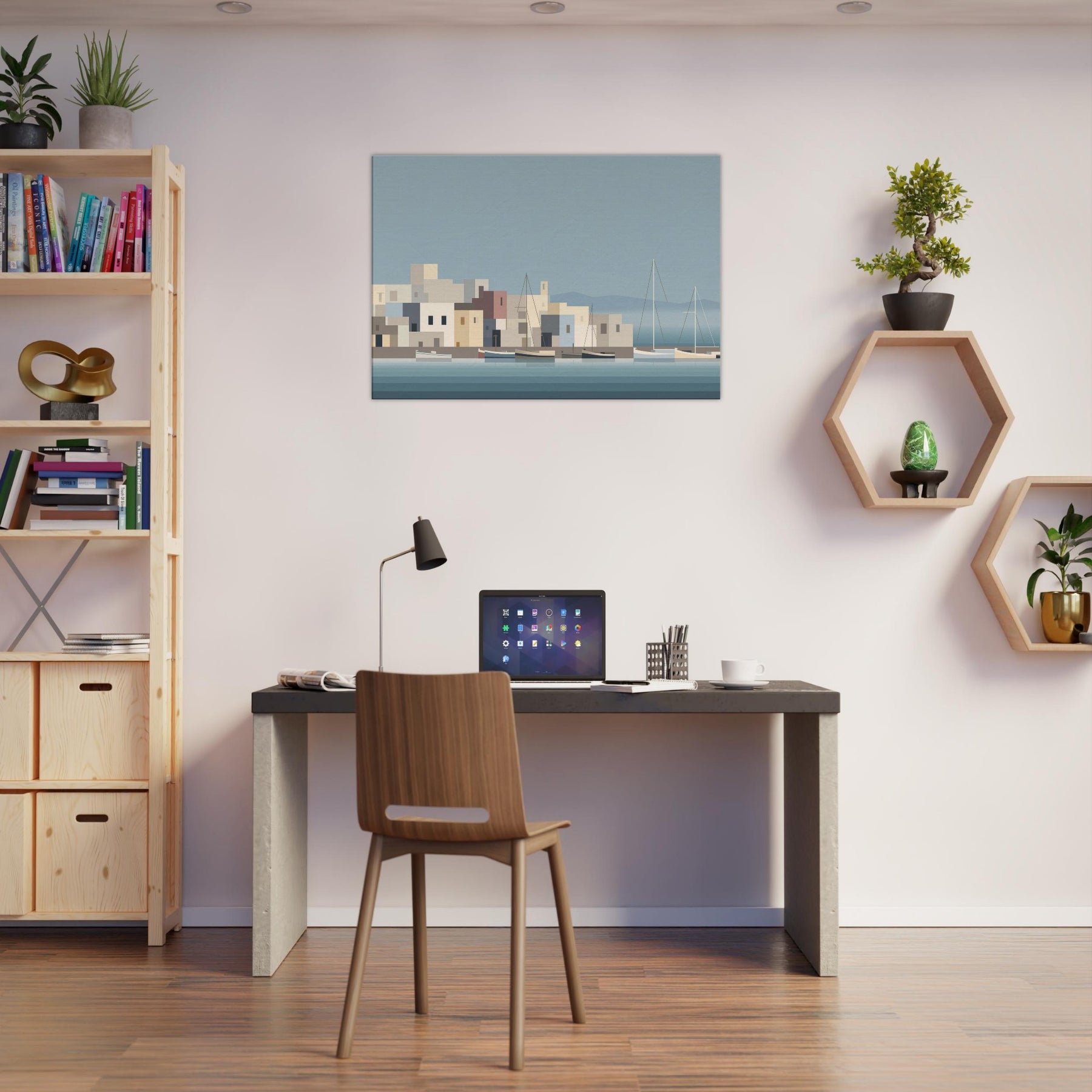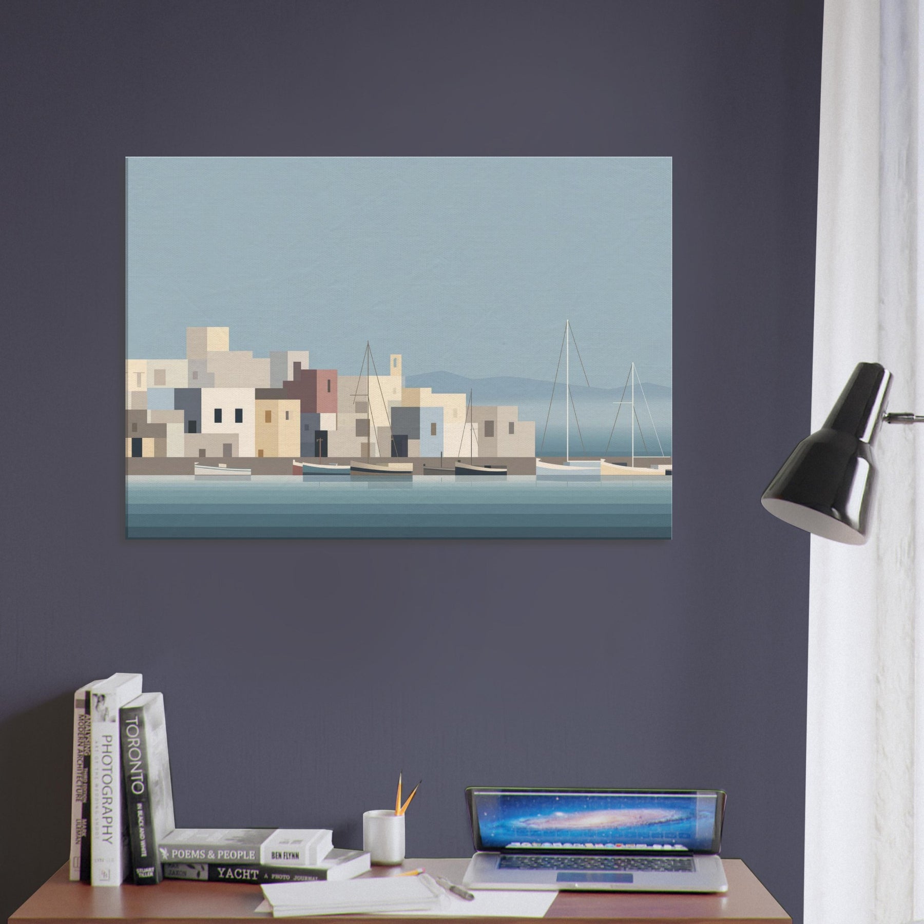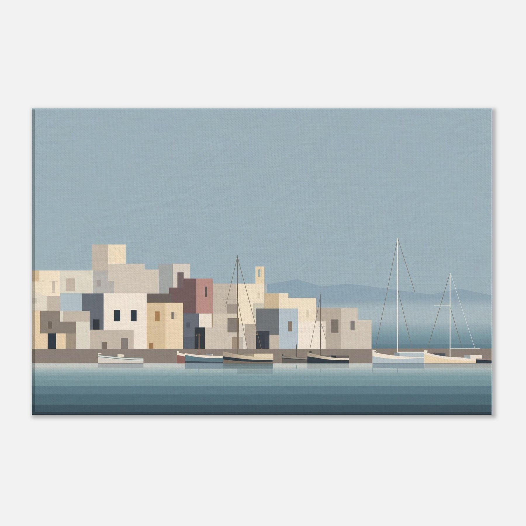 Harbor unfolds in quiet blocks of color and lines, inviting calm into any room. The harbor becomes a serene silhouette boats resting on glassy water, pastel buildings stacking like gentle steps toward the horizon. Its minimalist rhythm softens a space, amplifying natural light and texture while hinting at far off breezes and dusk. This piece turns everyday living spaces into a harbor of pause, where reflection and invitation mingle and every glance feels quietly renewed.