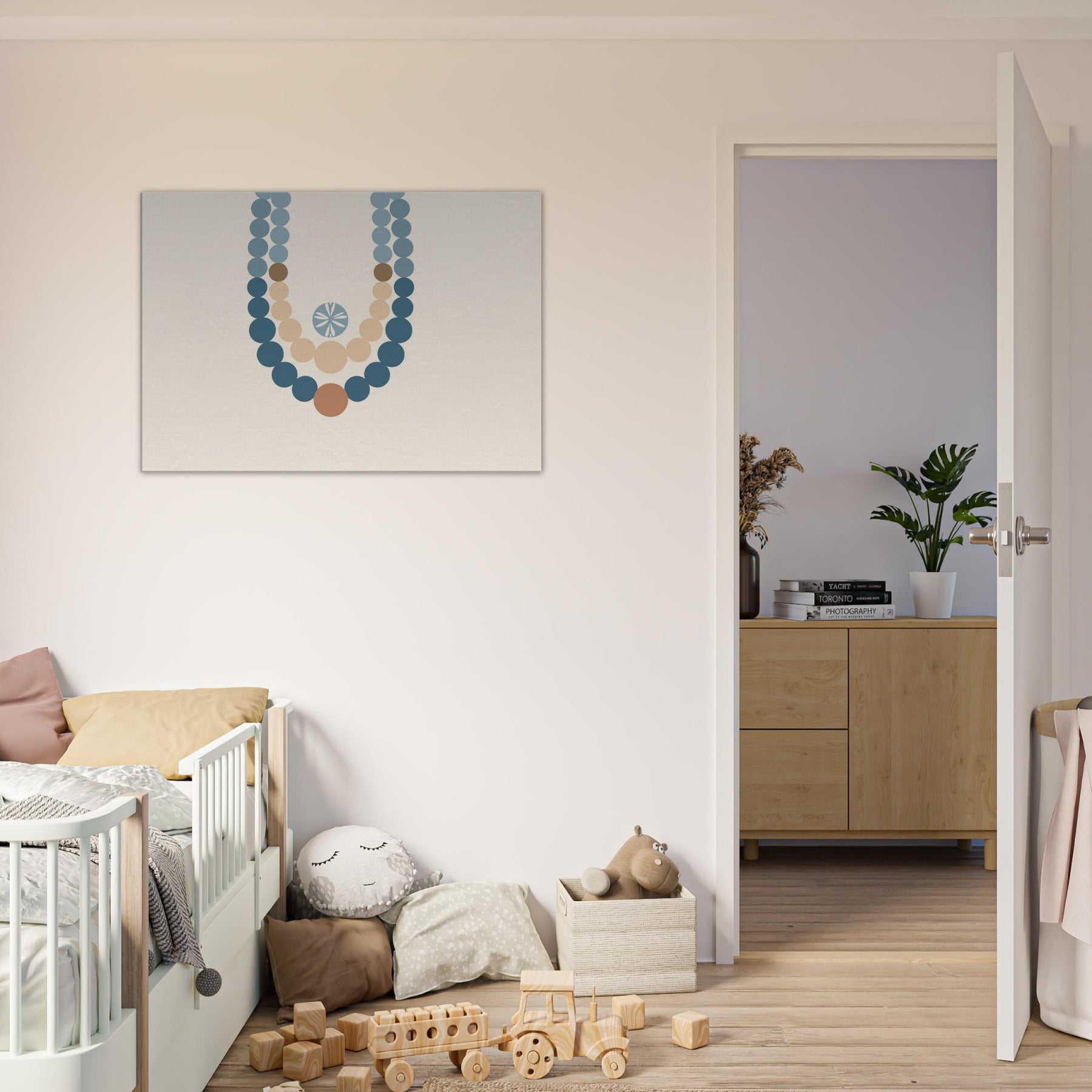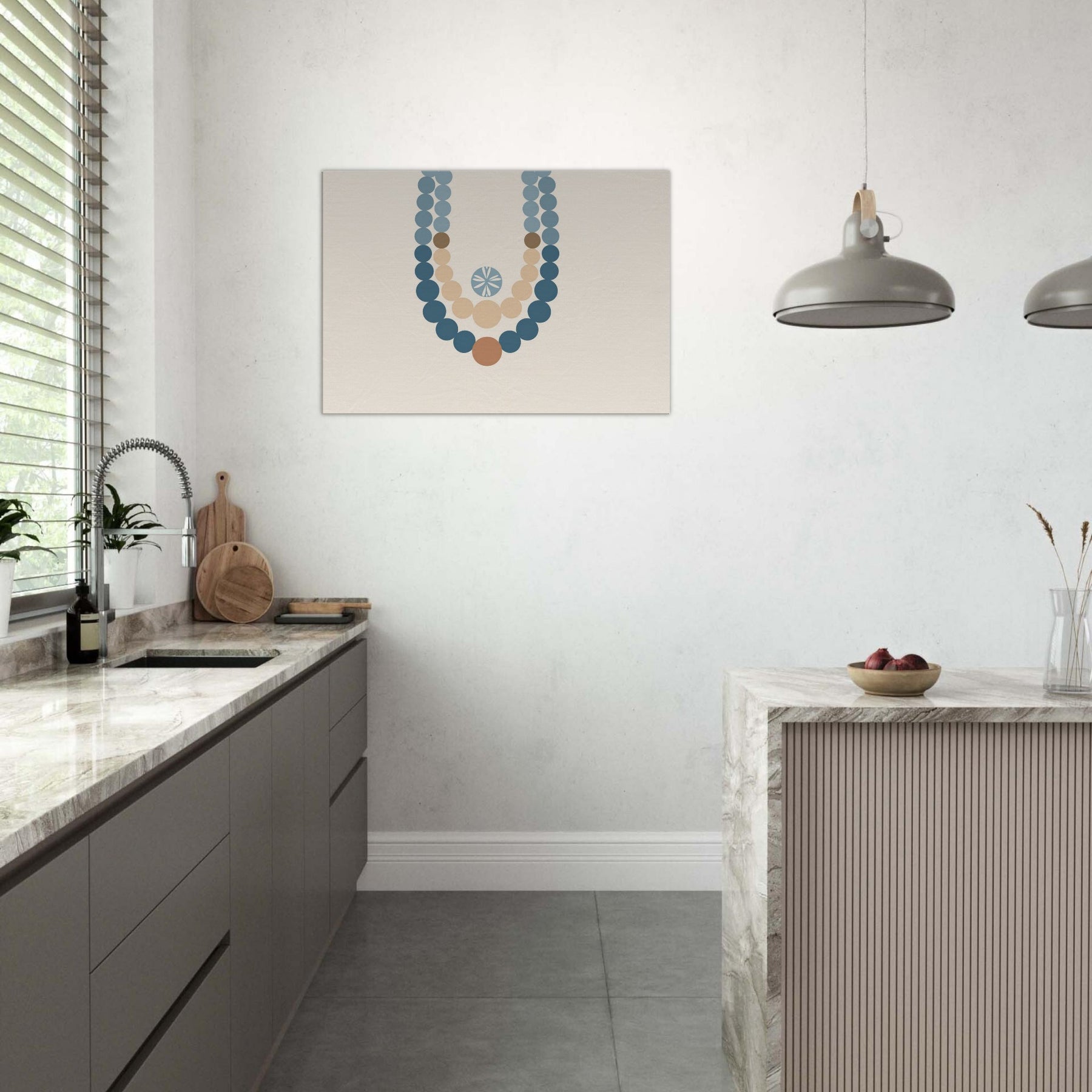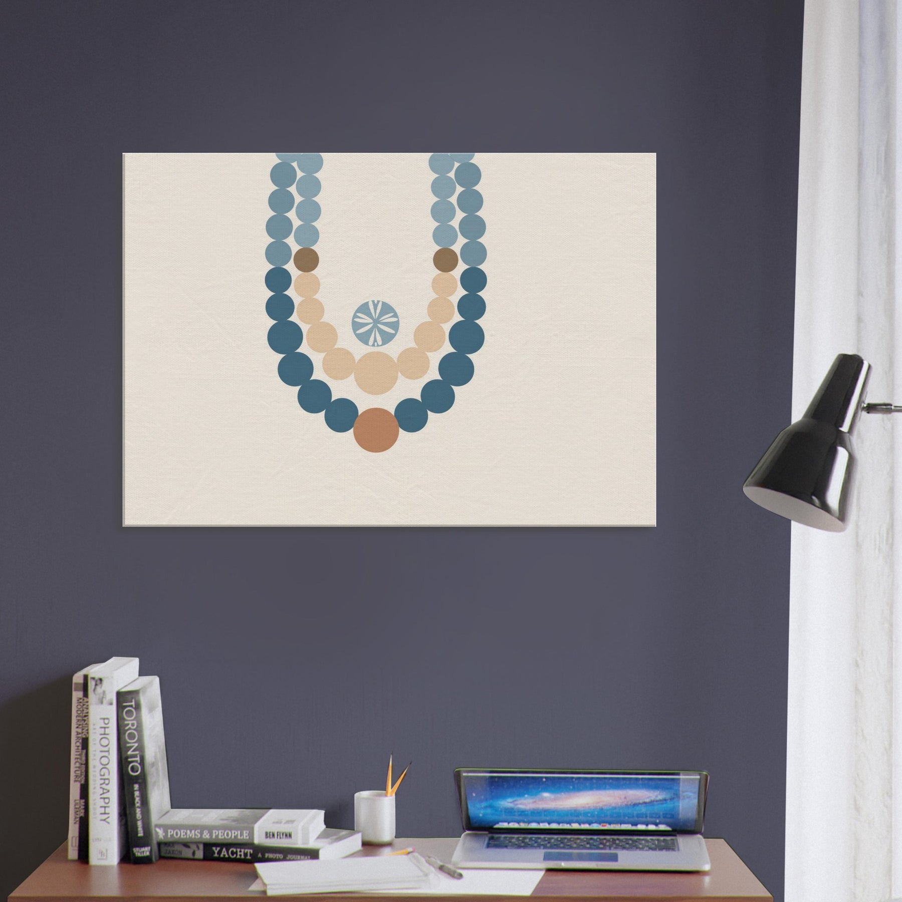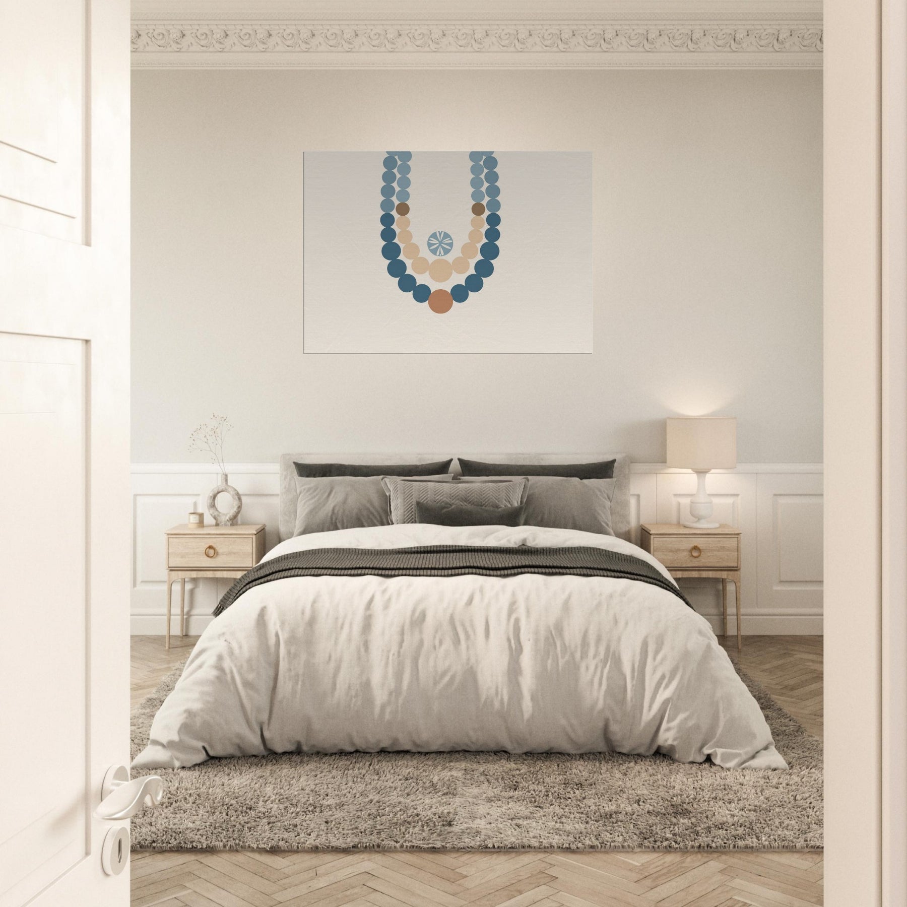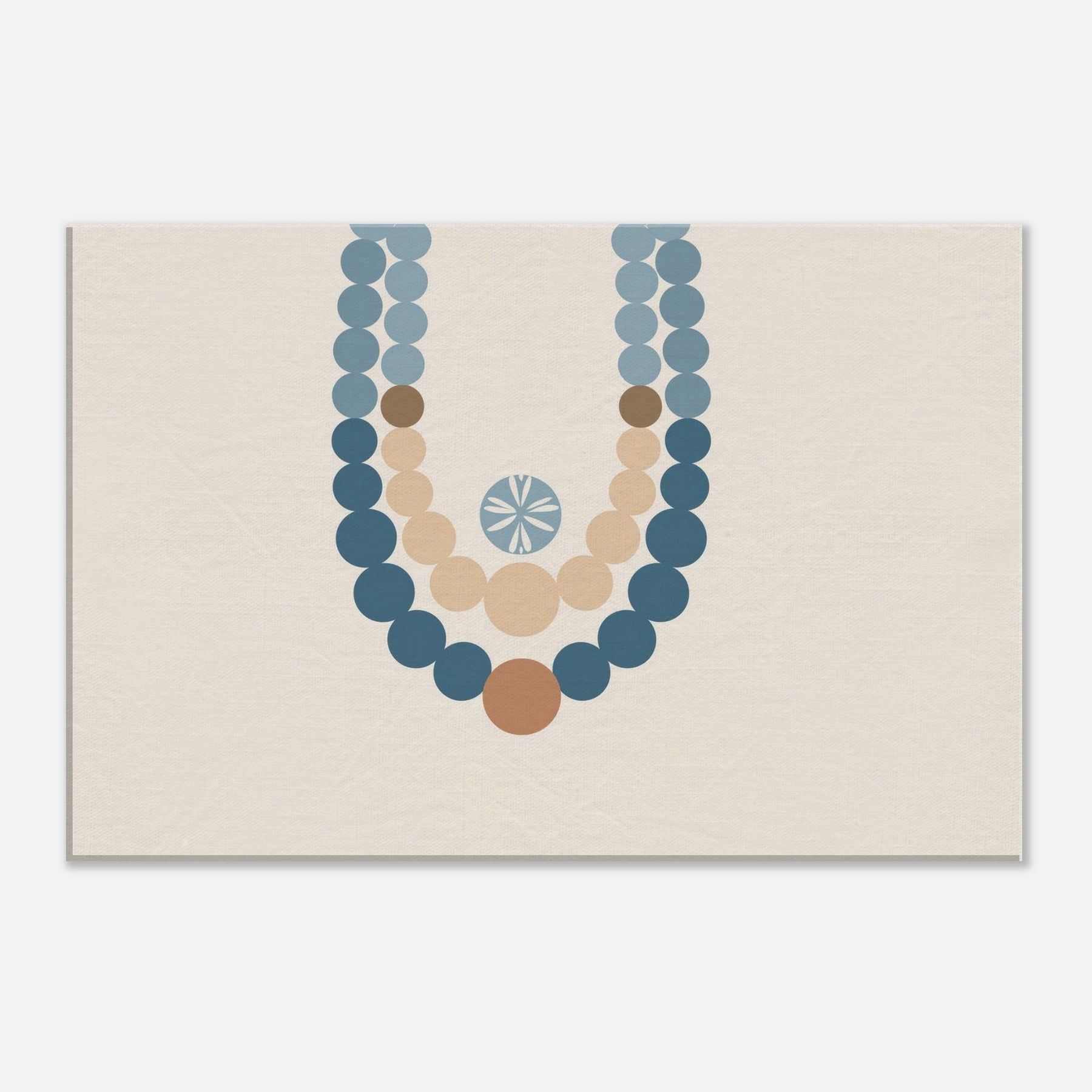 Drawn to the hush of ritual, this piece centers on the Primary Subject: Prayer Beads (Mala/Tasbih). The minimalist strands drape in soft blues and warm earth tones, forming a meditative arc against a calm ivory field. Light seems to gather along each bead, inviting quiet breath and contemplation. Its generous negative space mirrors stillness at dawn, making the wall a sanctuary where conversation loosens into gesture and presence, gently elevating a living room with a sense of sacred ease.