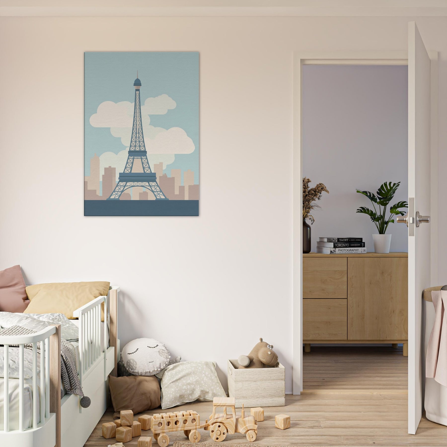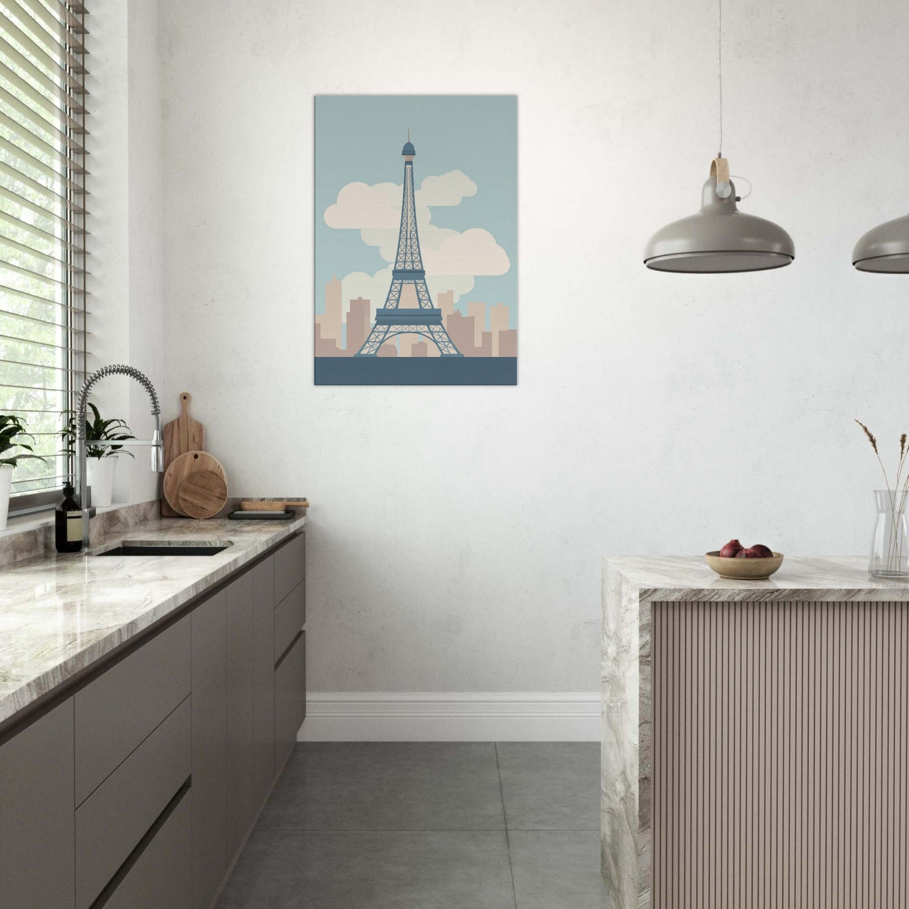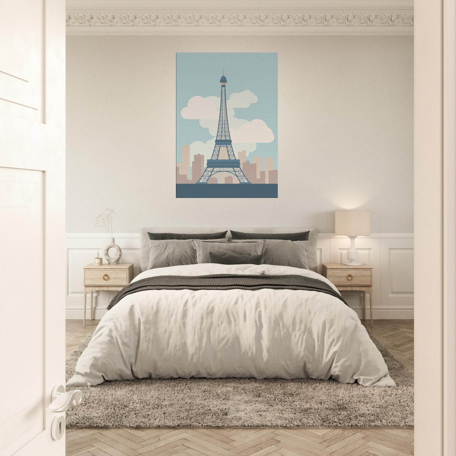 A quiet ode to light and distance, this minimalist interpretation renders the Eiffel Tower with clean lines that invite contemplation rather than detail. The soft blues and sandy neutrals create a tranquil cityscape that feels as if the dawn paused above your room. Imagine the tower peeking above a calm horizon, a sculptural reminder of travel, romance, and possibility. Perfect above a sofa or bed to anchor a quiet, modern living space.