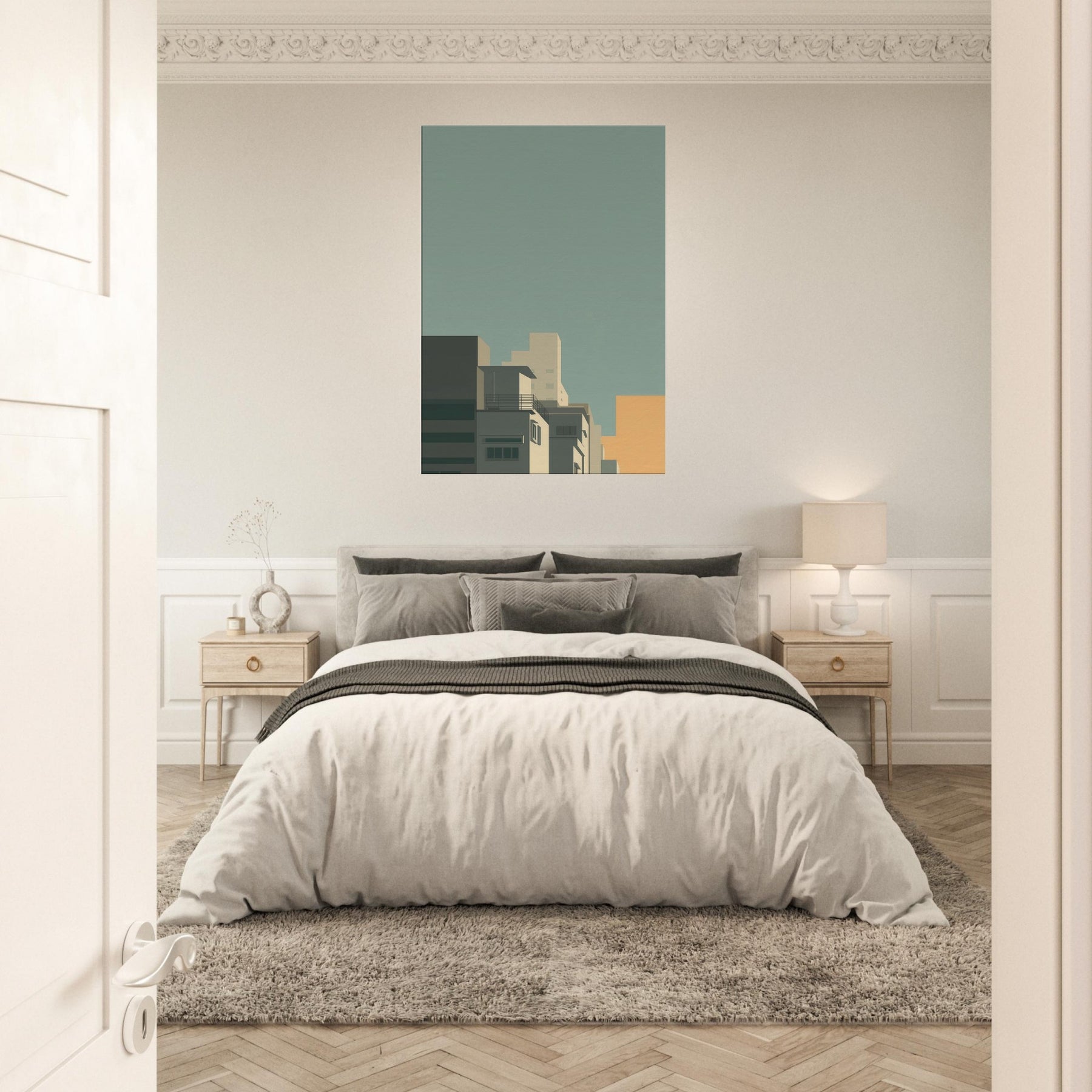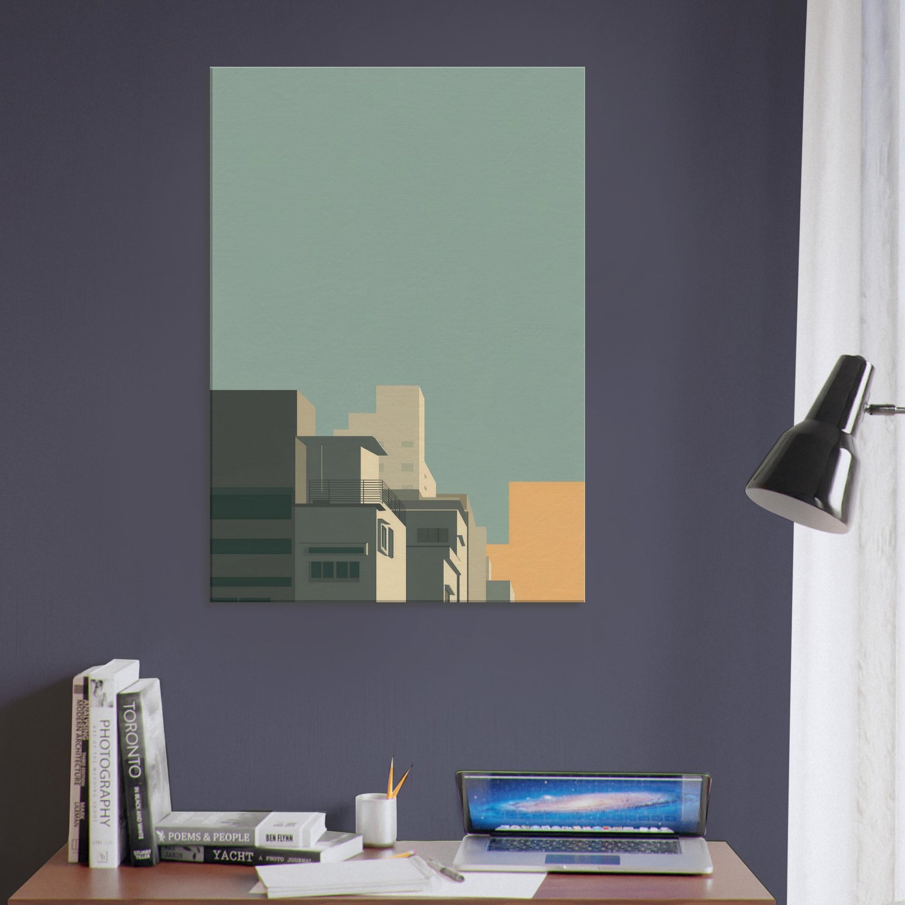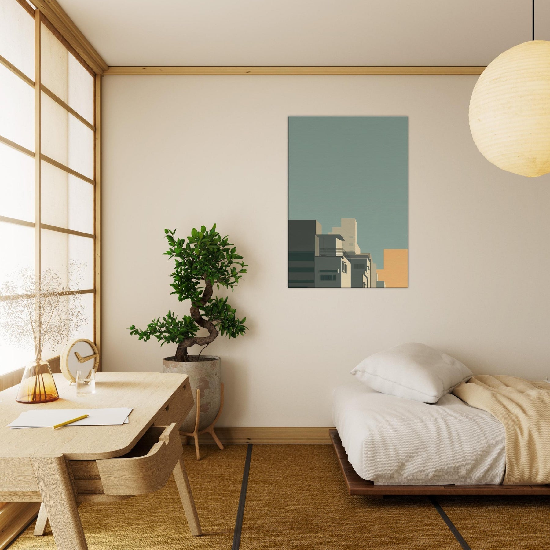 In this minimalist homage to Kyoto, the quiet geometry of blocks and soft, sun warmed tones breathe calm into any room. The architecture becomes a patient lullaby, the balance of shadow and light, the subtle rhythm of balconies and stairwells, inviting stillness as you pause to watch it unfold. This serene cityscape enhances a living space by guiding the eye, softening walls with gentle color, and turning a hallway or lounge into a contemplative moment. A refined, modern anchor for everyday rituals.