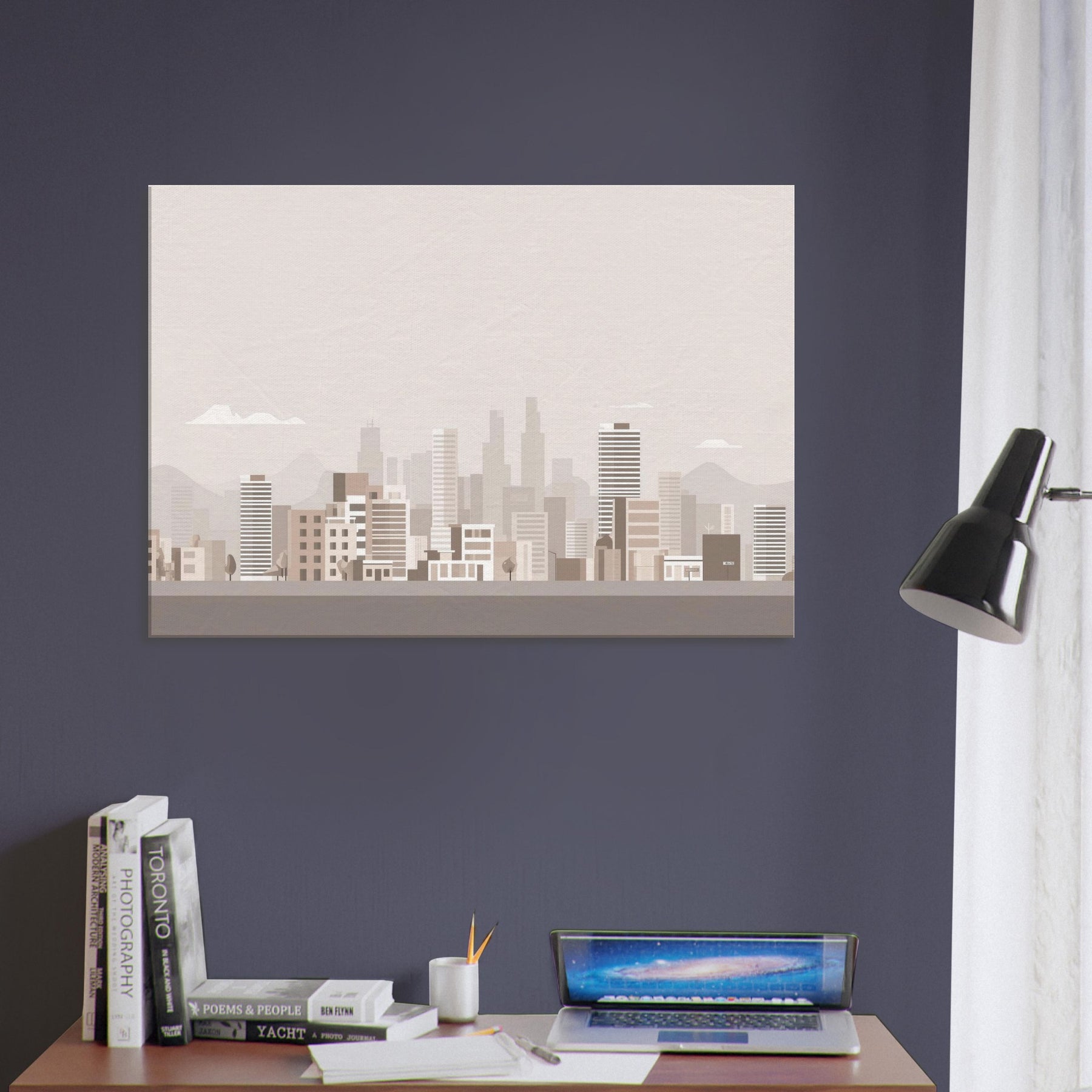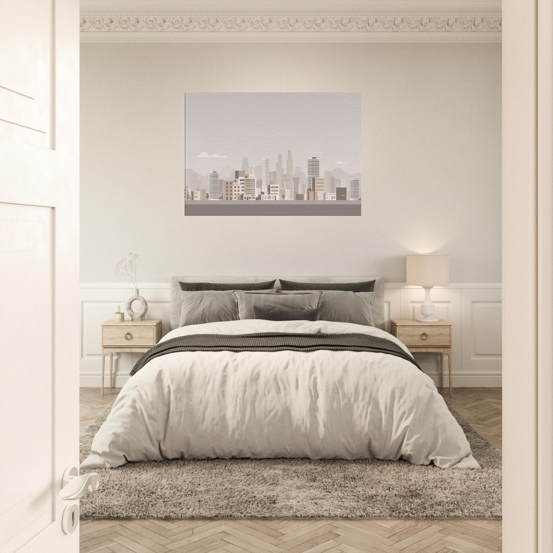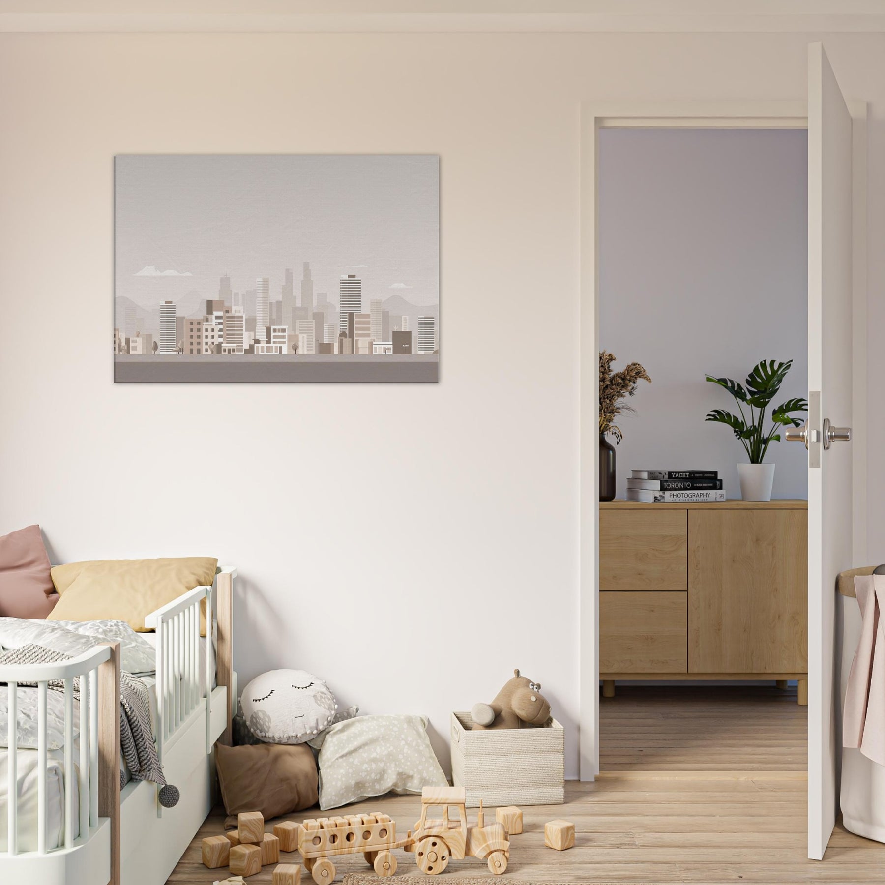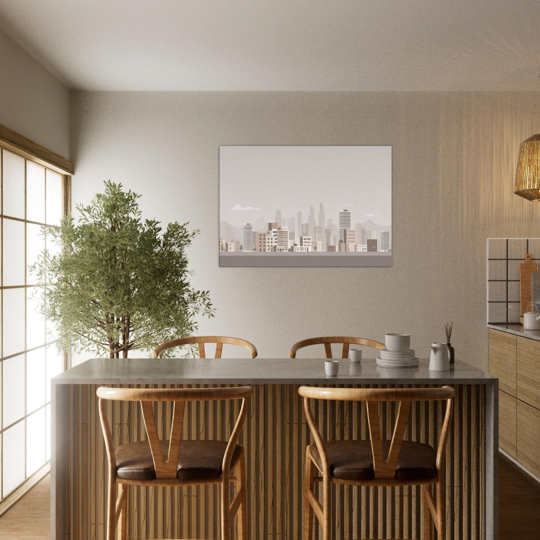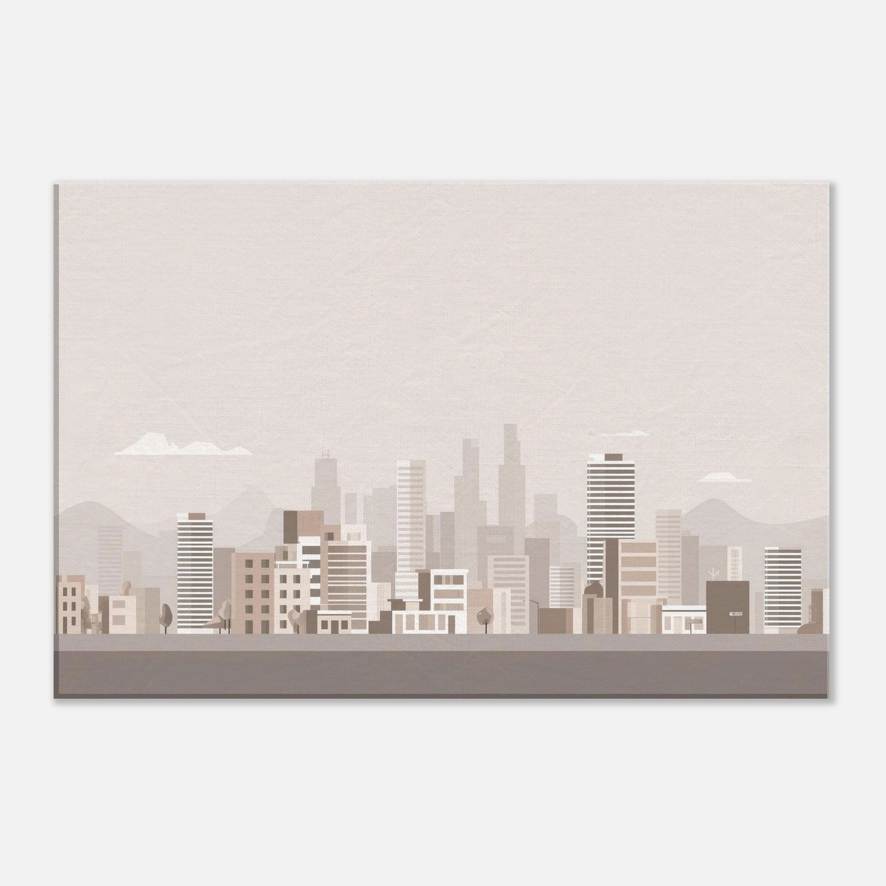 In this pared back tribute to Los Angeles, the skyline dissolves into gentle blocks of beige and taupe, inviting quiet contemplation rather than drama. The air feels warm and still, the city breathing softly at dawn as distant hills cradle the horizon. This understated composition turns a room into a calm vantage point, where light and memory mingle. Hang it where you want daily inspiration to feel approachable, sunlit, and effortlessly sophisticated.