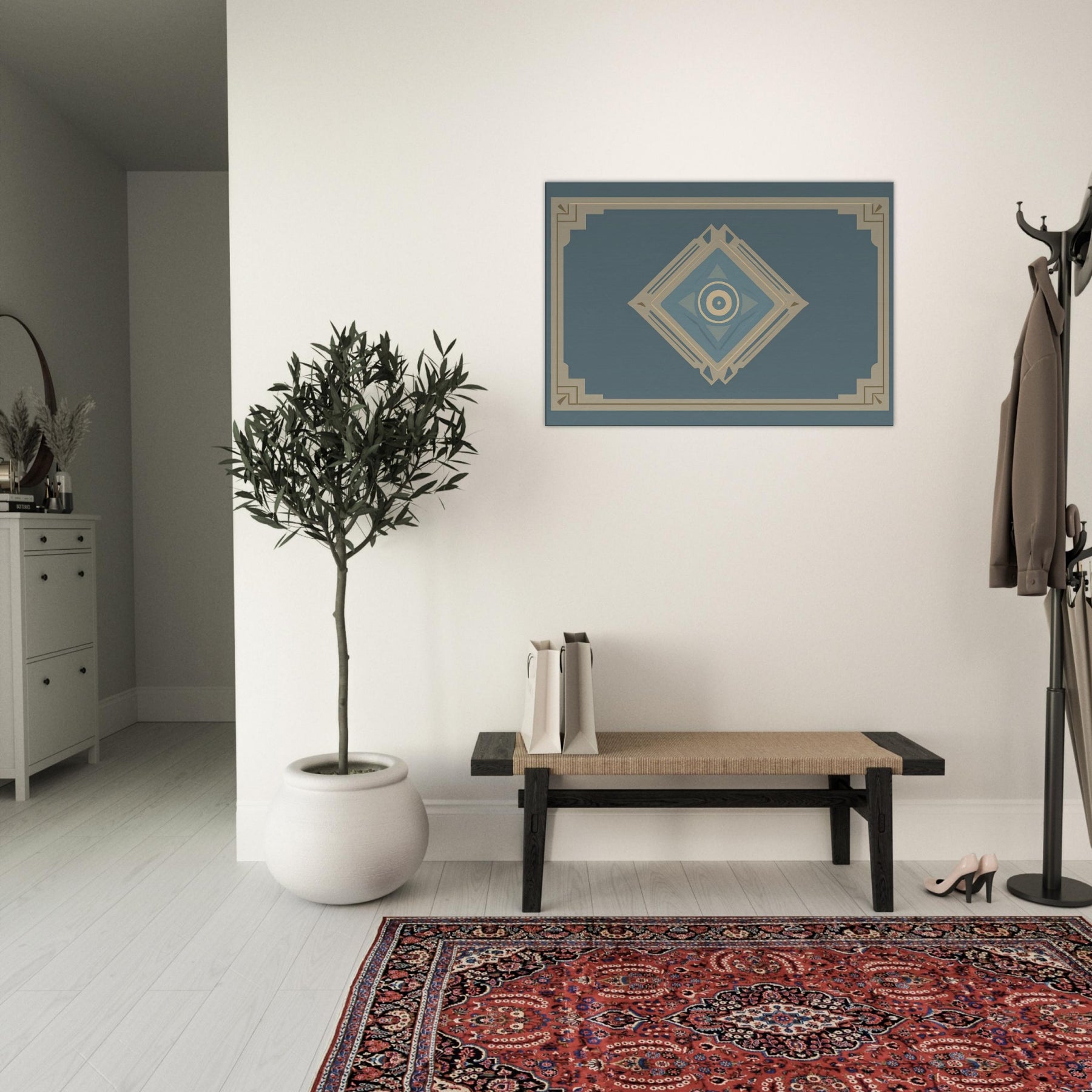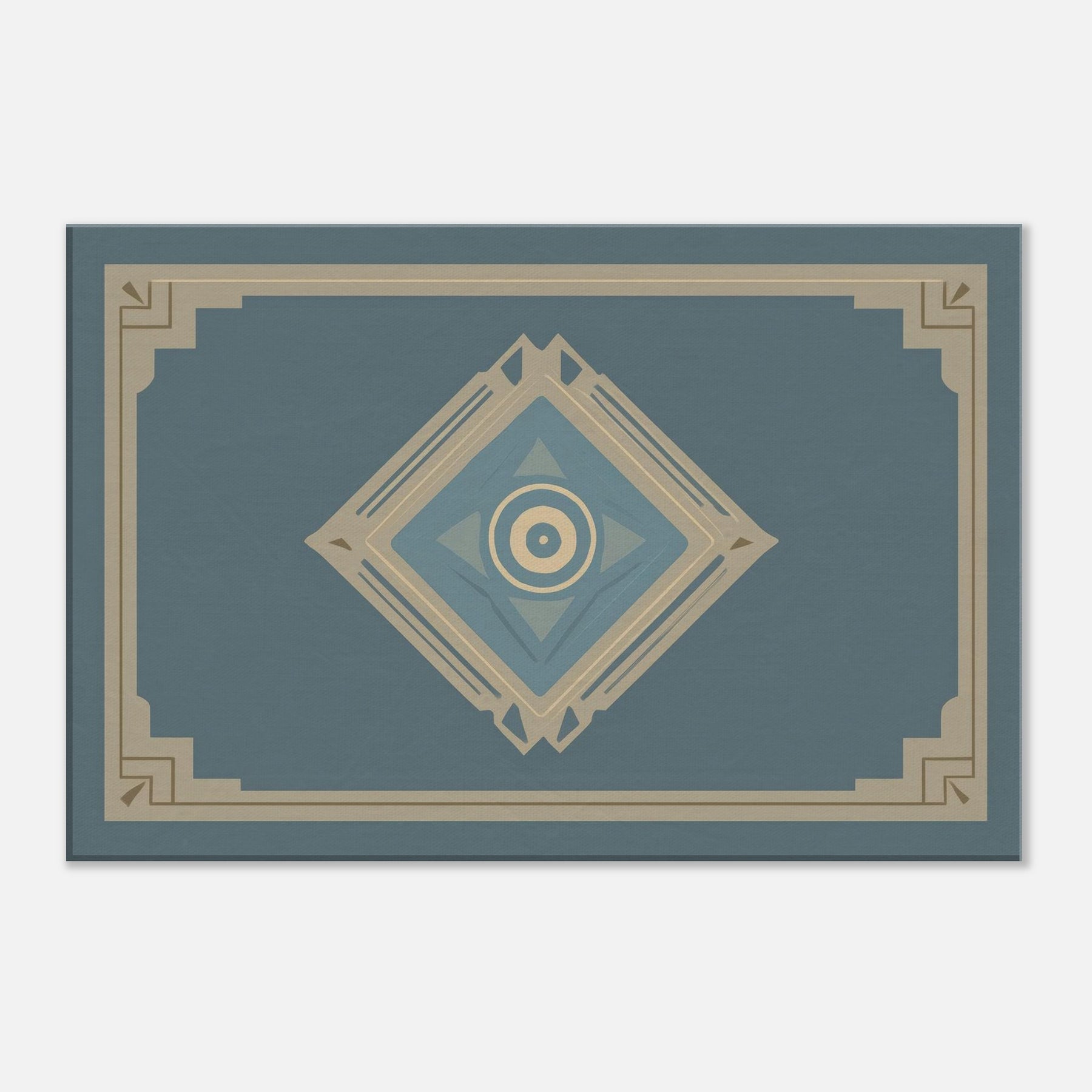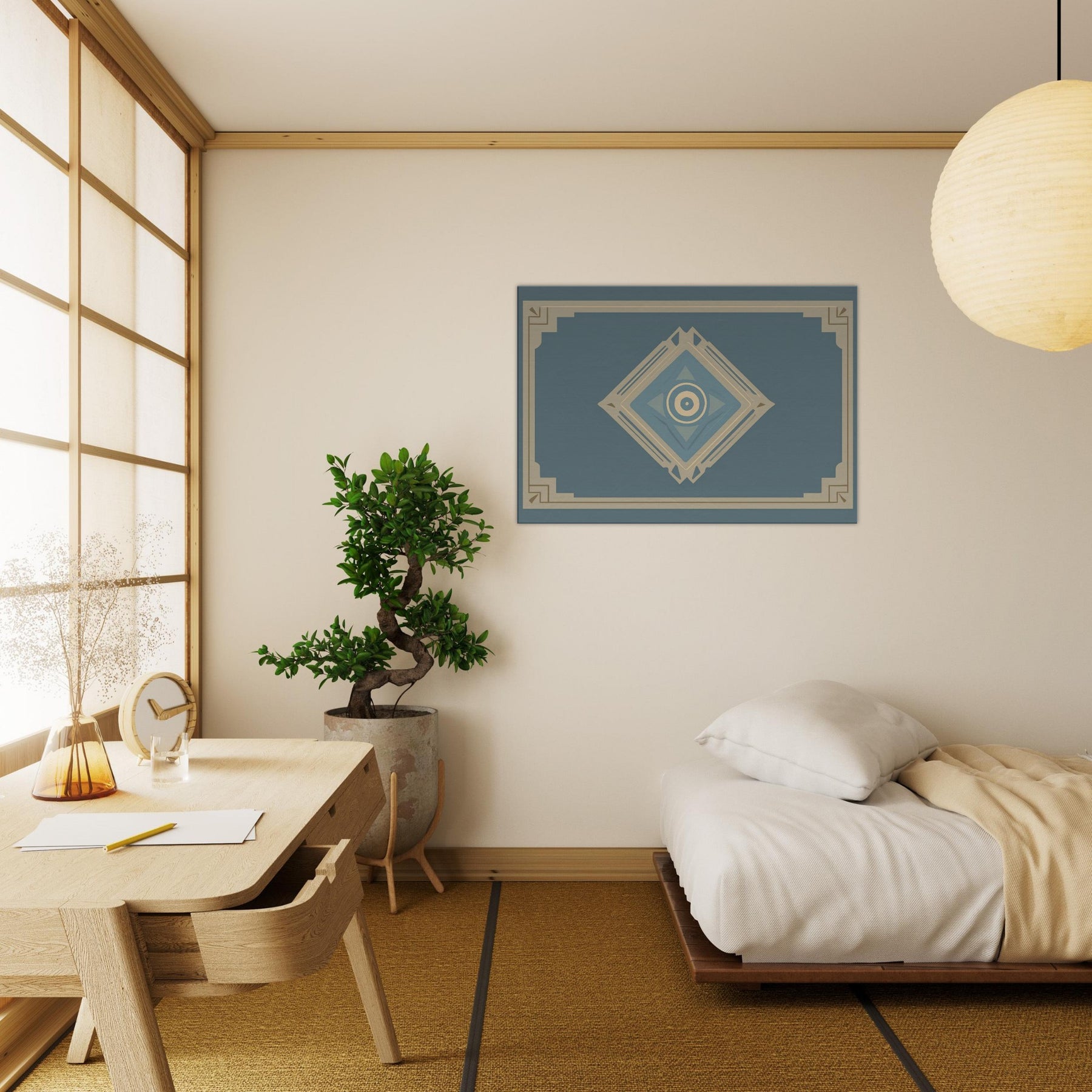 A refined meditation for any room, this piece distills Tarot Cards into clean, breathing lines. The central diamond unfurls with concentric circles, inviting a calm, almost whispered focus, while the surrounding frame suggests a doorway to quiet contemplation. The restrained palette sage blue and warm beige feels airy, modern, and timeless. Hang it where morning light or evening lamp glow can play across the subtle geometry, turning a living space into a sanctuary of stillness, imagination, and subtle mysticism.