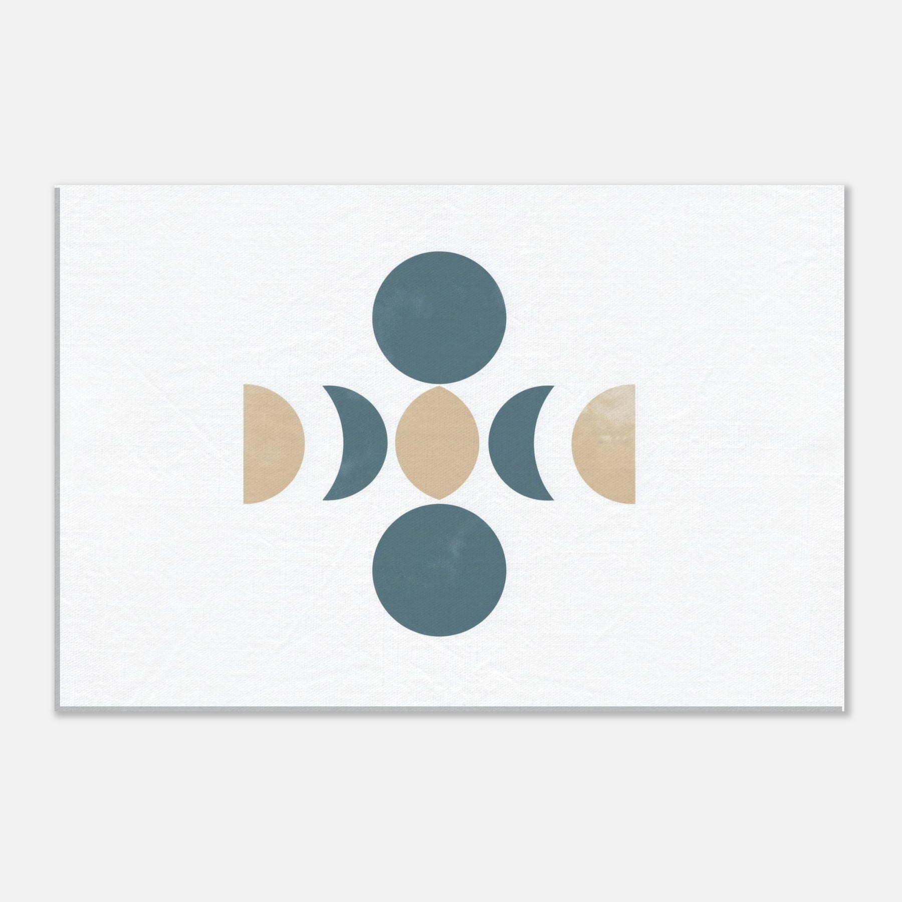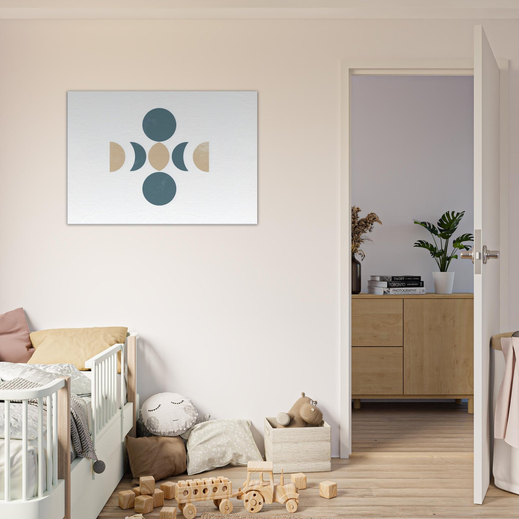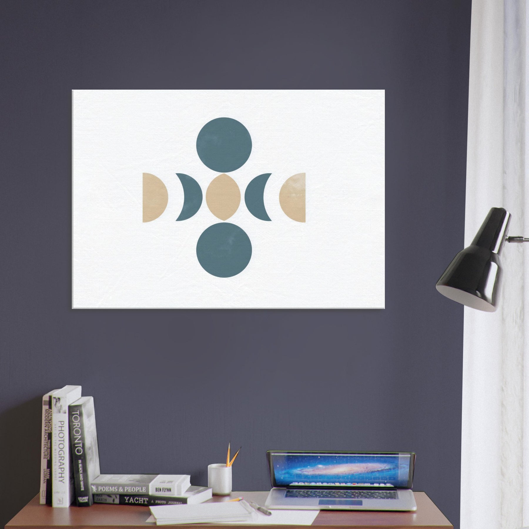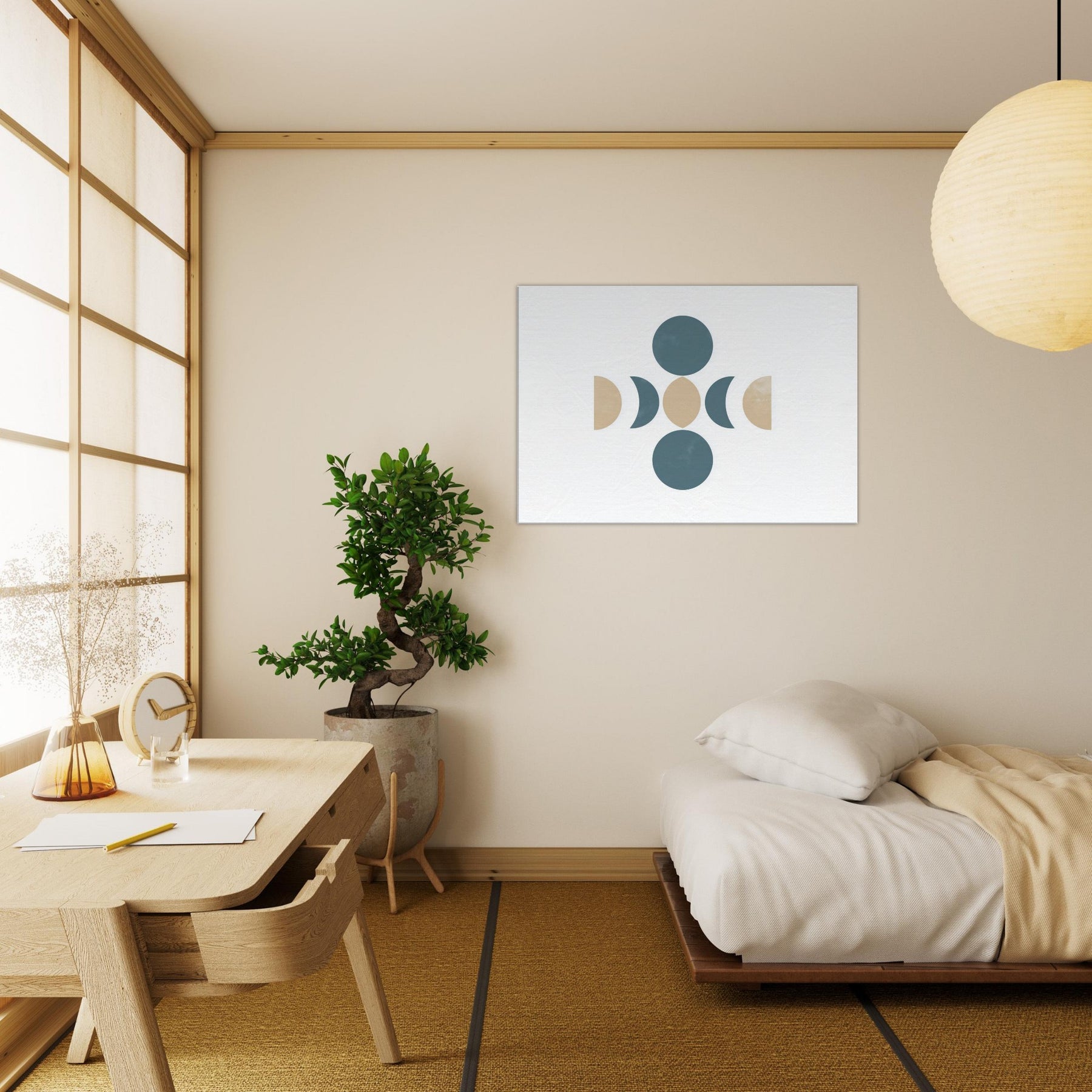 Moon Phases unfolds in calm geometry, a minimalist meditation that glows with nocturnal mystique. Each crescent and circle rests like a breath, inviting the eye to drift and settle. In a living room, it softens the air with cool blues and warm sand tones, casting a quiet, contemplative atmosphere. The piece pairs with neutral textures and ambient light, turning walls into a crescent lit horizon where imagination lingers after dusk.