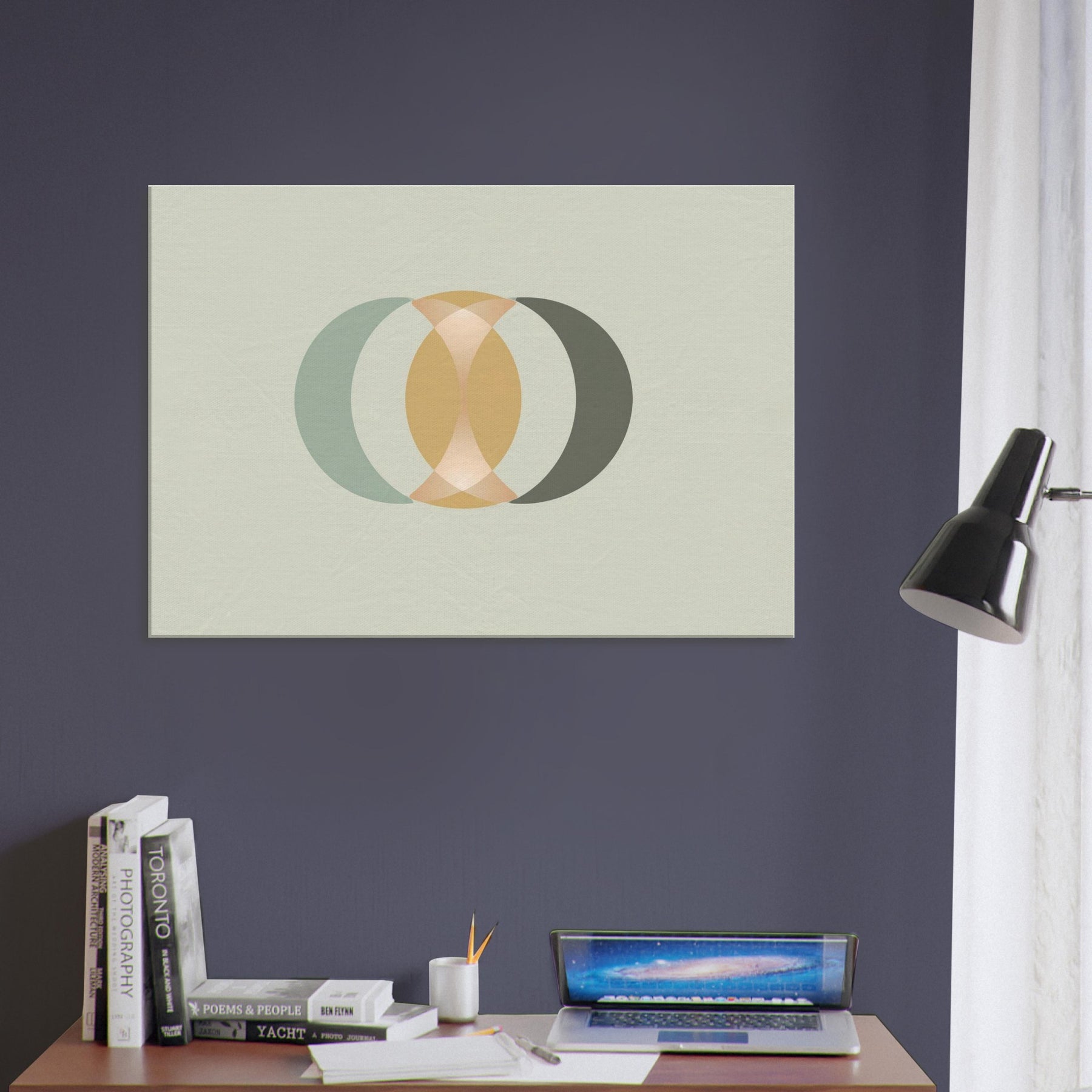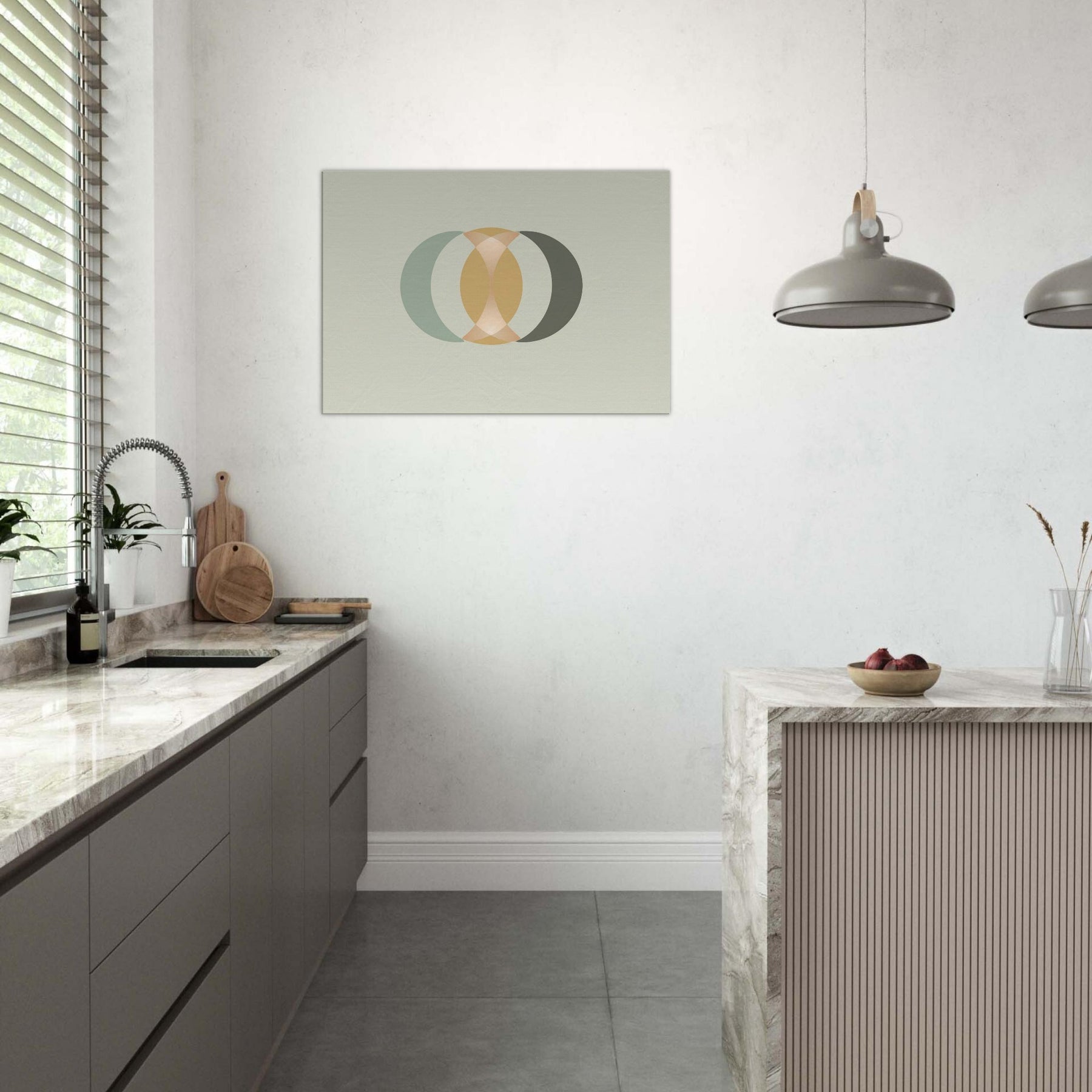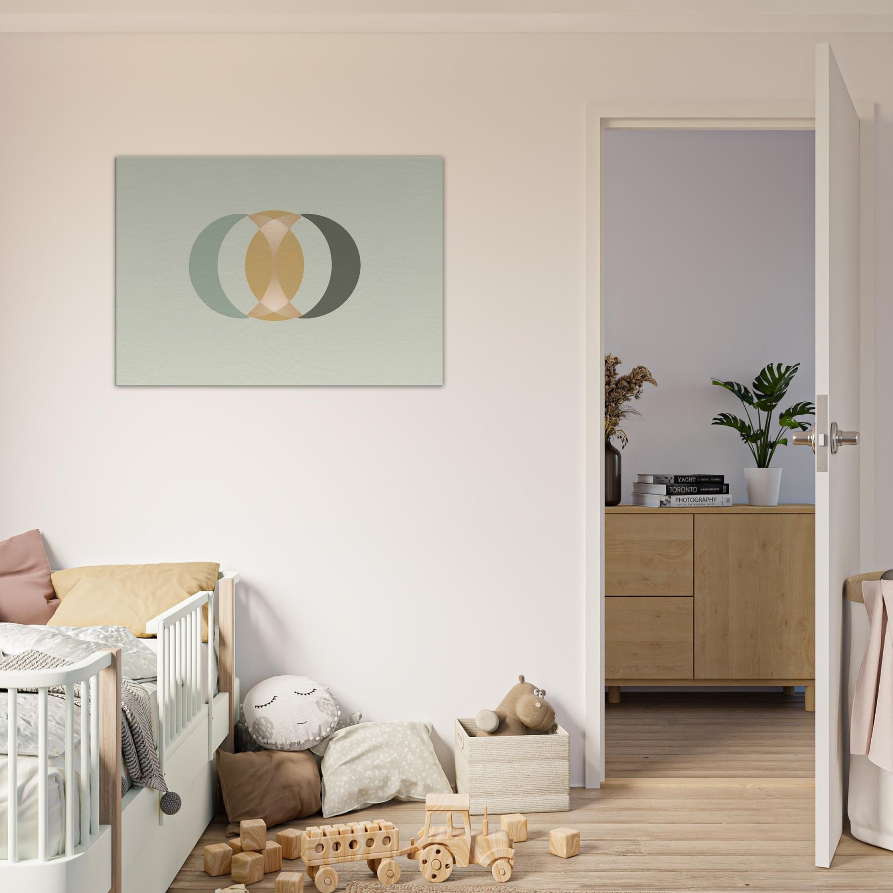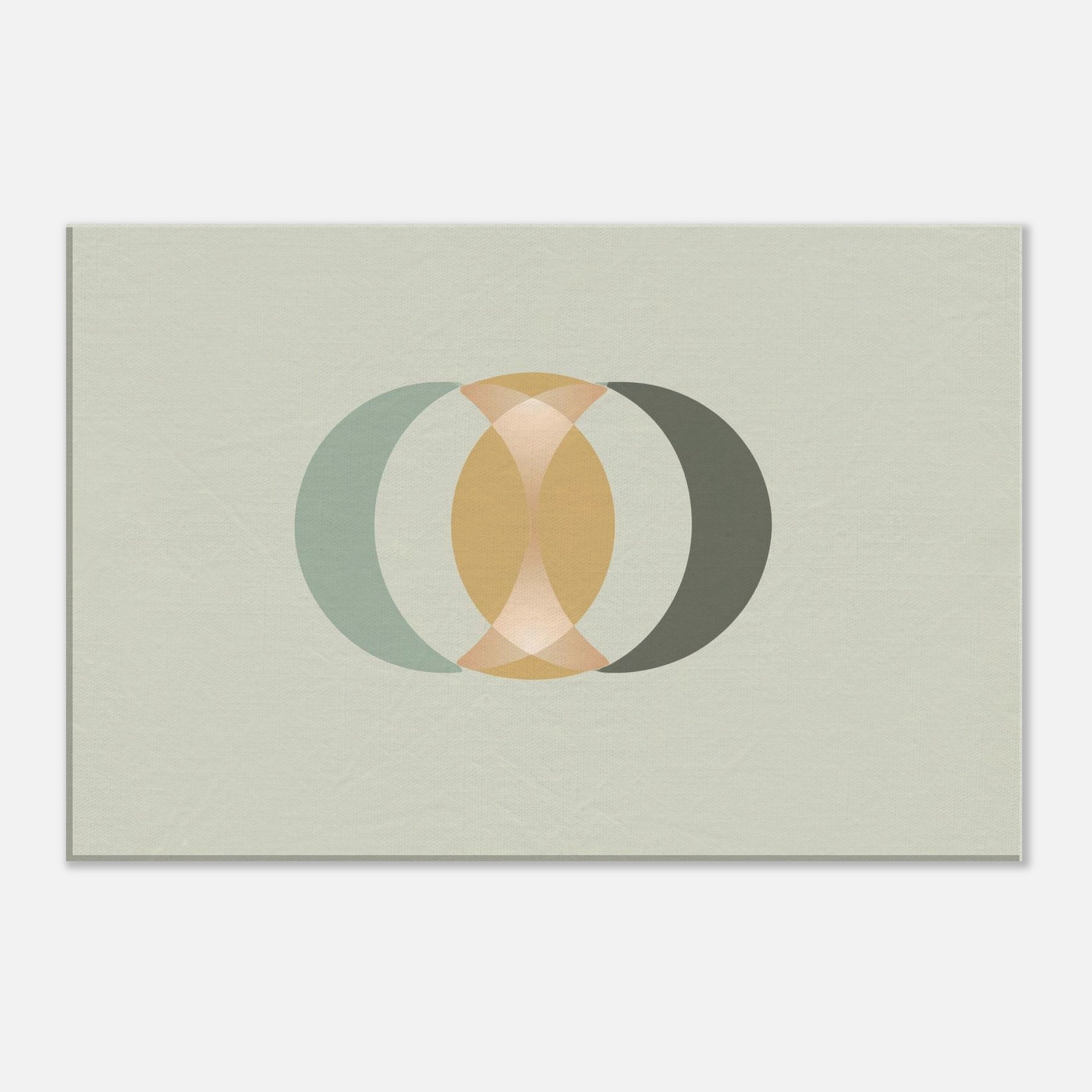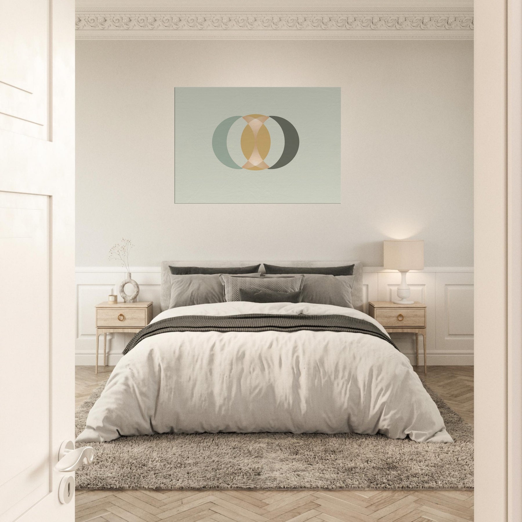 Immerse your space in the hush of the Triple Moon, where three arcs intersect to form a soft, radiant core. This minimalist composition speaks with quiet gravity: pale ochre, sage, and shadowed charcoal drift like a breath over a calm evening. The artwork creates a luminous center that invites reflection, turning a wall into a contemplative window. Perfect for a living room or bedroom, it soothes with balance and subtle warmth, enhancing calm, focus, and dreamy conversation.
