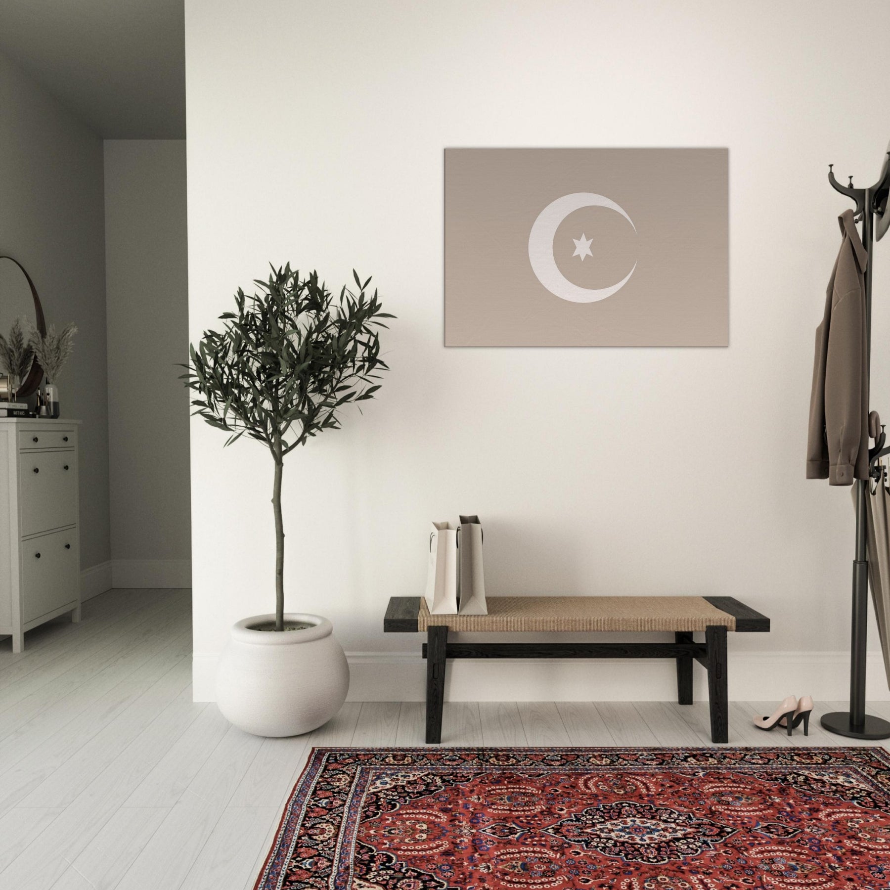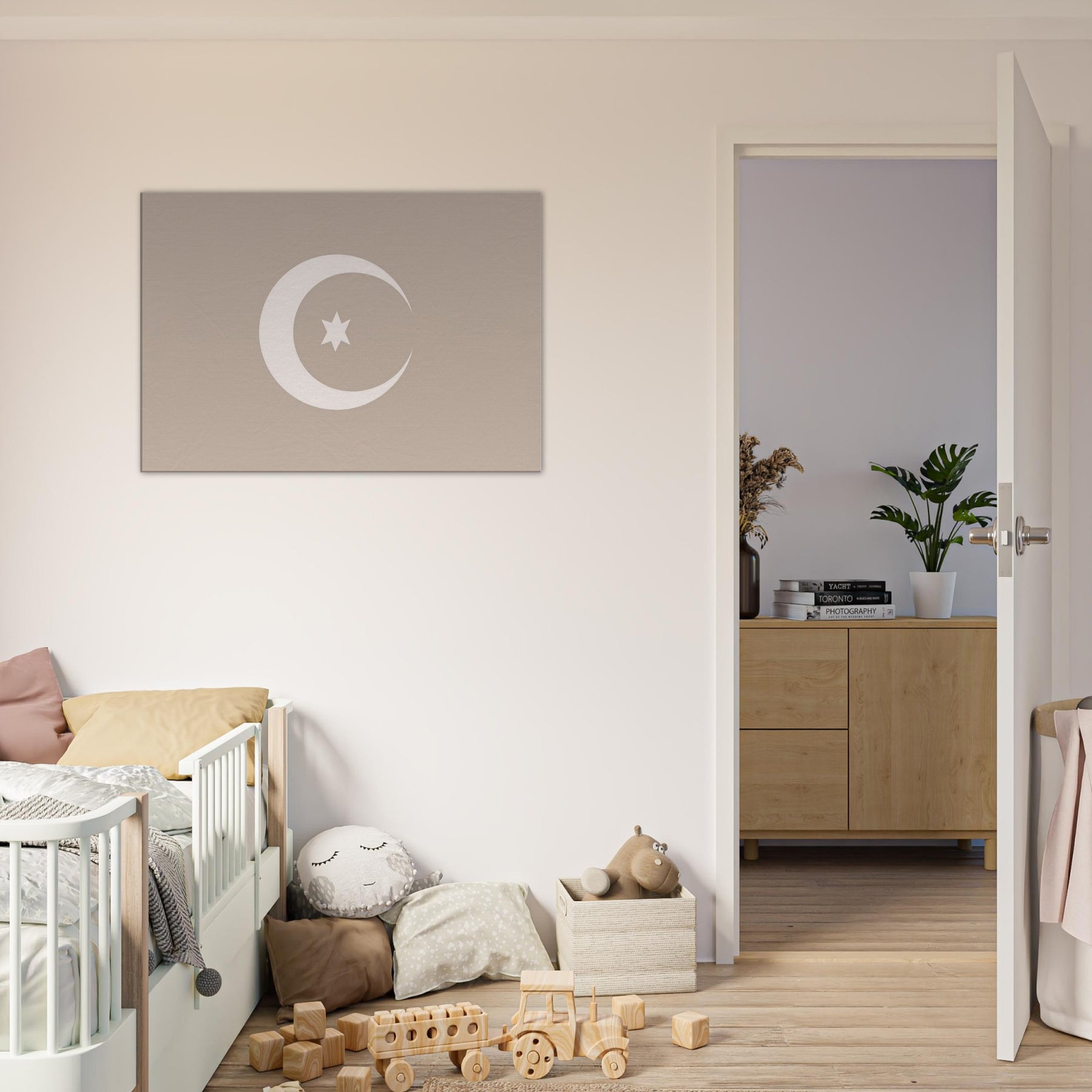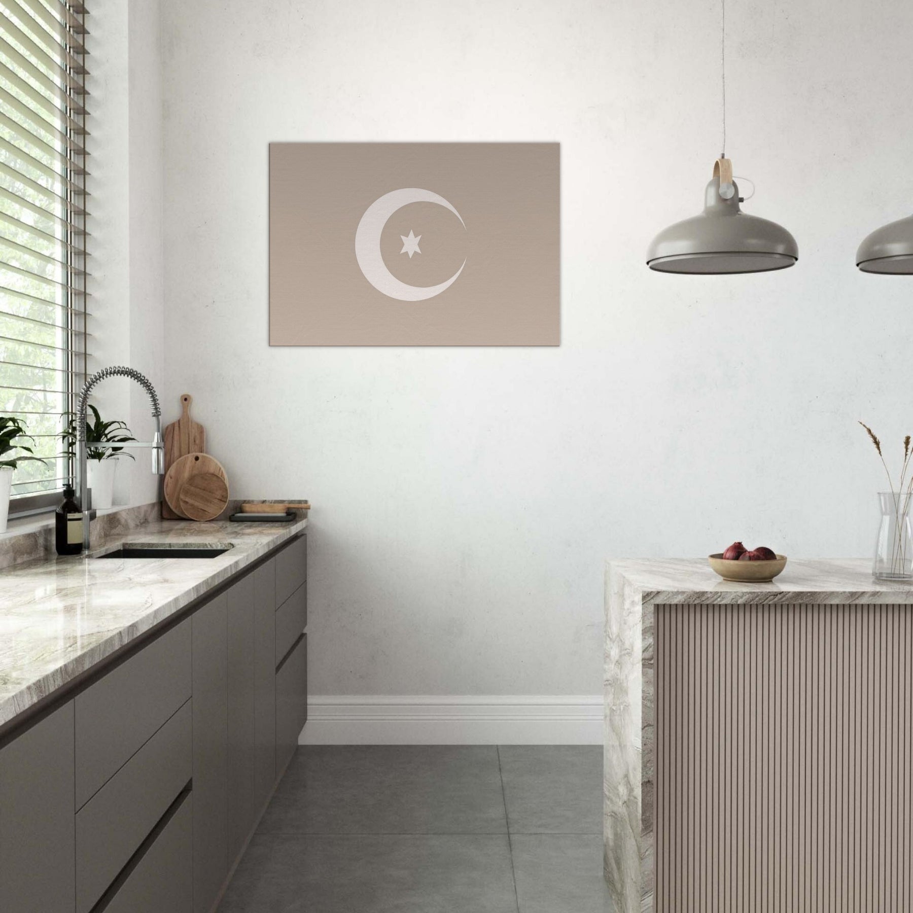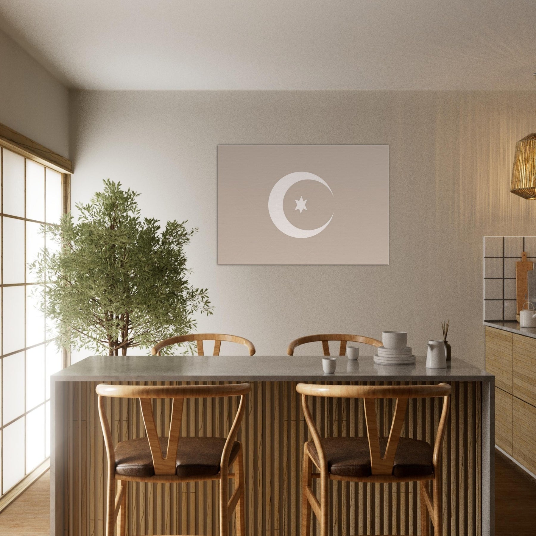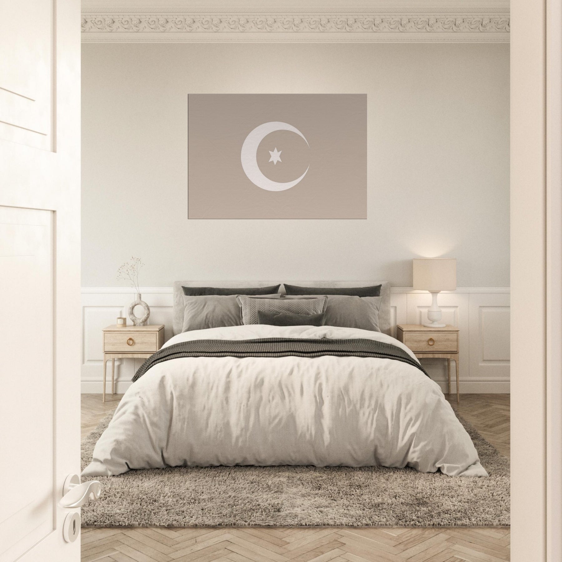 Immerse your room in quiet radiance with Crescent & Star (Minimal) a whisper of light softened into clean lines. This mystical composition invites contemplation, casting a serene glow that pairs with warm woods or cool neutrals. The gentle arc and solitary star suggest midnight horizons, offering a calming focal point that elevates a living room, bedroom, or study. Framed in soft, earthy tones, it breathes balance and intention, turning empty walls into a sanctuary of stillness and refined wonder.