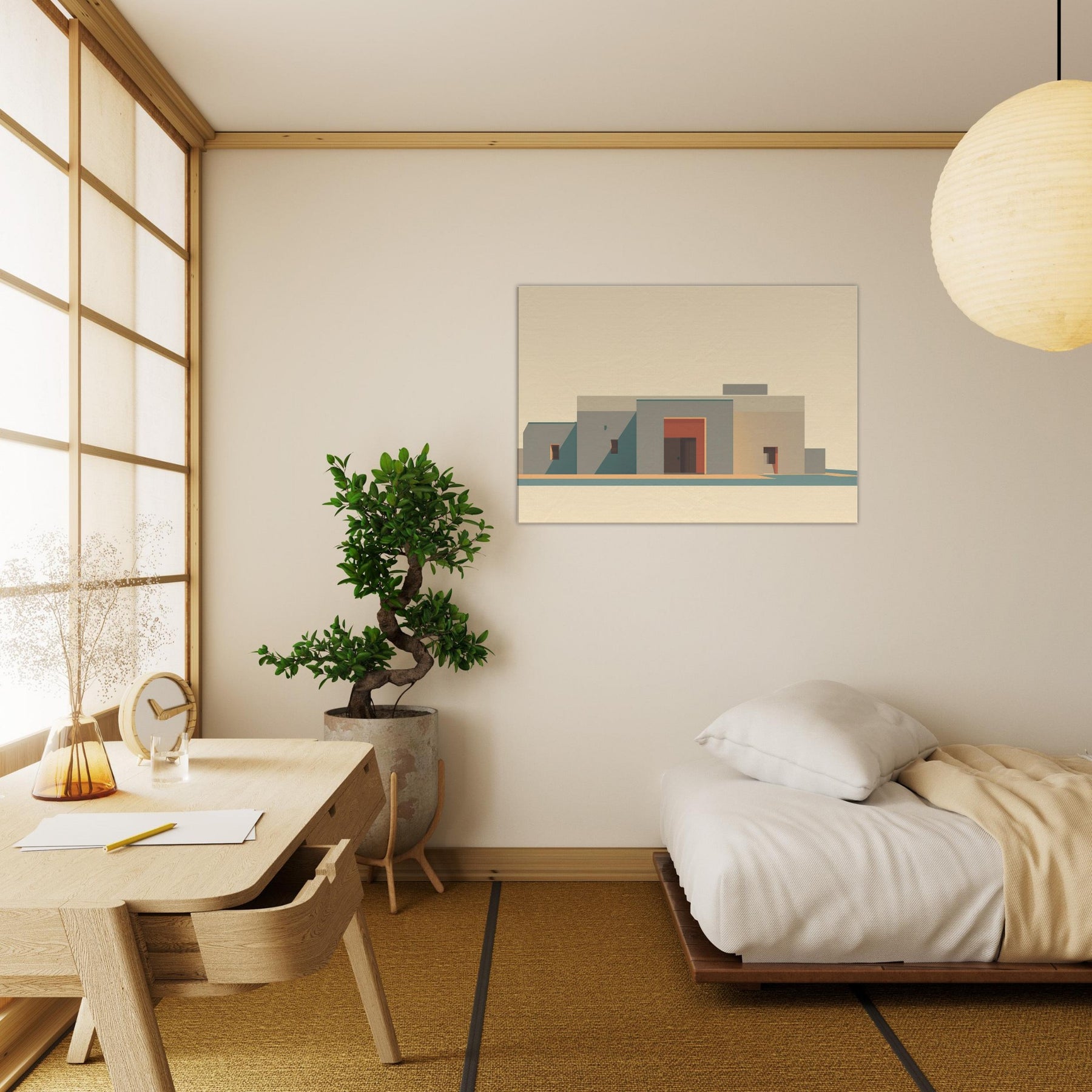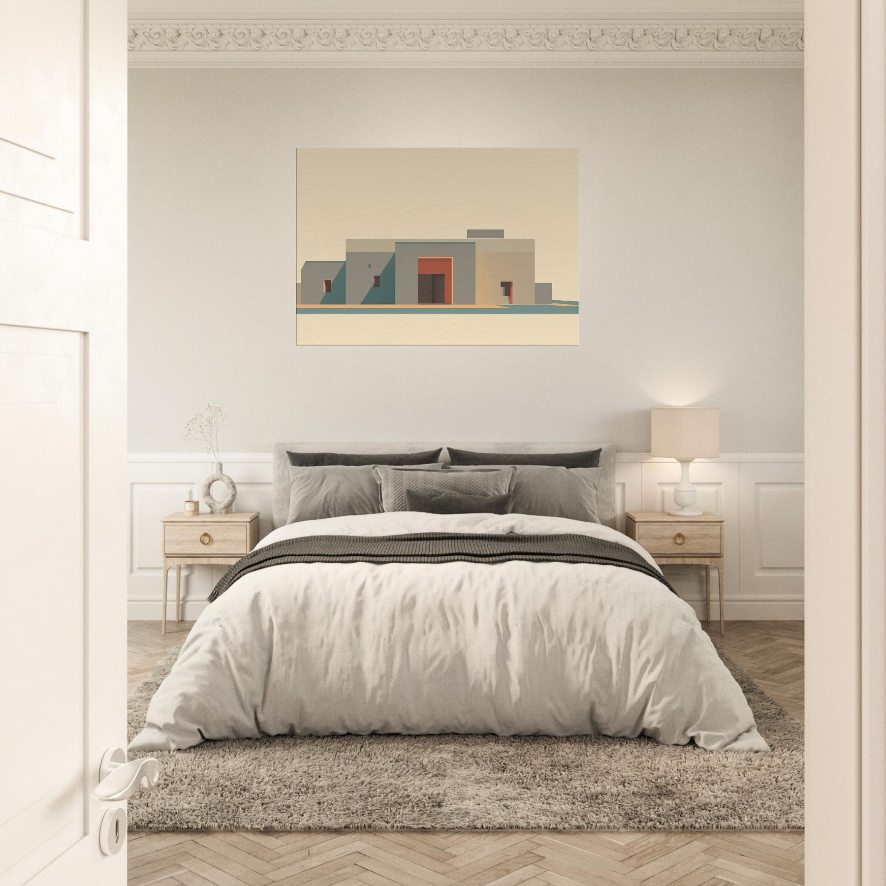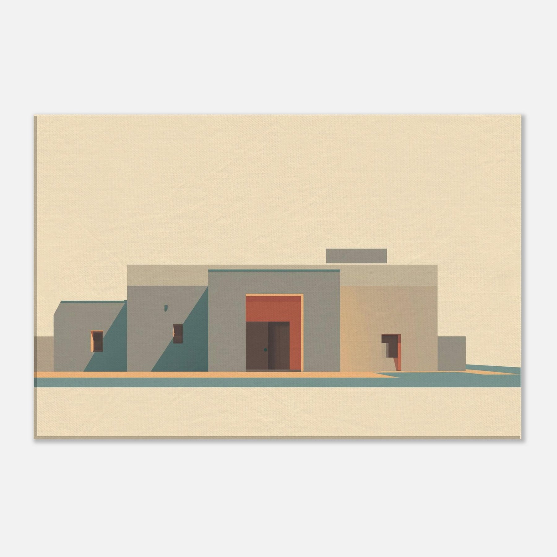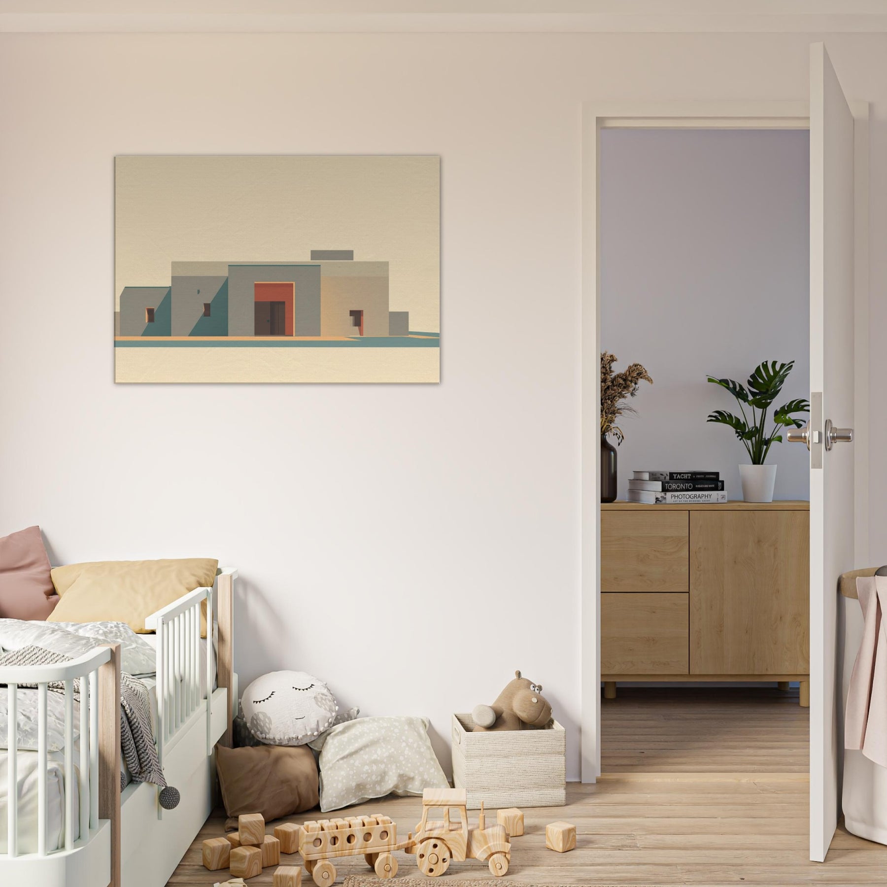 In soft, sun washed tones, a minimalist cityscape rises with quiet dignity. The planes of beige and sand, punctuated by a coral doorway, capture Marrakech's stillness at golden hour. The art invites clean lines, long shadows, and a sense of open sky, turning a living room wall into a calm courtyard. It adds warmth without clutter, like a breeze y afternoon in the medina, where color and form speak softly.