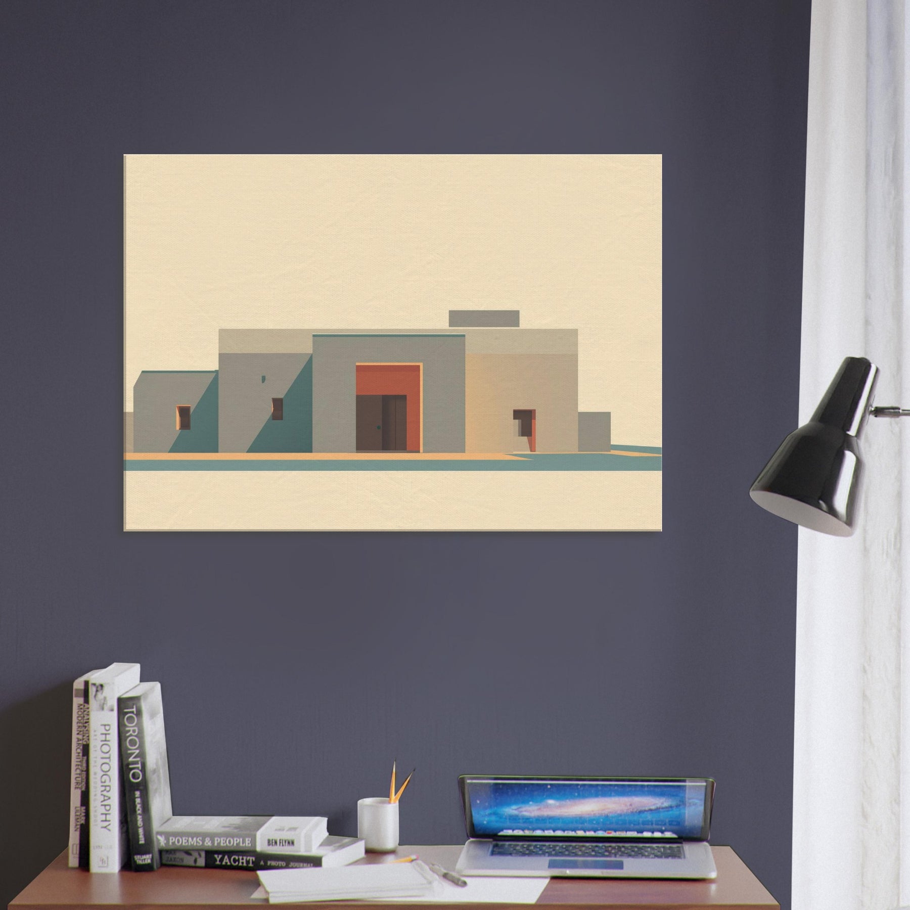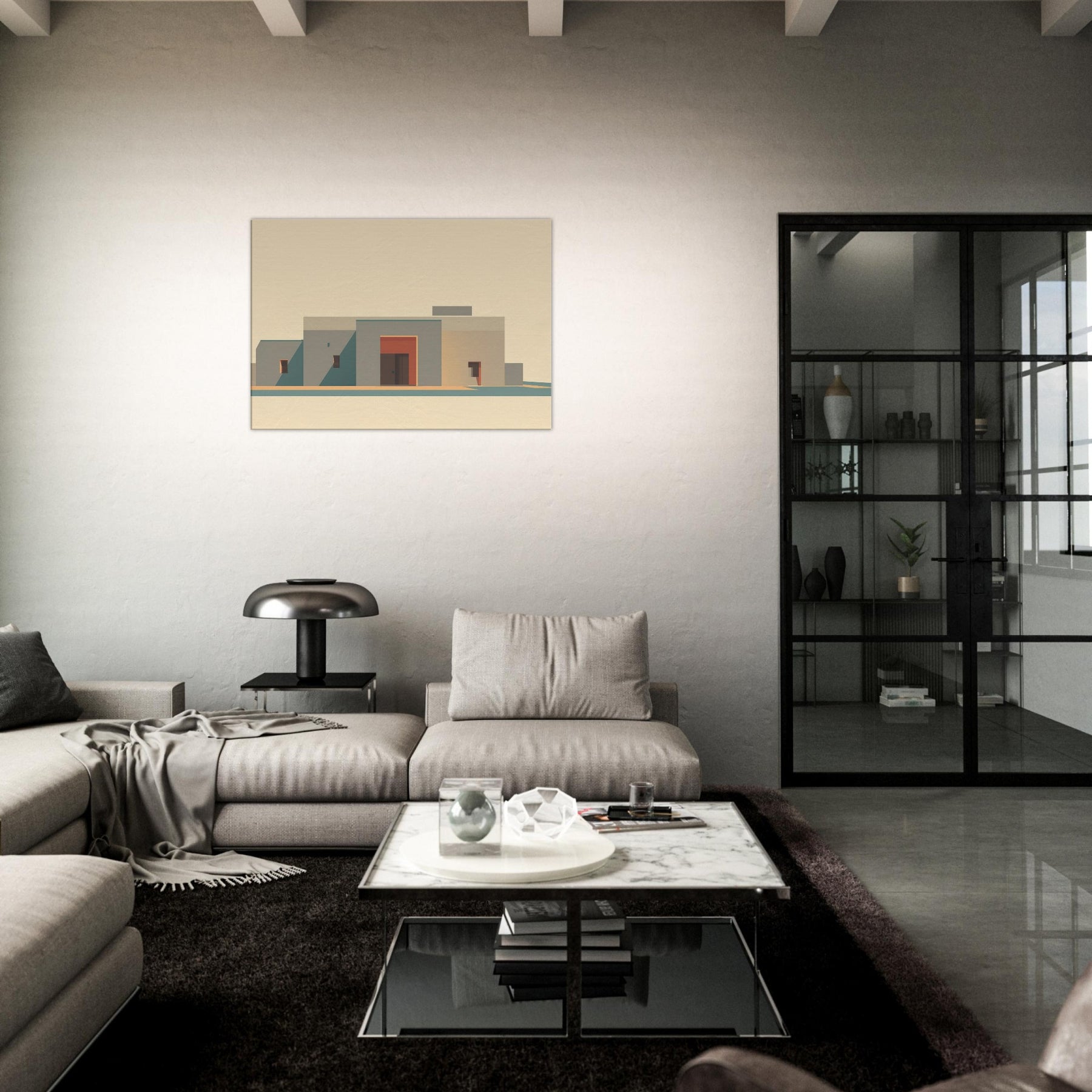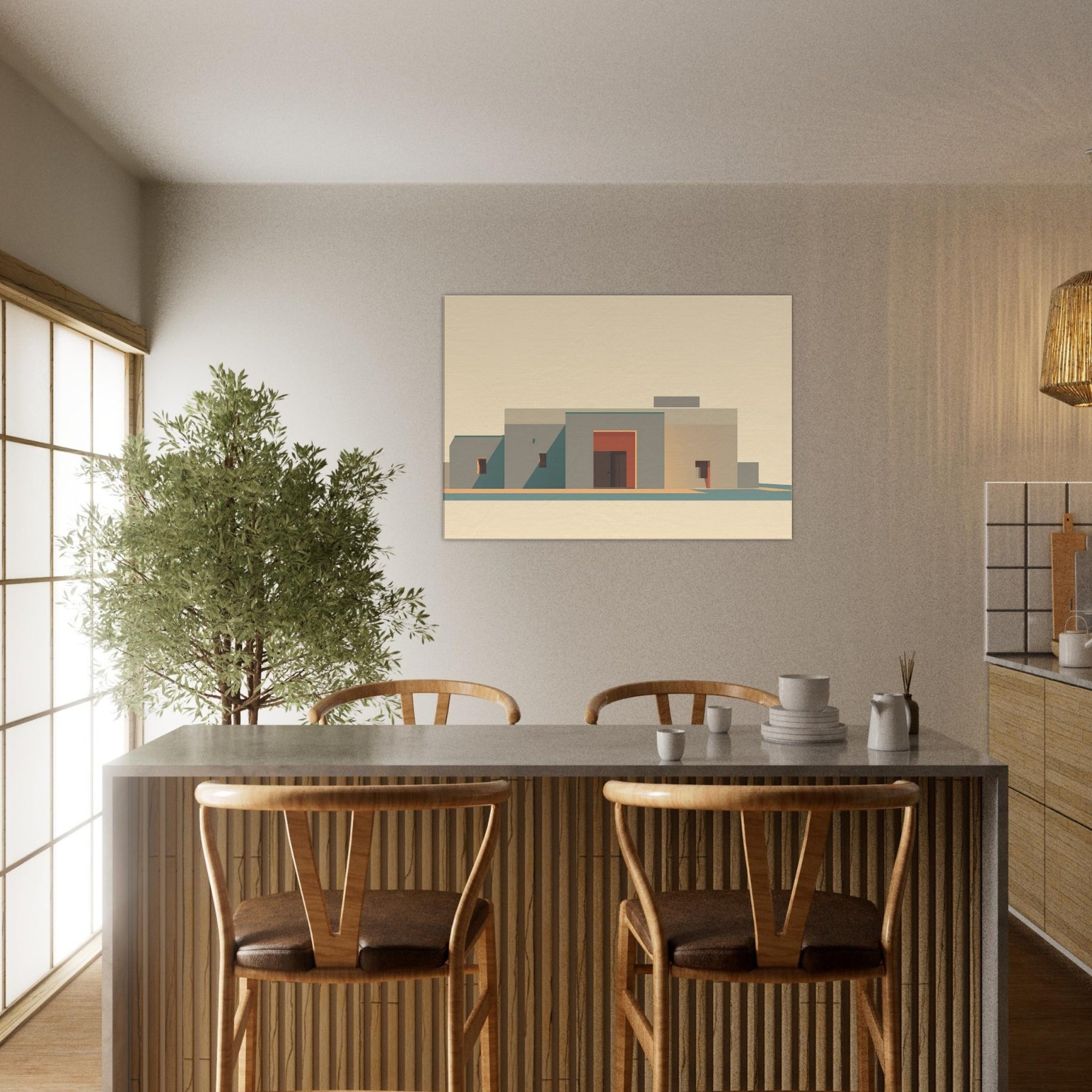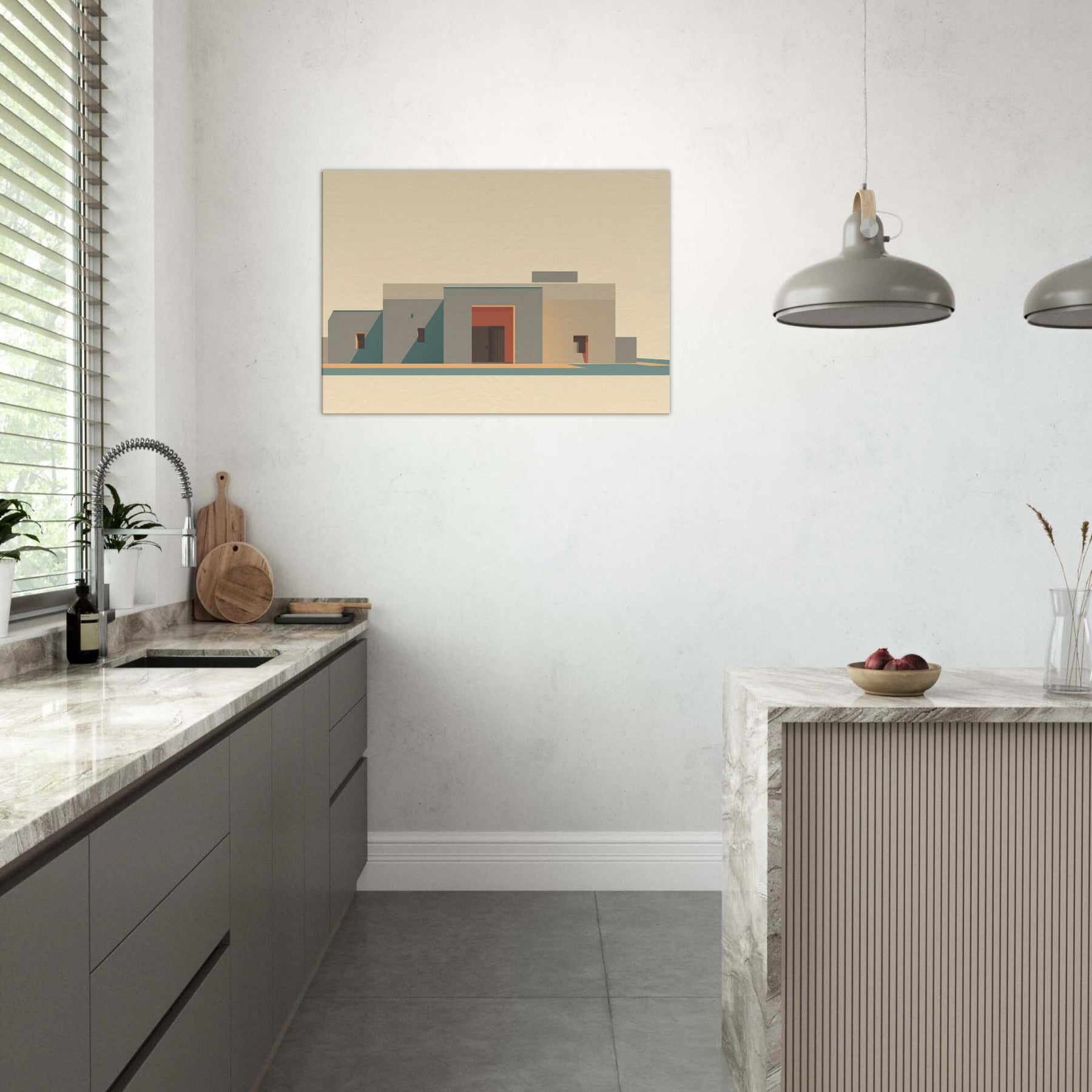 In soft, sun washed tones, a minimalist cityscape rises with quiet dignity. The planes of beige and sand, punctuated by a coral doorway, capture Marrakech's stillness at golden hour. The art invites clean lines, long shadows, and a sense of open sky, turning a living room wall into a calm courtyard. It adds warmth without clutter, like a breeze y afternoon in the medina, where color and form speak softly.
