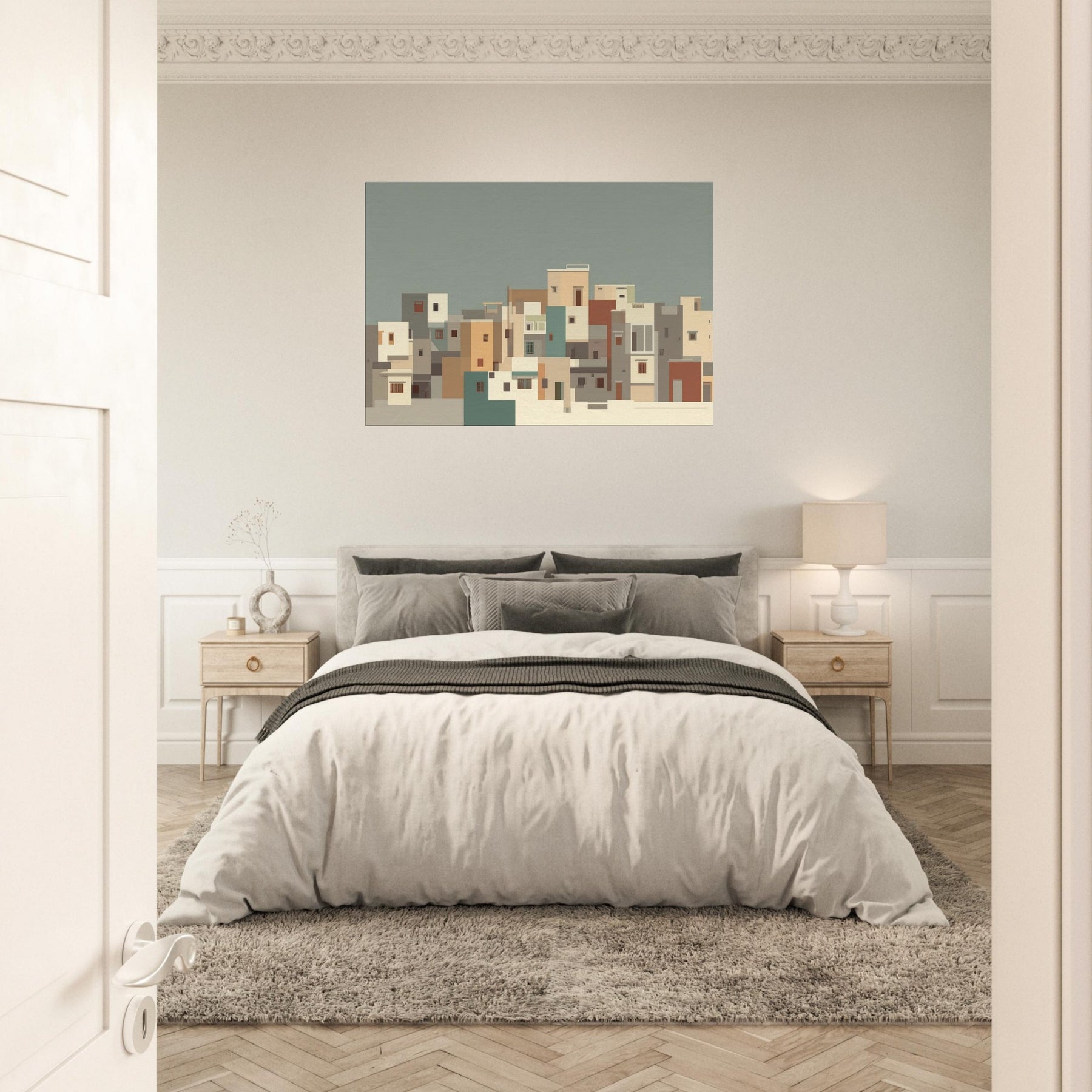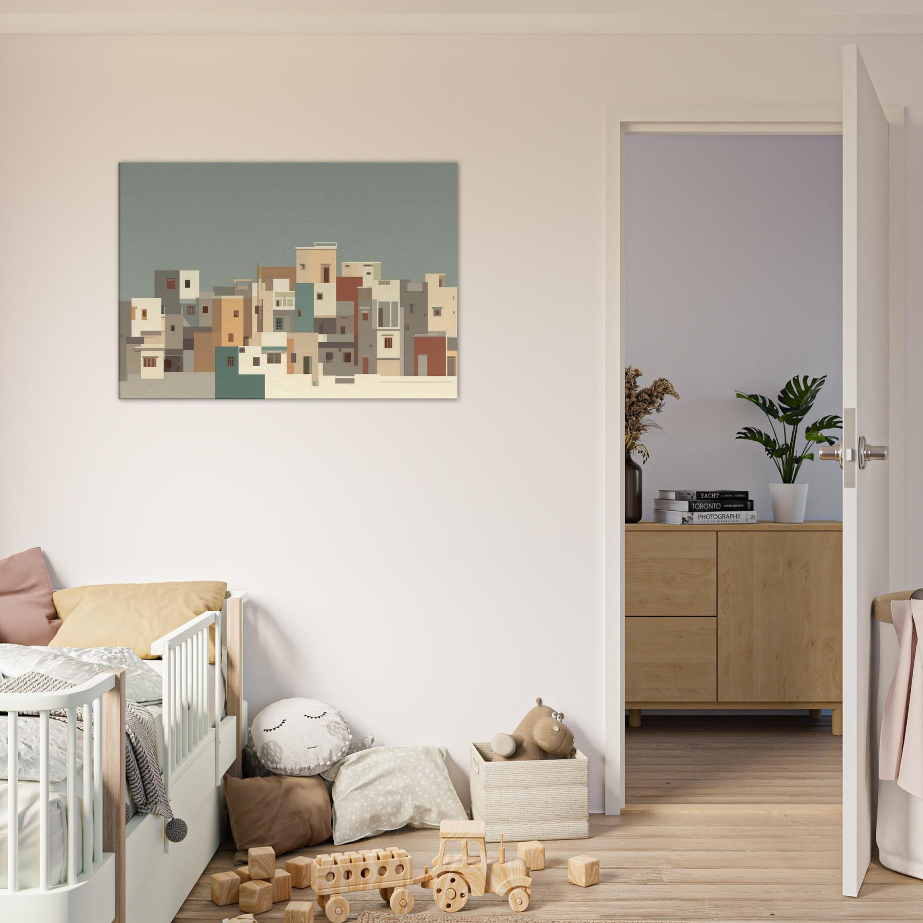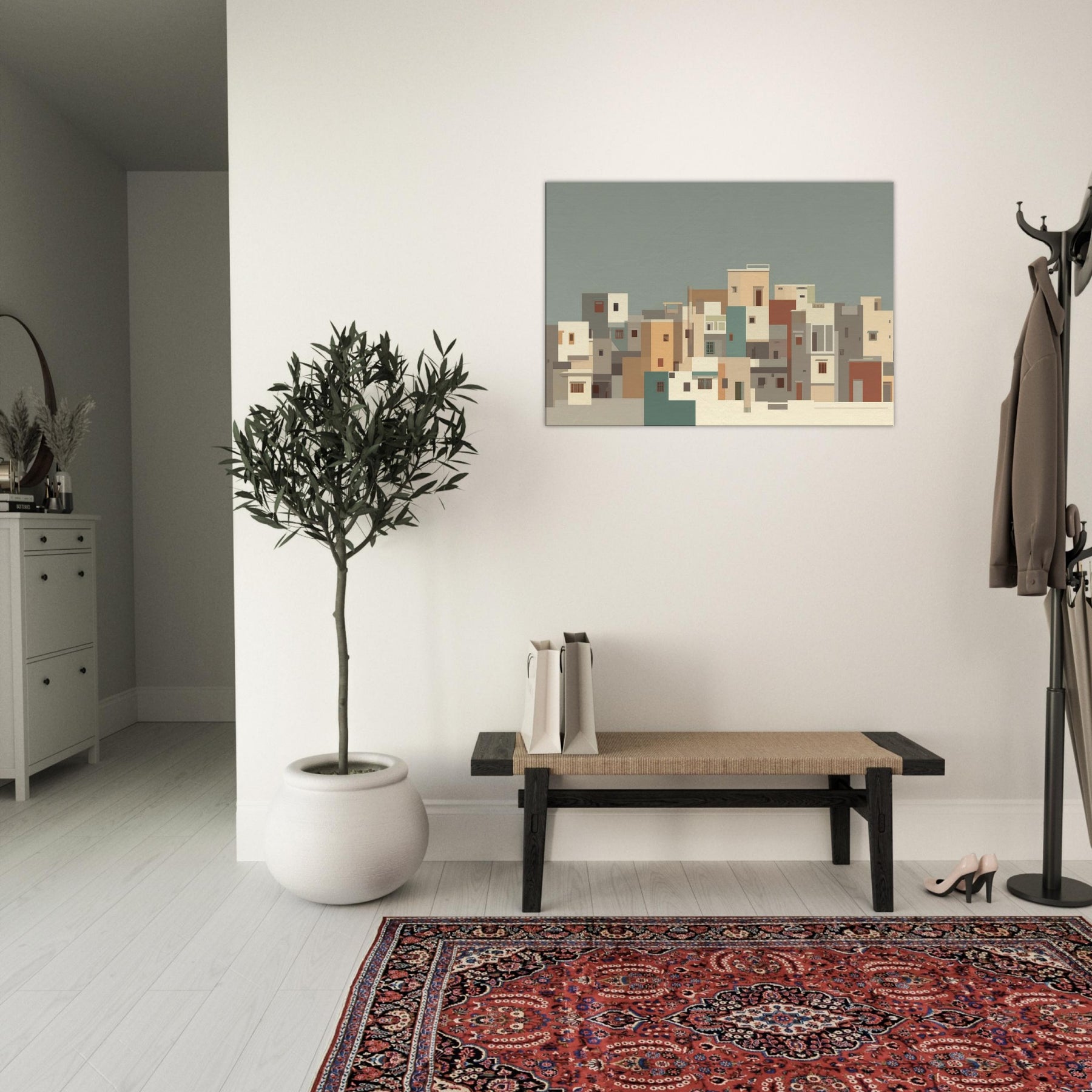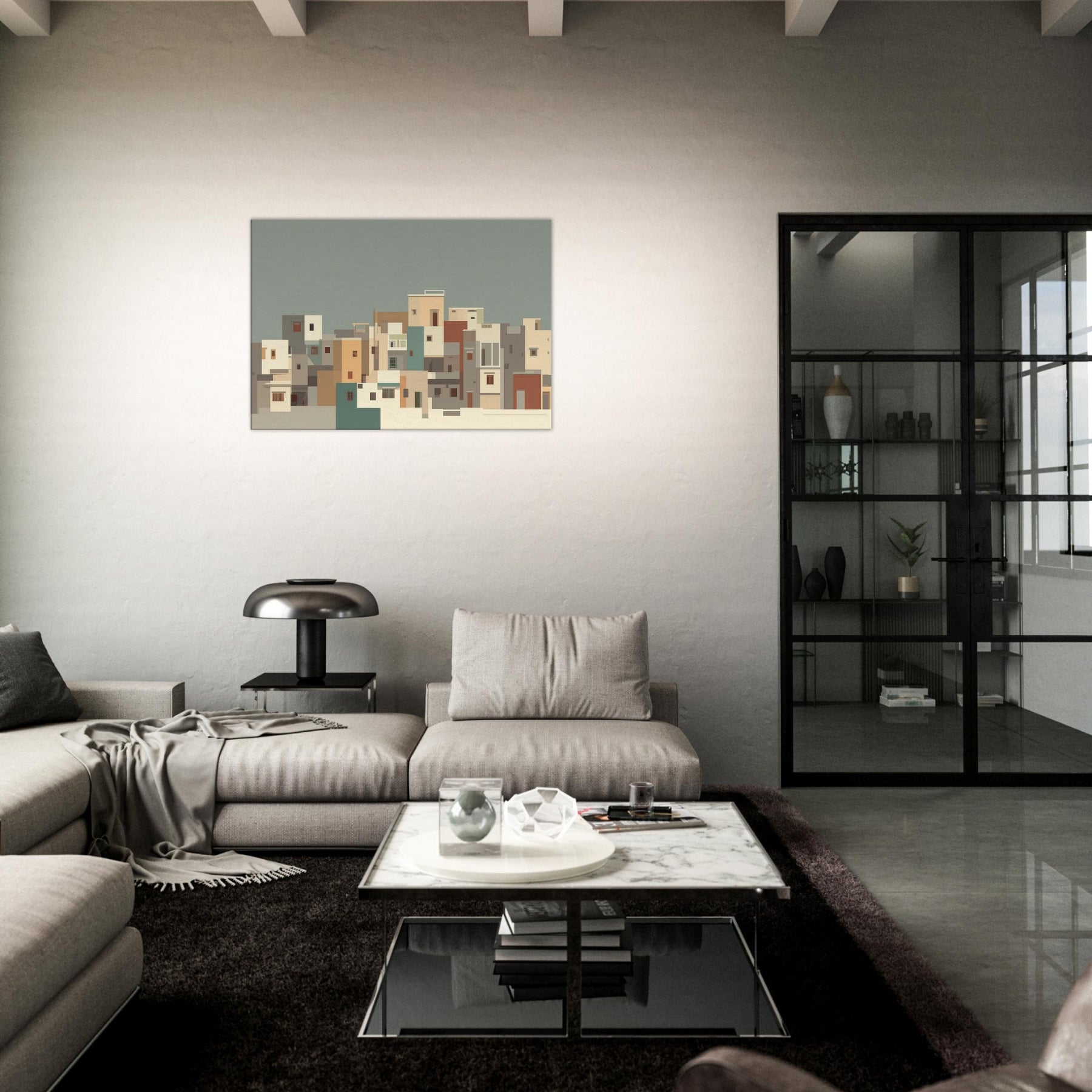 Marrakech distilled into a serene skyline of blocks and quiet color, this minimalist study of urban light breathes calm into any room. The soft terracotta, sand, and sage tones feel like sun warmed walls, while precise geometry suggests memory and movement without noise. As a living space piece, it anchors the space with elegance and restraint, inviting stillness, reflection, and a touch of distant souk energy. A subtle backdrop that enhances conversation and daily rituals alike, without overpowering.
