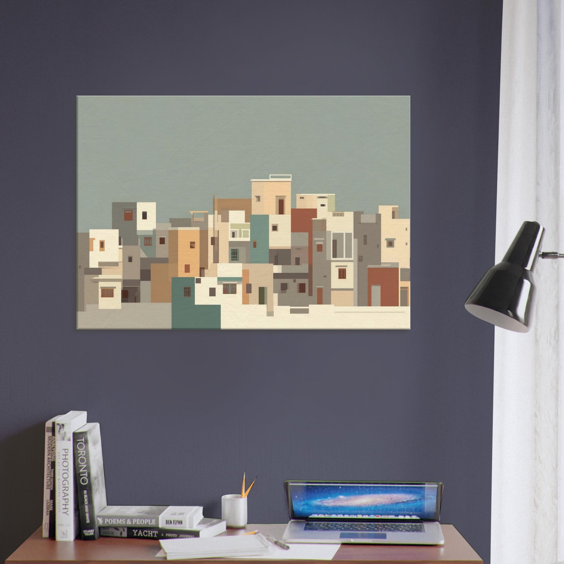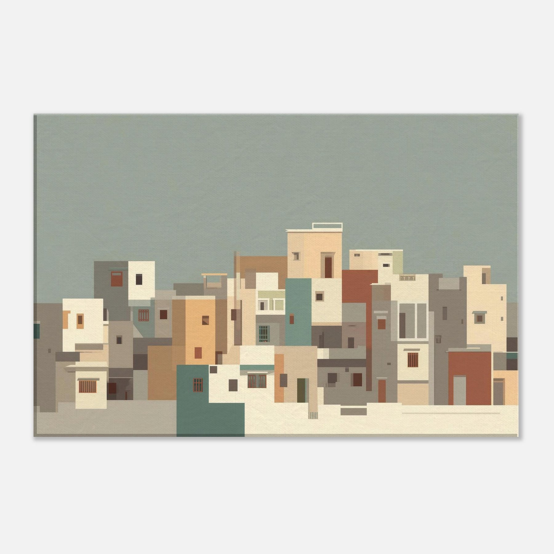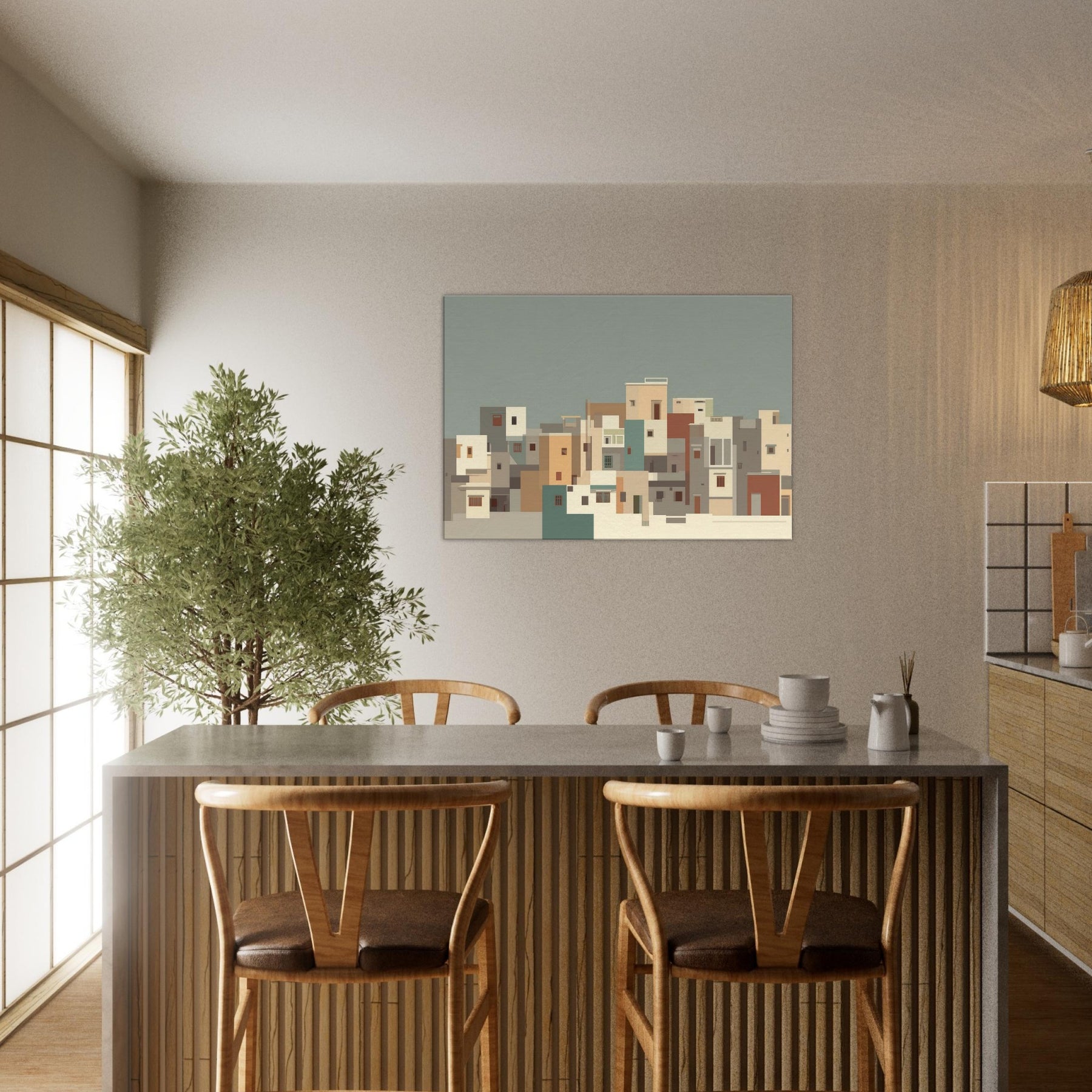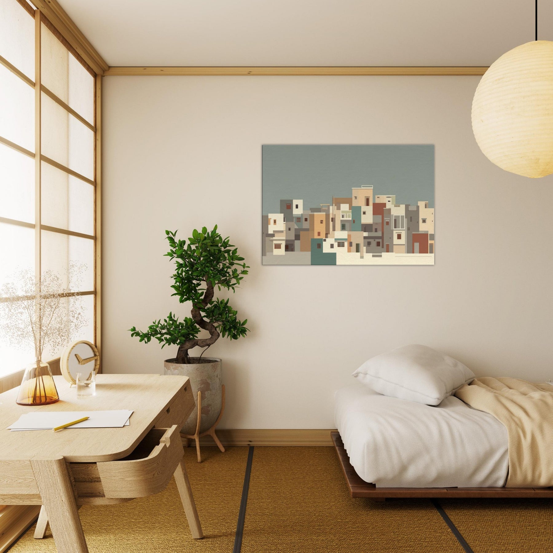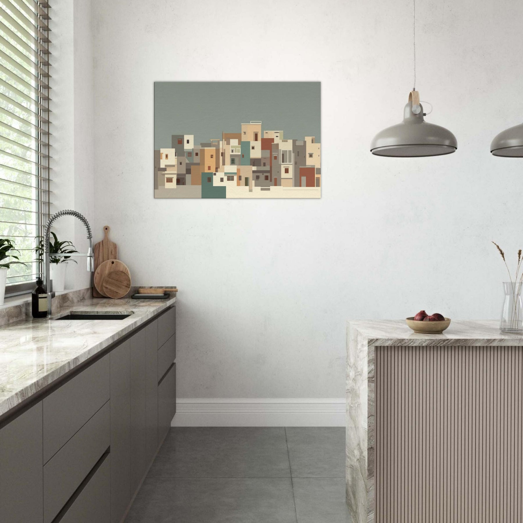 Marrakech distilled into a serene skyline of blocks and quiet color, this minimalist study of urban light breathes calm into any room. The soft terracotta, sand, and sage tones feel like sun warmed walls, while precise geometry suggests memory and movement without noise. As a living space piece, it anchors the space with elegance and restraint, inviting stillness, reflection, and a touch of distant souk energy. A subtle backdrop that enhances conversation and daily rituals alike, without overpowering.
