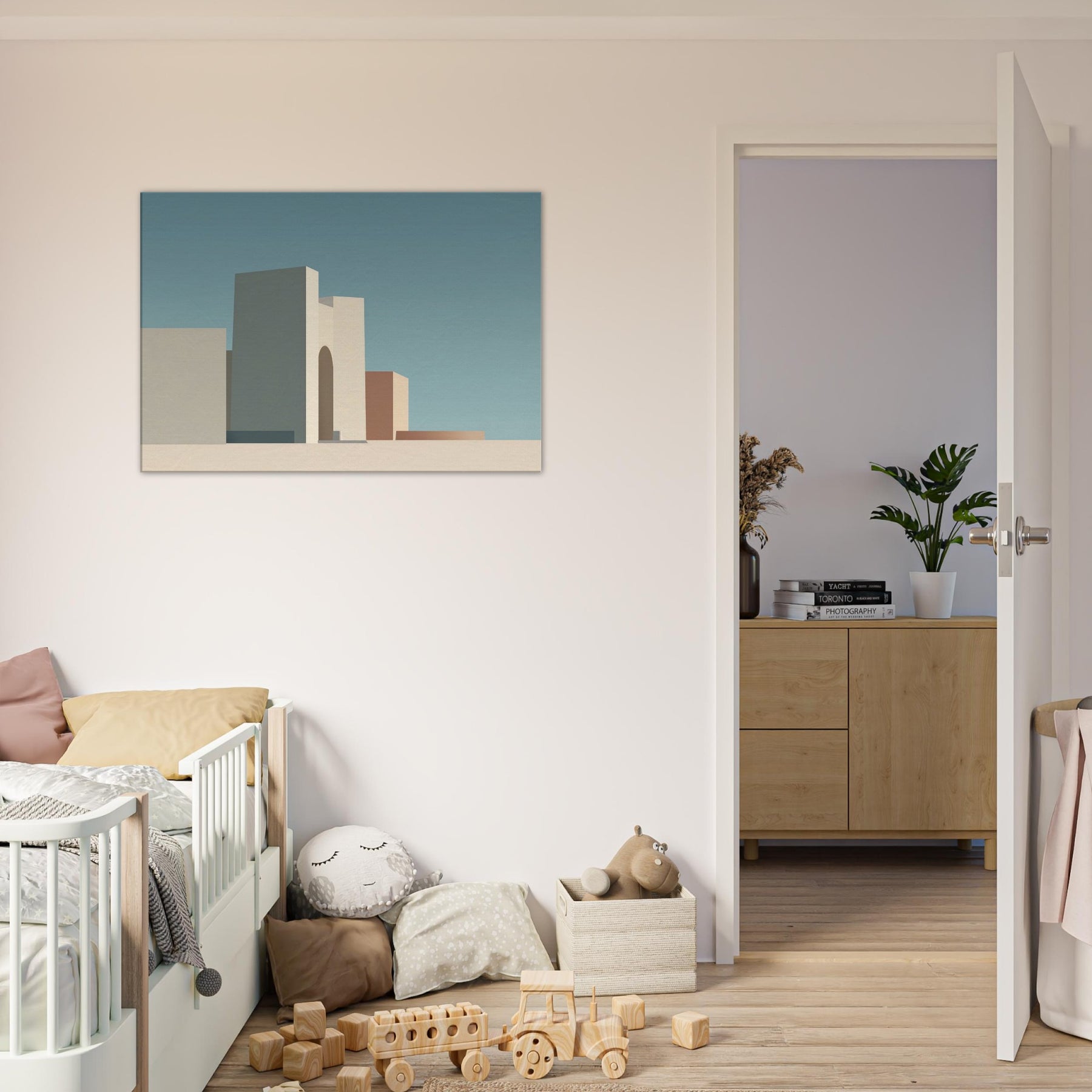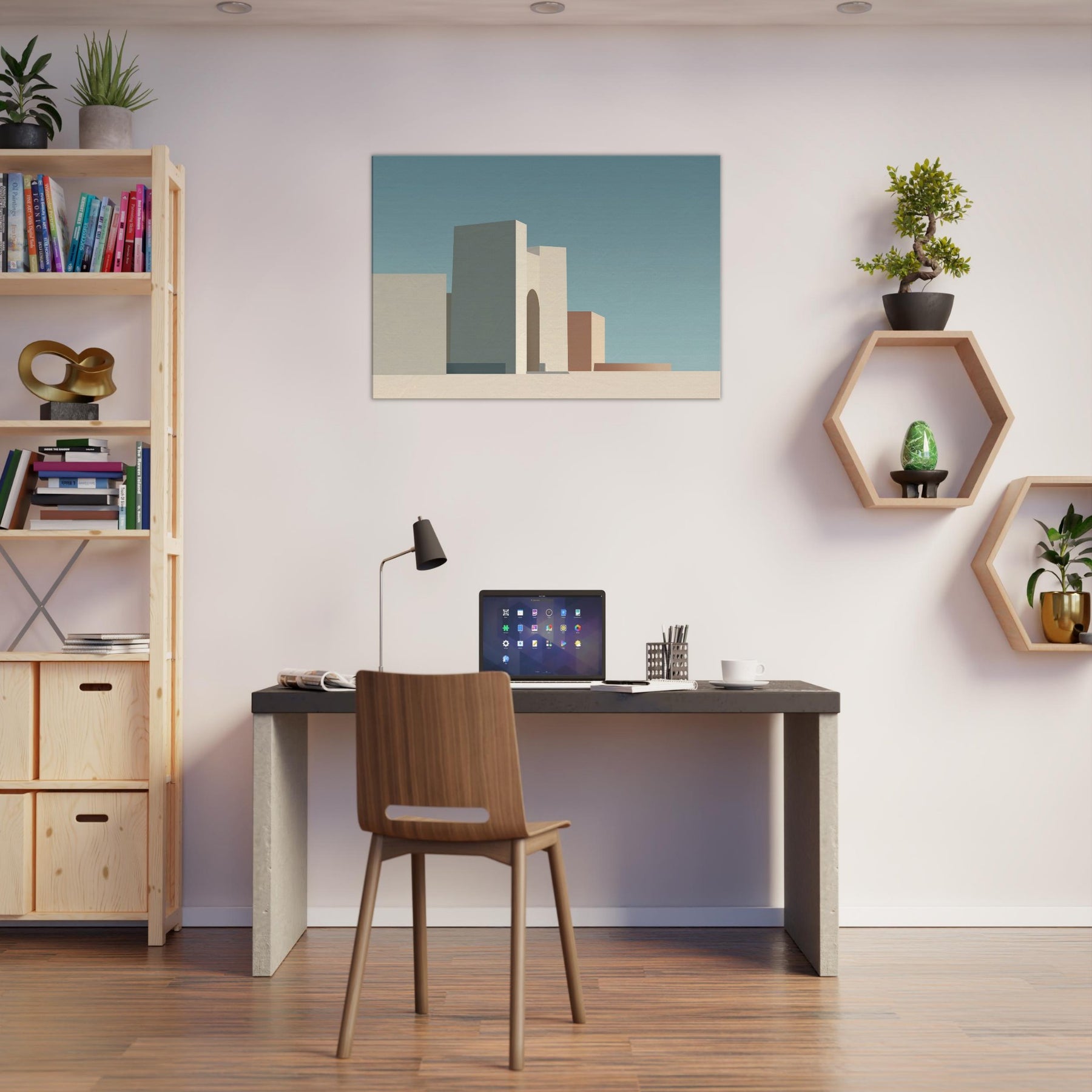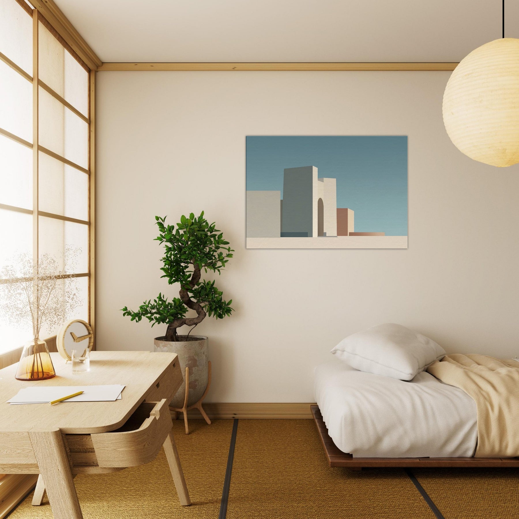 Moon Gate Horizon invites the eye into a calm urban silhouette where form meets light. This minimalist composition reduces a city’s architecture to clean blocks and a single arched passage, bathed in desert quiet tones that soften walls and edges. The result is a contemplative breeze of space and stillness, ideal for a living room or study seeking balance. Hang it to anchor a coastal or metropolitan mood, letting the Moon Gate become a quiet portal between everyday life and imagined skylines.
