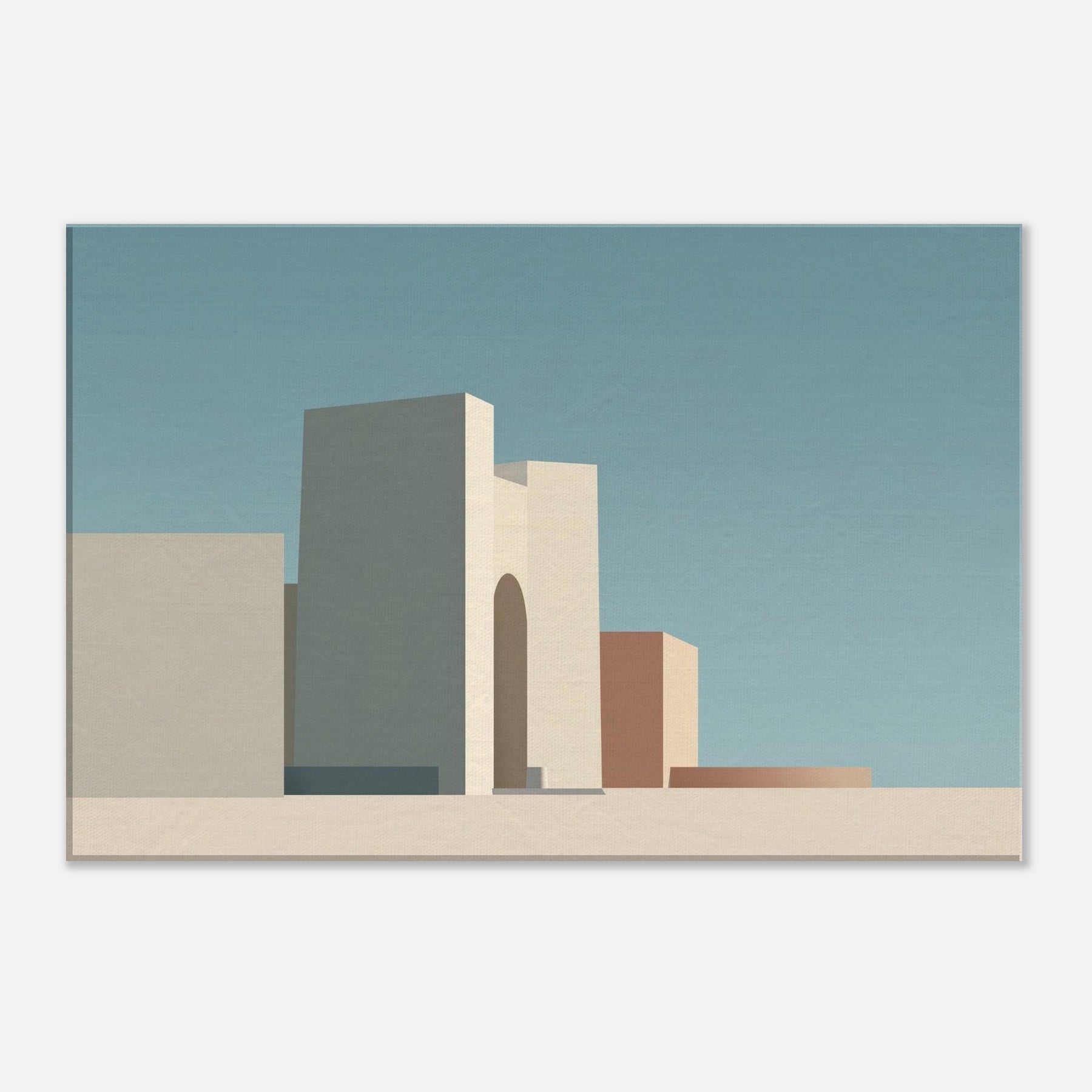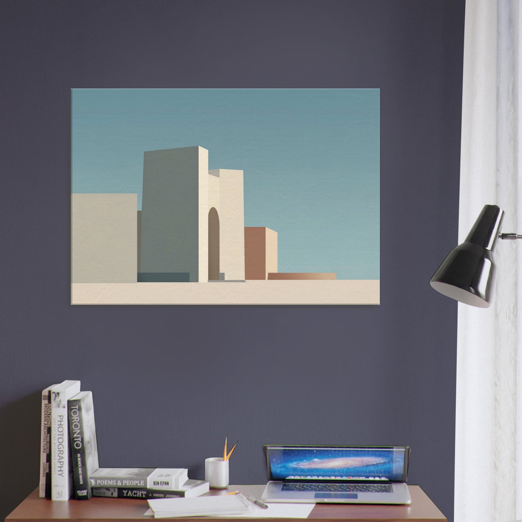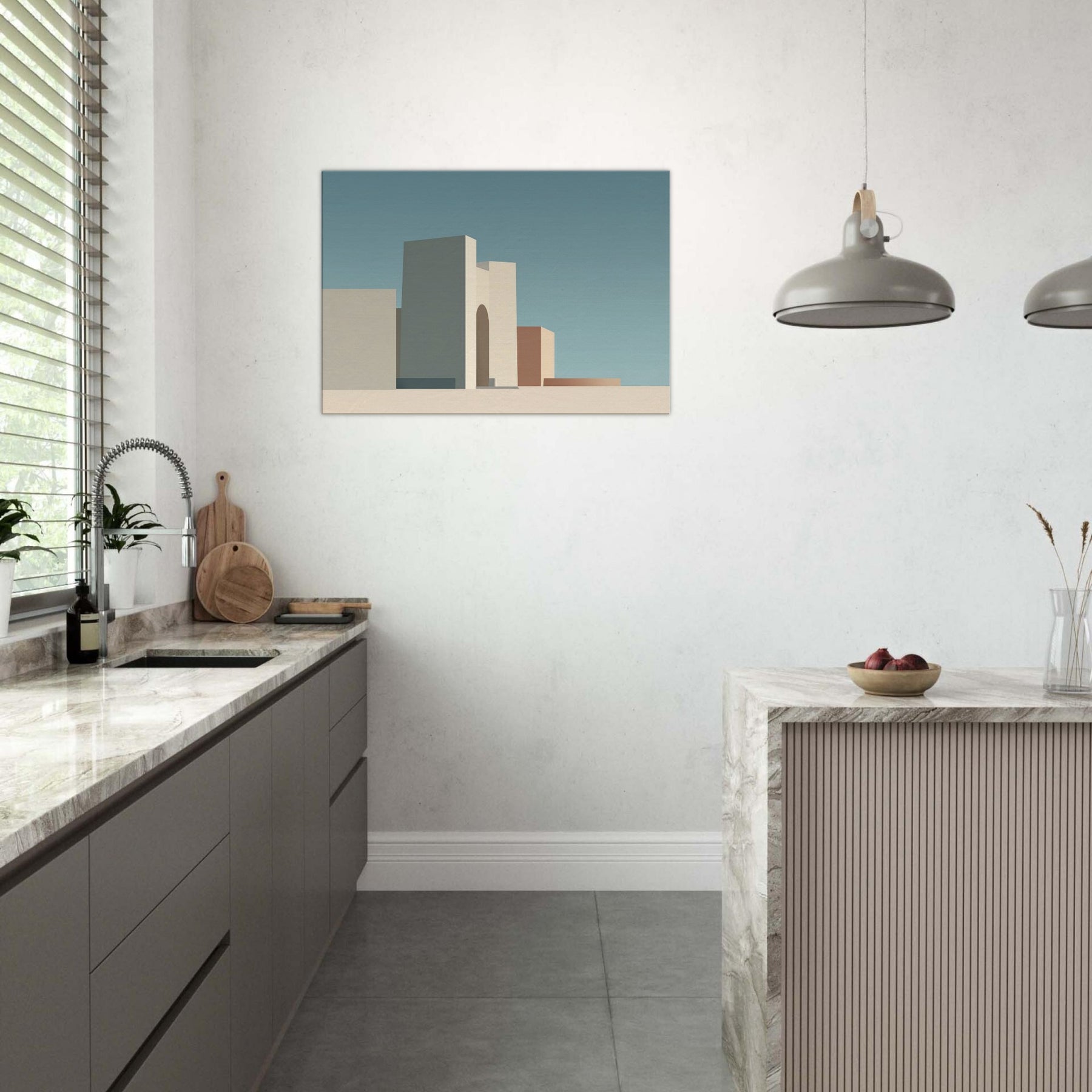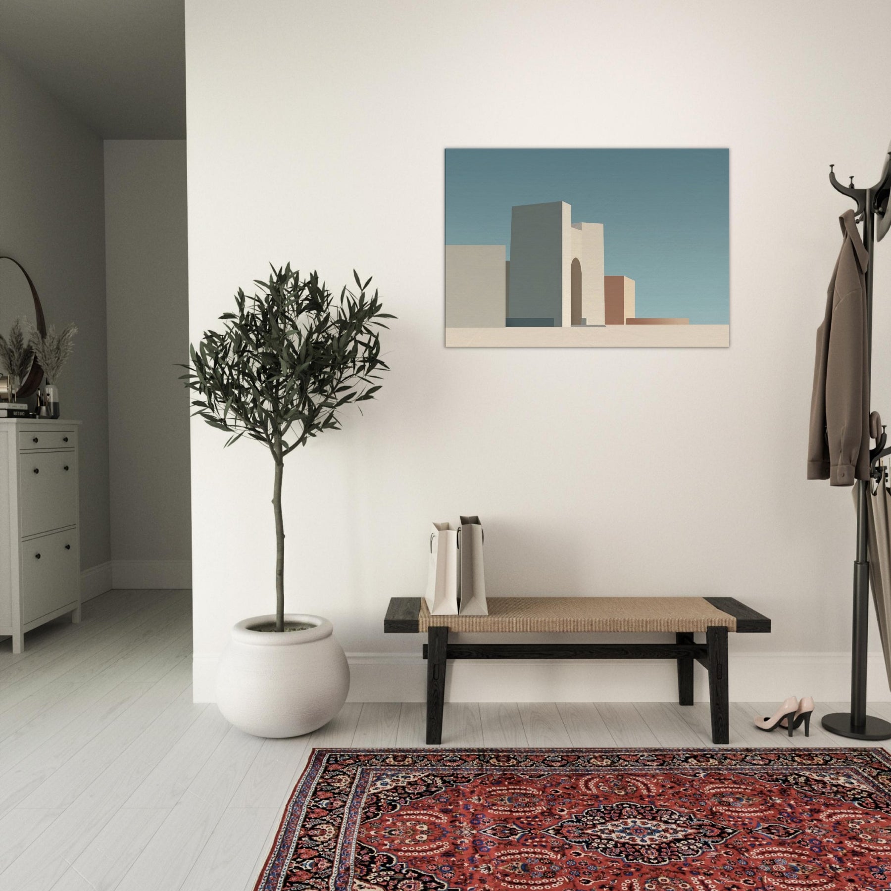 Moon Gate Horizon invites the eye into a calm urban silhouette where form meets light. This minimalist composition reduces a city’s architecture to clean blocks and a single arched passage, bathed in desert quiet tones that soften walls and edges. The result is a contemplative breeze of space and stillness, ideal for a living room or study seeking balance. Hang it to anchor a coastal or metropolitan mood, letting the Moon Gate become a quiet portal between everyday life and imagined skylines.