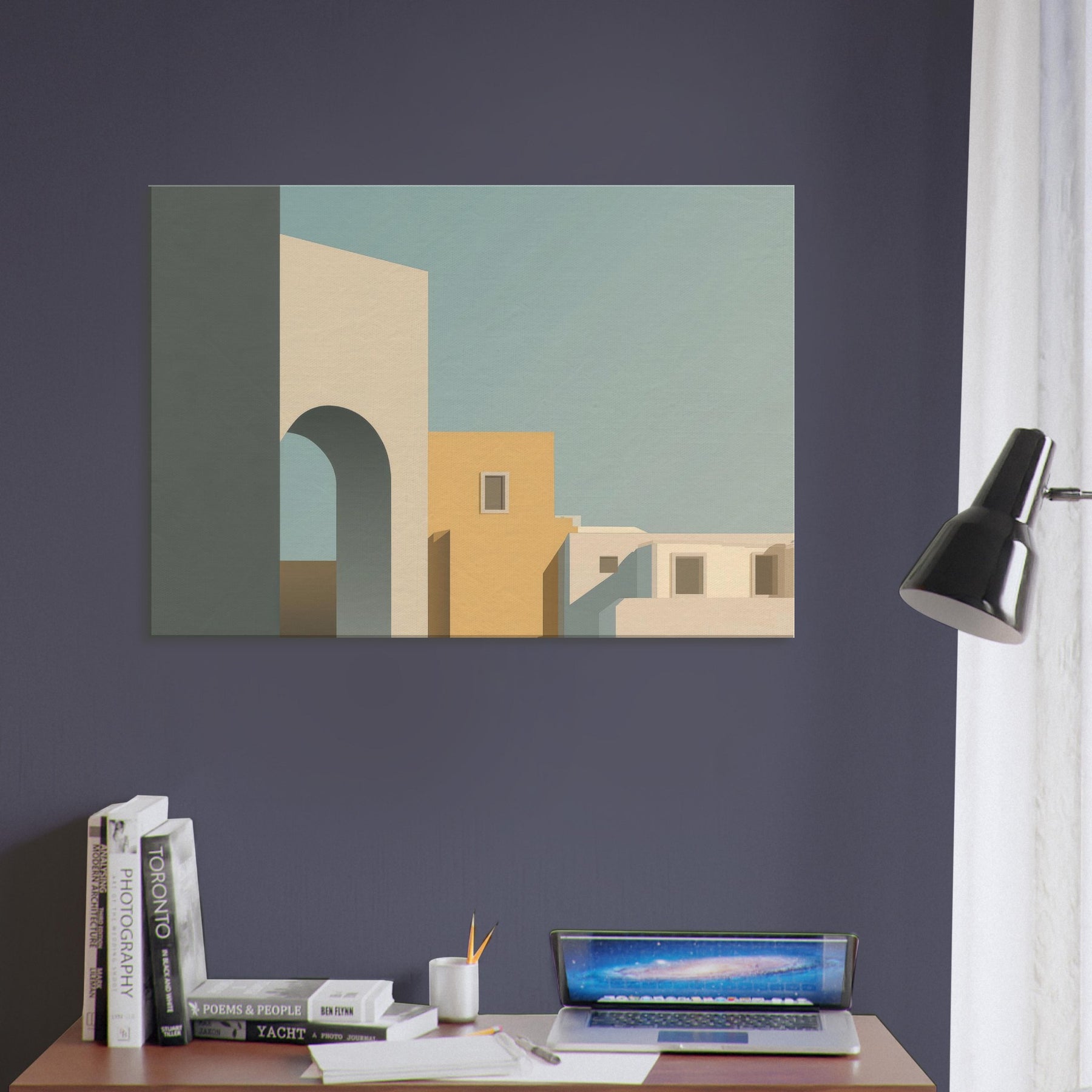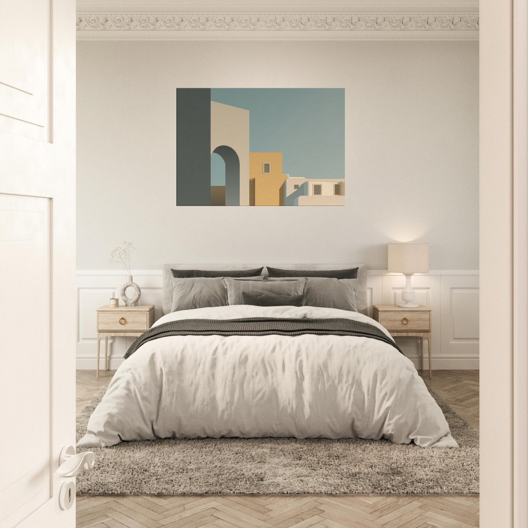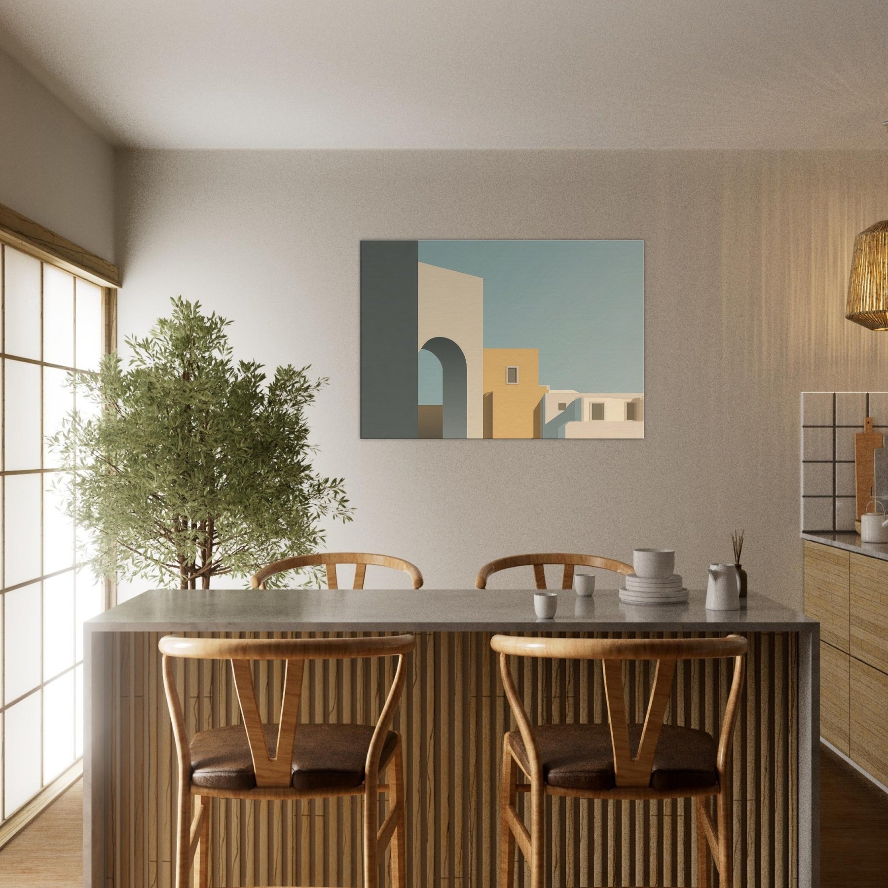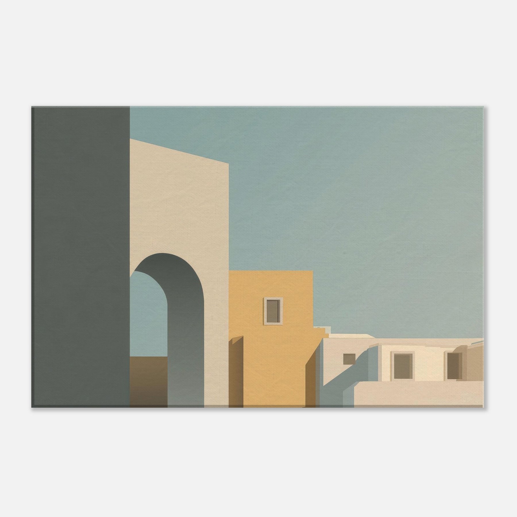 In its quiet geometry, Moon Gate opens a harbor of stillness for any room. The minimalist composition layers simple blocks of cream, warm ochre, and cool blue shadows, suggesting an alley of city light at dusk. The arch invites the eye to drift toward soft horizons, while clean edges and generous negative space foster calm, focus, and conversation. Perfect above a sofa or in a study, it invites a gentle pause and elevates the everyday with a sculptural, architectural poetry.