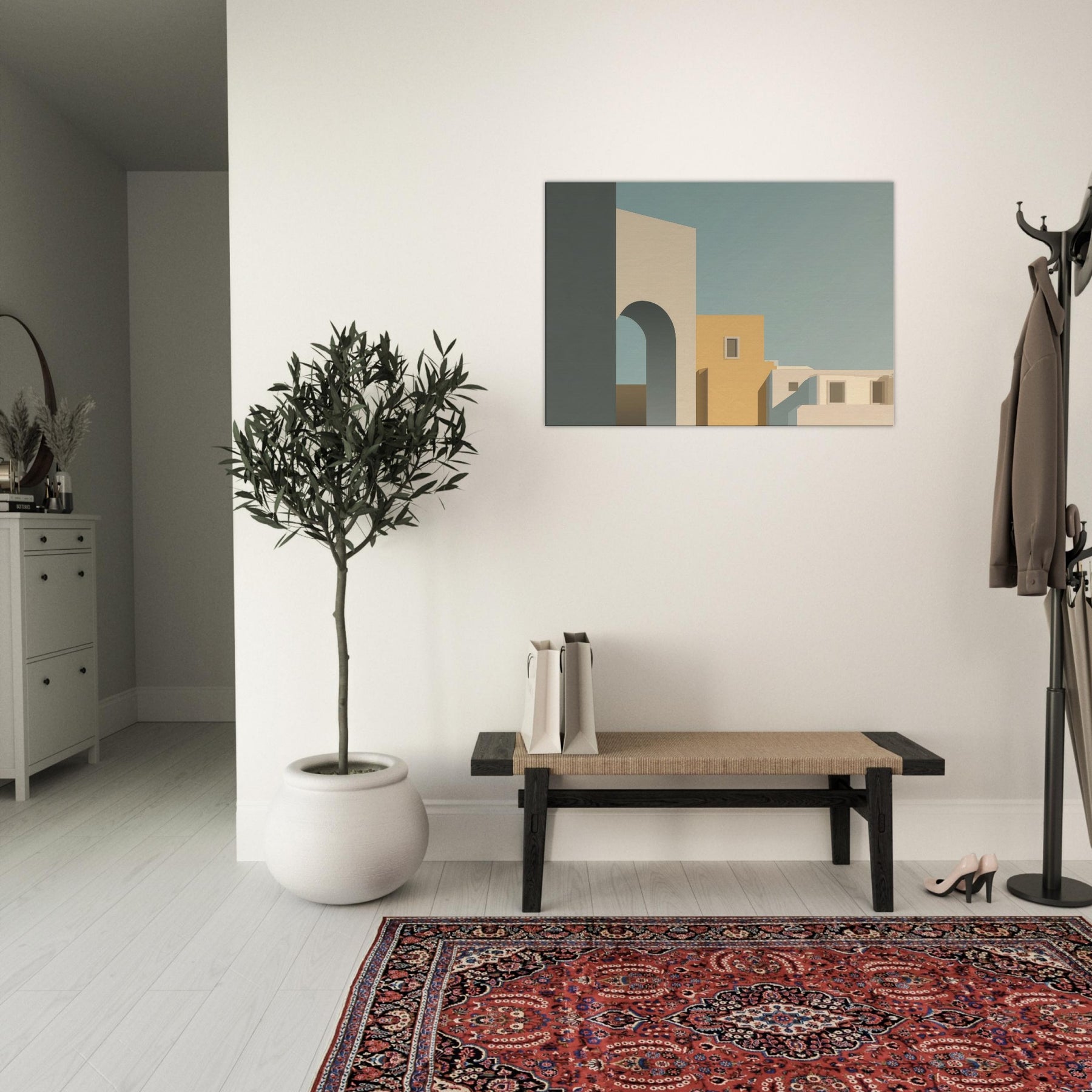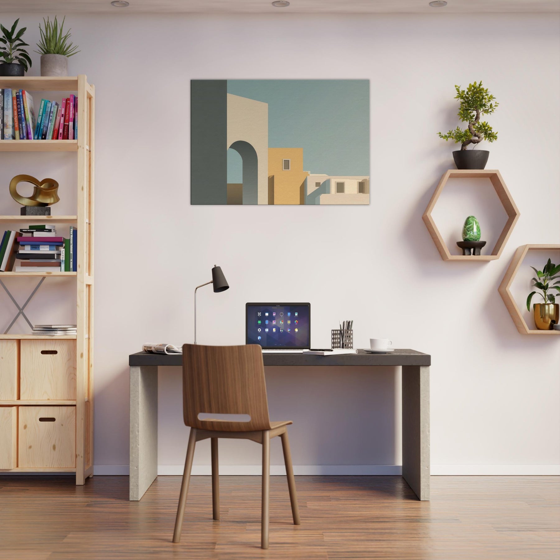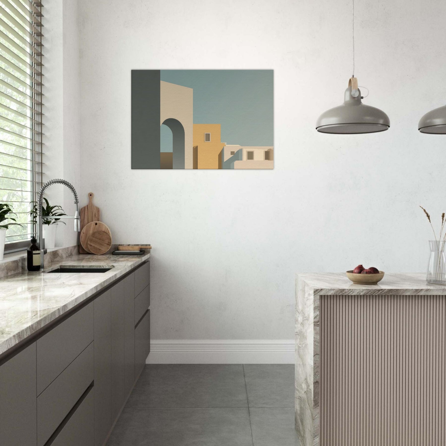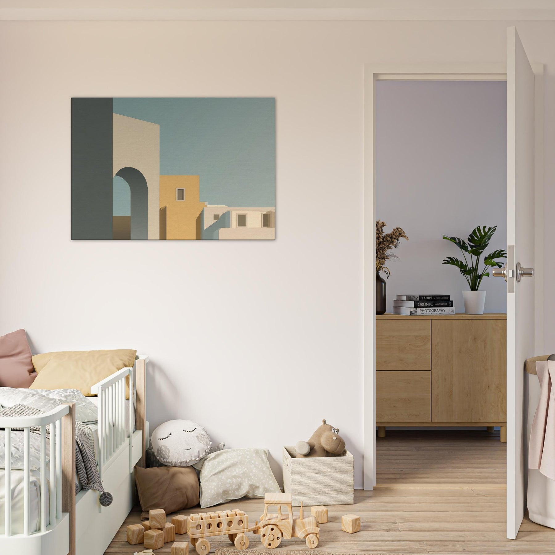 In its quiet geometry, Moon Gate opens a harbor of stillness for any room. The minimalist composition layers simple blocks of cream, warm ochre, and cool blue shadows, suggesting an alley of city light at dusk. The arch invites the eye to drift toward soft horizons, while clean edges and generous negative space foster calm, focus, and conversation. Perfect above a sofa or in a study, it invites a gentle pause and elevates the everyday with a sculptural, architectural poetry.